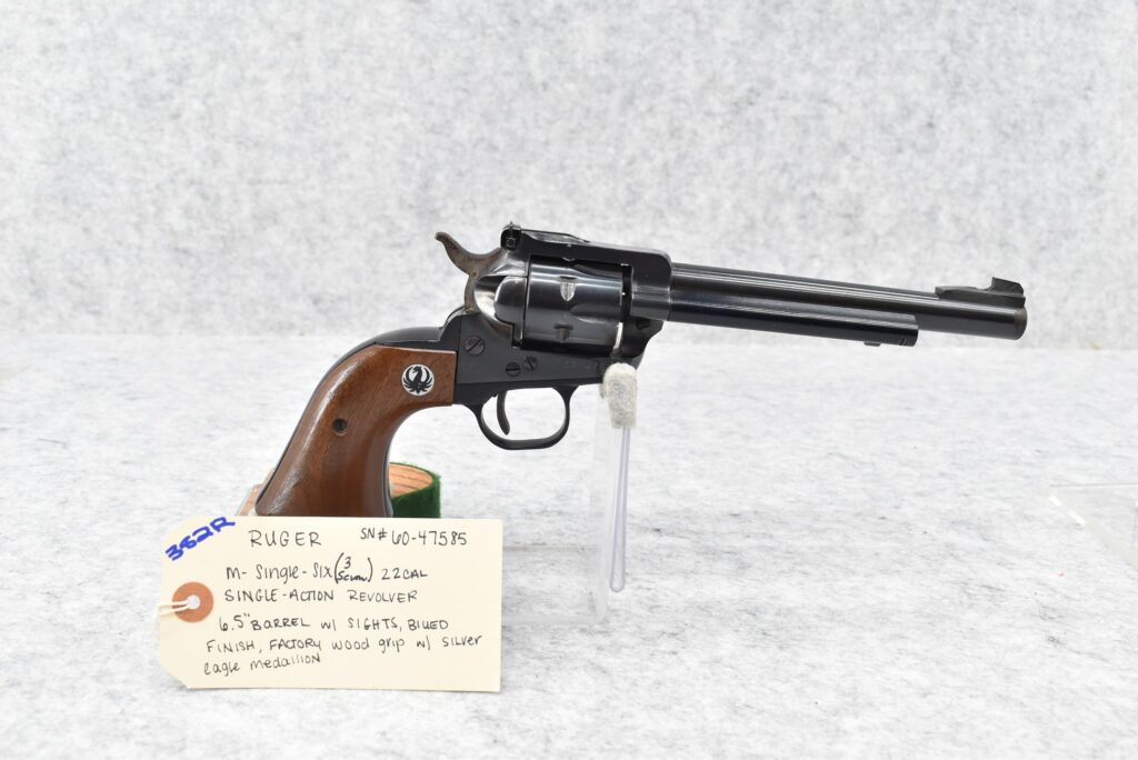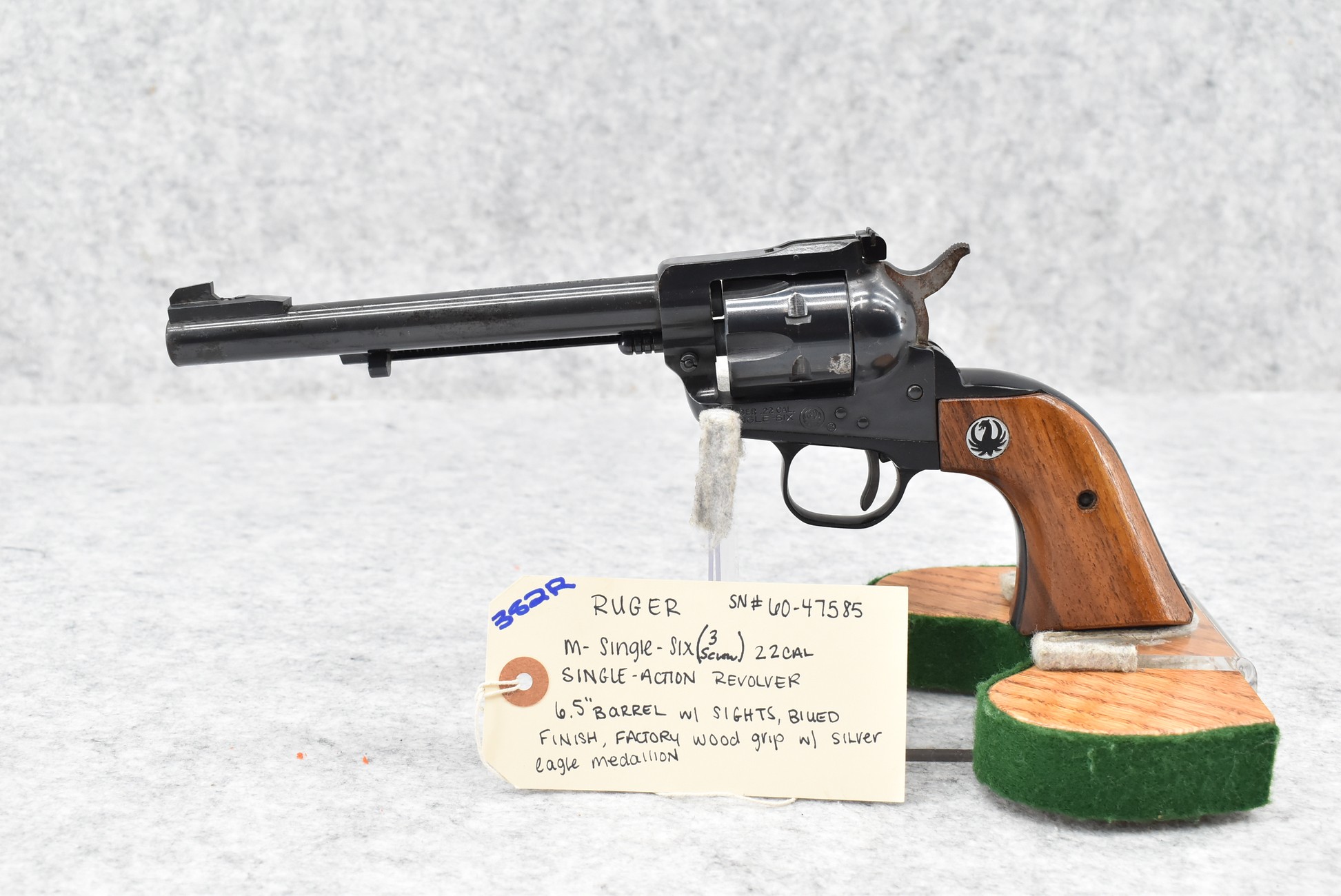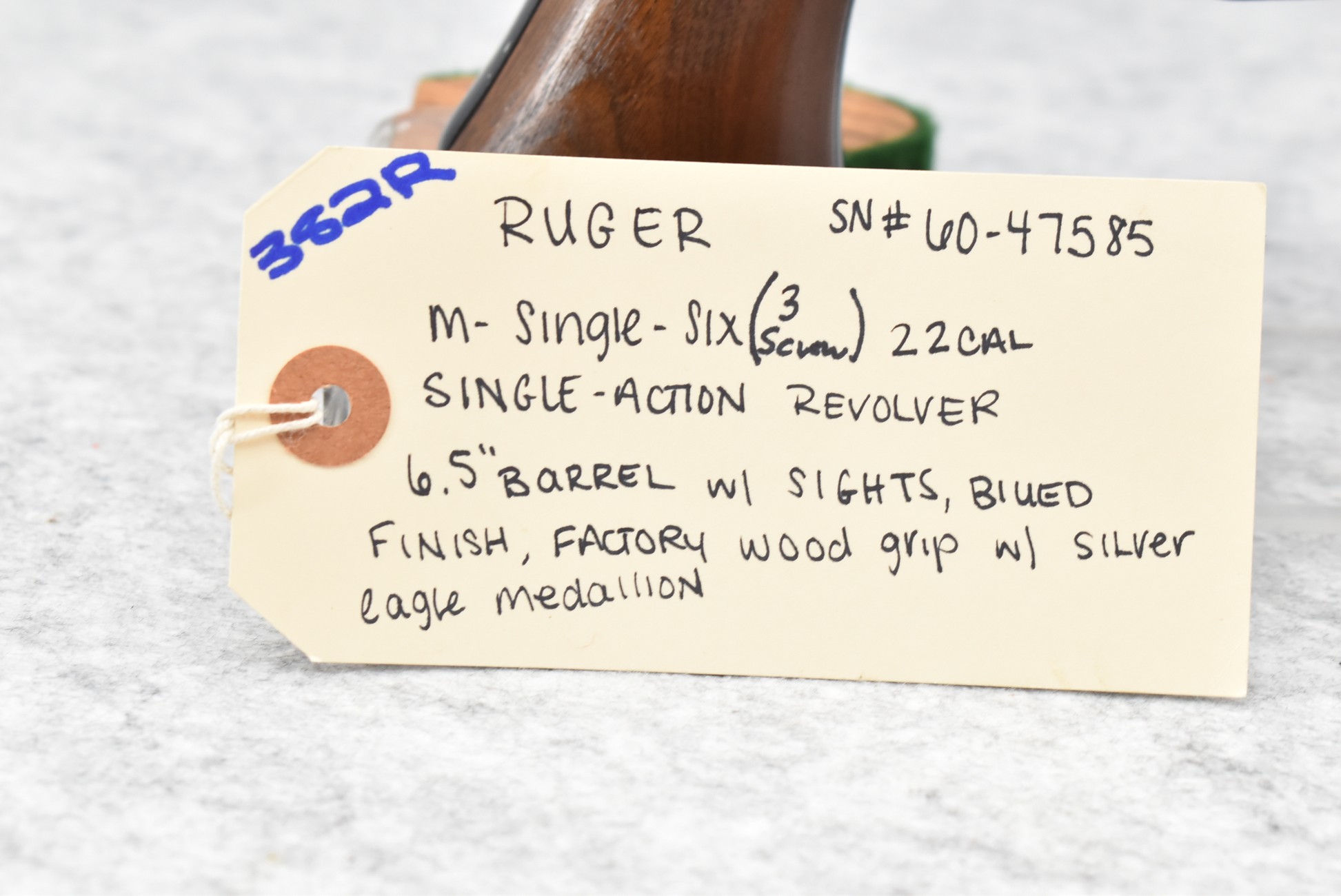 382R. Ruger – Mod. Single Six (3-Screw) – 22 Cal. Single Action Revolver – w/6.5” Barrel w/Sights – Blued Finish – w/Factory Wood Grip w/Silver Eagle Medallion