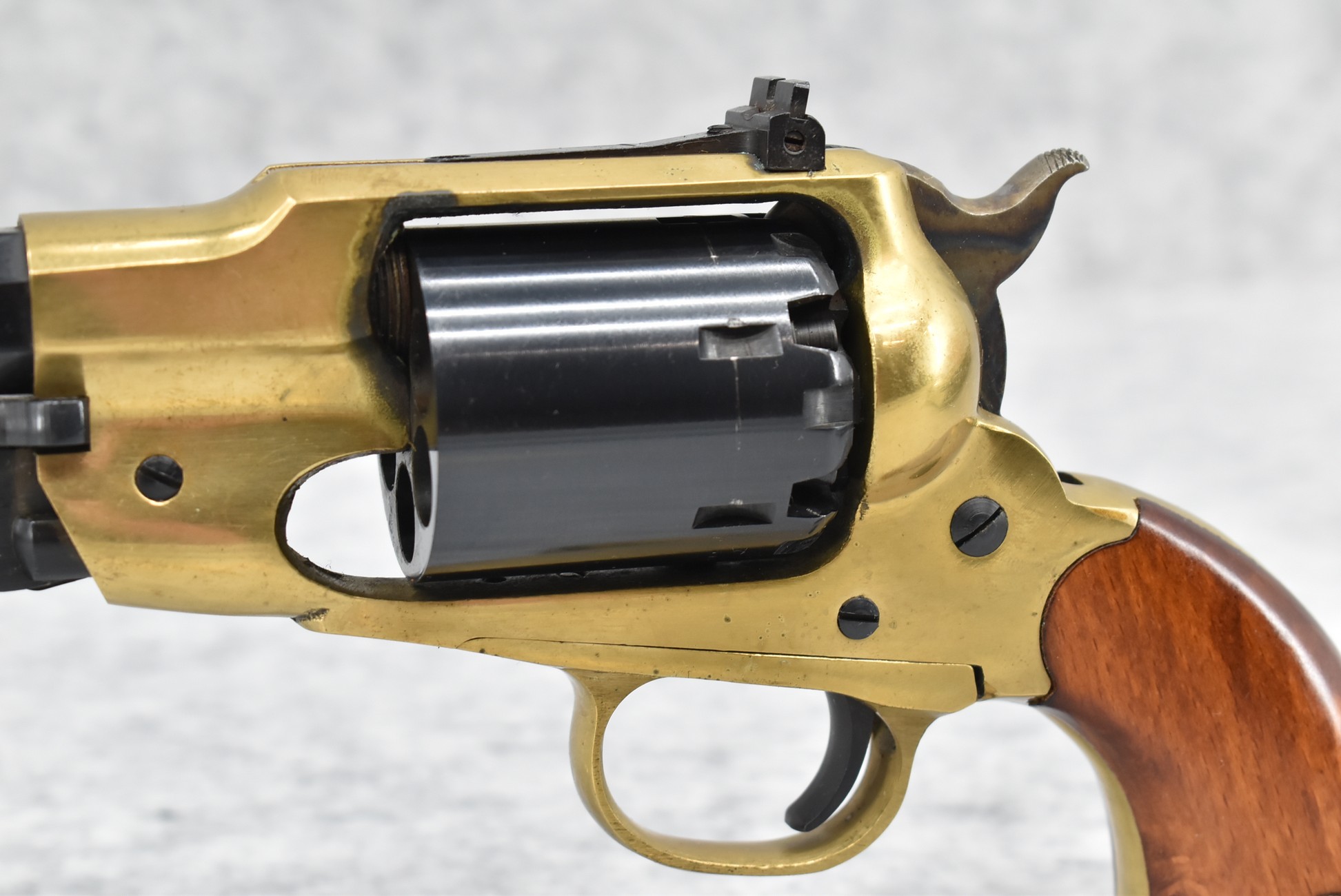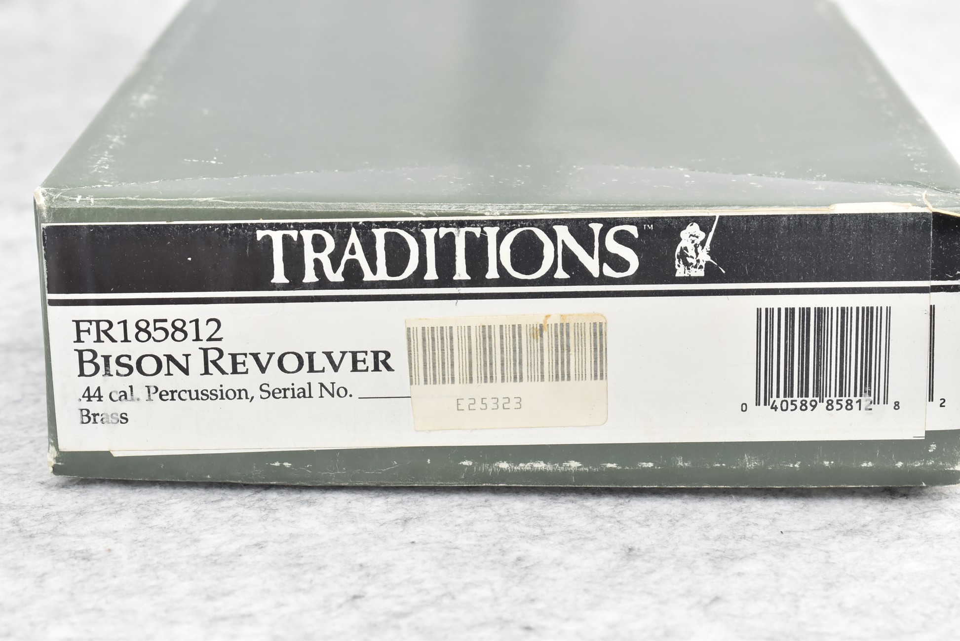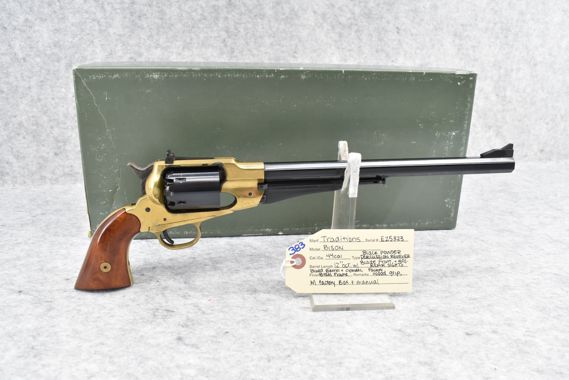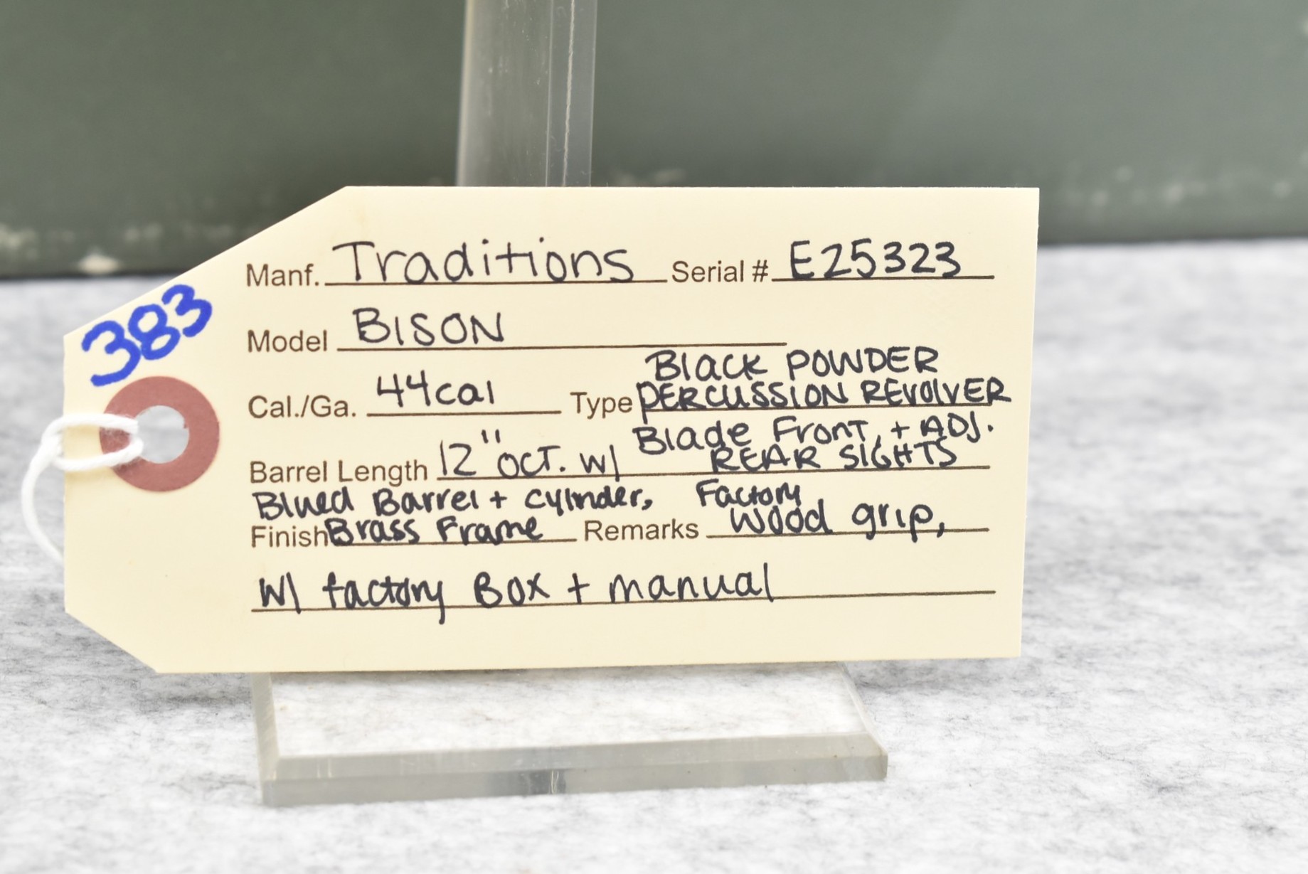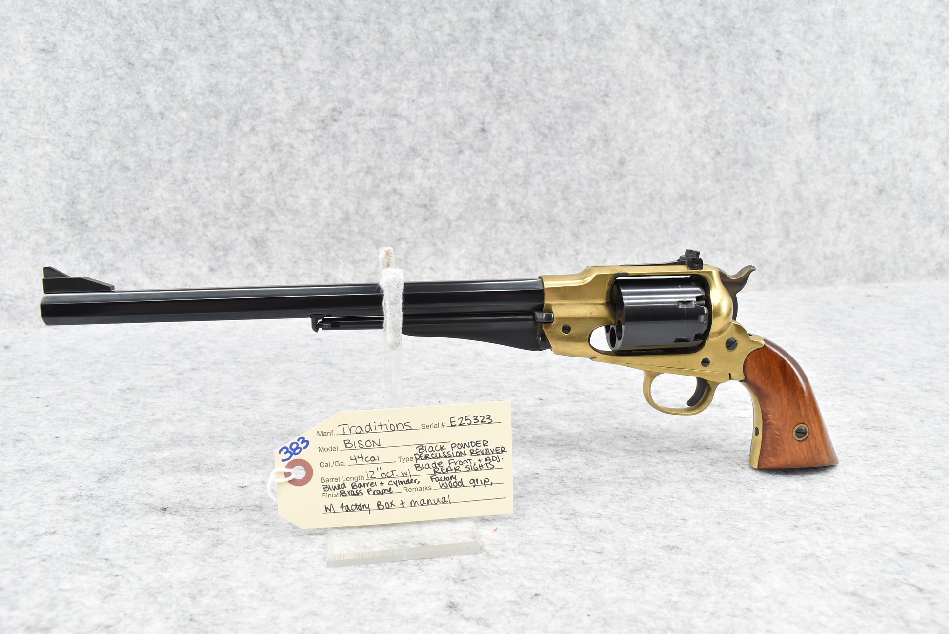 383. Traditions – Mod. Bison – 44 Cal. Black Powder Percussion Revolver – w/12” Octagon Barrel w/Blade Front & Adj. Rear Sights – Blued Finish w/Brass Frame – w/Factory Wood Grip – w/Factory Box & Manual