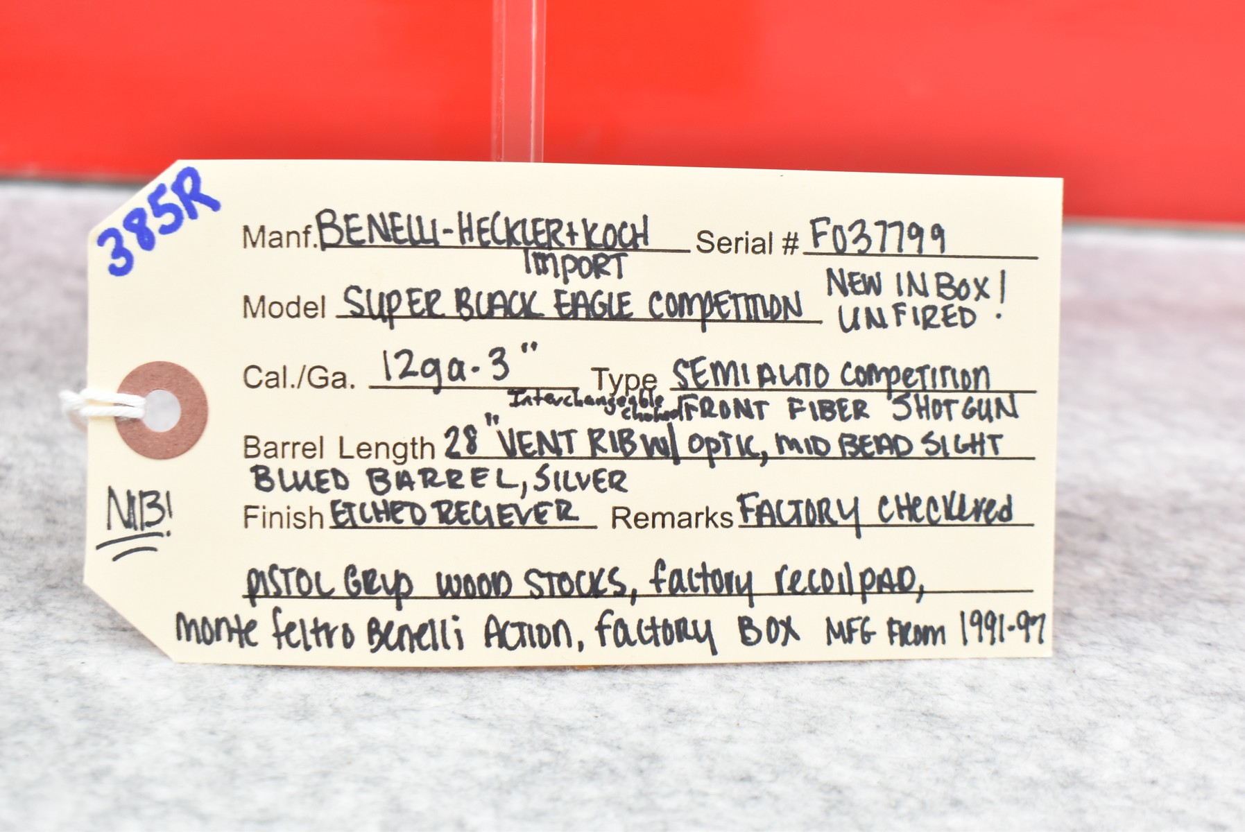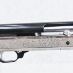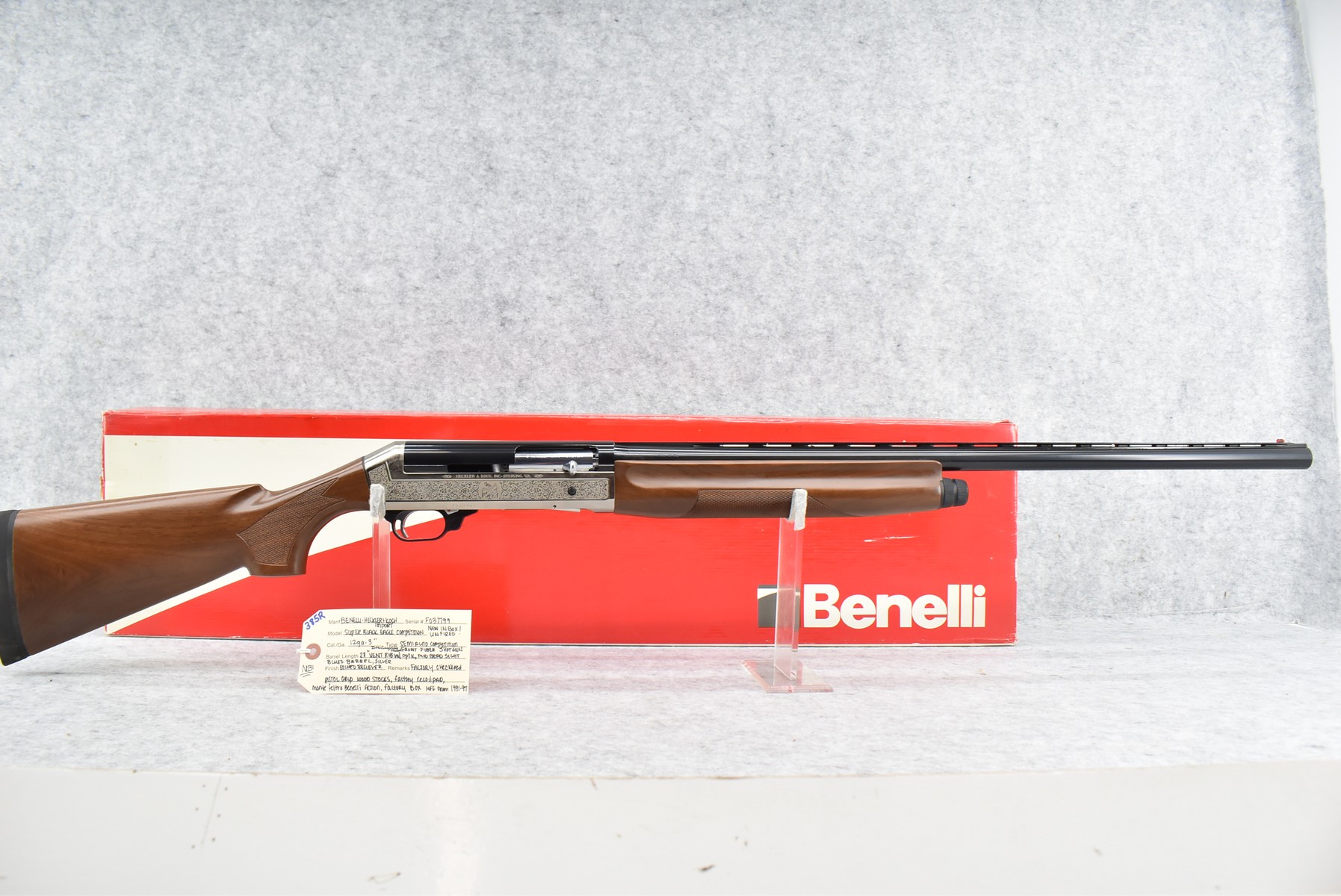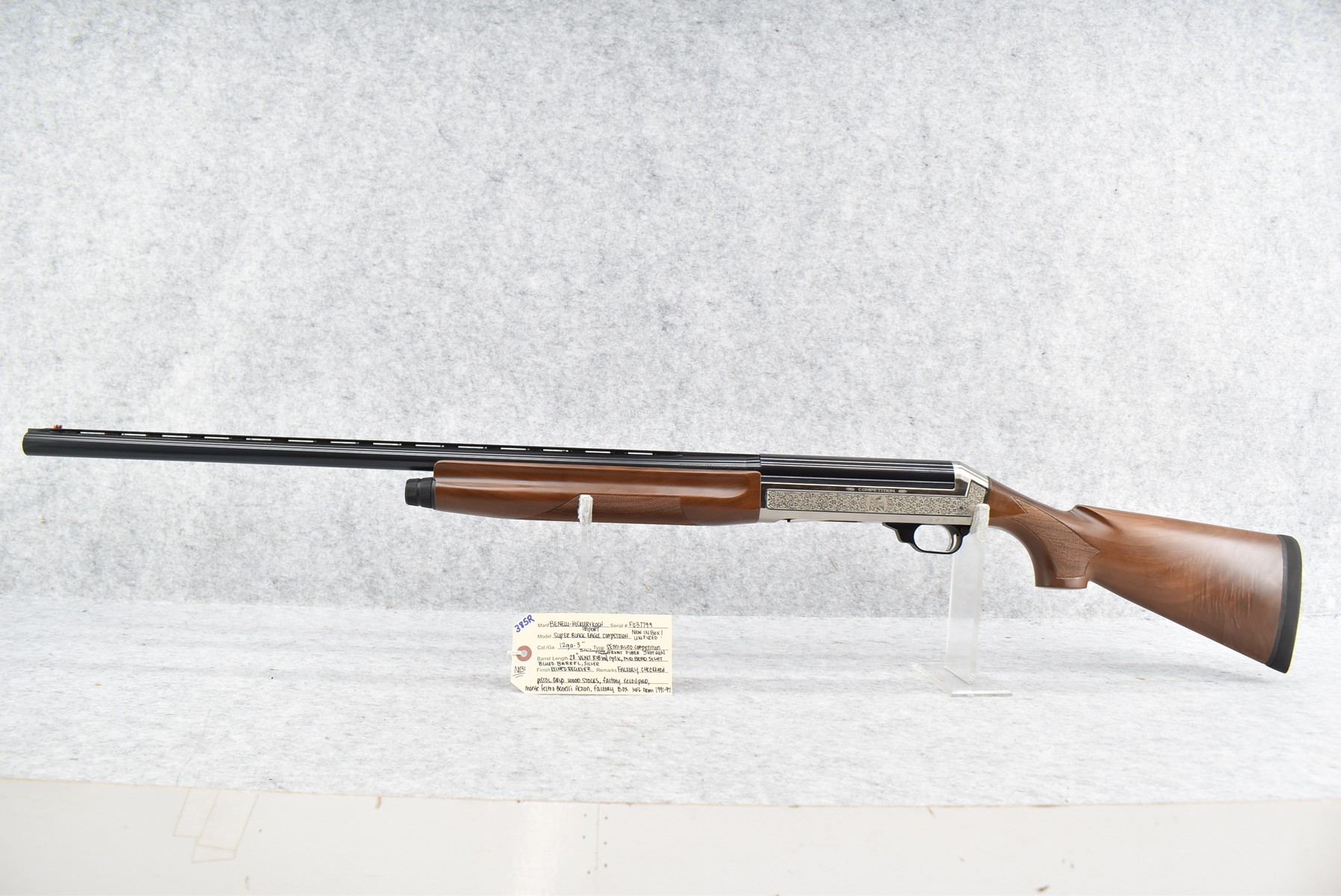 385R. Benelli – Mod. Super Black Eagle Competition – 12ga. Semi-Auto Competition Shotgun – w/28” Interchangeable Choked, Vent-Rib Blued Finish Barrel w/Front Fiber Optic & Mid Bead Sights – w/Silver Finish Engraved Receiver – w/Factory Checkered Pistol Grip Wood Stocks w/Factory Recoil Pad – New & Unfired w/Factory Box – Mfg. 1991-1997