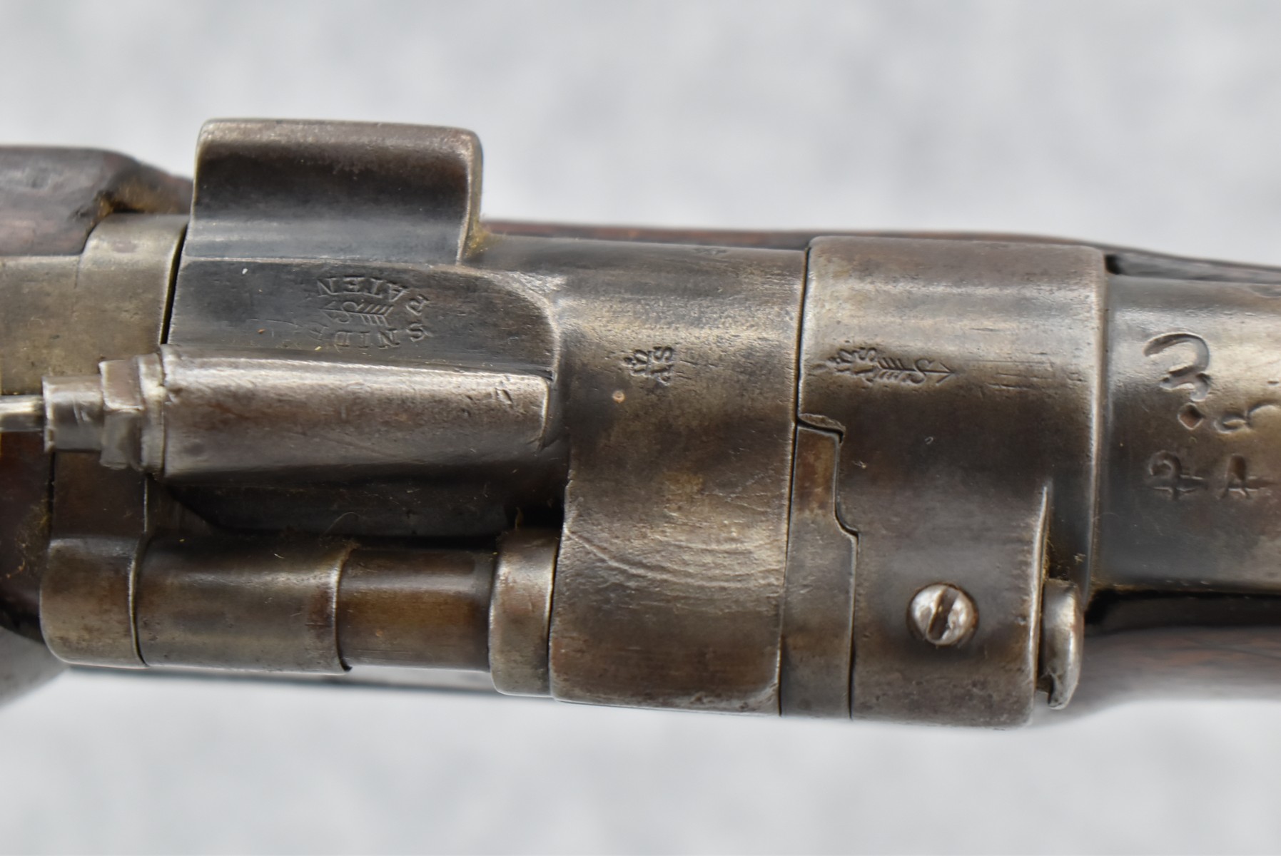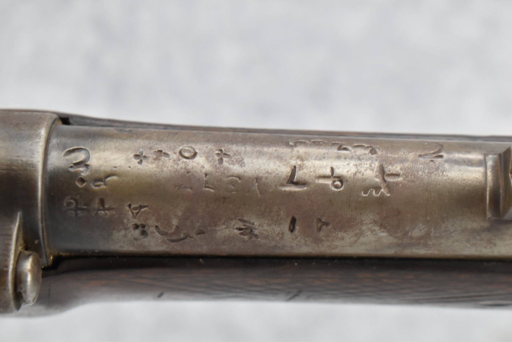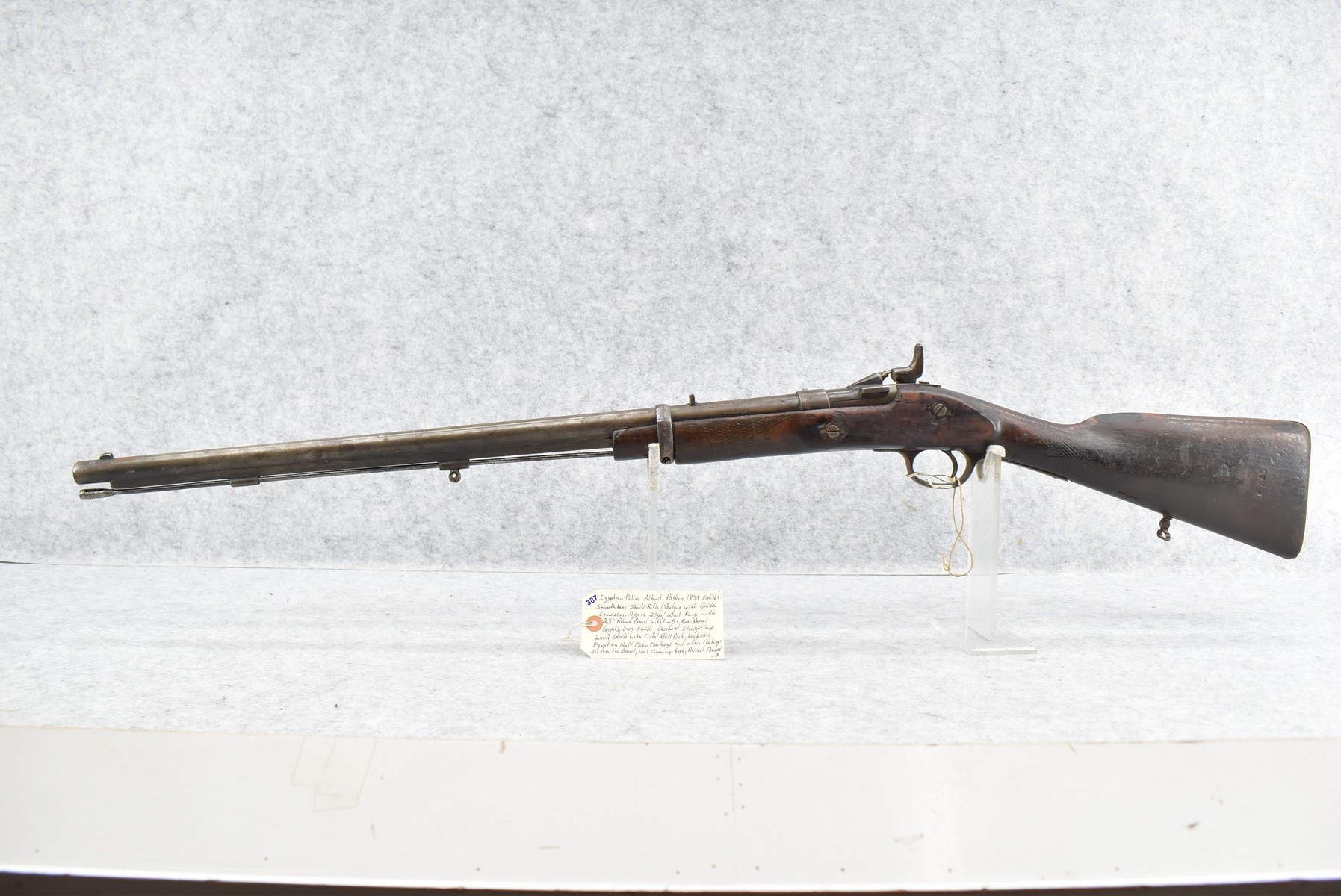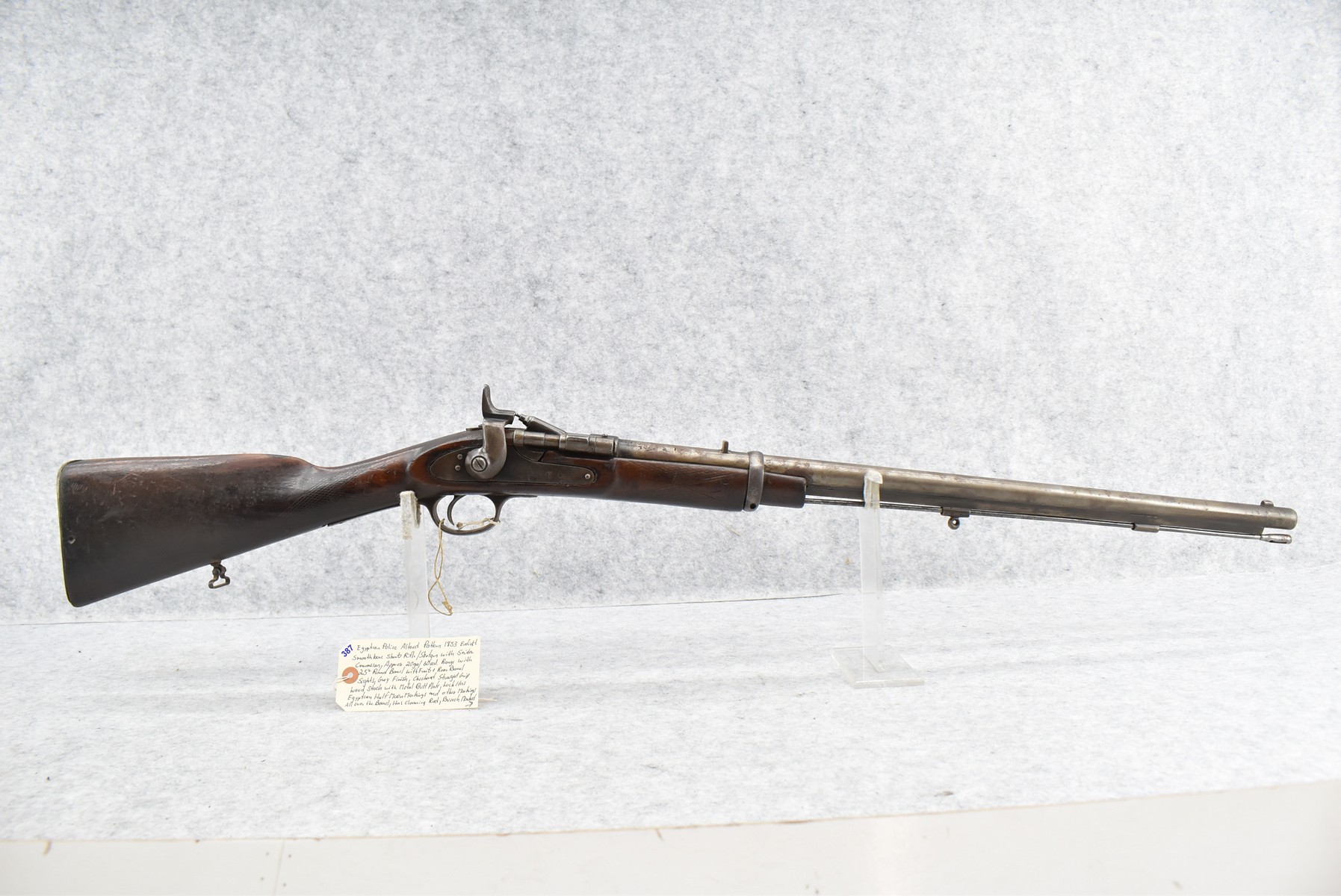 387. Egyptian Police Altered Pattern 1853 Enfield Smoothbore Short Rifle/Shotgun w/Snider Conversion – Approx. 20ga./60 Cal. Range – w/25” Round Barrel w/Front & Rear Barrel Sights – Gray Finish – w/Checkered Straight Grip Wood Stock w/Metal Butt Plate – Lock Has Egyptian Half Moon Markings & Other Markings All Over the Barrel – Breech Marked “Snider Patent” – w/Cleaning Rod