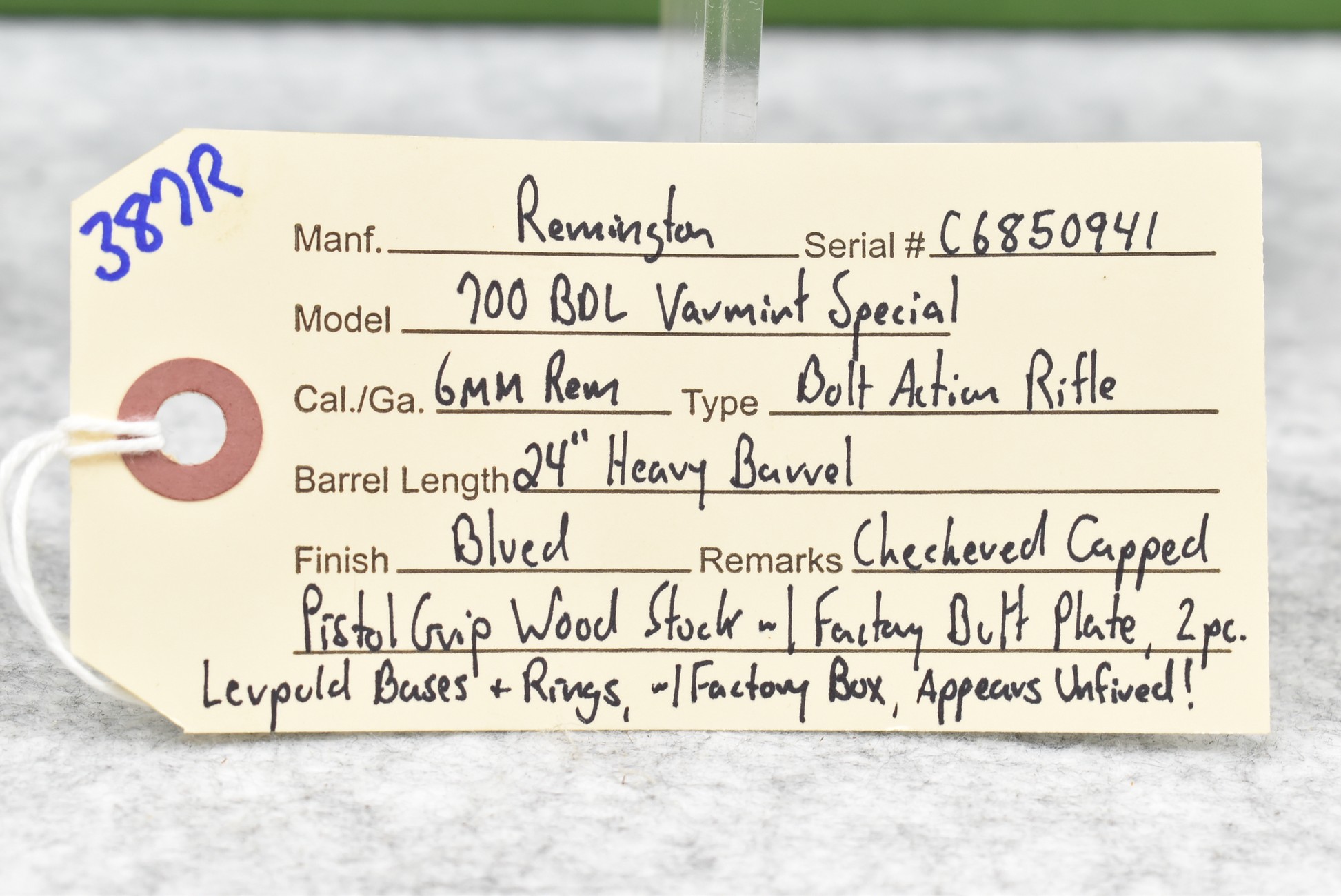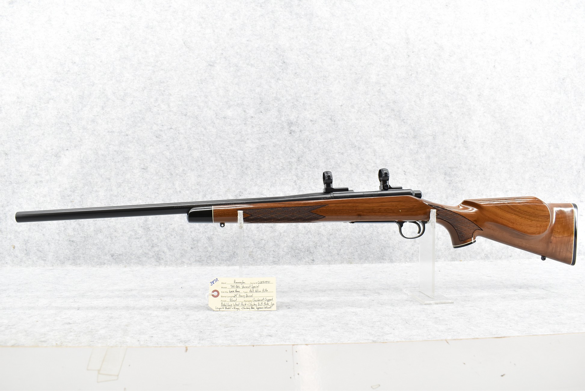 387R. Remington – Mod. 700 BDL Varmint Special – 6mm Rem. Cal. Bolt Action Rifle – w/24” Heavy Barrel – Blued Finish – w/Checkered Capped Pistol Grip Wood Stock w/Factory Butt Plate – w/2pc. Leupold Bases & Rings – Appears Unfired w/Factory Box!
