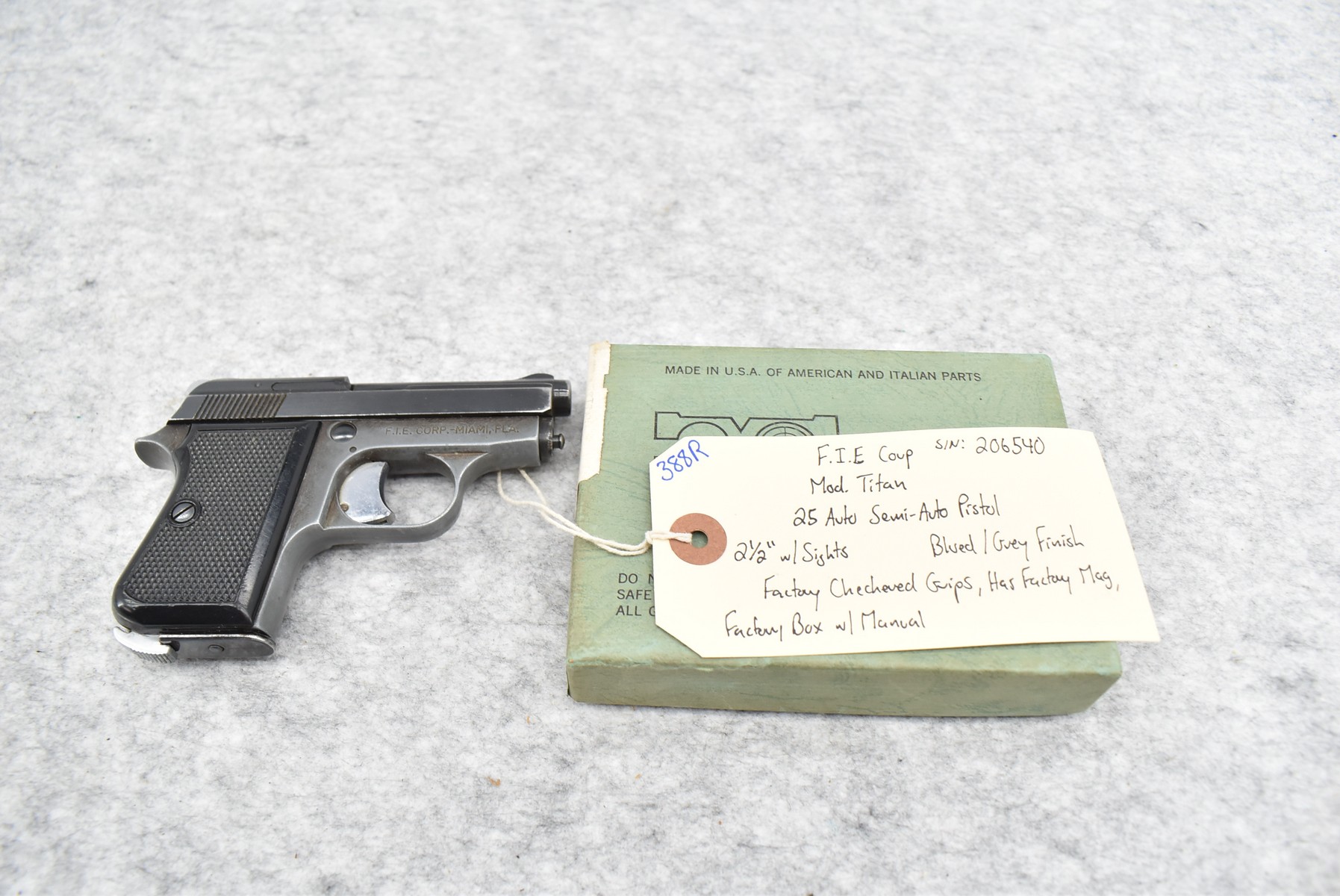 388R. F.I.E. Corp – Mod. Titan – 25 Auto Cal. Semi-Auto Pistol – w/2 ½” Barrel w/Sights – Blued/Gray Finish – w/Factory Checkered Grips – w/Factory Mag – w/Factory Box & Manual