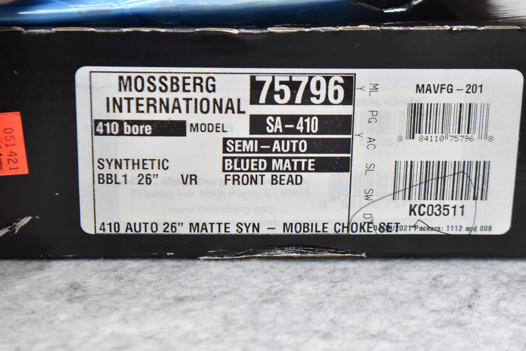 388R. Mossberg – Mod. SA-410 – 410ga. 3” Semi-Auto Shotgun – w/26” Interchangeable Choke, Vent-Rib Barrel w/Front Bead Sight – Matte Blued Finish – w/Factory Checkered Synthetic Black Pistol Grip Stocks w/Factory Recoil Pad – New & Unfired w/Factory Box, Mobile Choke Set & Manual