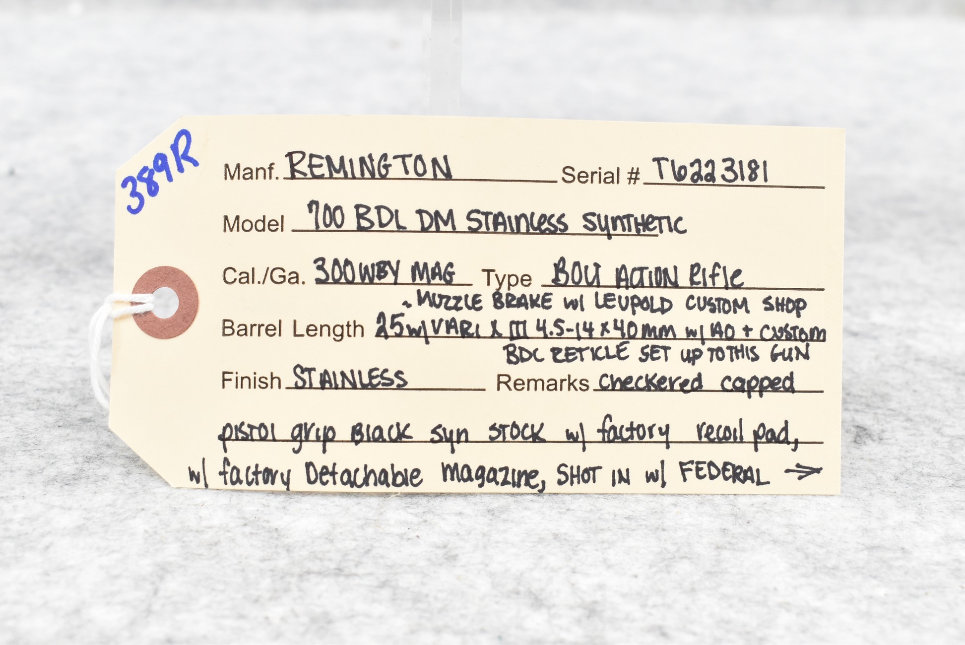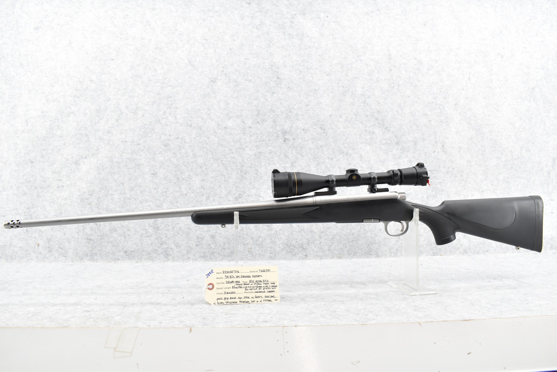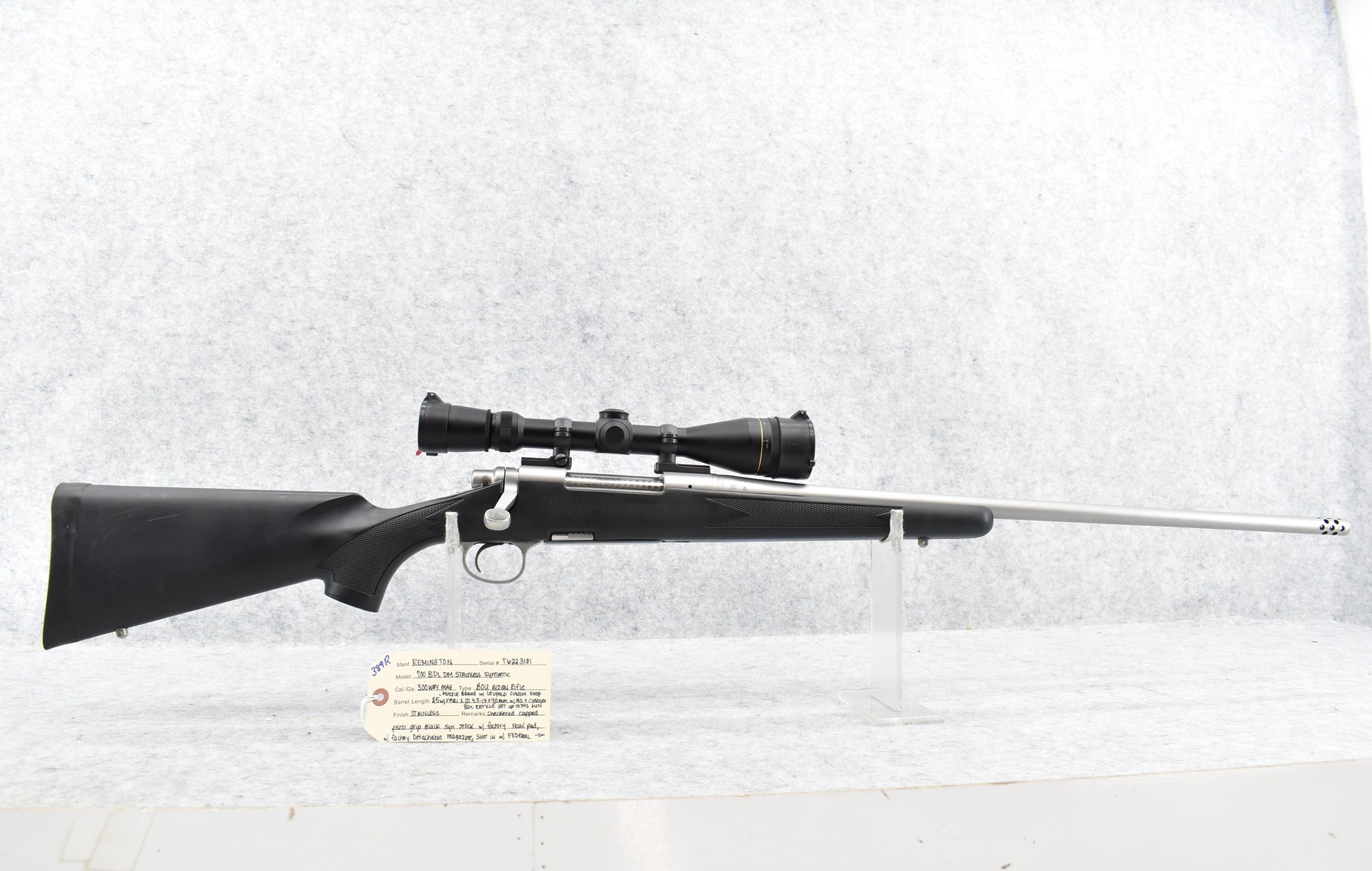 389R. Remington – Mod. 700 BDL DM Stainless Synthetic – 300 Wby. Mag. Cal. Bolt Action Rifle – w/25” Barrel w/Muzzle Brake – w/Leupold Custom Shop Vari X-III 4.5-14x40mm Scope w/Front AO & Custom BDC Reticle Set Up to This Gun – Stainless Finish – w/Checkered Capped Pistol Grip Black Synthetic Stock w/Factory Recoil Pad – w/Factory Detachable Magazine – Scope Reticle Designed for Federal Premium Safari 180gr. Nosler Partition Ammo – Great Package