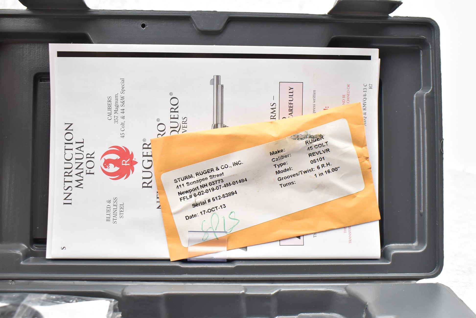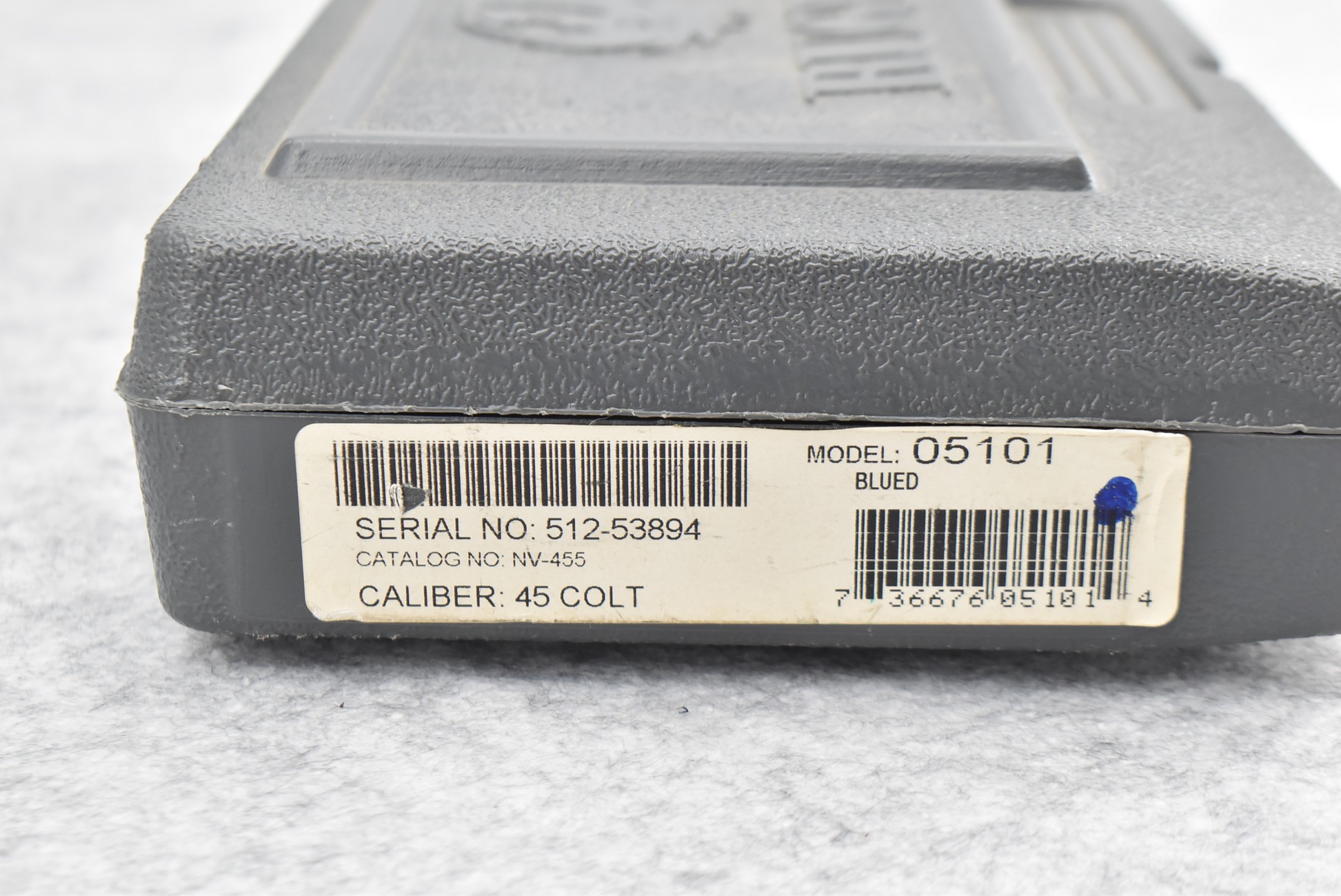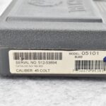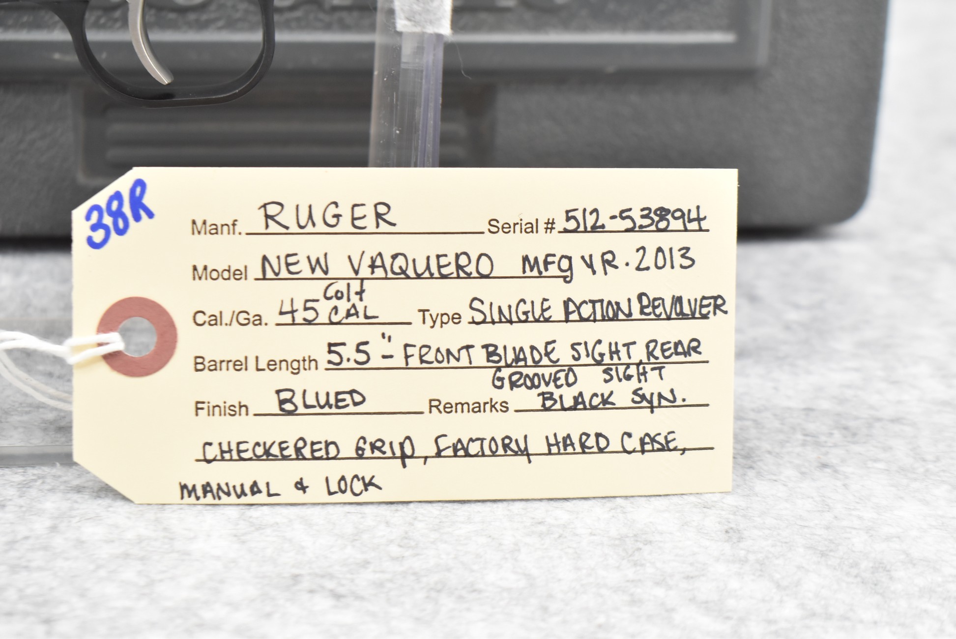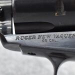 38R. Ruger – Mod. New Vaquero – 45 Colt Cal. Single Action Revolver – w/5½” Barrel w/Blade Front and Grooved Rear Sights – Blued Finish – w/Black Synthetic Checkered Grip – Manufactured 2013 – w/Factory Hard Case and Manual
