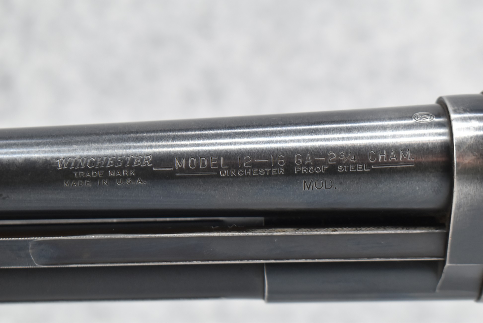 38R. Winchester – Mod. 12 – 16ga. 2¾” Pump Action Shotgun – w/28” Mod. Choked Barrel w/Front Bead Sight – Blued Finish – w/Factory Pistol Grip Wood Butt Stock and Ribbed Forend w/Factory Butt Plate – Manufactured 1952
