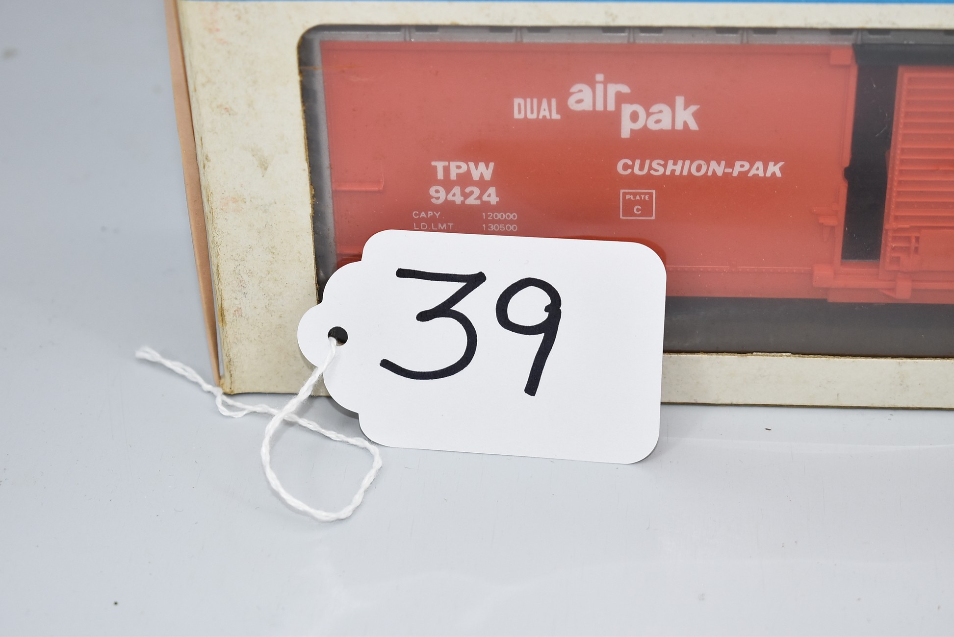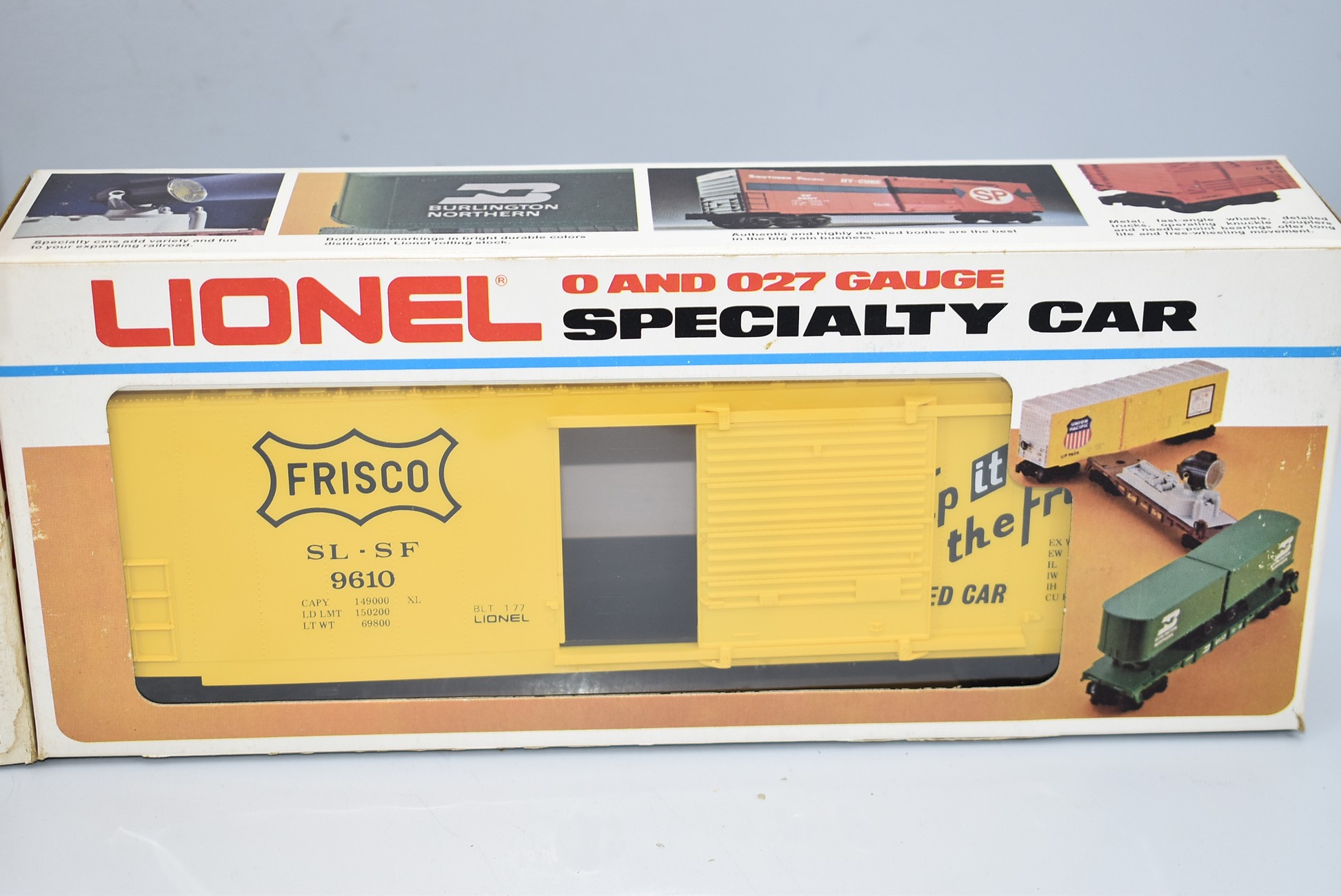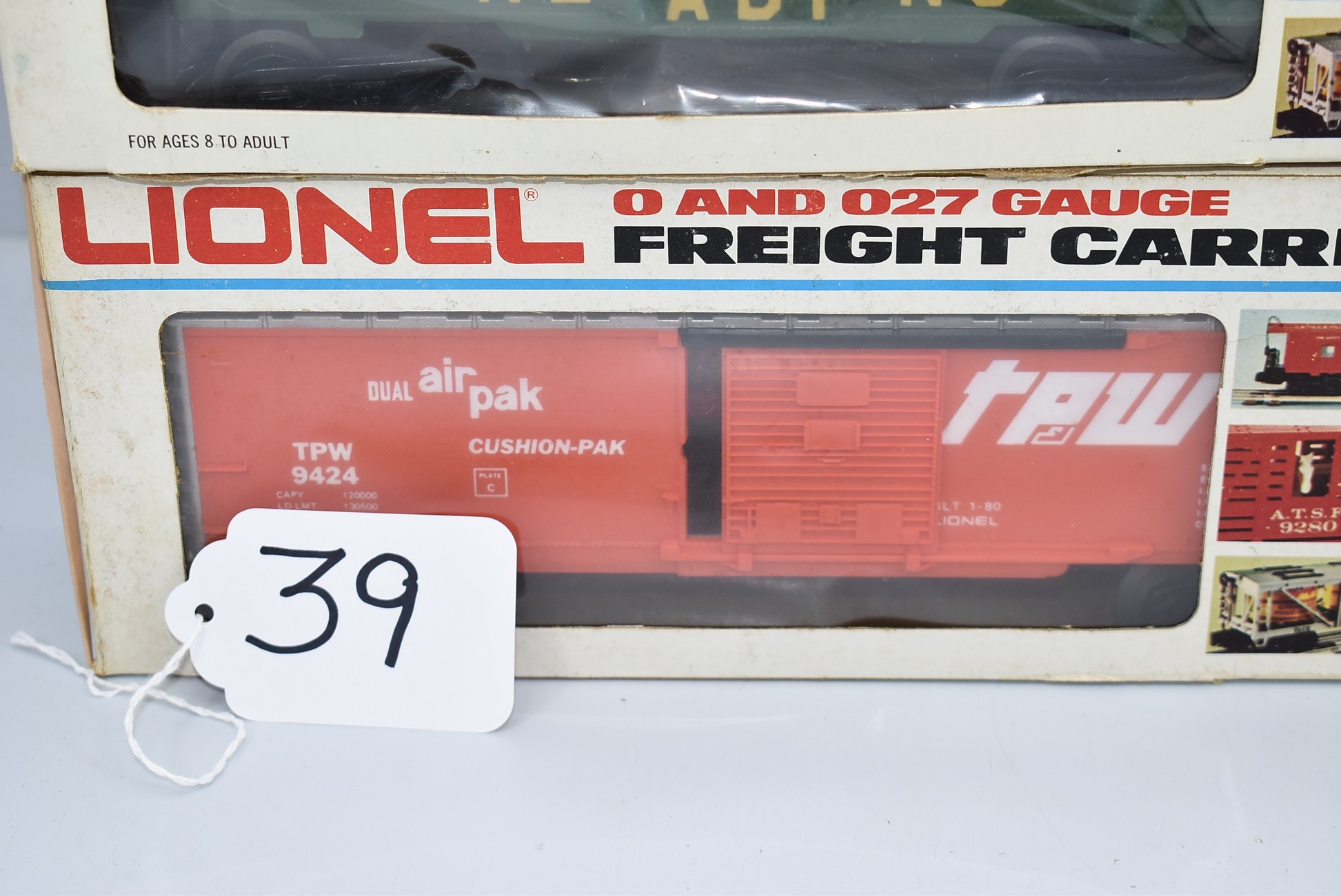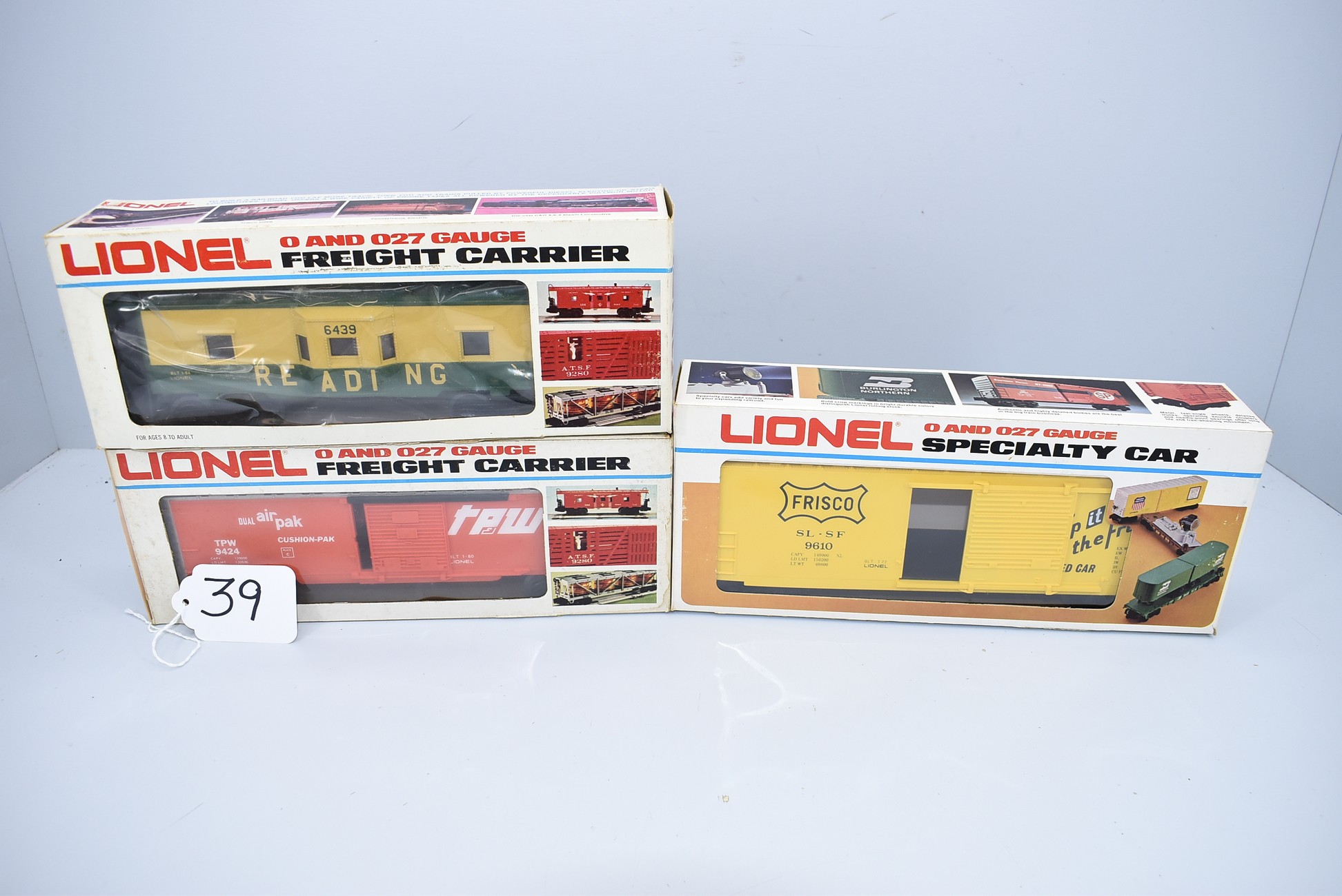 39. Lot of 3 Lionel O-Gauge Box Cars – Including TPW Box Car 6-9424, Reading Bay Window Caboose 6-6439, and Frisco Hi-Cube Car 6-9610 – All w/Boxes