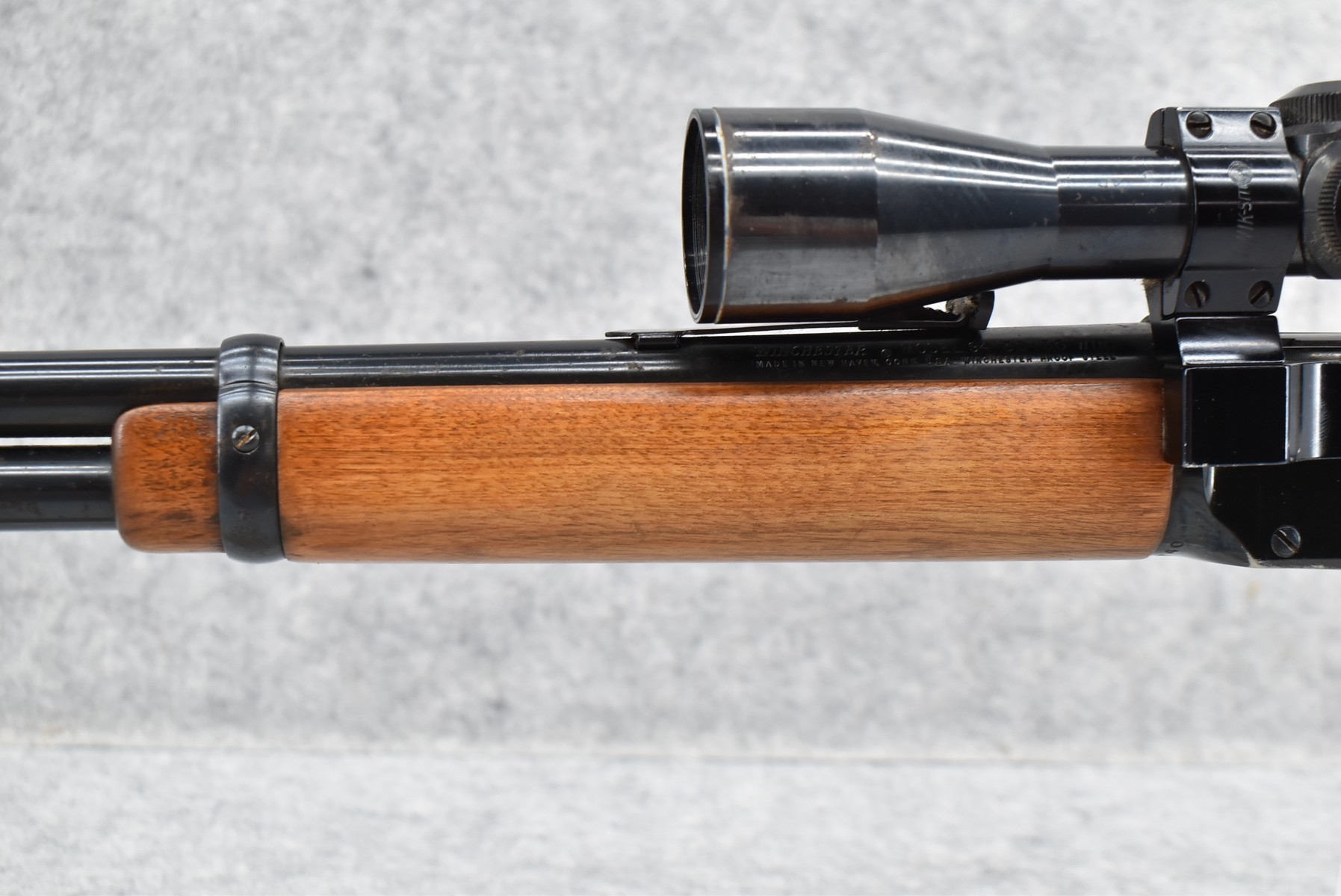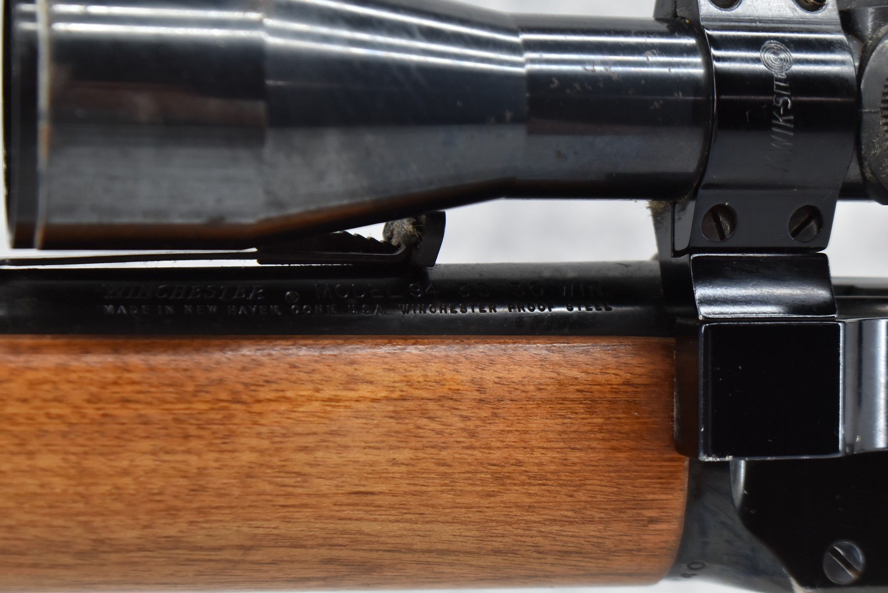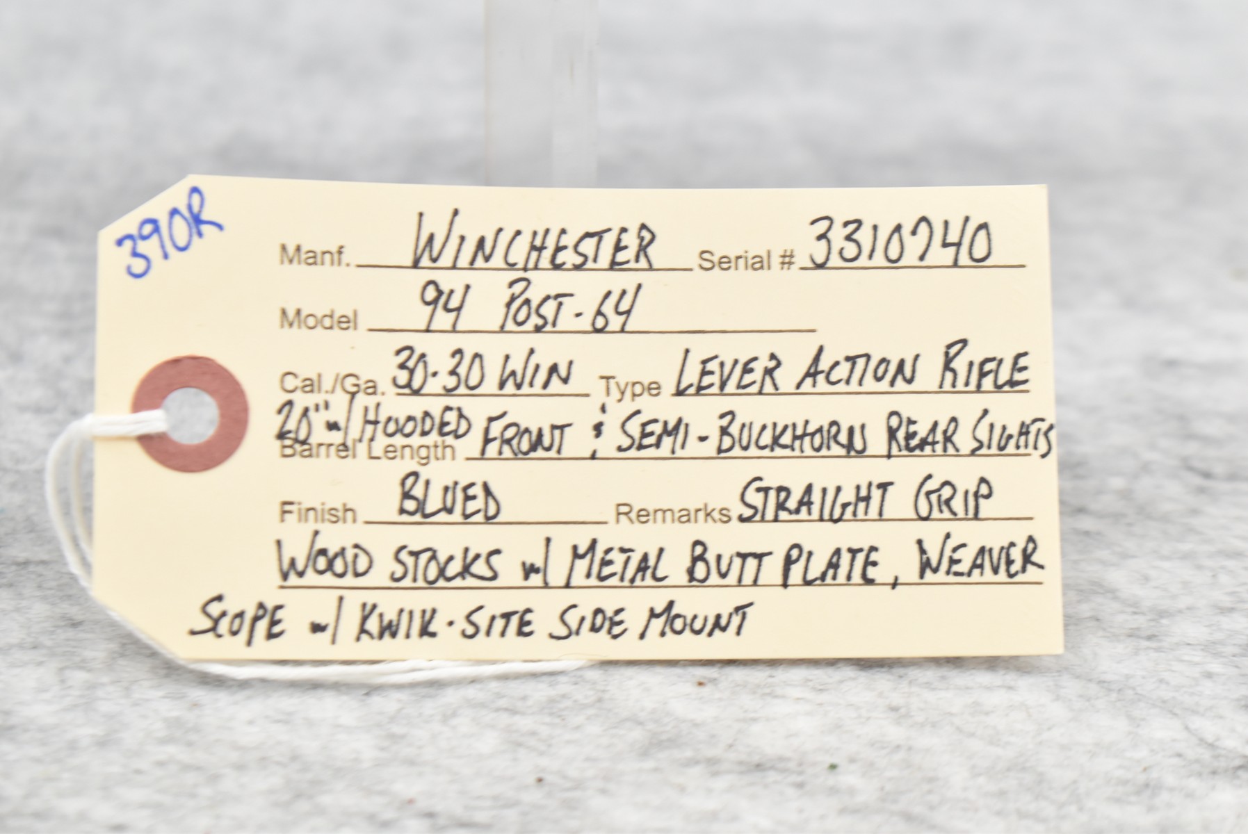 390R. Winchester – Mod. 94 (Post-64) – 30-30 Win. Cal. Lever Action Rifle – w/20” Barrel w/Hooded Front & Semi-Buckhorn Rear Sights – Blued Finish – w/Straight Grip Wood Stocks w/Metal Butt plate – w/Weaver Scope – w/Kwik-Site Side Mount