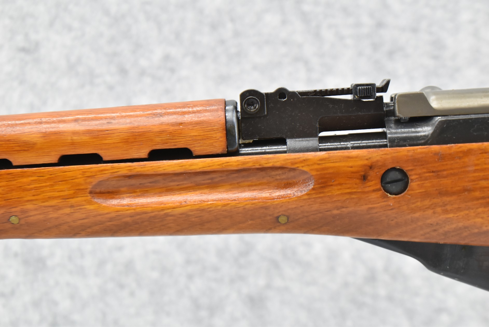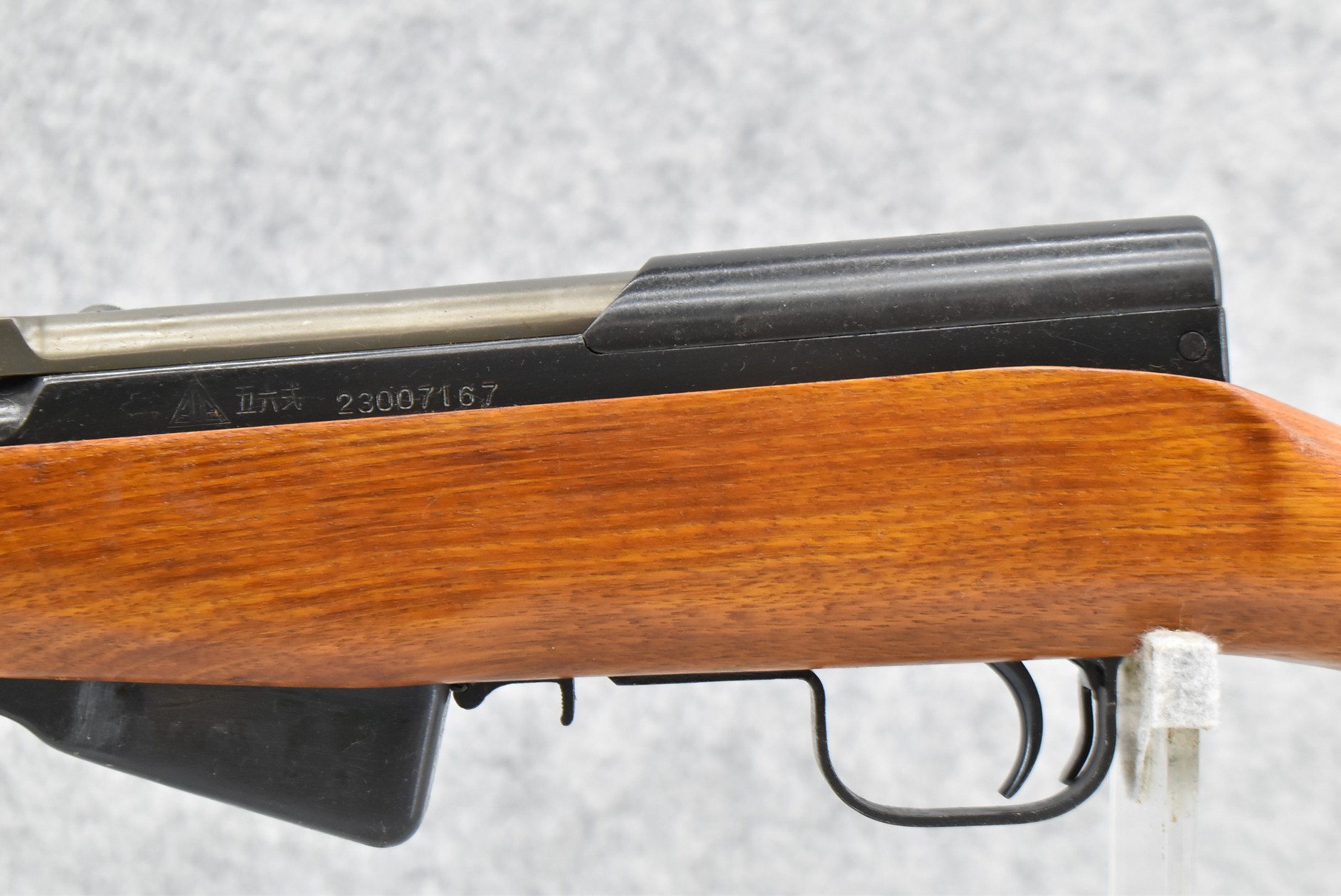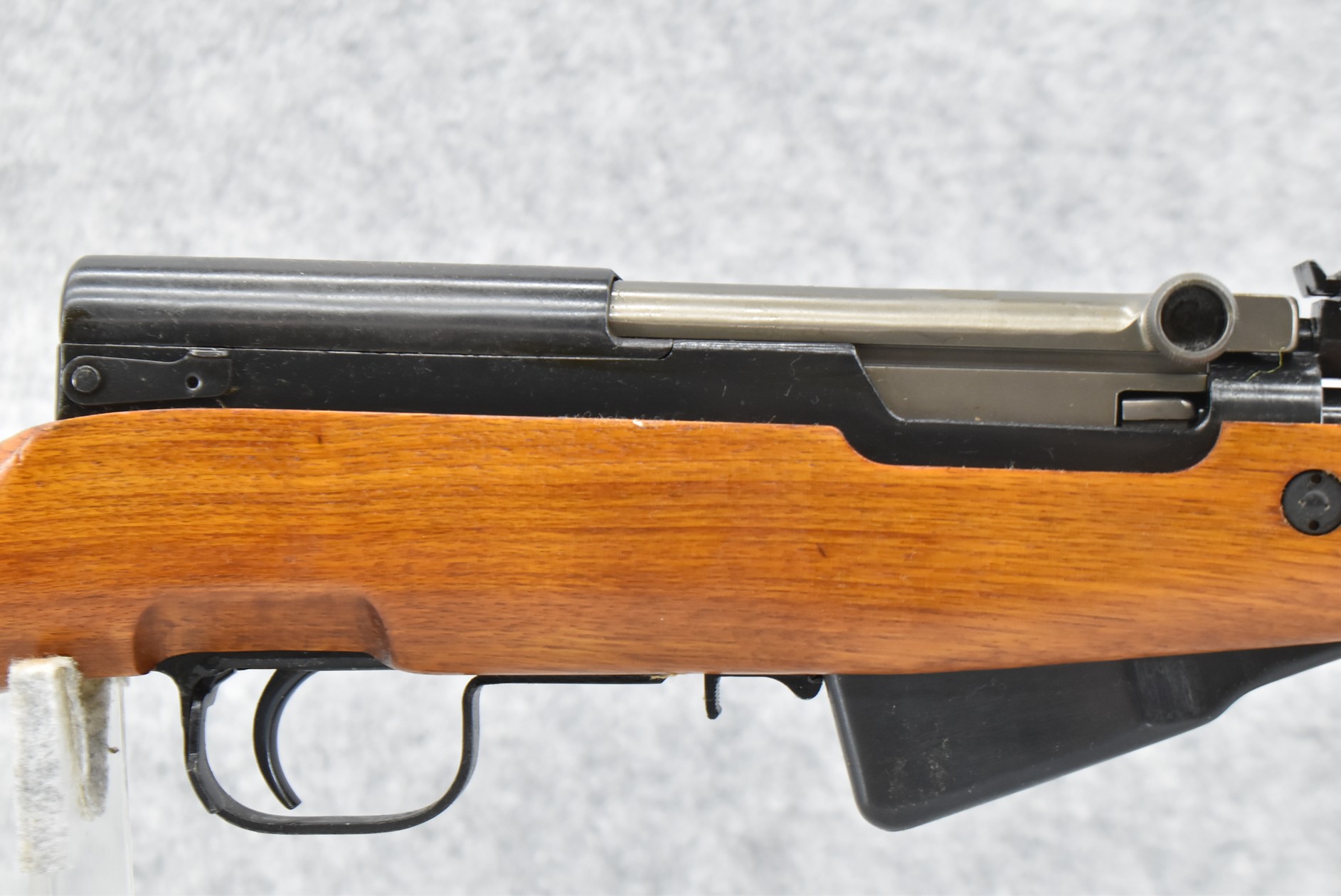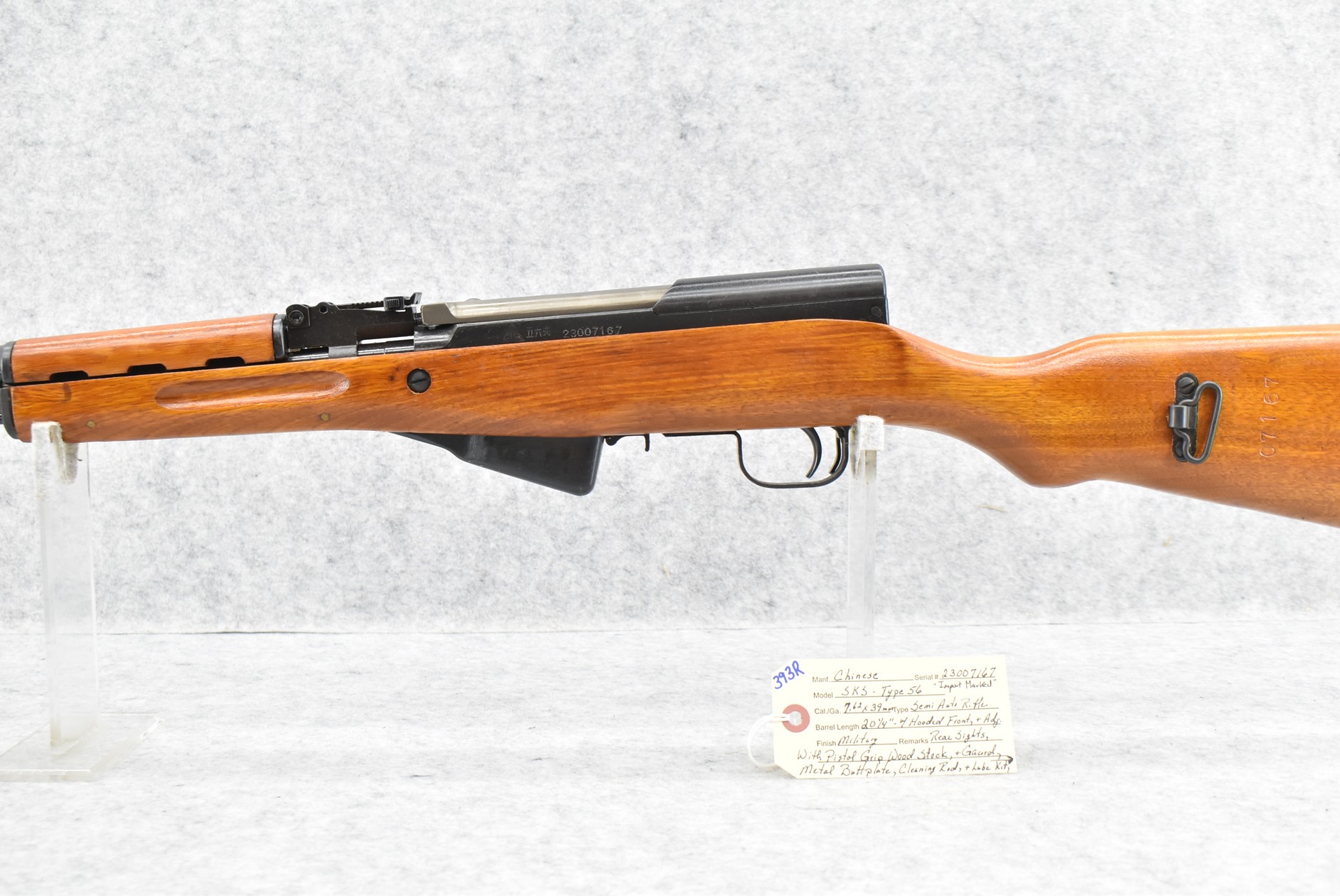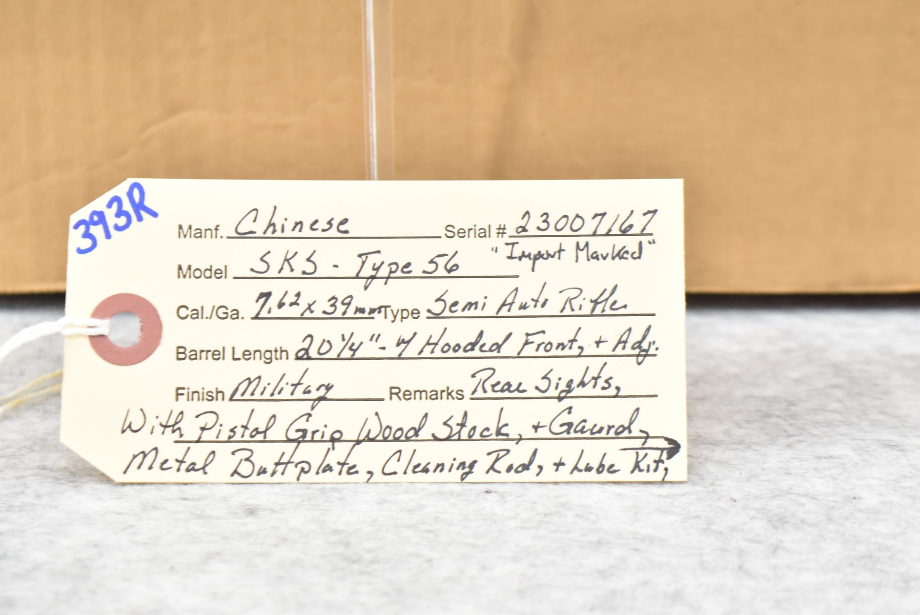 393R. Chinese – Mod. SKS Type 56 – 7.62x39mm Cal. Semi-Auto Rifle – w/20 ¼” Barrel w/Hooded Front & Adj. Rear Sights – Military Finish – w/Pistol Grip Wood Stocks w/Metal Butt Plate – w/Cleaning Rod & Lube Kit – w/Factory Box & Accessories – Import Marked