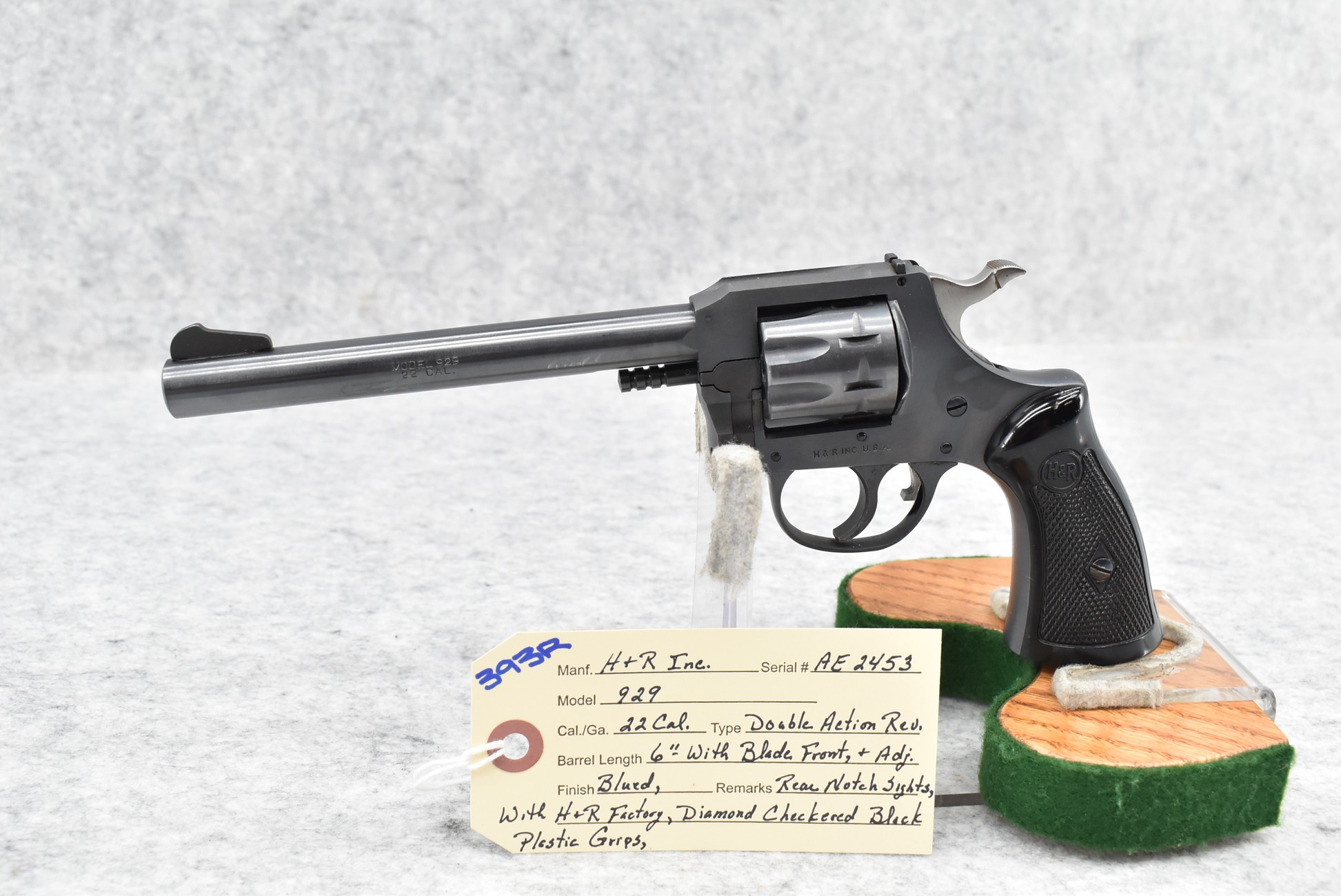 393R. H. & R. Inc. – Mod. 929 – 22 Cal. Double Action Revolver – w/6” Barrel w/Blade Front & Adj. Rear Notch Sights – Blued Finish – w/H&R Factory Diamond Checkered Black Plastic Grips