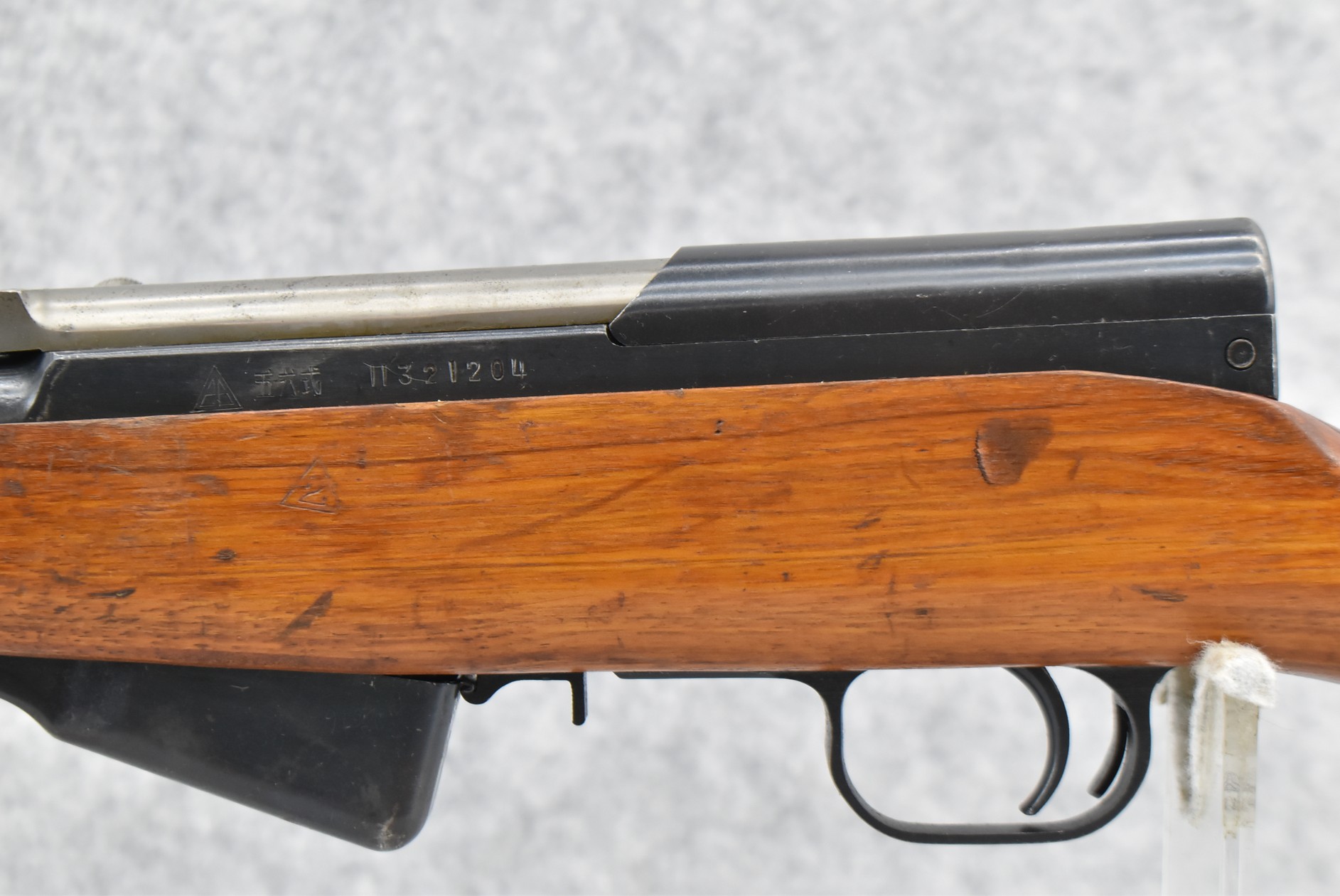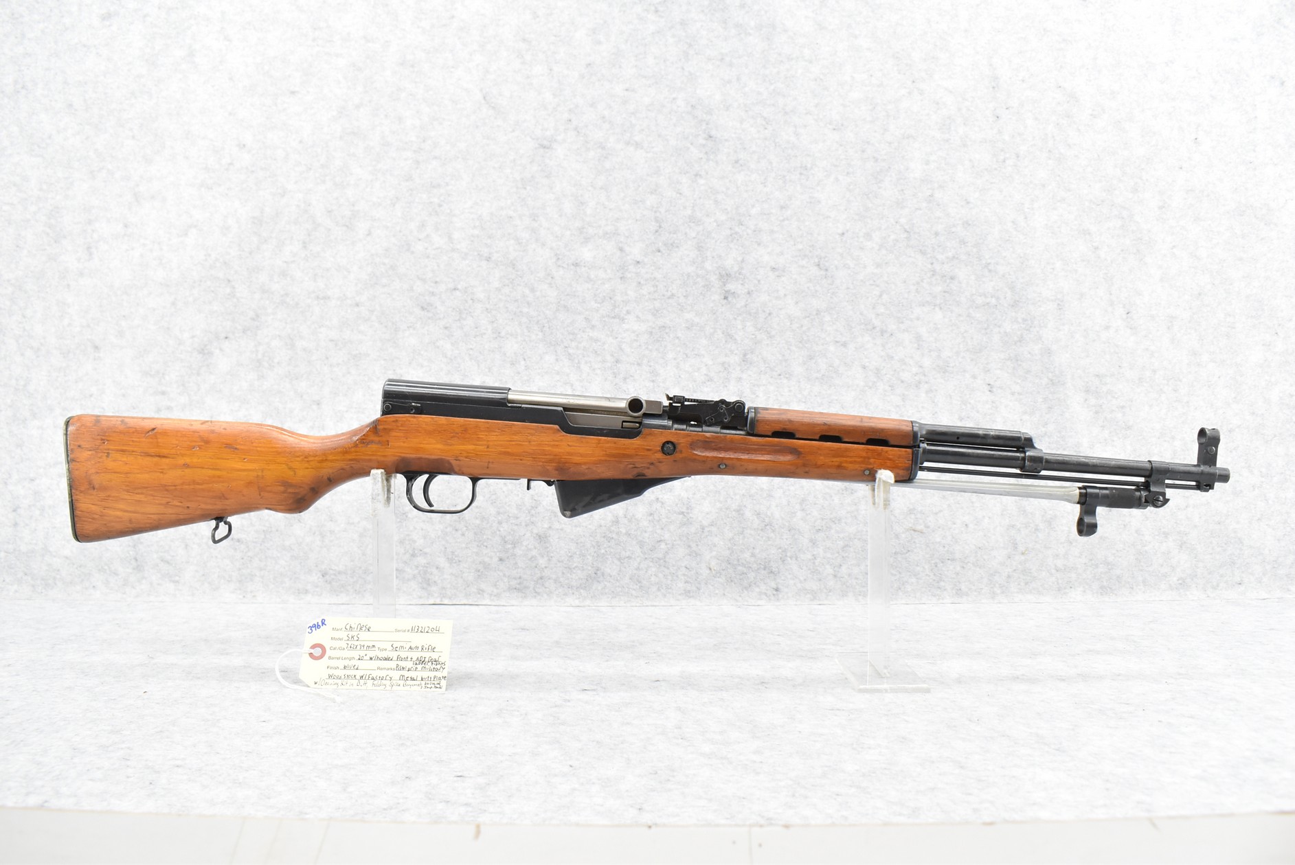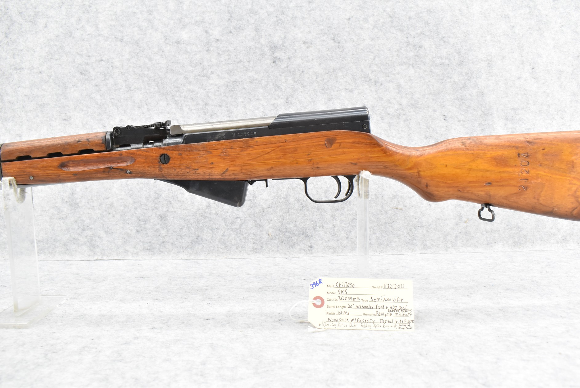 396R. Chines – Mod. SKS – 7.62x39mm Cal. Semi-Auto Rifle – w/20” Barrel w/Hooded Front & Adj. Rear Ladder Sights – Blued Finish – w/Pistol Grip Miliary Wood Stock w/Factory Metal Butt Plate w/Cleaning Kit in Butt – w/Folding Spike Bayonet – No Visible Import Marks