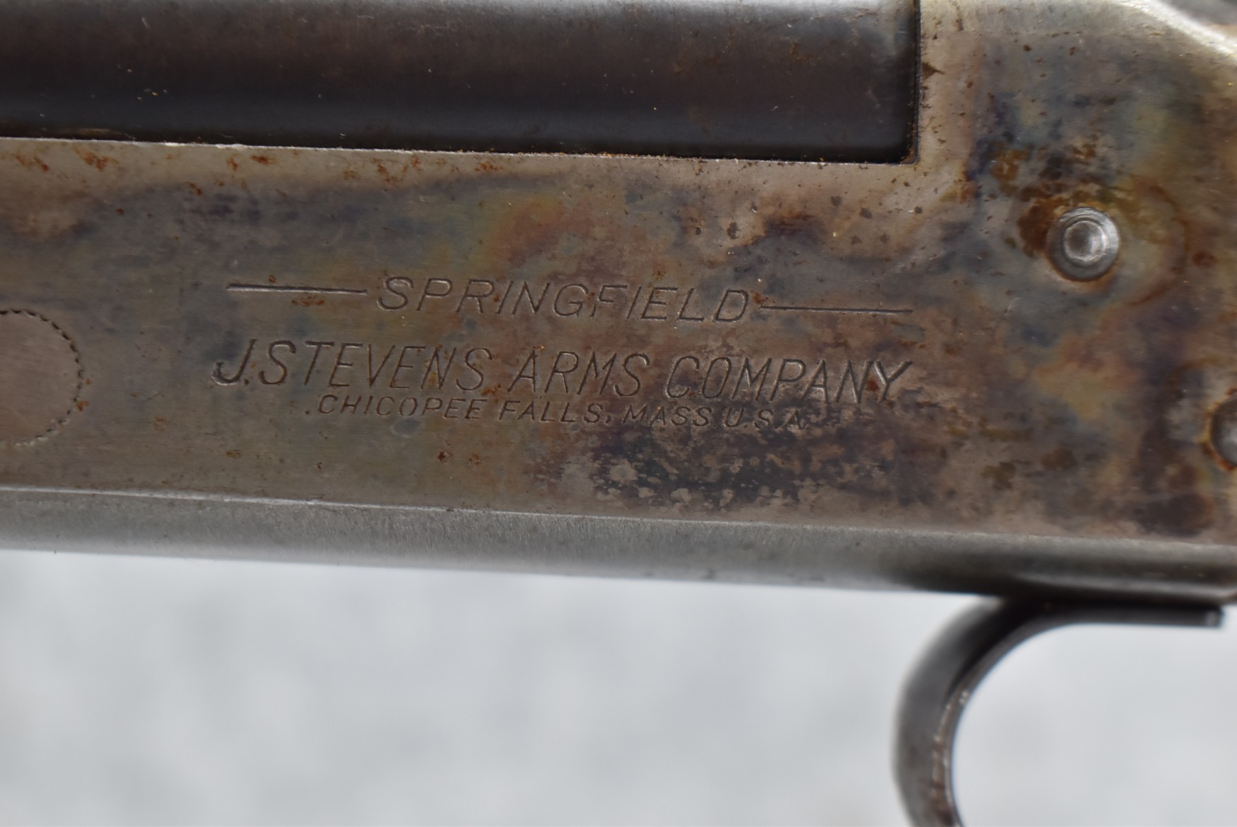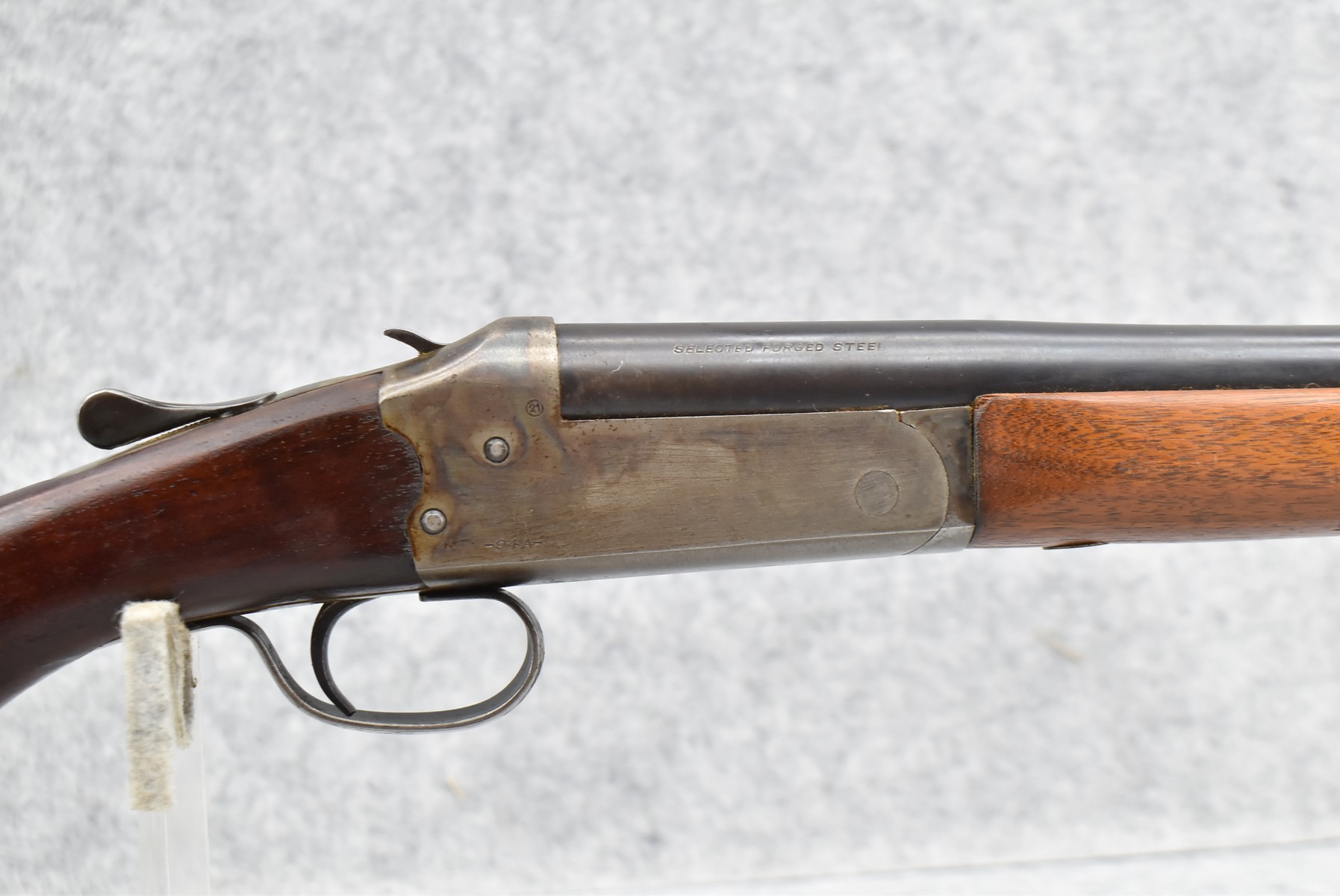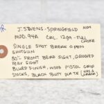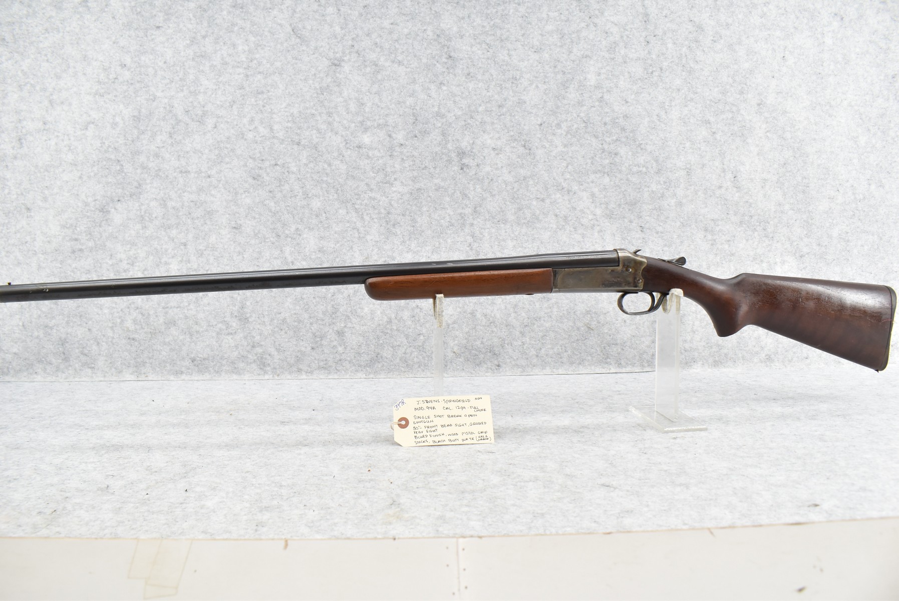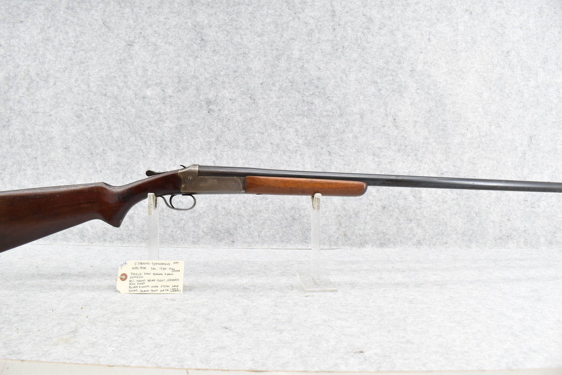 397R. J. Stevens – Mod. 94A – 12ga. Single Shot Shotgun – w/30” Full Choke Barrel w/Front Bead & Grooved Rear Sights – Blued Finish – w/Wood Pistol Grip Stock w/Butt Plate (Has a Crack)