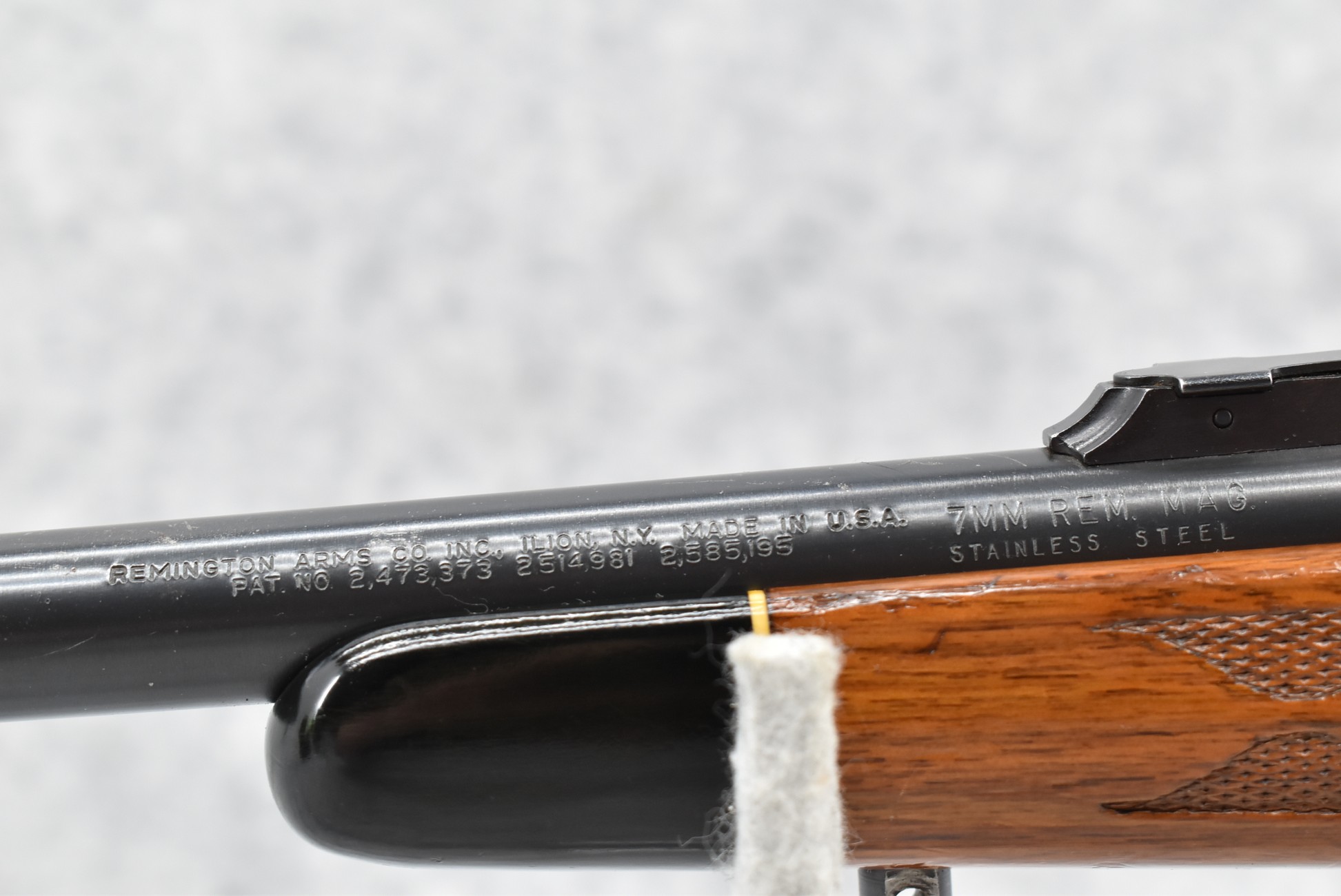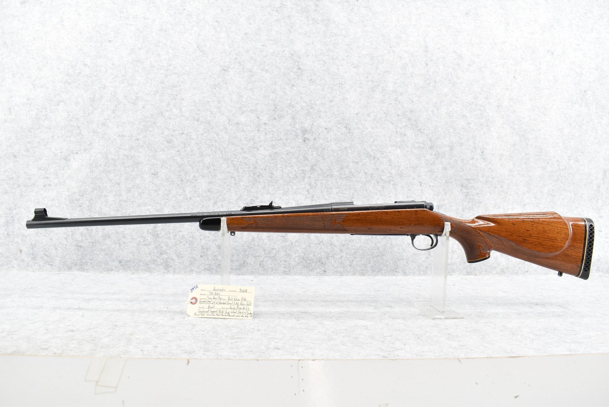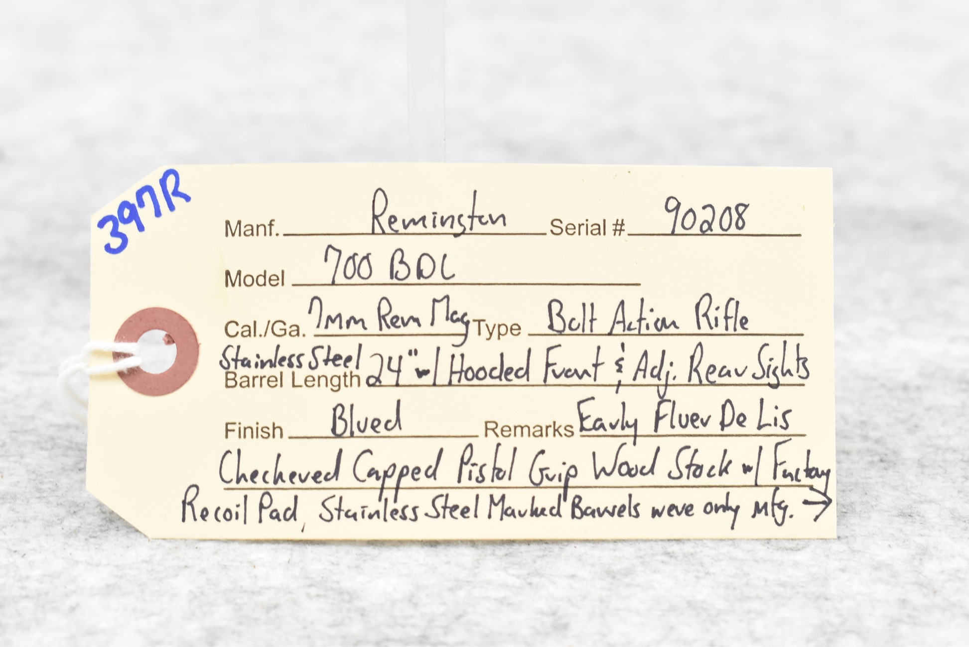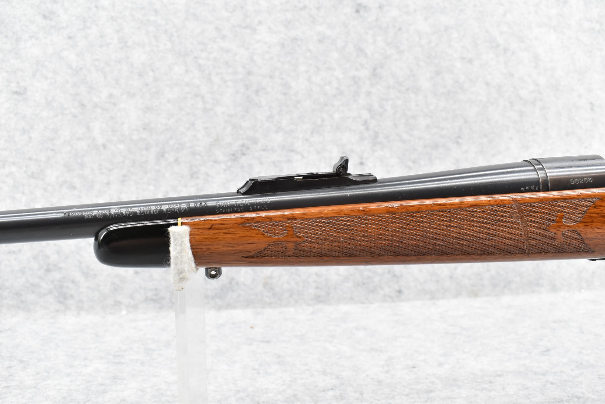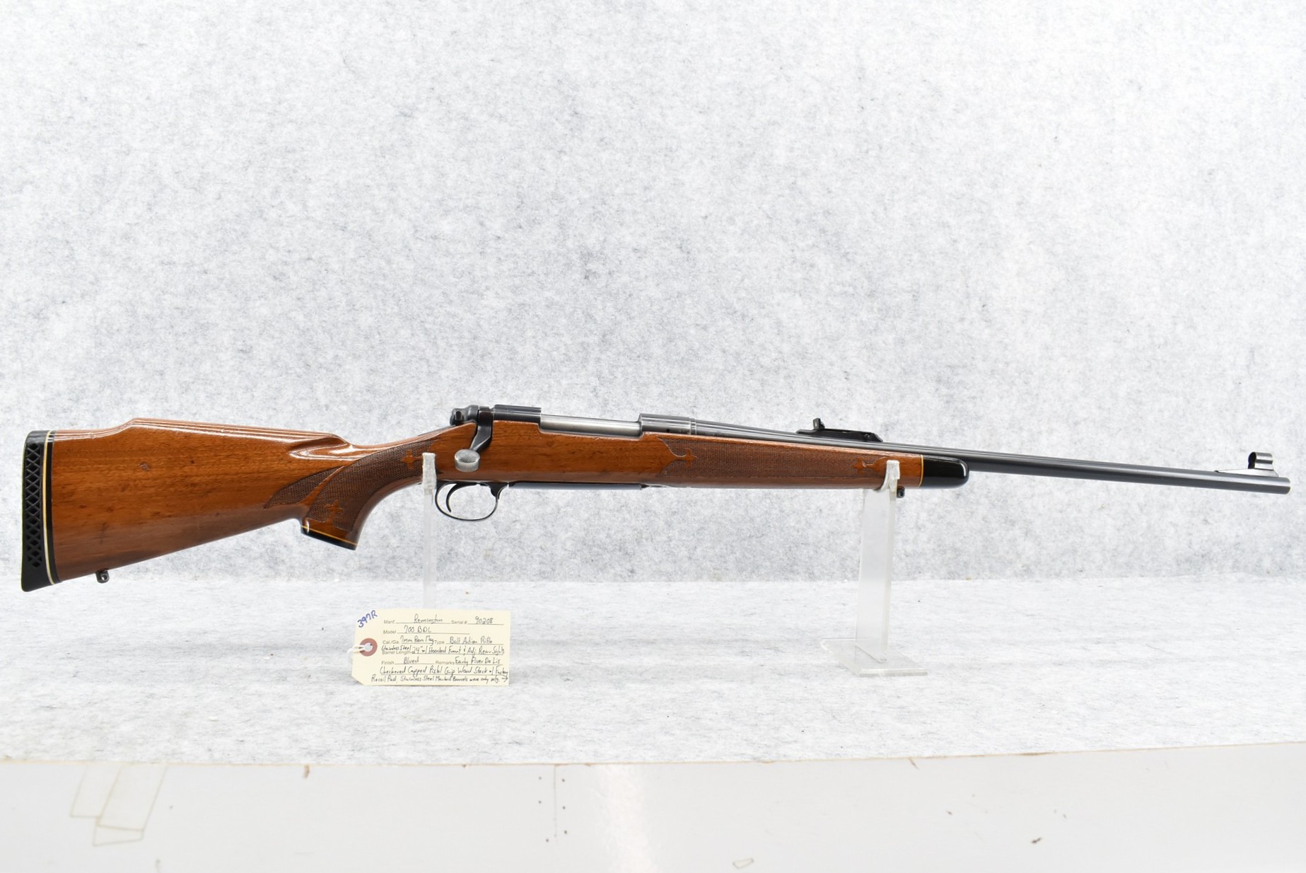 397R. Remington – Mod. 700 BDL – 7mm Rem. Mag. Cal. Bolt Action Rifle – w/24” Stainless Steel Barrel w/Hooded Front & Adj. Rear Sights – Blued Finish – w/Early Fleur De Lis Checkered Capped Pistol Grip Wood Stock w/Factory Recoil Pad – Stainless Steel Marked Barrels Were Only Mfg. Between 1962-1970 Only
