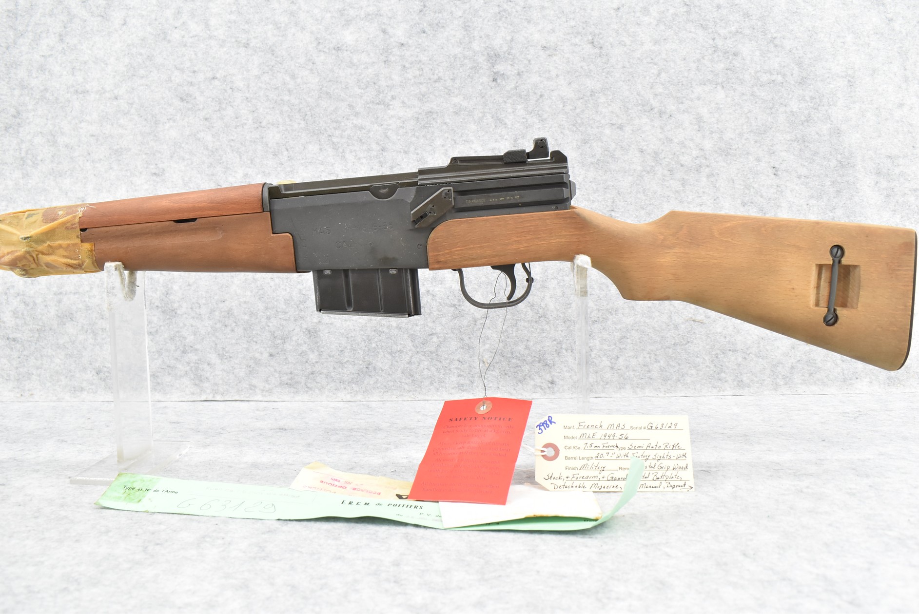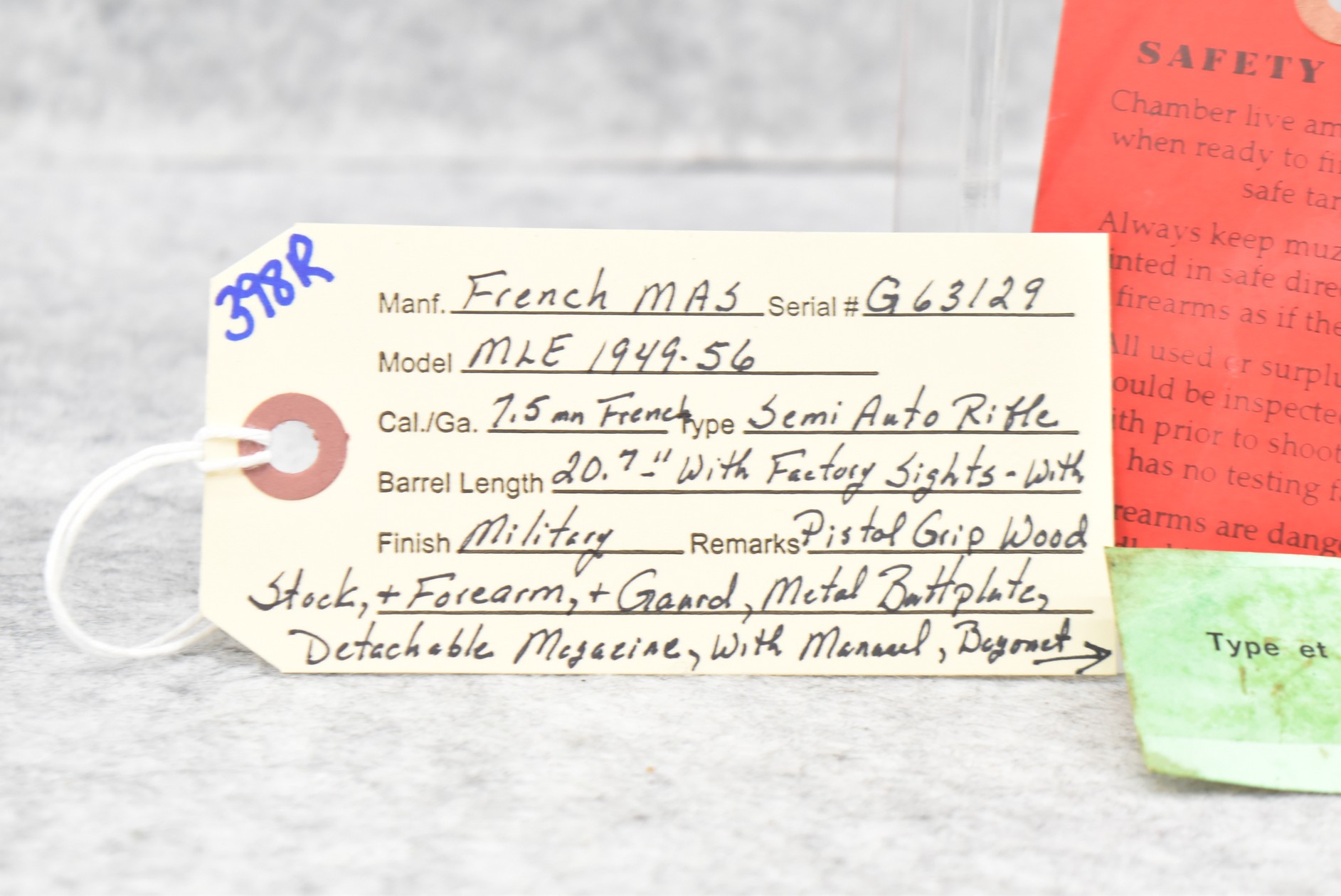 398R. French MAS – Mod. MLE 1949-56 – 7.5mm French Cal. Semi-Auto Rifle – w/20.7” Barrel w/Factory Sights – Military Finish – w/Pistol Grip Wood Stocks w/Metal Butt Plate – w/Detachable Magazine – w/Bayonet – w/Manual, Cleaning Tools & Pouch w/Rubber Butt Cover