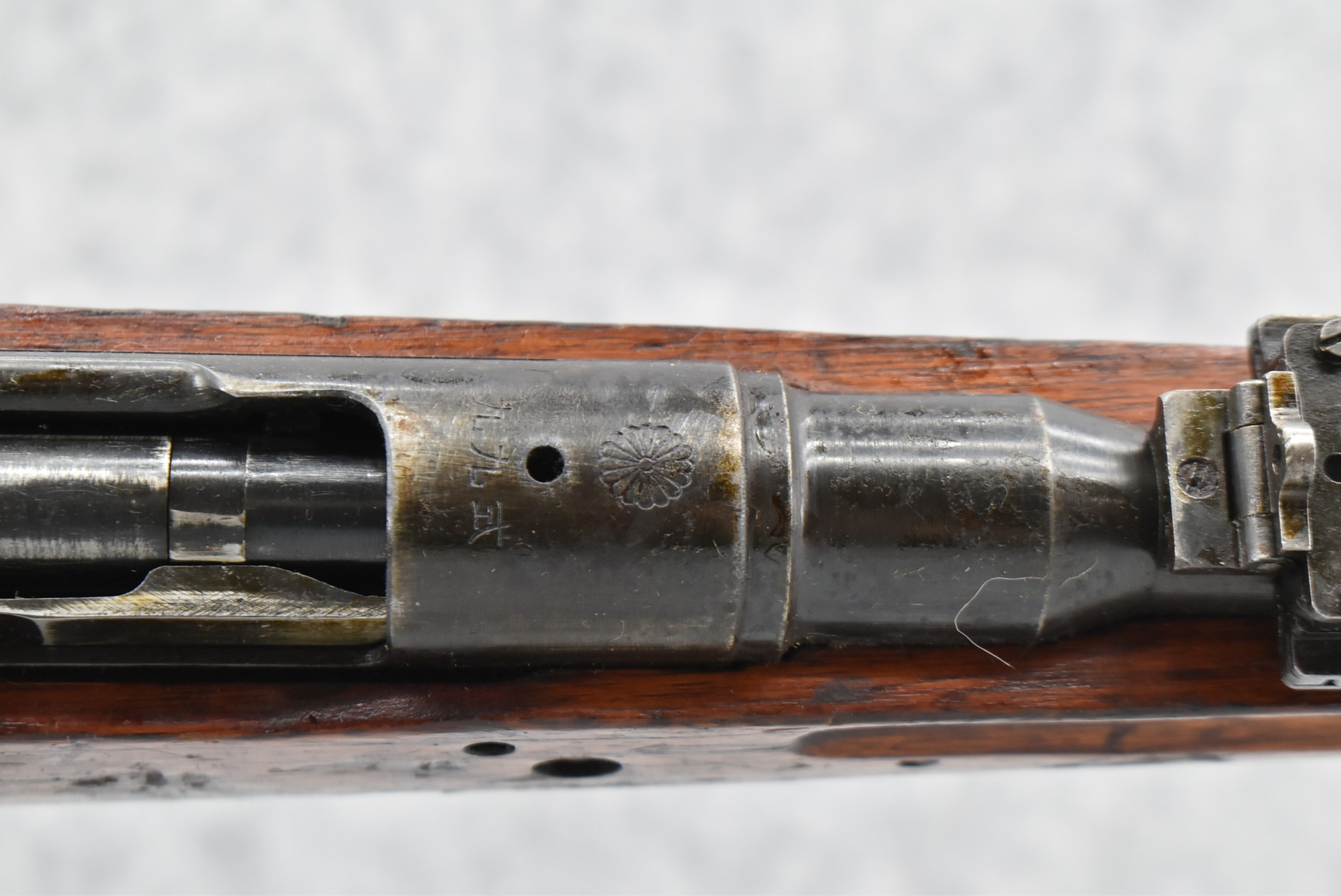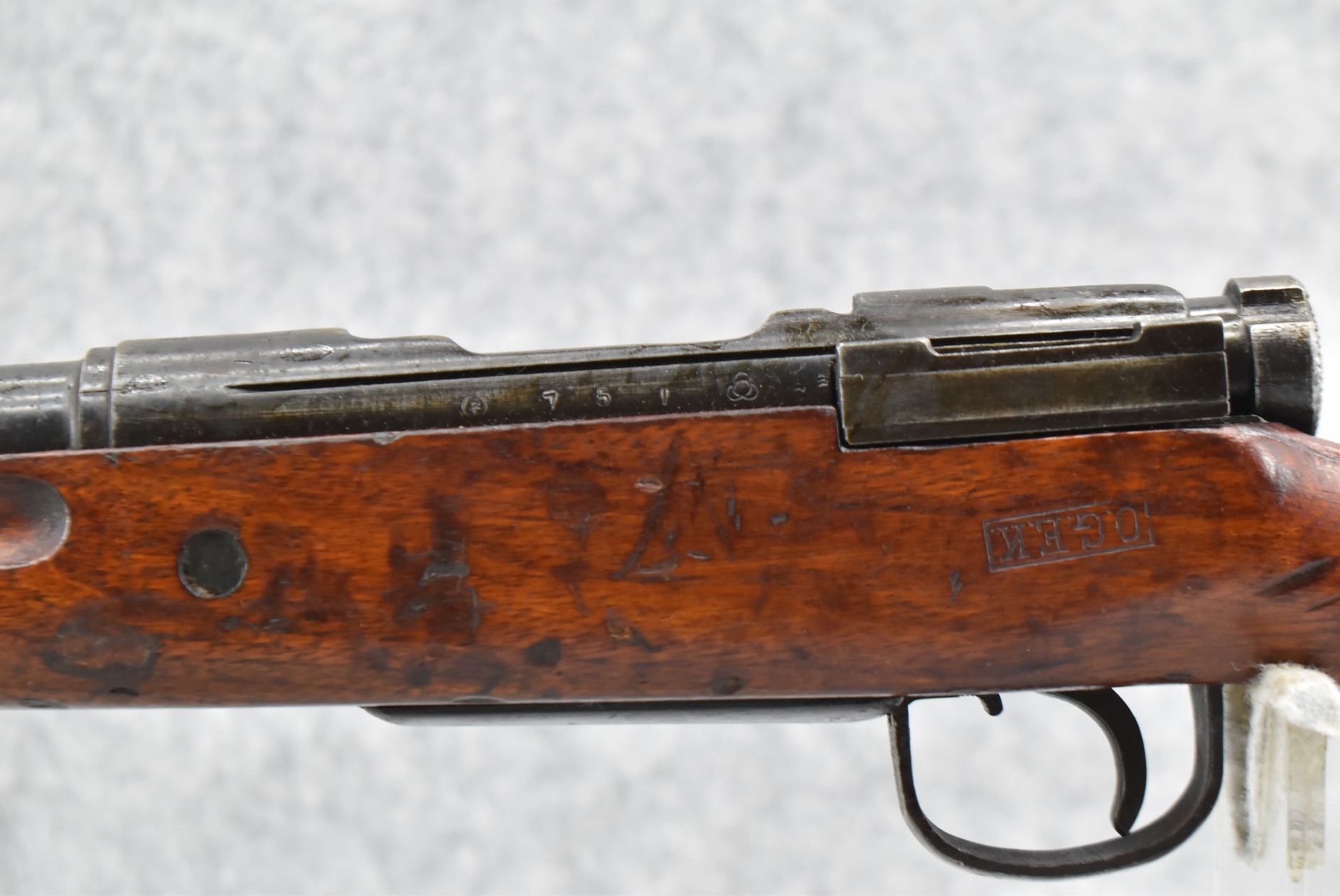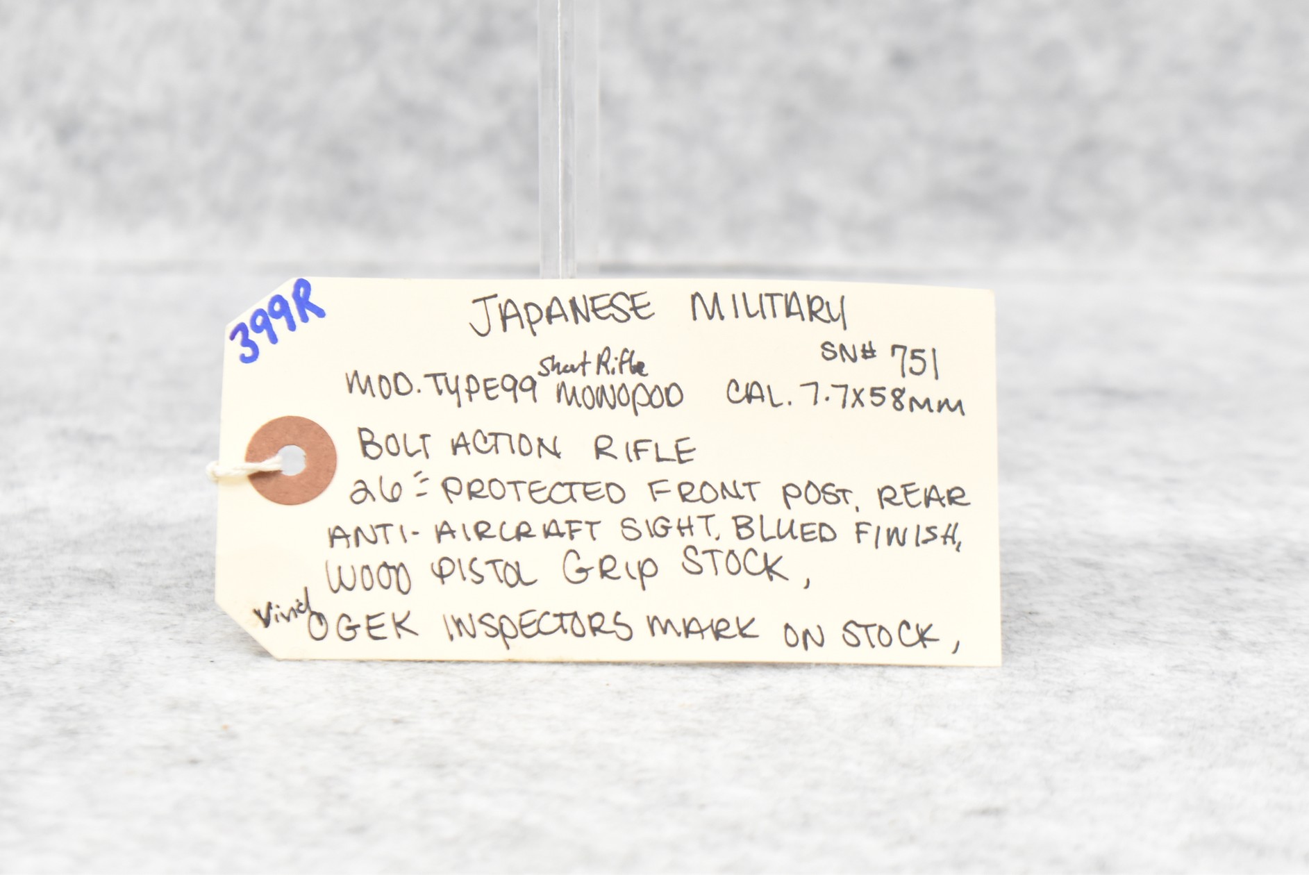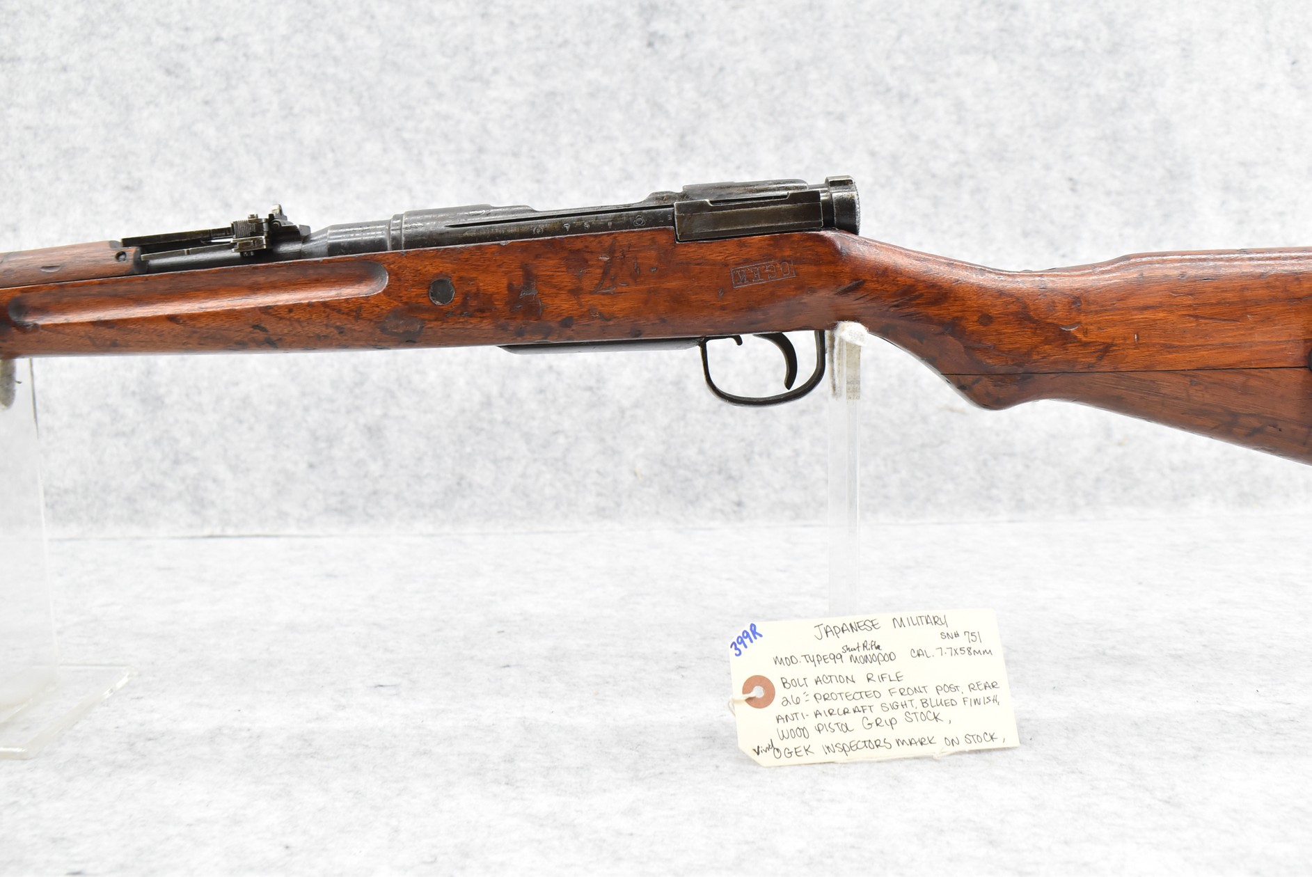 399R. Japanese – Type 99 Short Rifle – 7.7 Jap Cal. Bolt Action Rifle – w/26” Barrel w/Protected Front & Post Rear & Anti-Aircraft Sights – Blued Finish – w/Wood Pistol Grip Stock w/Factory Butt Plate &Vivid OGEK Inspectors Mark on Stock – w/Matching Bolt – w/Sling Mounts – w/Monopod – Unground Mum