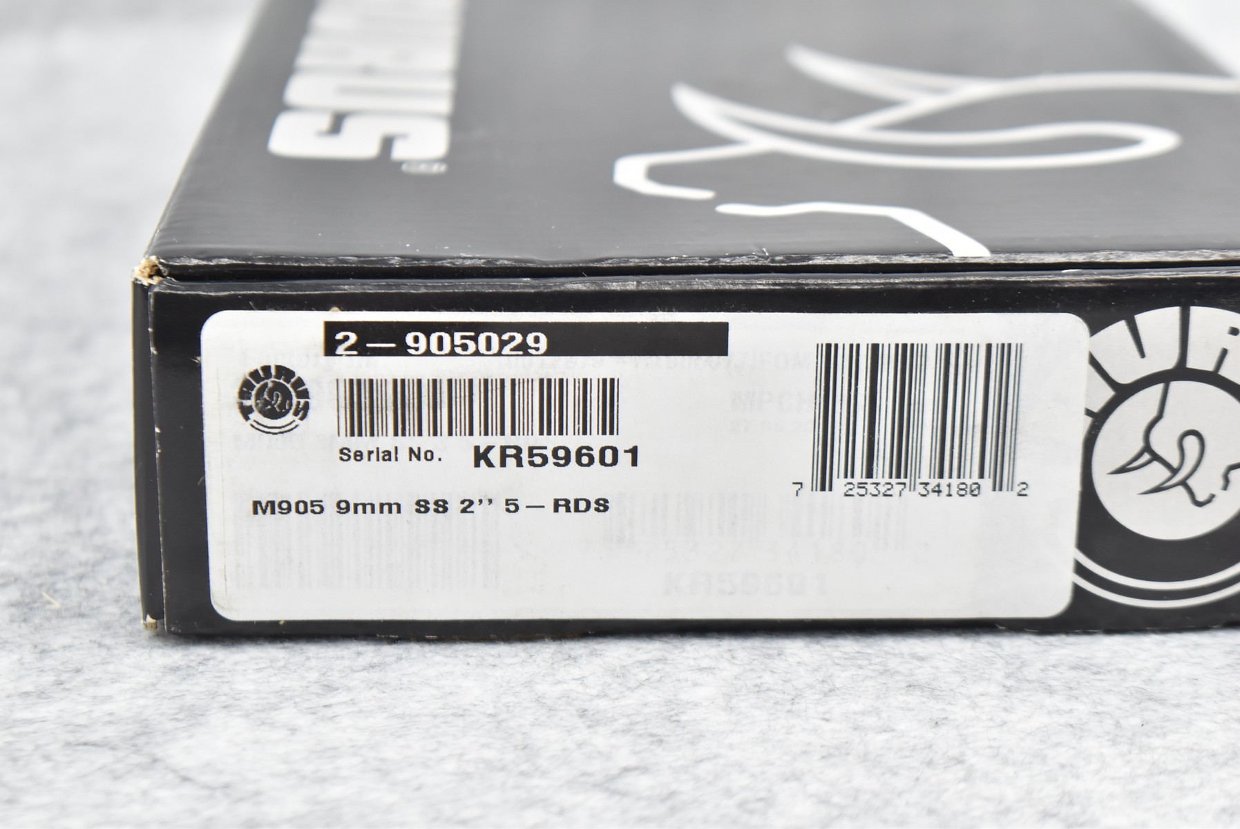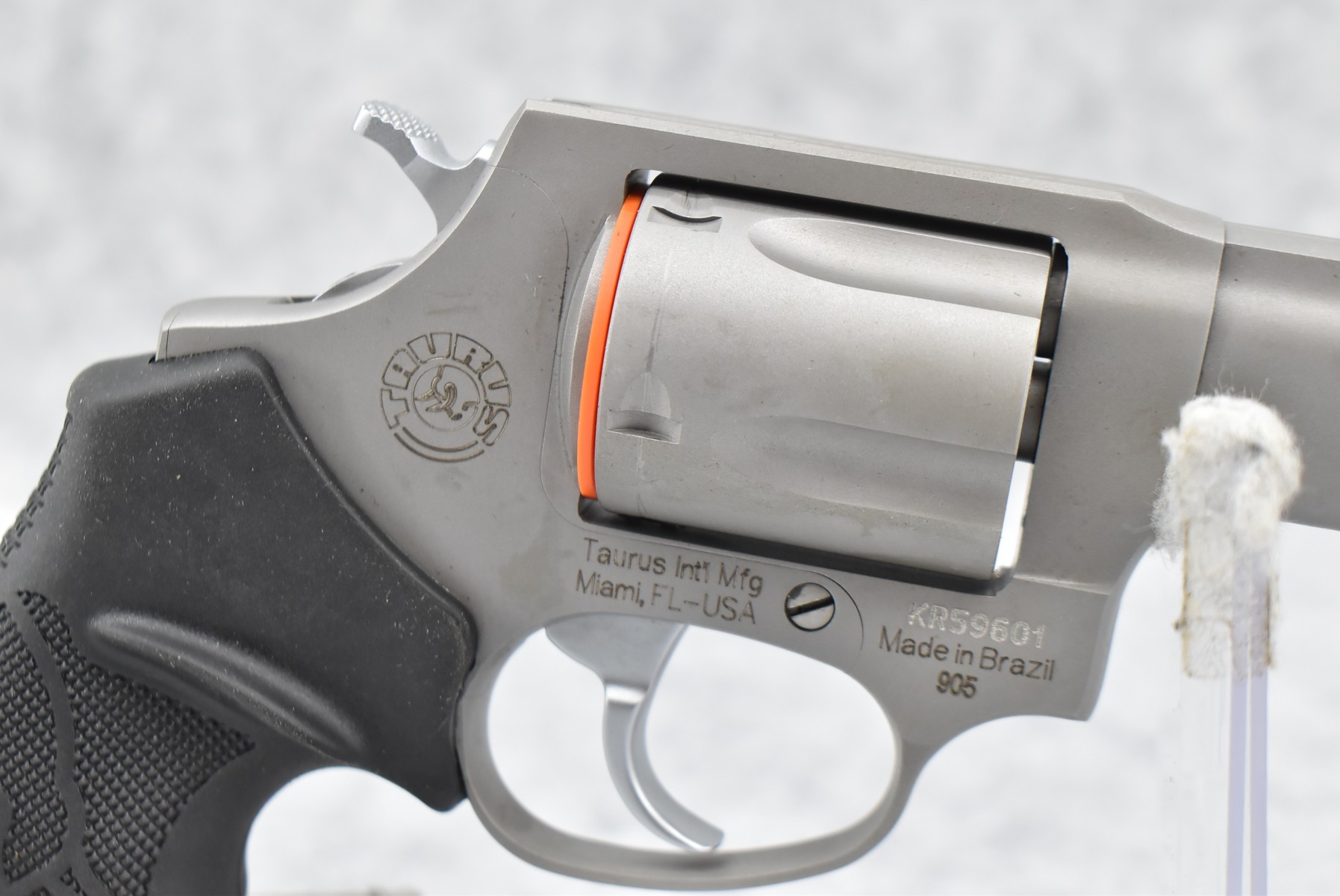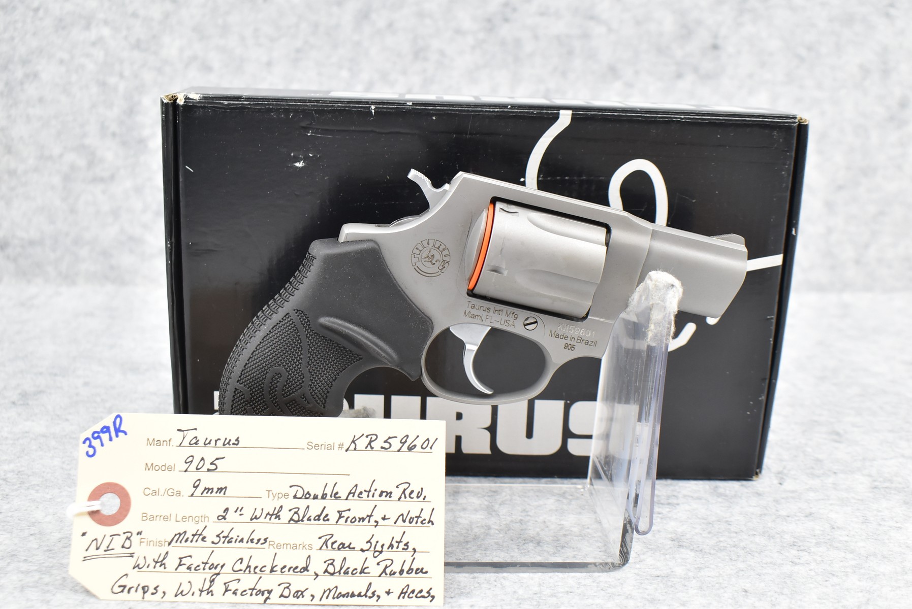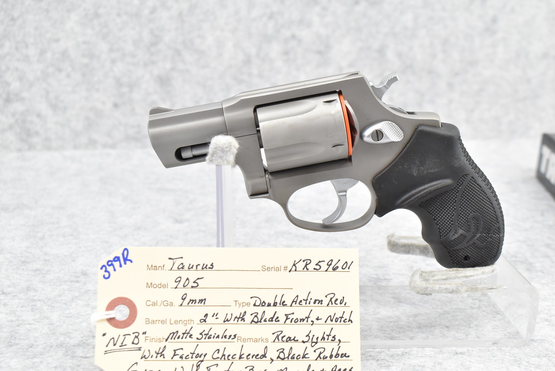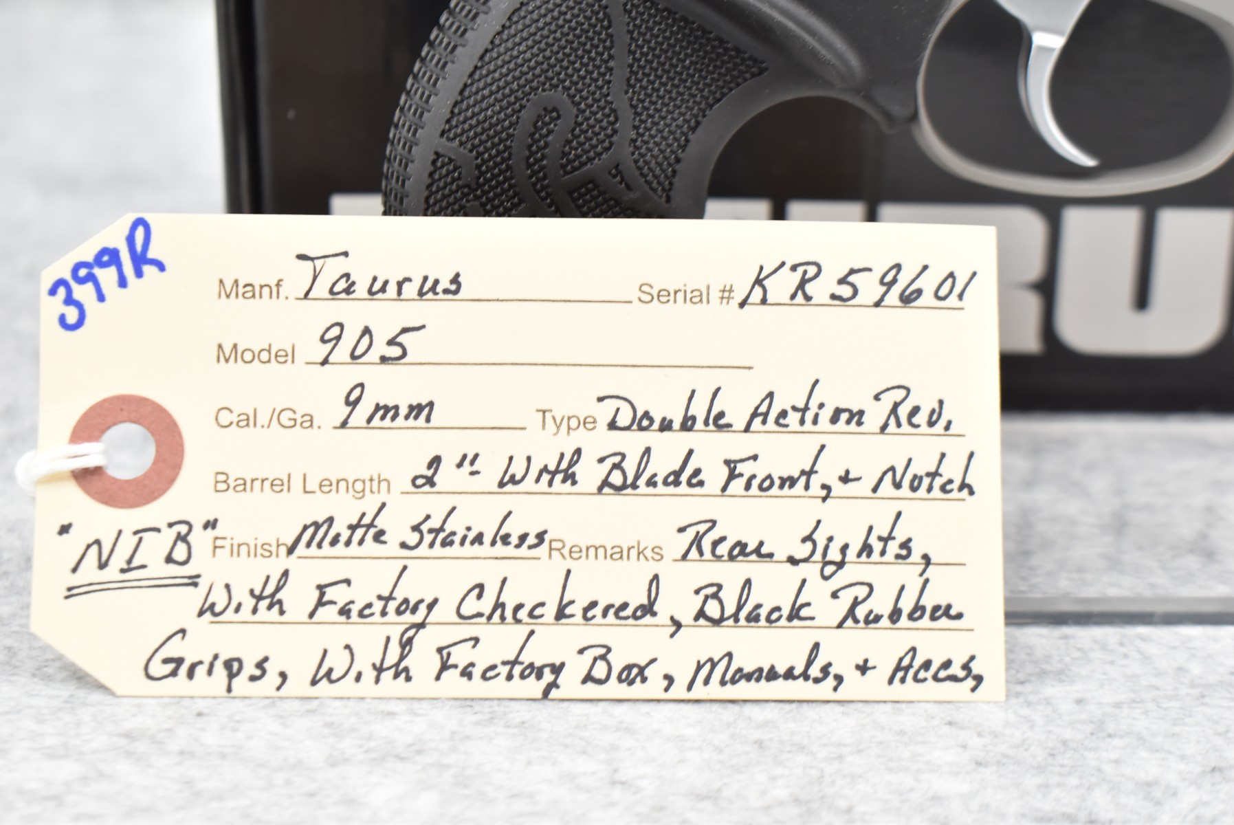 399R. Taurus – Mod. 905 – 9mm Cal. Double Action Revolver – w/2” Barrel w/Blade Front and Rear Notch Sights – Matte Stainless Finish – w/Factory Checkered Black Rubber Grips – New in Factory Box w/Manuals and Accessories