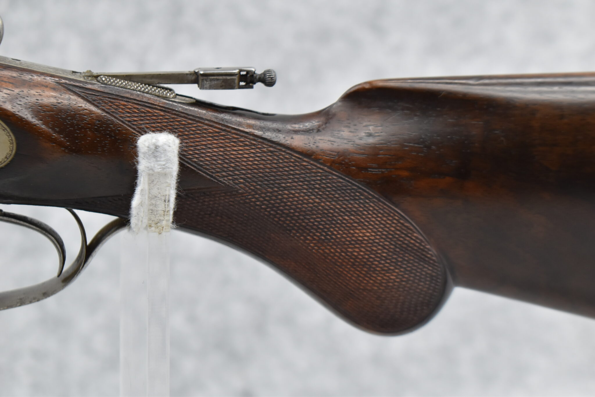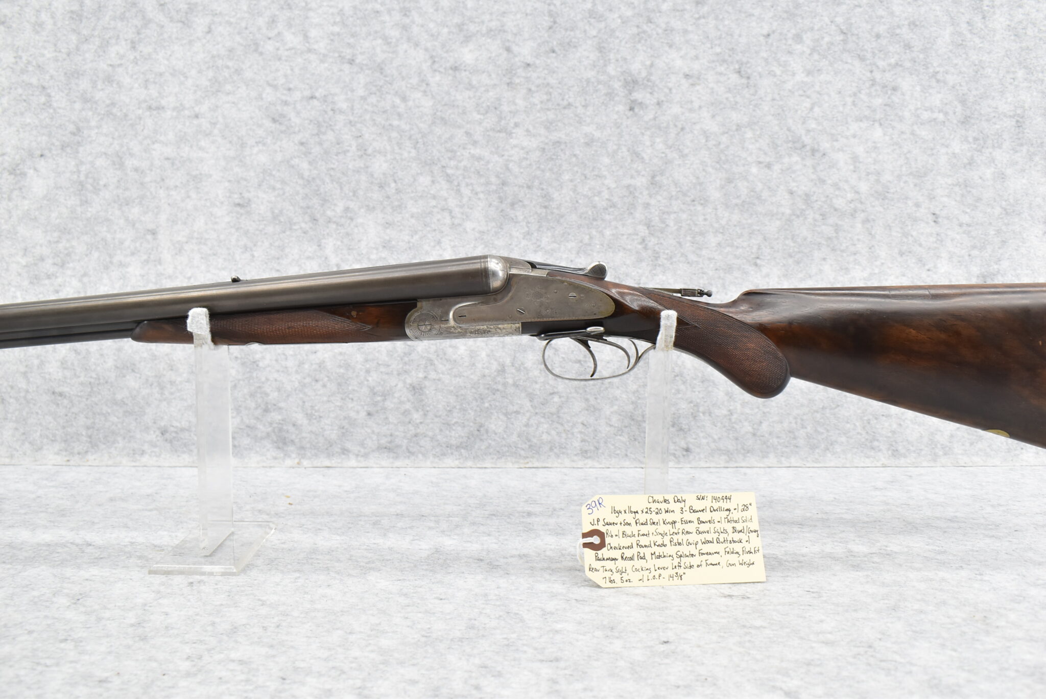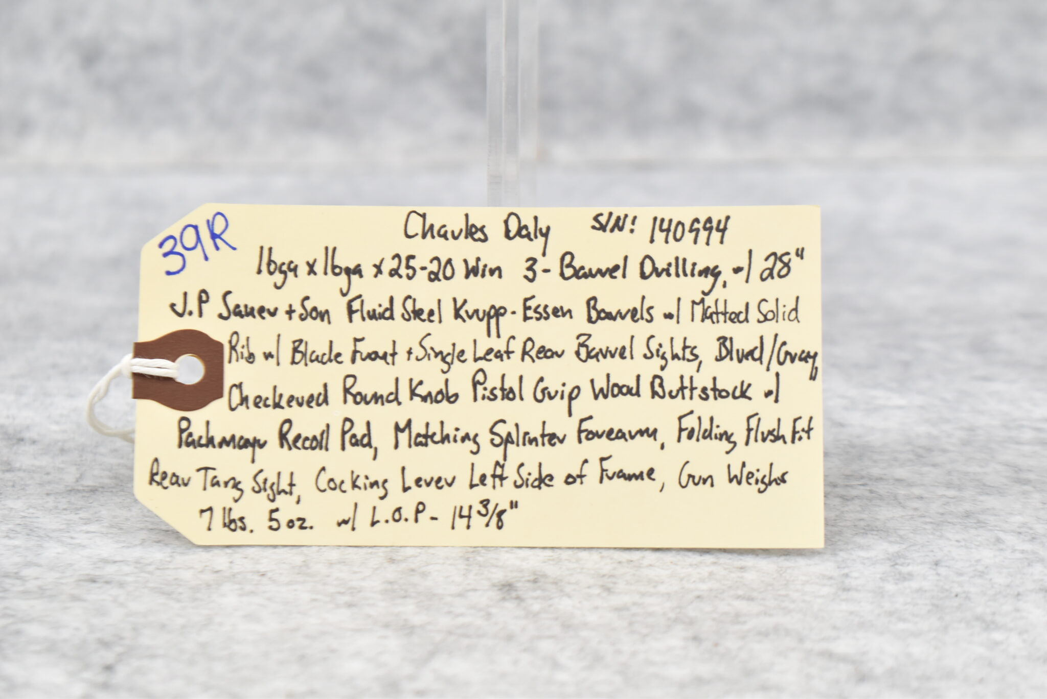 39R. Charles Daly – 16ga. X 16ga. X 25-20 Win. Cal. 3-Barrel Drilling – w/28” J.P. Sauer & Son Fluid Steel Krupp-Essen Barrels w/Matted Solid Rib w/Blade Front & Single Leaf Rear Barrel Sights – Blued/Gray Finish – w/Checkered Round Knob Pistol Grip Wood Butt Stock w/Pachmayr Recoil Pad & Matching Splinter Forearm – w/Folding Flush Fit Rear Tang Sight – w/Cocking Lever on Left Side of Frame – LOP 14 3/8” – Gun Weighs 7lbs. 5oz.