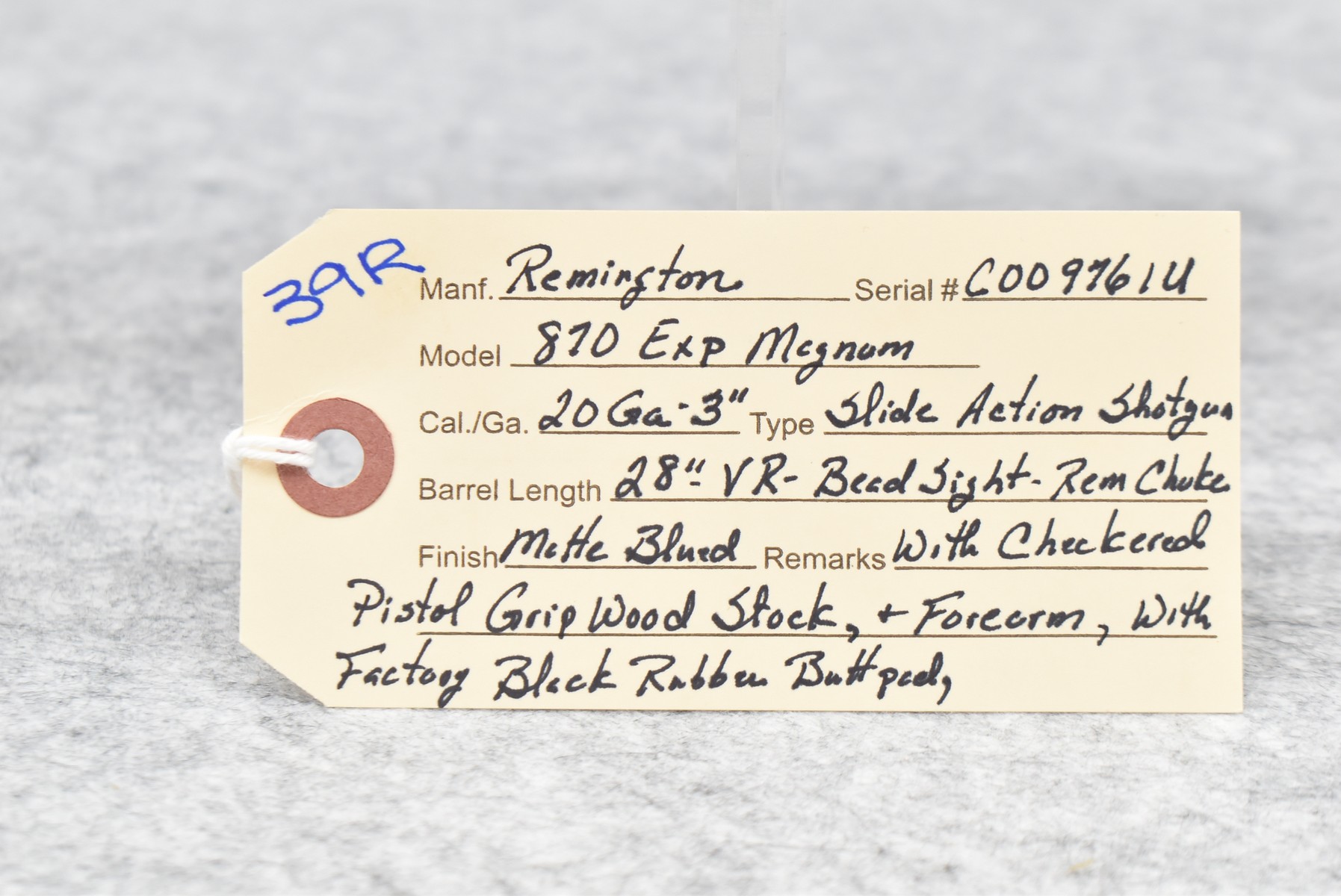 39R. Remington – Mod. 870 Express Magnum – 20ga. 3” Pump Action Shotgun – w/28” Rem. Choke, Vent-Rib Barrel w/Bead Sight – Matte Blued Finish – w/Checkered Pistol Grip Wood Stocks w/Factory Butt Pad