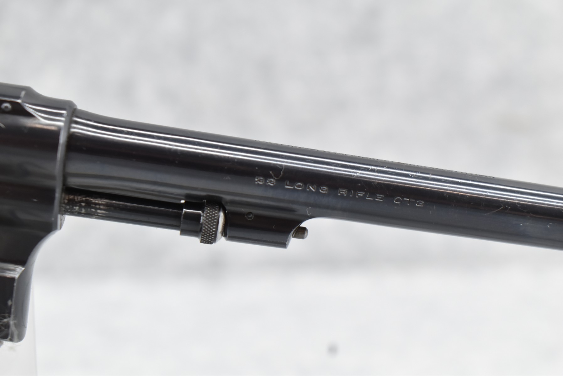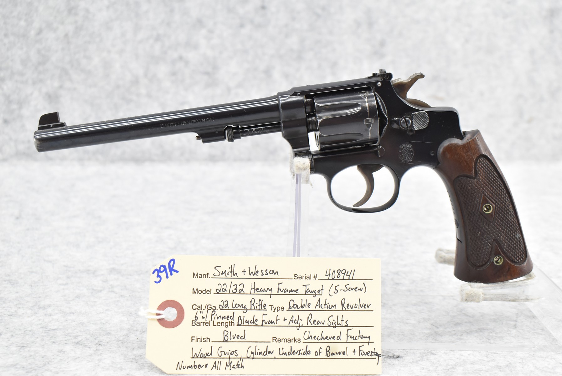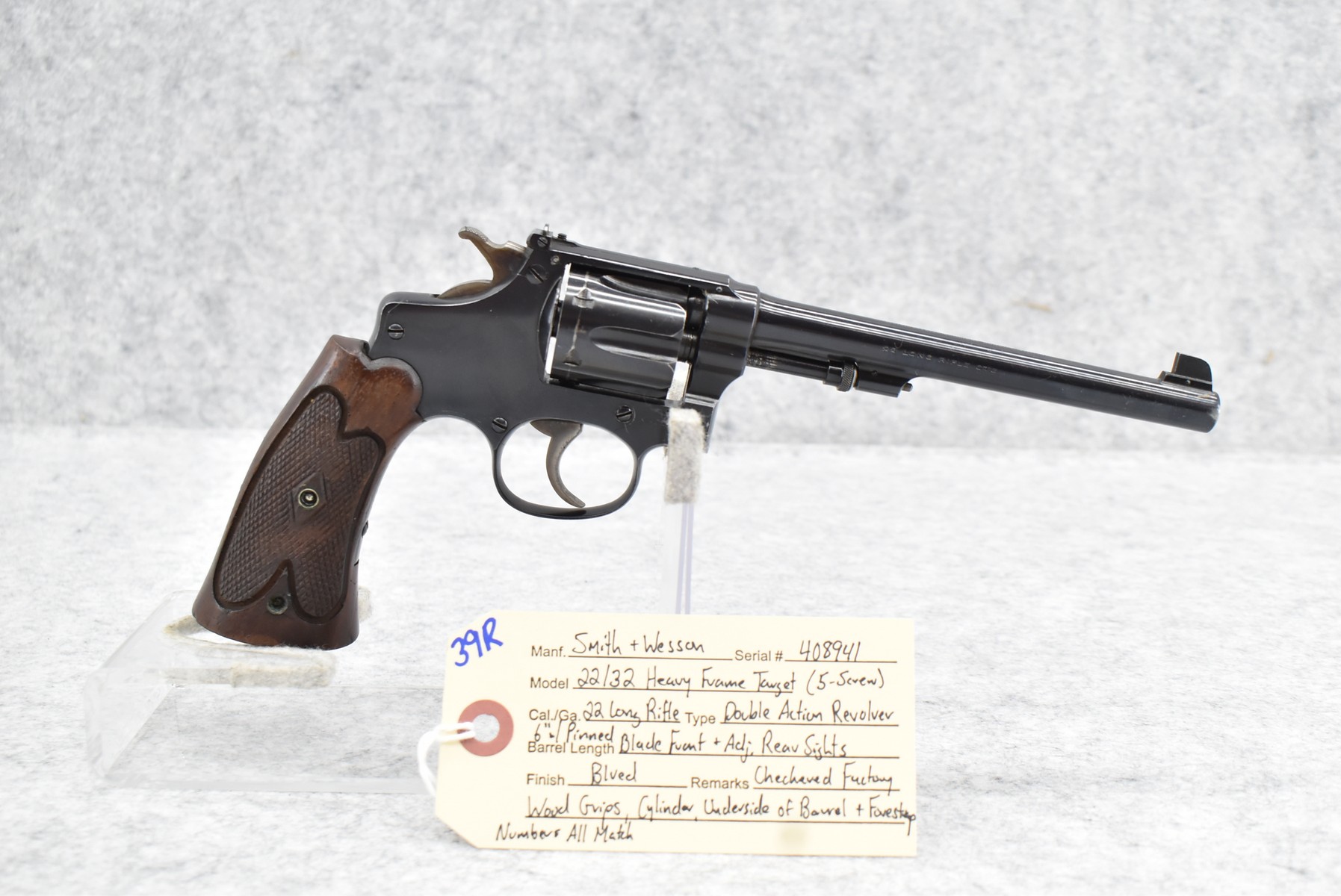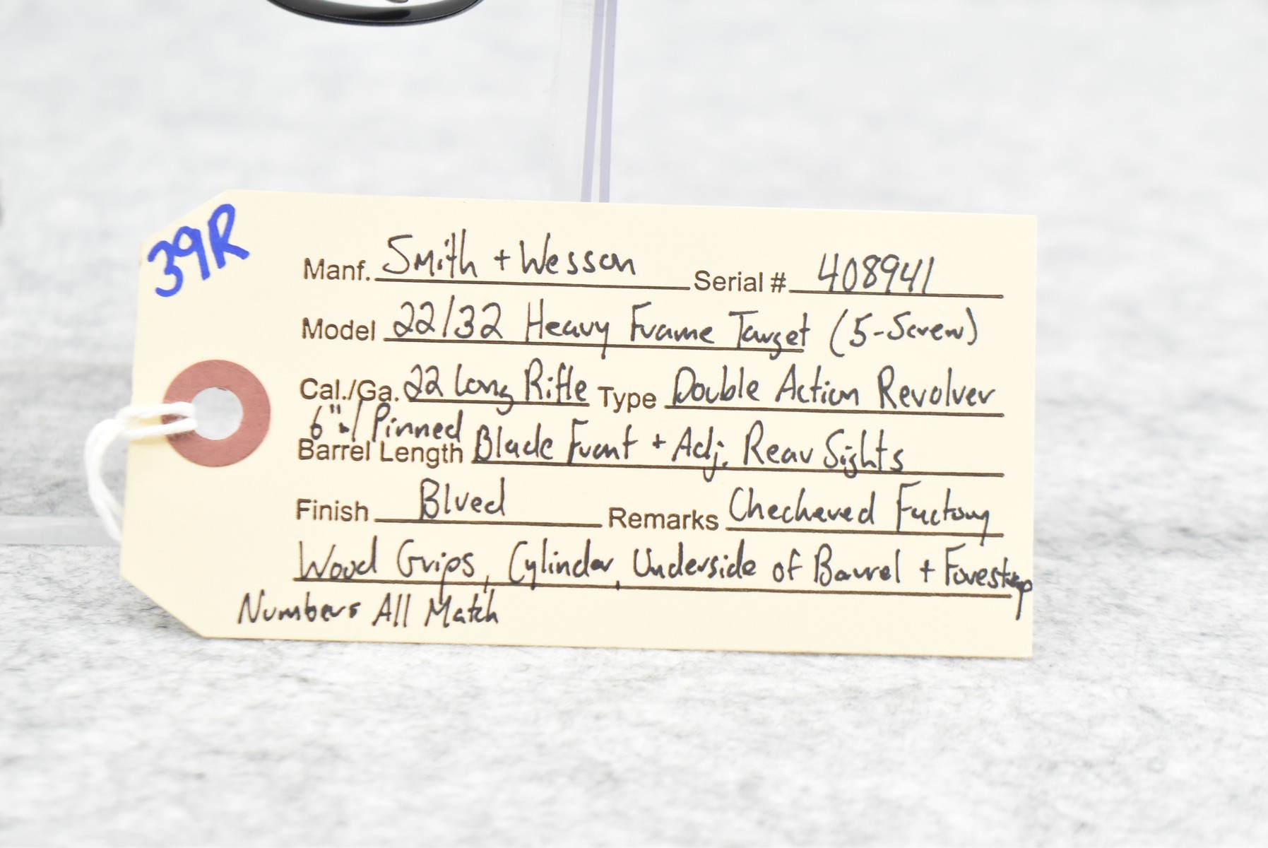 39R. Smith & Wesson – Mod. 22/32 Heavy Frame Target (5-Screw) – 22 Long Rifle Cal. Double Action Revolver – w/6” Barrel w/Blade Front & Adj. Rear Sights – Blued Finish – w/Checkered Factory Wood Grips – Cylinder, Underside of Barrel & Forestrap Numbers All Match