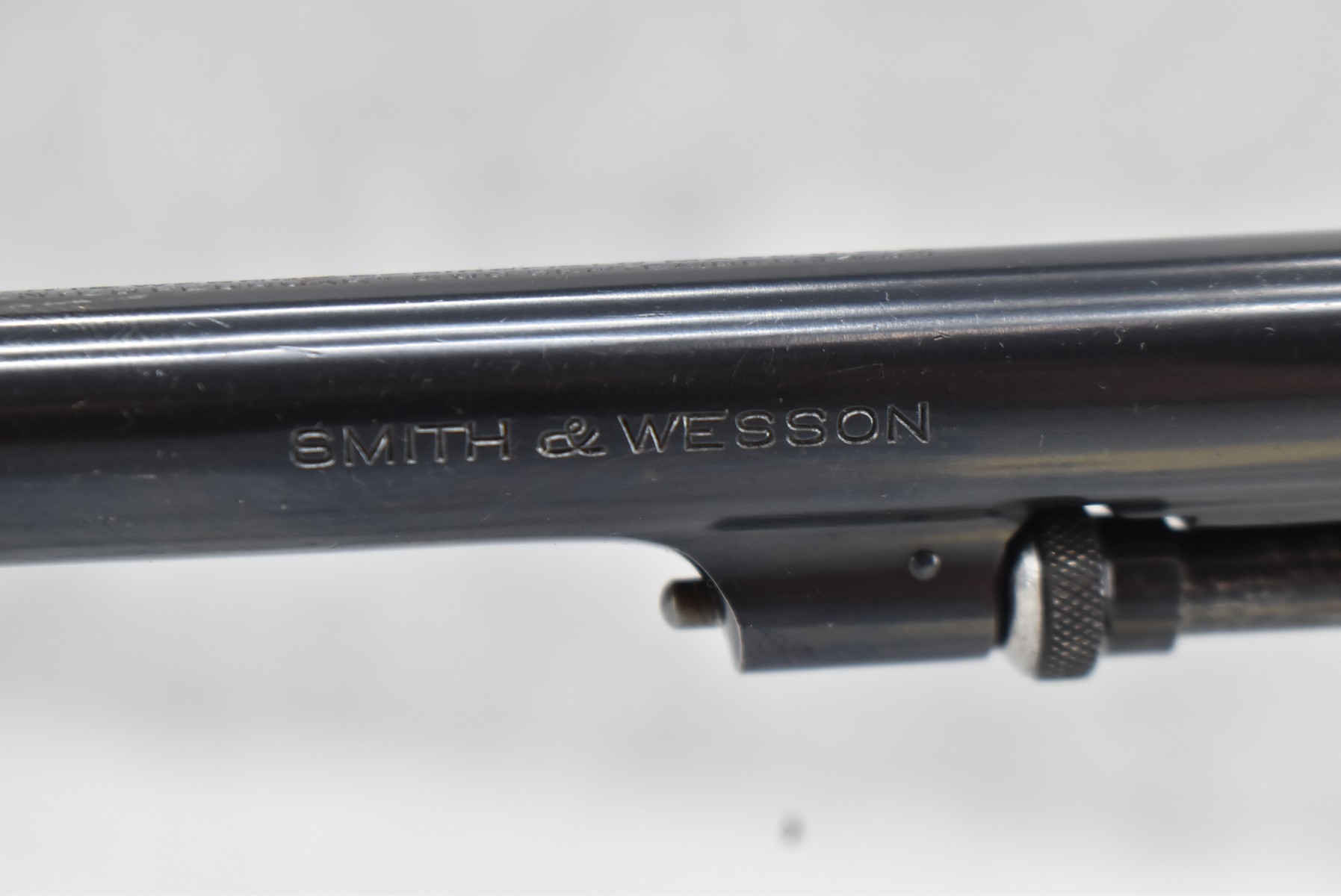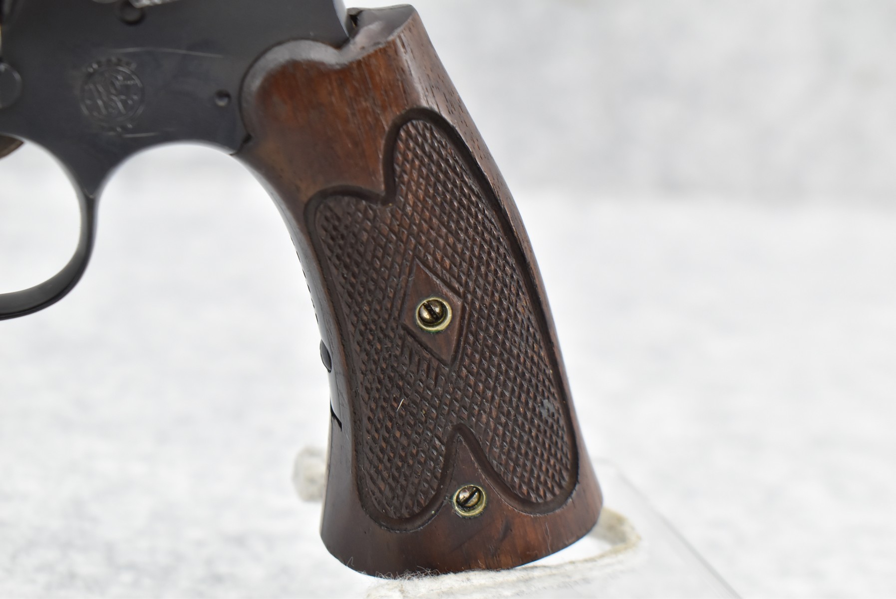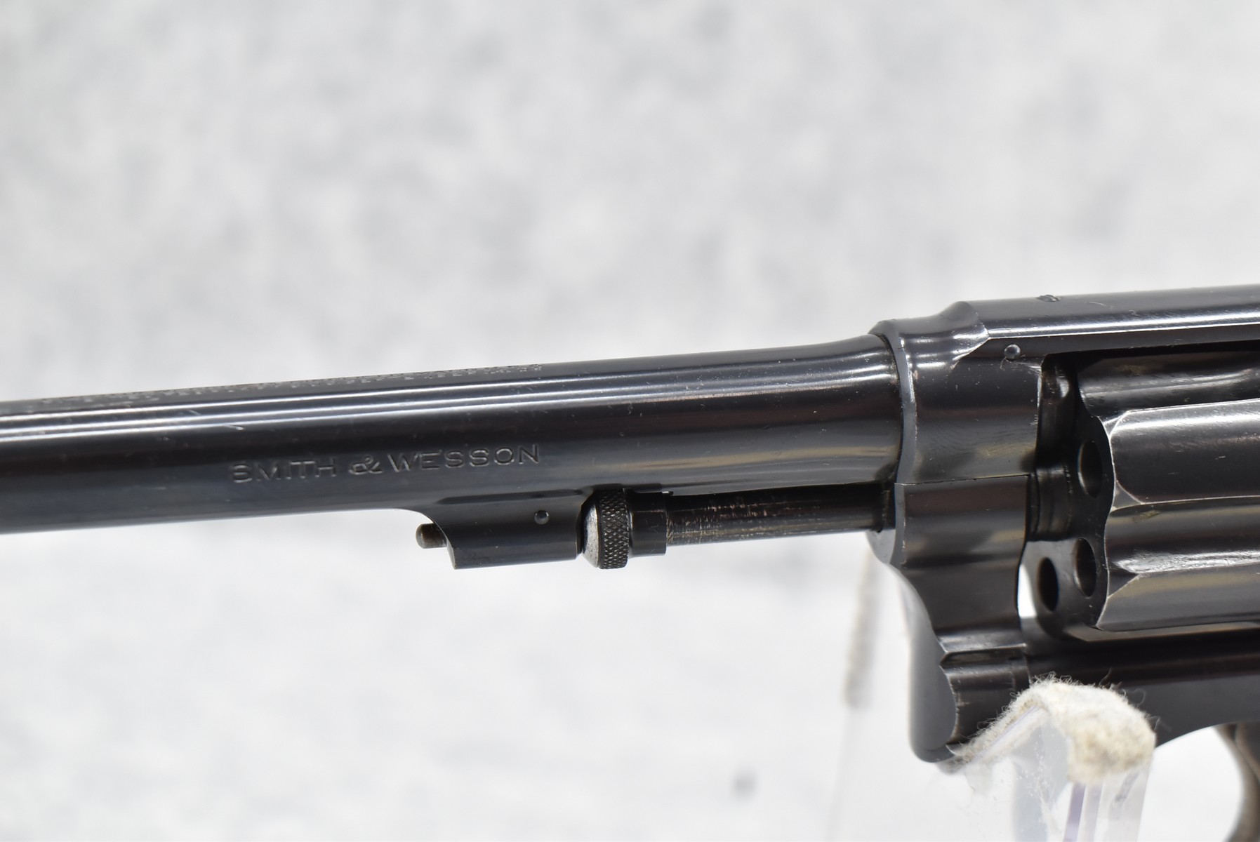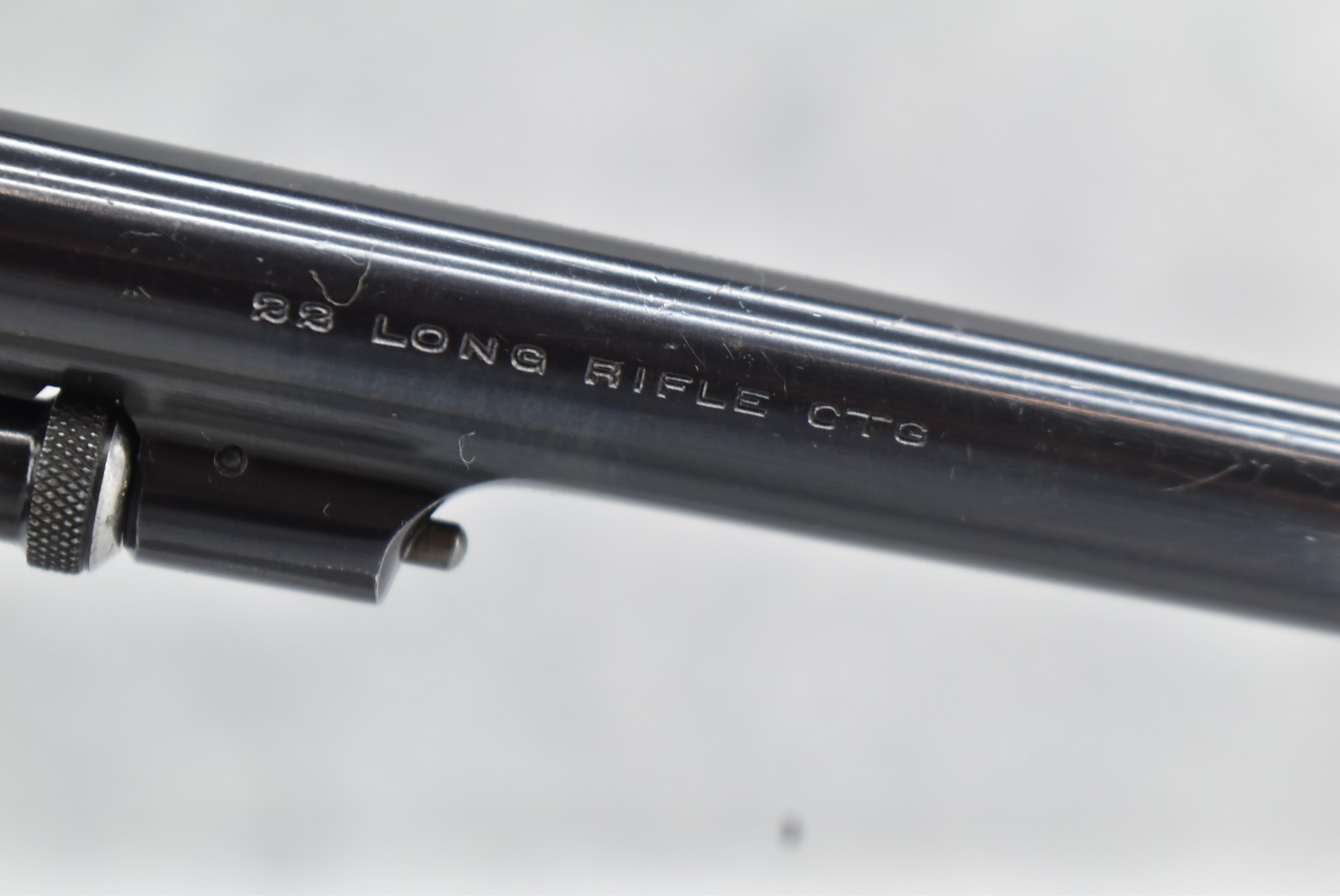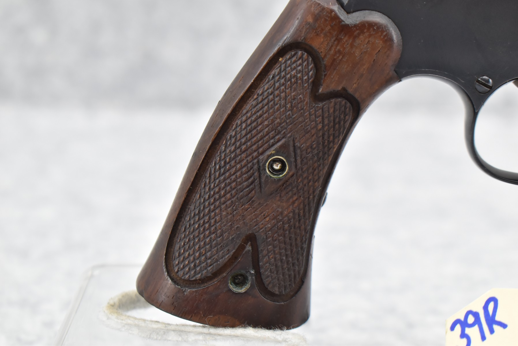 39R. Smith & Wesson – Mod. 22/32 Heavy Frame Target (5-Screw) – 22 Long Rifle Cal. Double Action Revolver – w/6” Barrel w/Blade Front & Adj. Rear Sights – Blued Finish – w/Checkered Factory Wood Grips – Cylinder, Underside of Barrel & Forestrap Numbers All Match