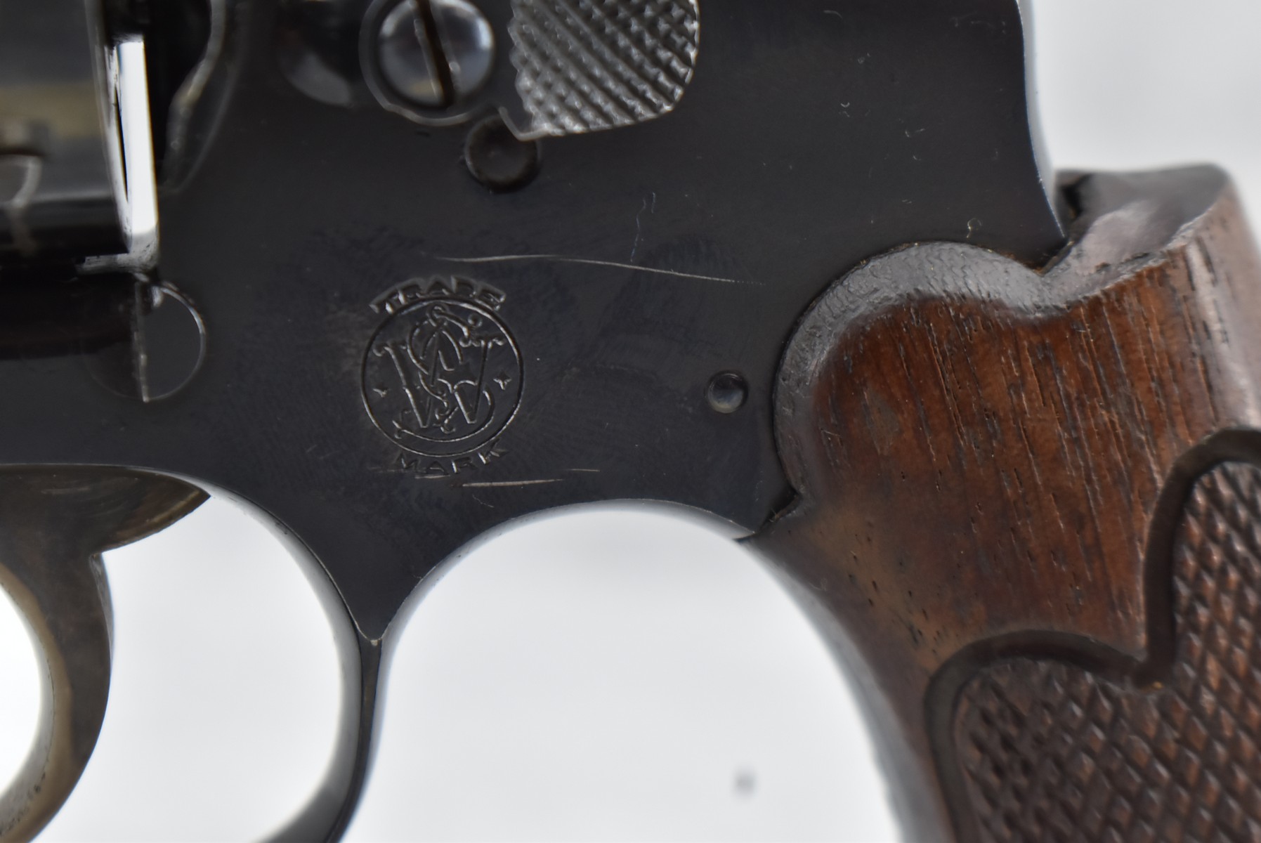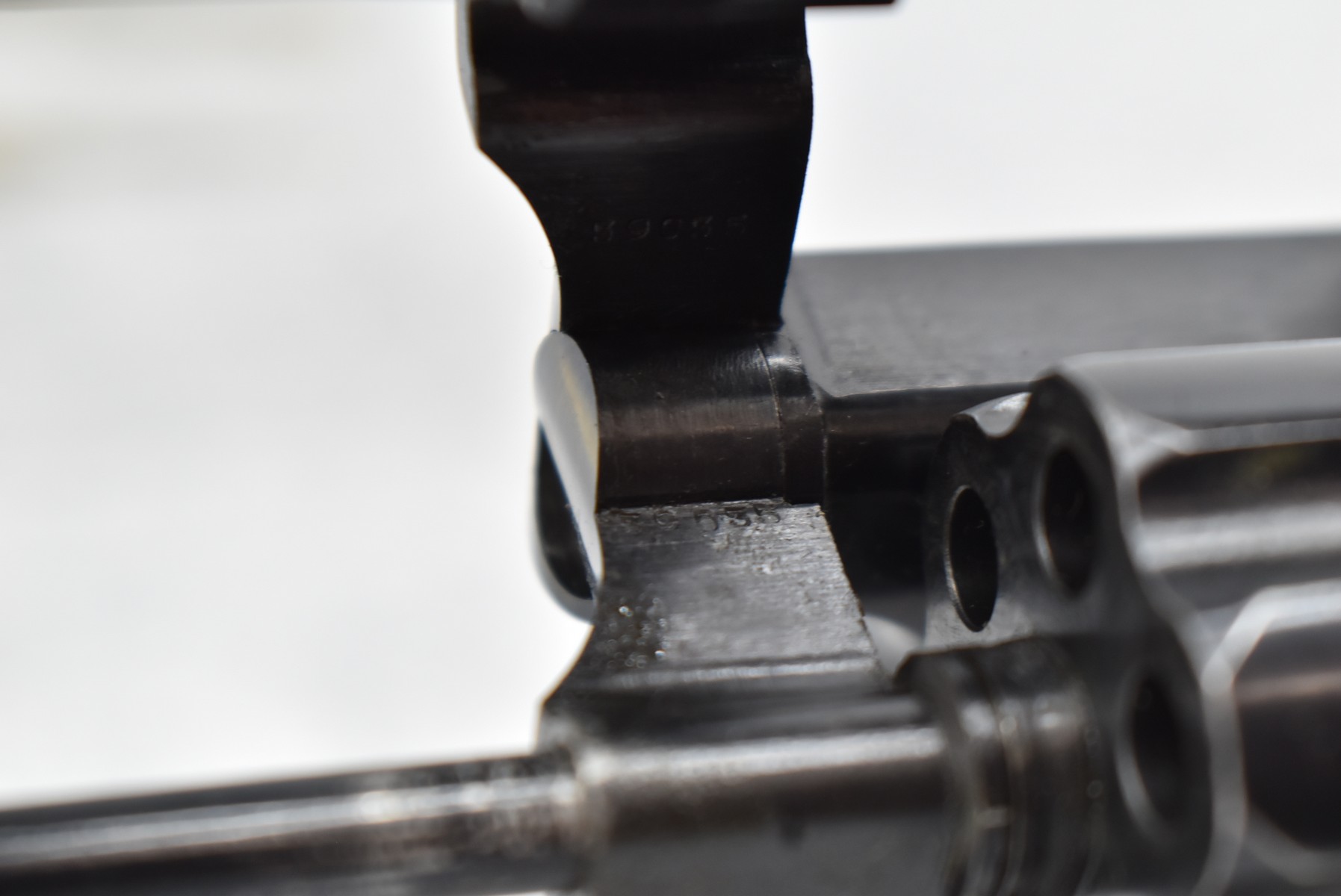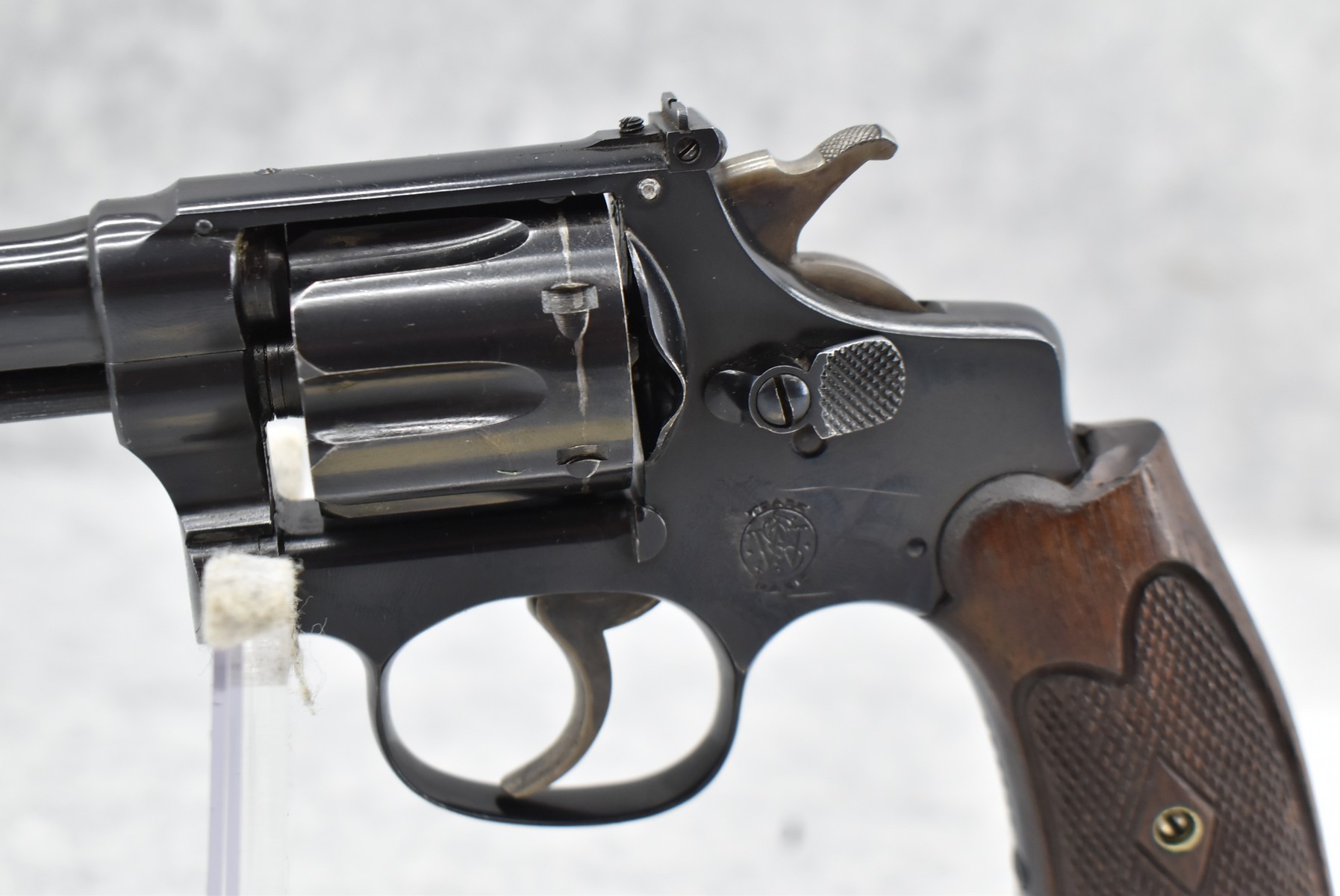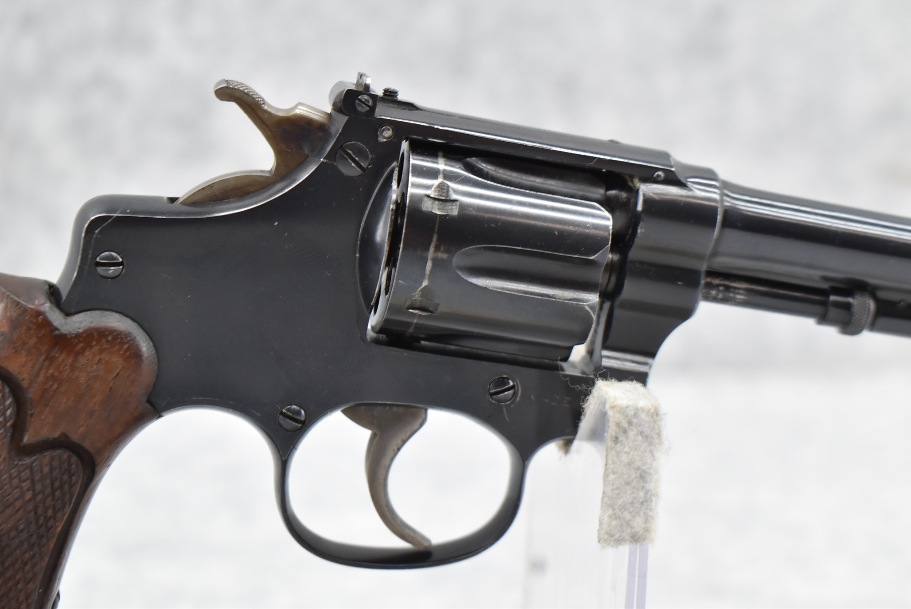 39R. Smith & Wesson – Mod. 22/32 Heavy Frame Target (5-Screw) – 22 Long Rifle Cal. Double Action Revolver – w/6” Barrel w/Blade Front & Adj. Rear Sights – Blued Finish – w/Checkered Factory Wood Grips – Cylinder, Underside of Barrel & Forestrap Numbers All Match