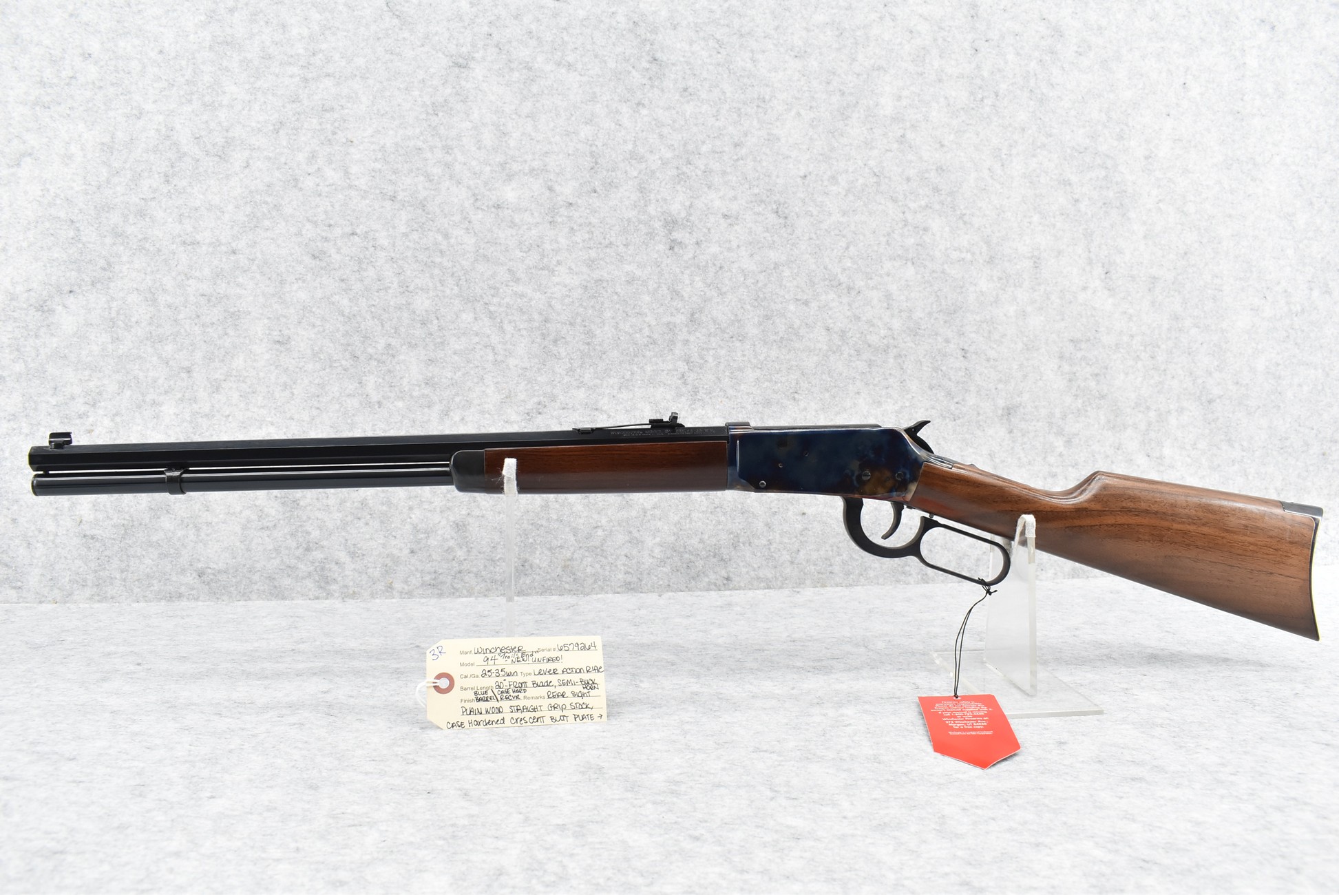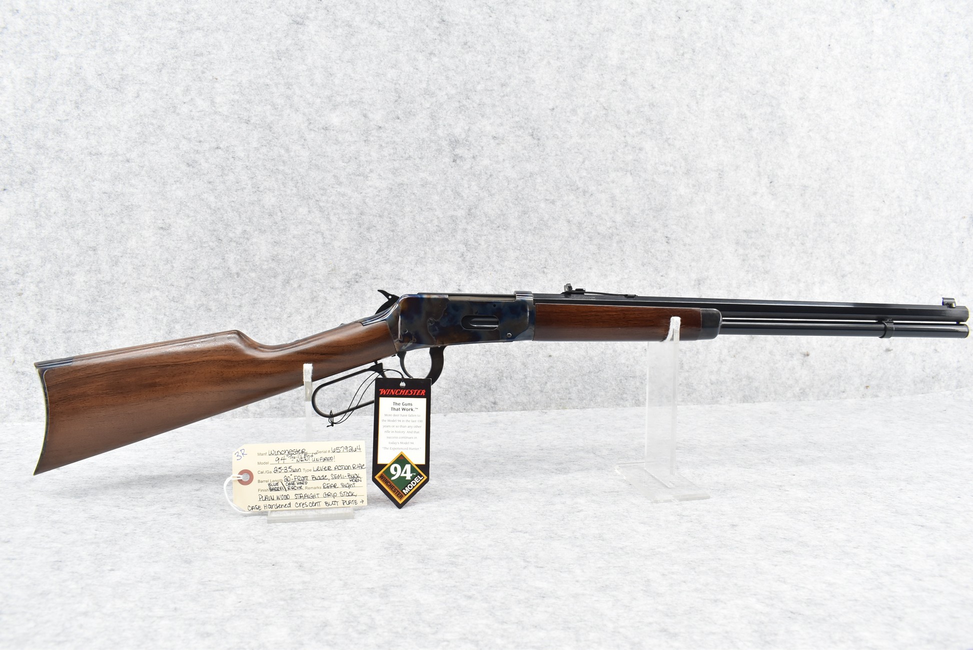3R. Winchester – Mod. 94 “Trails End” – 25-35 Win. Cal. Lever Action Rifle – w/20” Octagon Barrel w/Blade Front and Semi-Buckhorn Rear Sights – Blued Barrel w/Case Hardened Receiver – w/Plain Wood Straight Grip Stock w/Case Hardened Crescent Metal Butt Plate – w/Tubular Magazine – Manufactured in Limited Quantities from 2004-2006 – Unfired w/Hang Tag