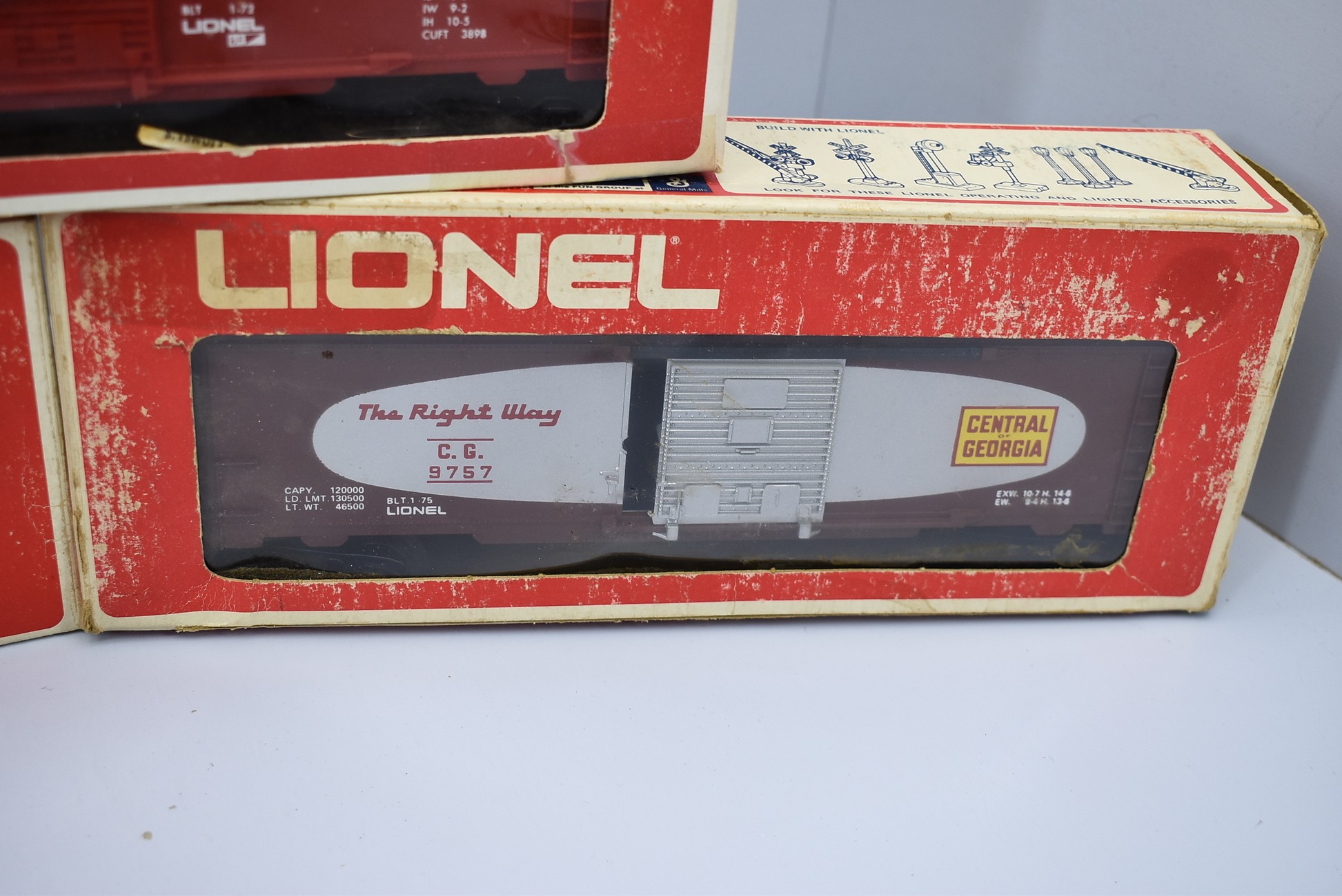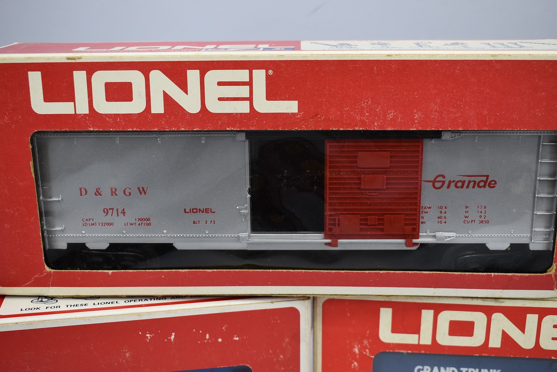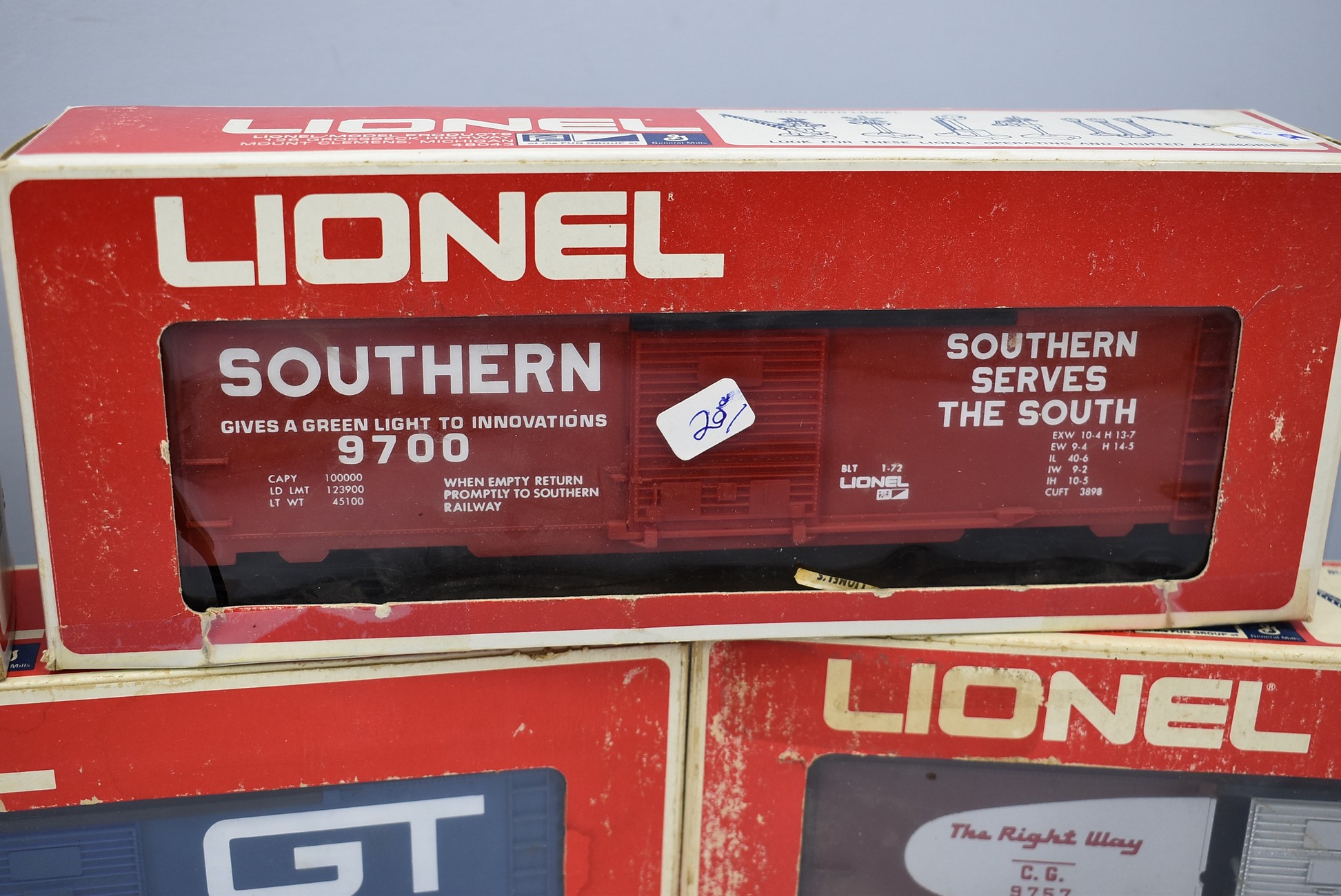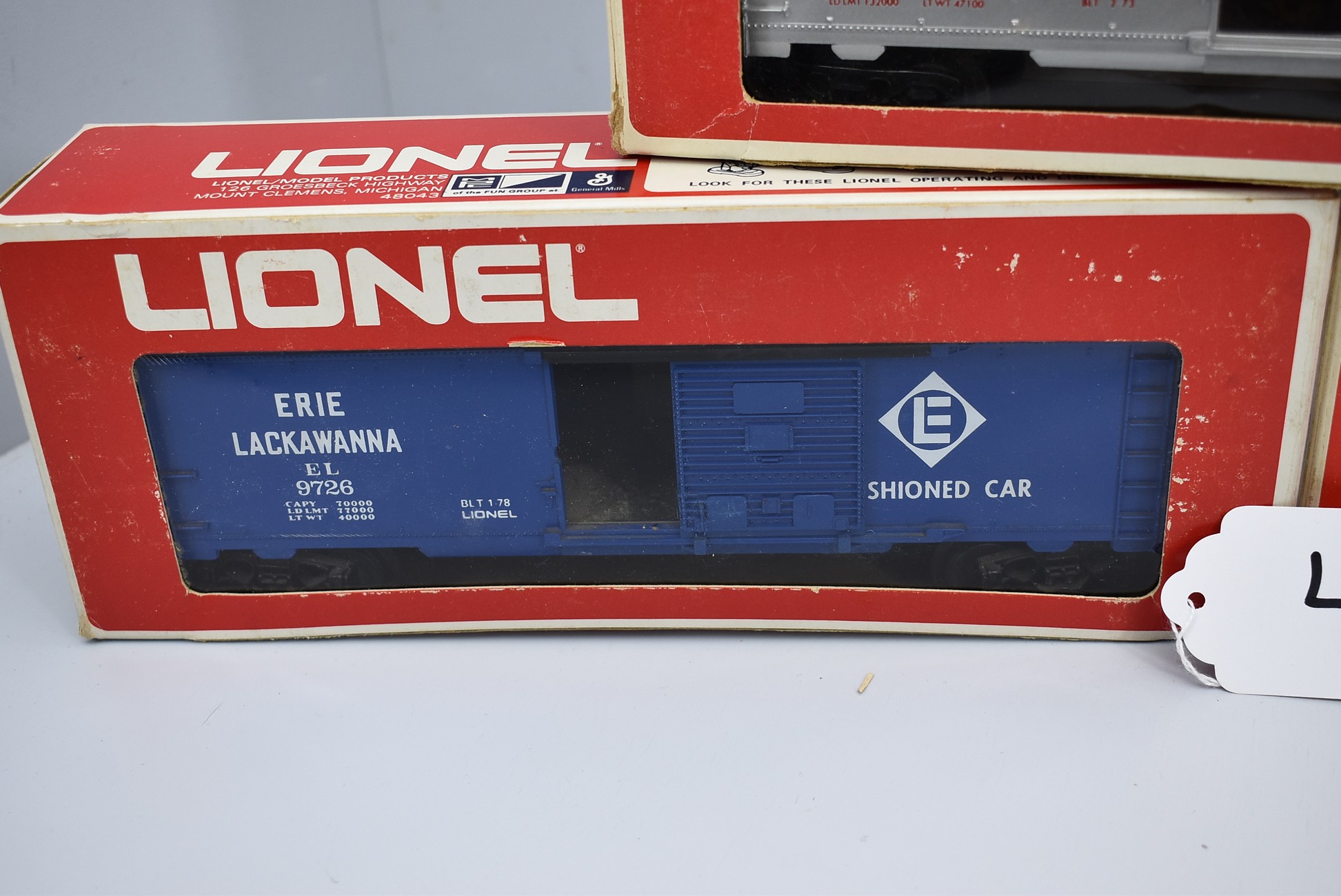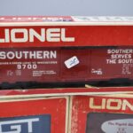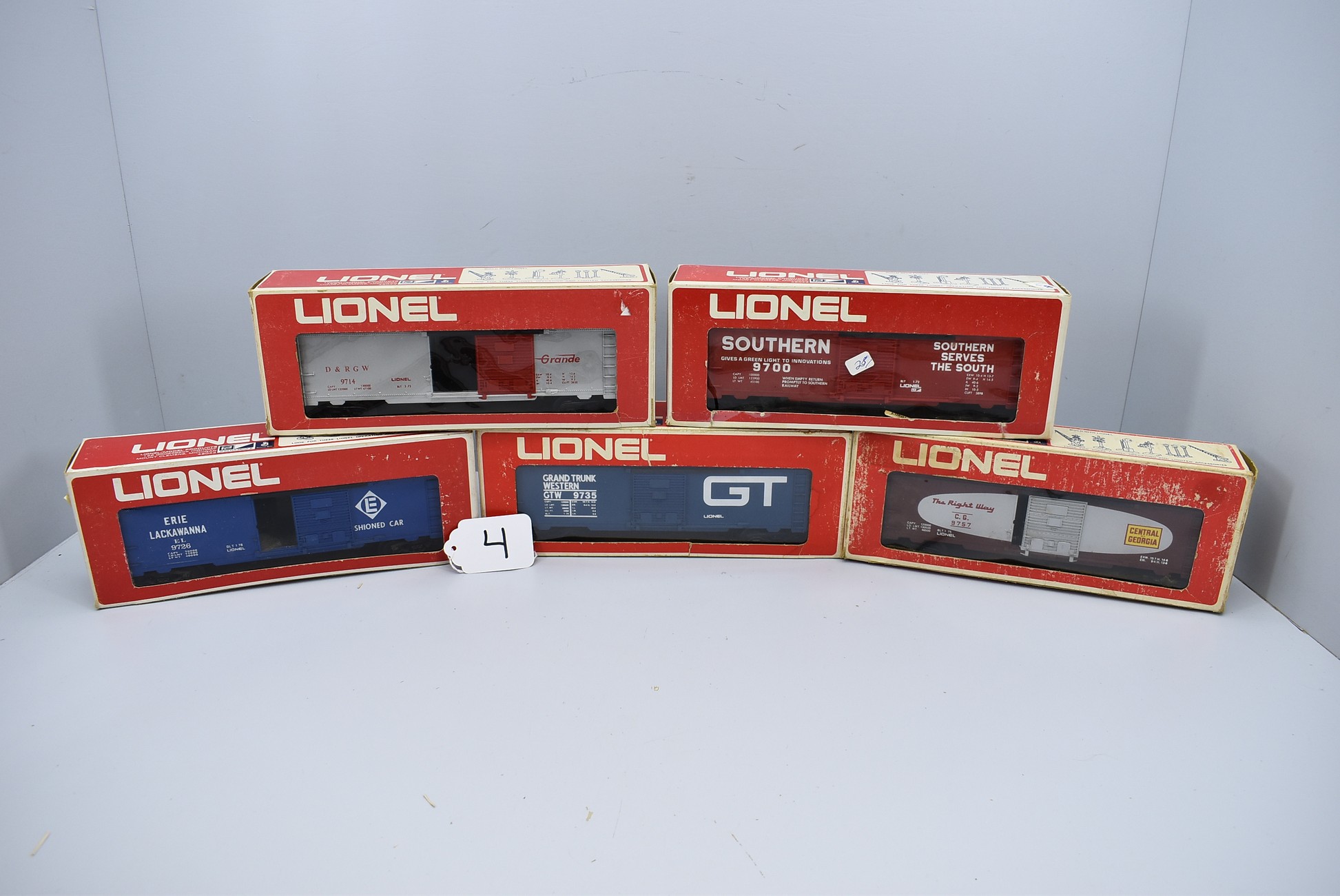 4. Lot of 5 Lionel O-Gauge Box Cars – Including 6-9714 D and RGW Box Car, 6-9700 Southern Box Car, 6-9757 Central of Georgia Box Car, 6-9735 Grand Trunk Box Car, and 6-9726 Erie Lackawanna Box Car – All w/Boxes