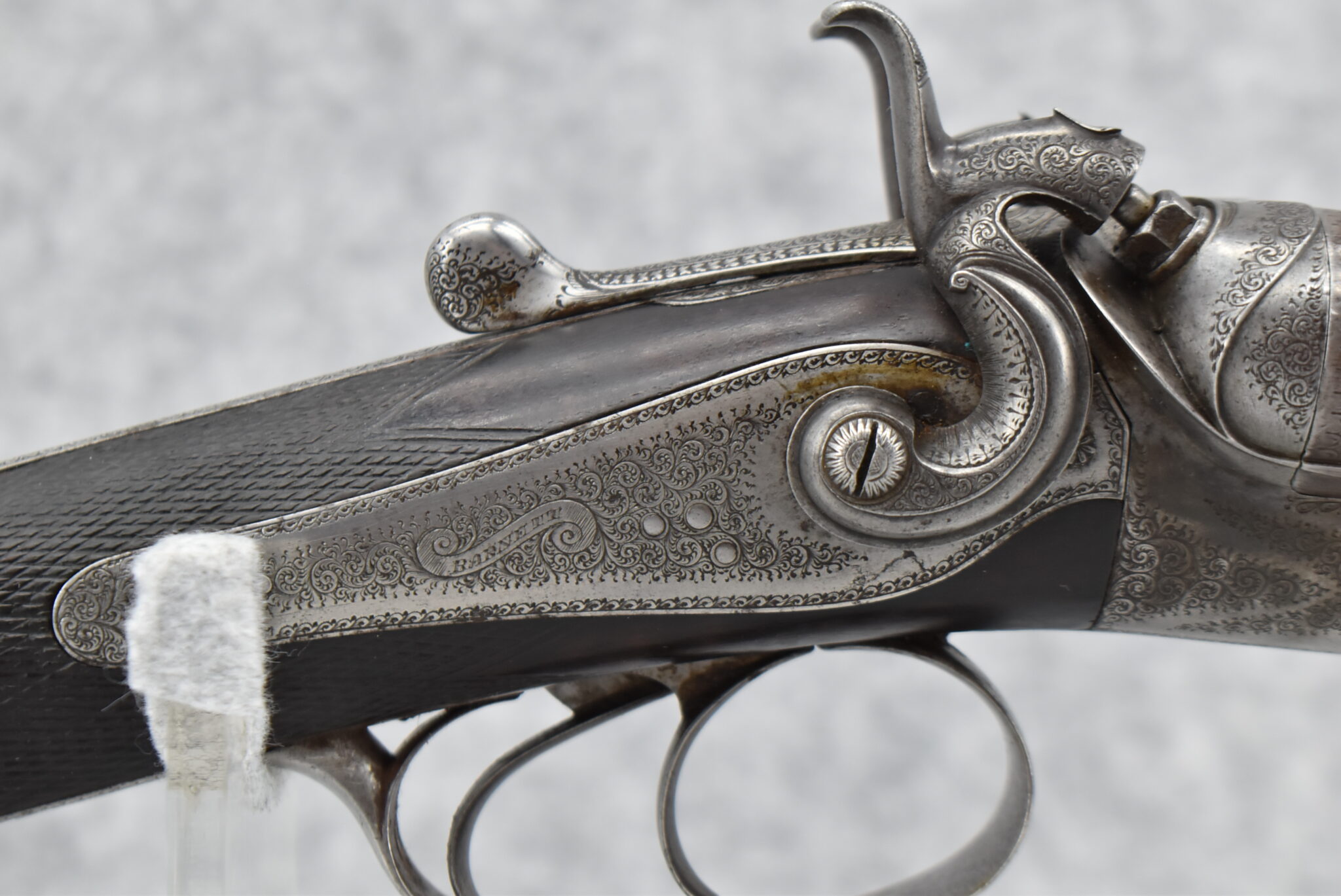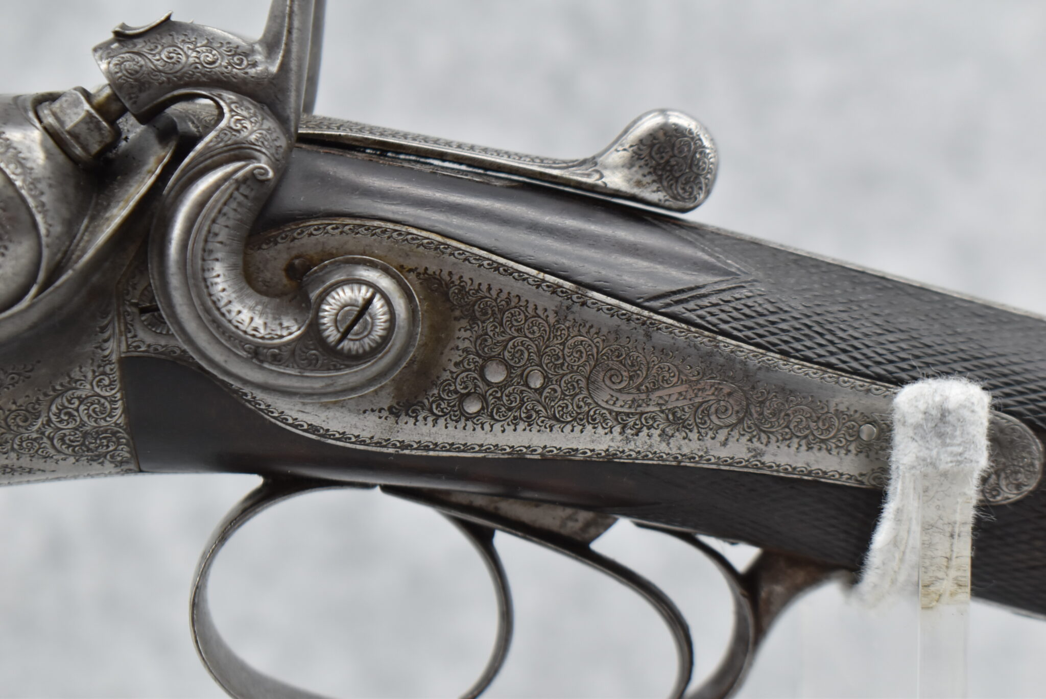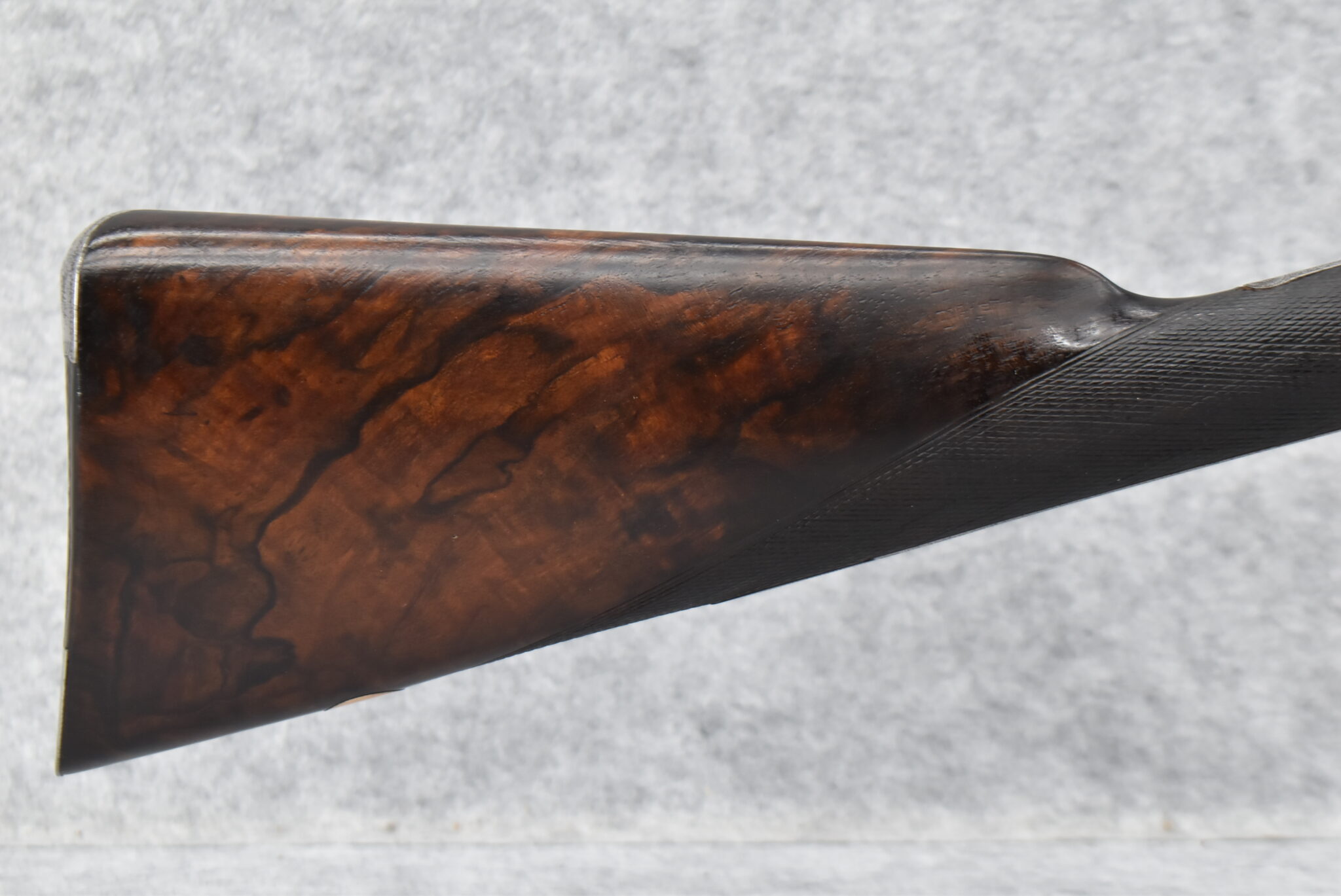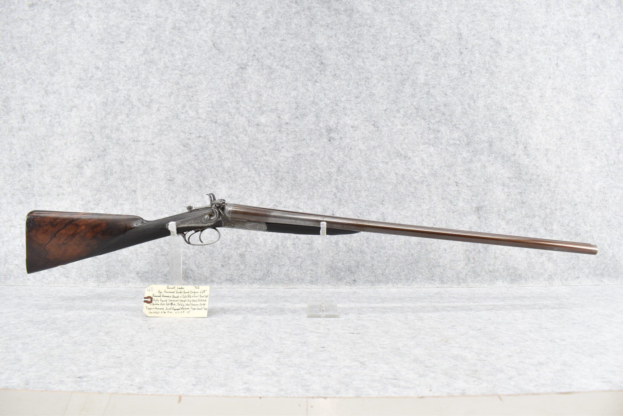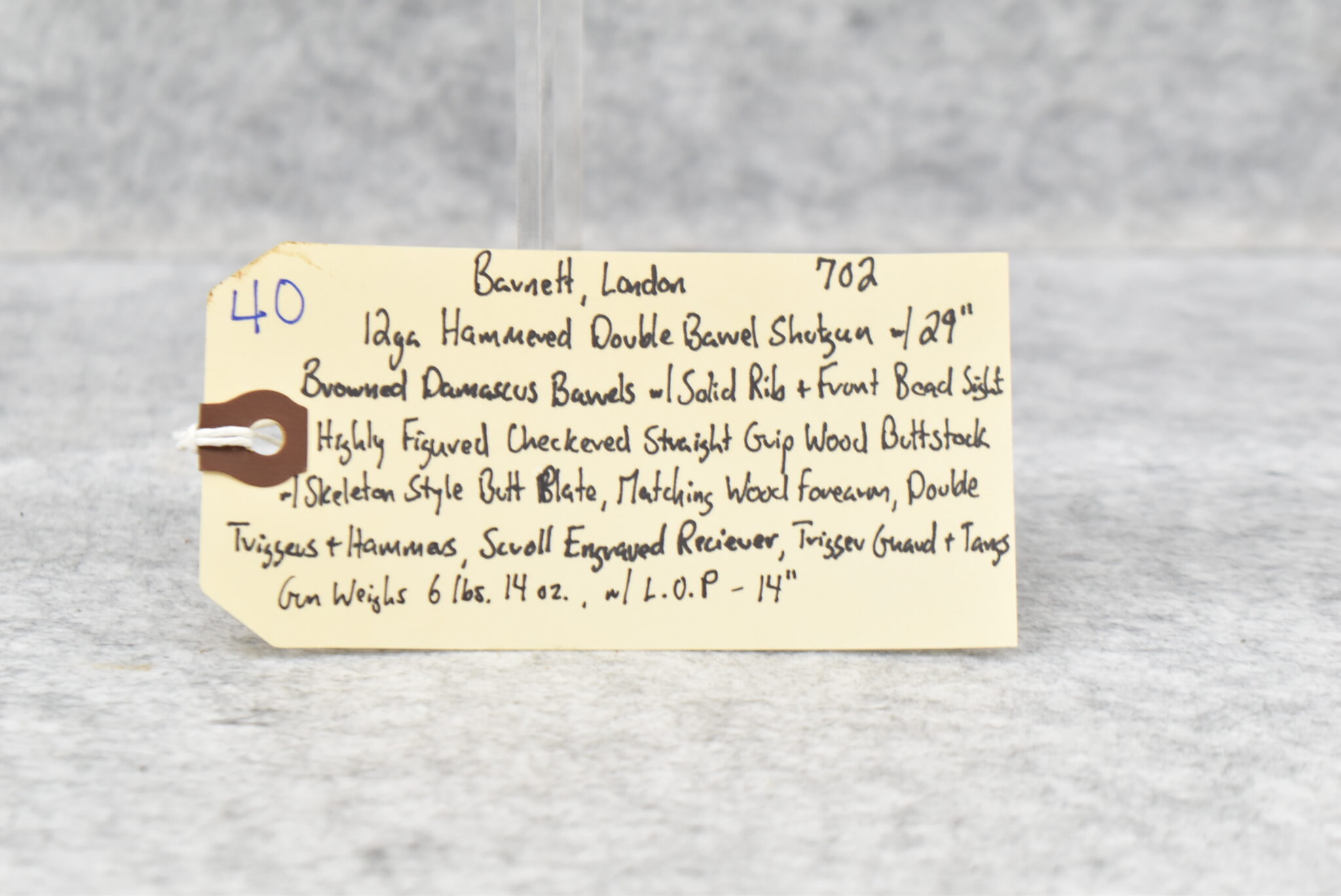 40. Barnett, London – 12ga. Hammered Double Barrel Shotgun – w/29” Browned Damascus Barrels w/Solid Rib & Front Bead Sight – w/Scroll Engraved Receiver w/Trigger Guard & Tangs – w/Highly Figured Checkered Straight Grip Wood Butt Stock w/Skeleton Style Butt Plate & Matching Wood Forearm – w/Double Triggers & Hammers – LOP 14” – Gun Weighs 6lbs. 14oz.