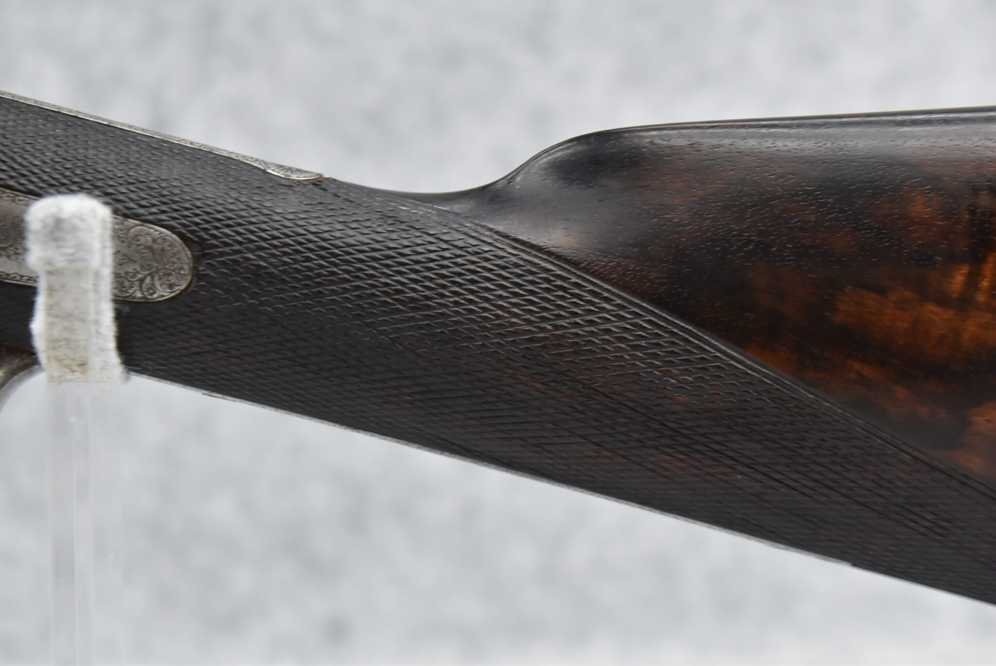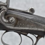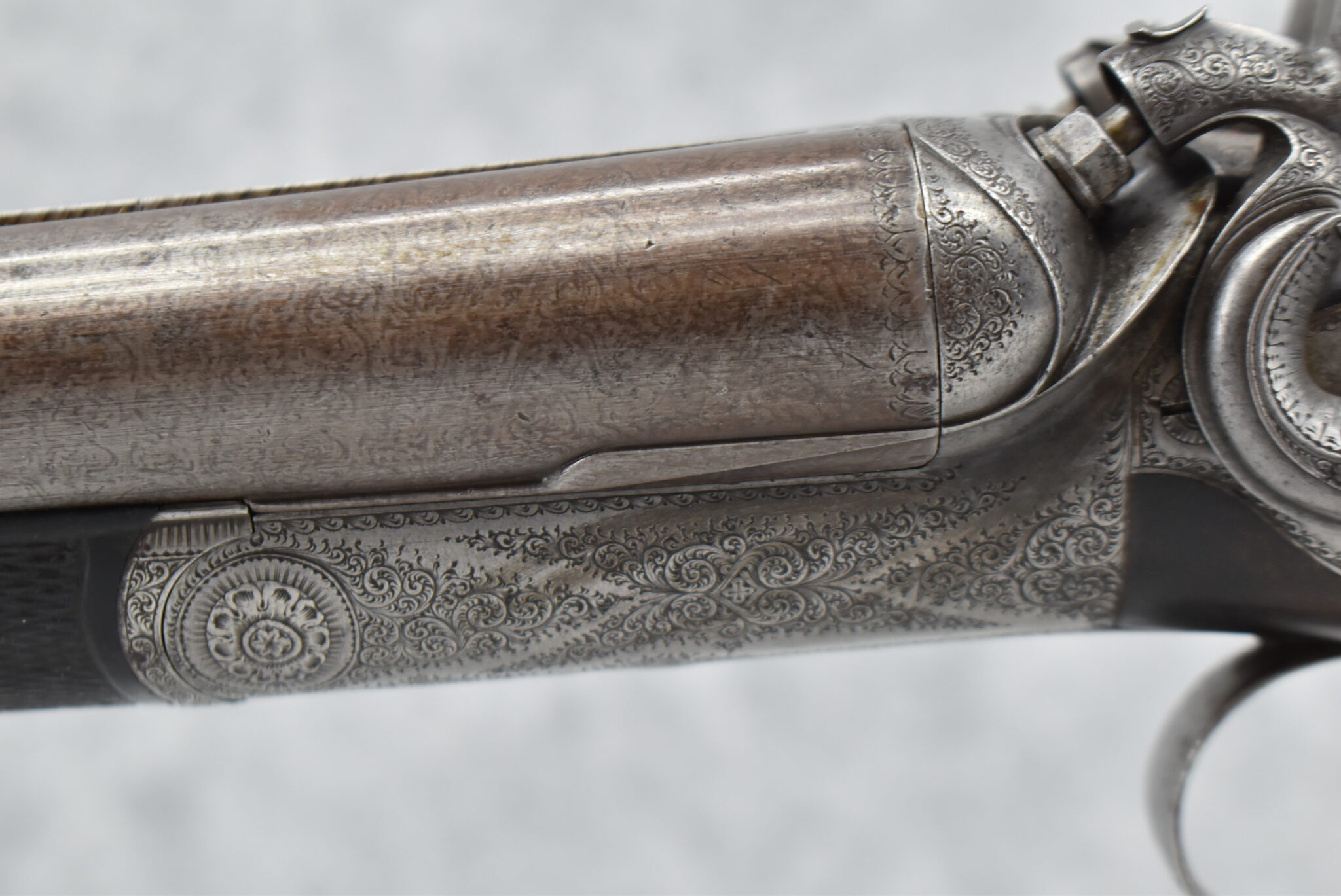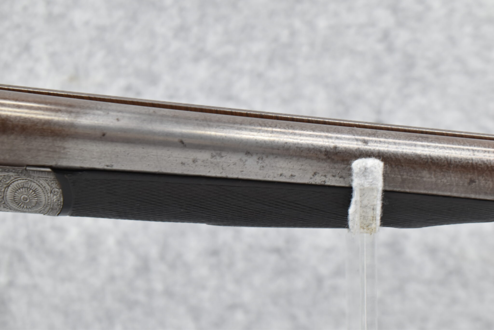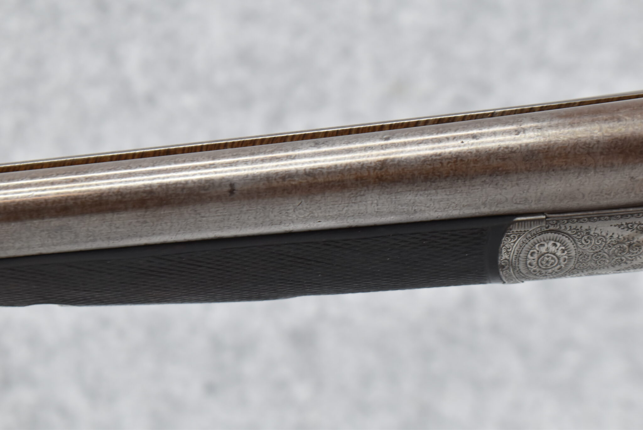 40. Barnett, London – 12ga. Hammered Double Barrel Shotgun – w/29” Browned Damascus Barrels w/Solid Rib & Front Bead Sight – w/Scroll Engraved Receiver w/Trigger Guard & Tangs – w/Highly Figured Checkered Straight Grip Wood Butt Stock w/Skeleton Style Butt Plate & Matching Wood Forearm – w/Double Triggers & Hammers – LOP 14” – Gun Weighs 6lbs. 14oz.