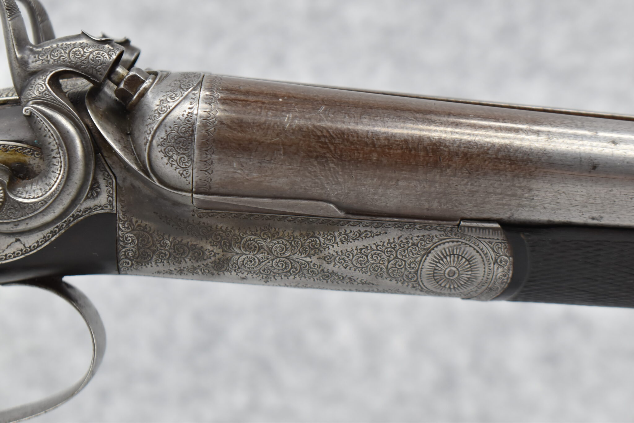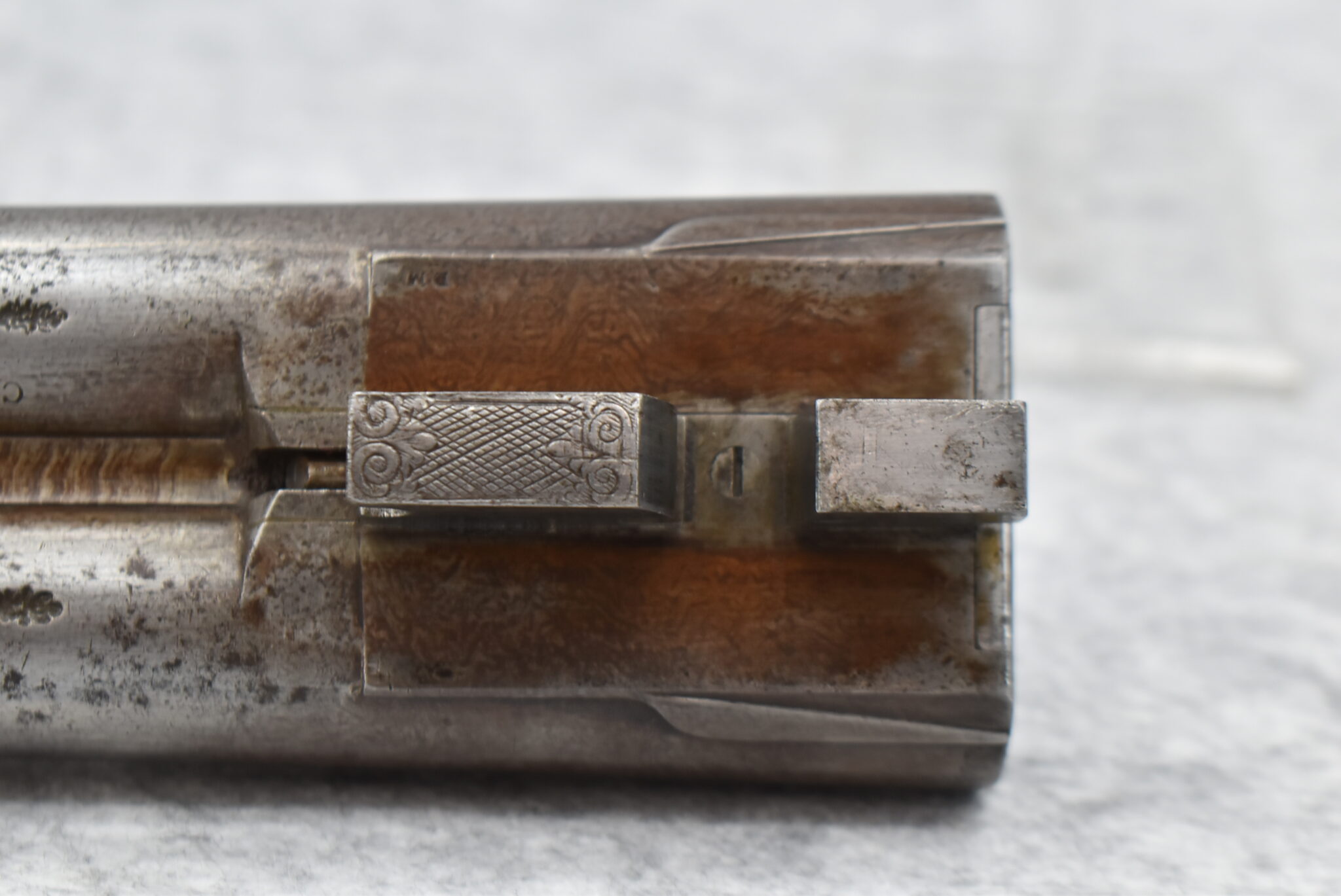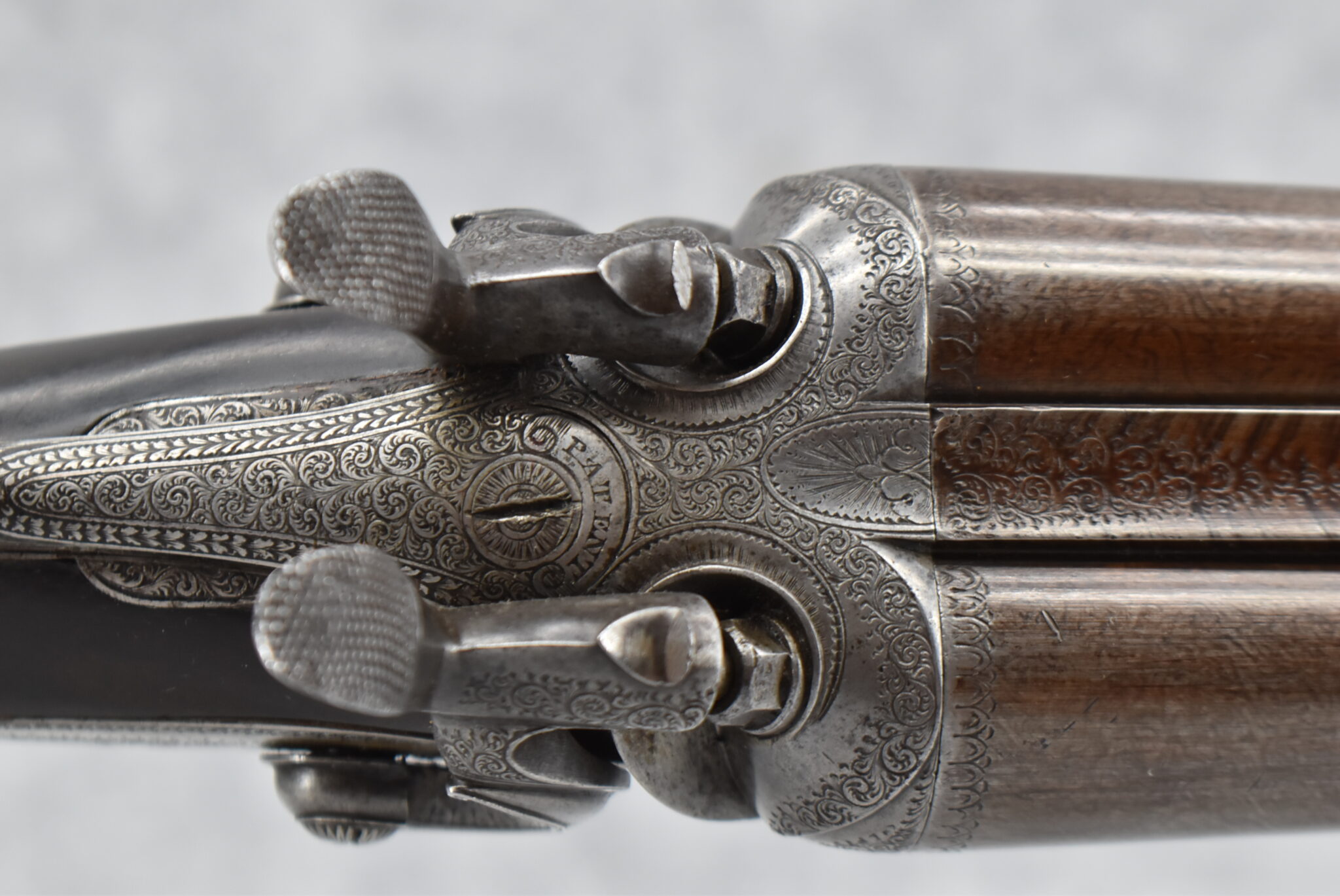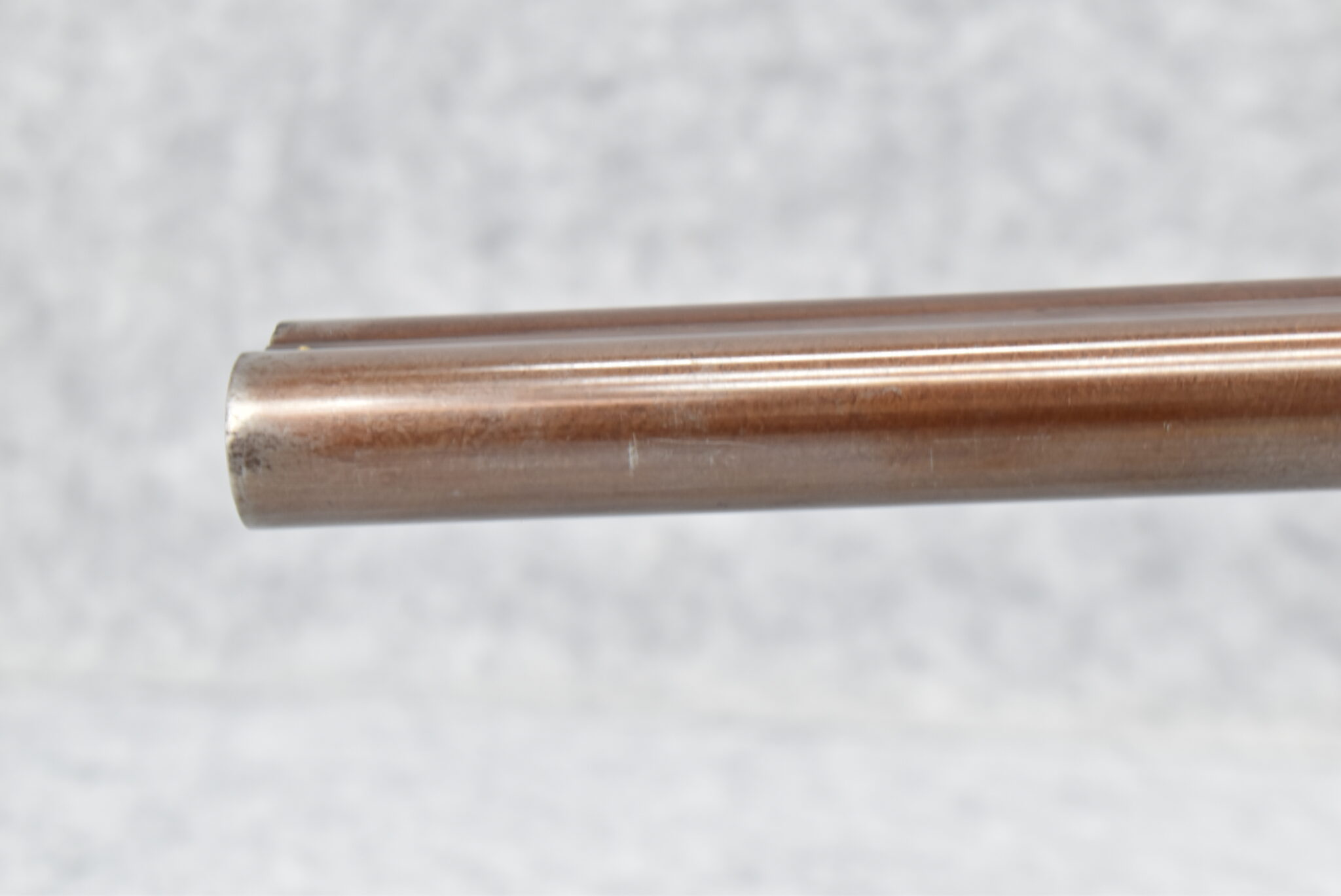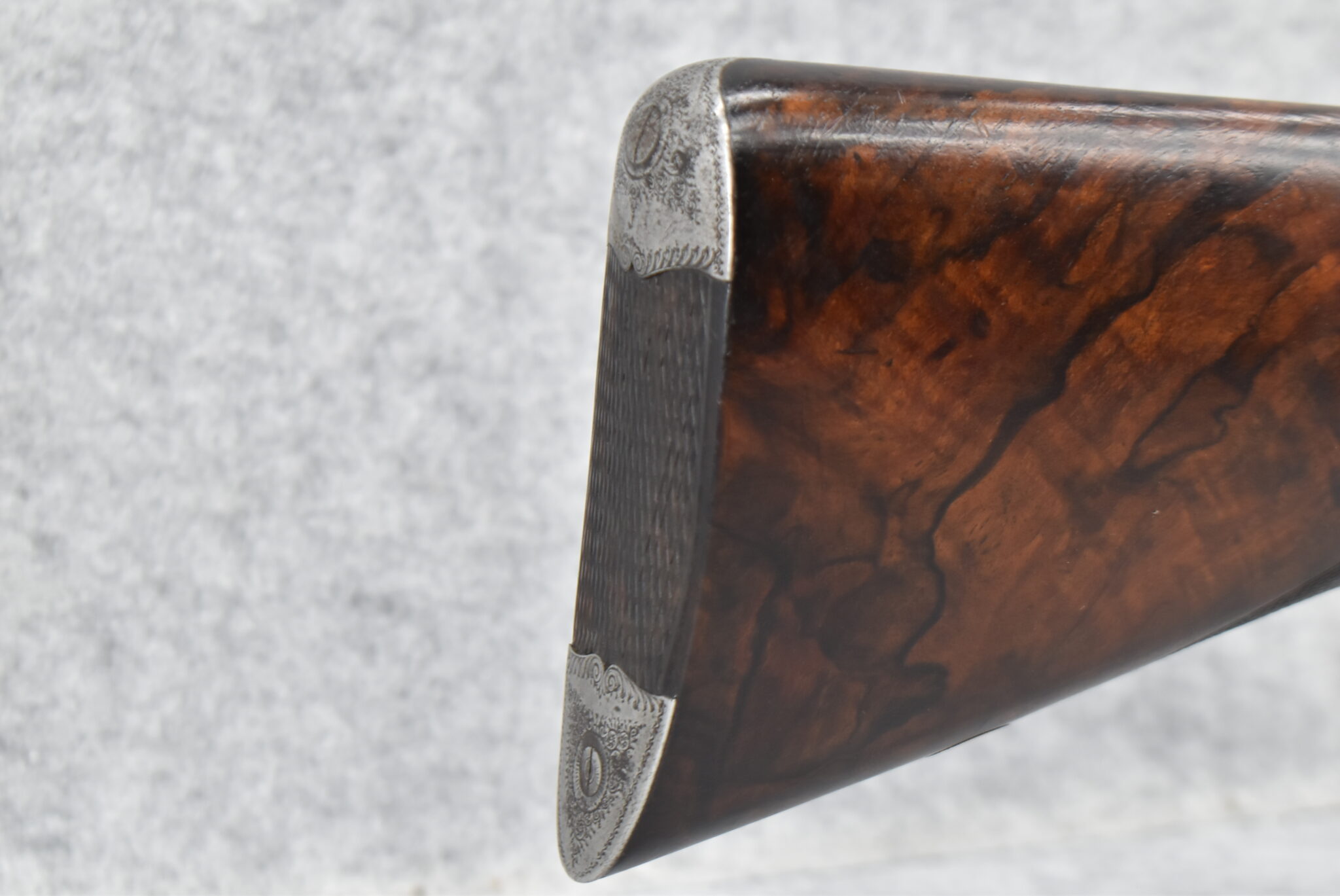40. Barnett, London – 12ga. Hammered Double Barrel Shotgun – w/29” Browned Damascus Barrels w/Solid Rib & Front Bead Sight – w/Scroll Engraved Receiver w/Trigger Guard & Tangs – w/Highly Figured Checkered Straight Grip Wood Butt Stock w/Skeleton Style Butt Plate & Matching Wood Forearm – w/Double Triggers & Hammers – LOP 14” – Gun Weighs 6lbs. 14oz.