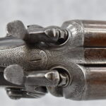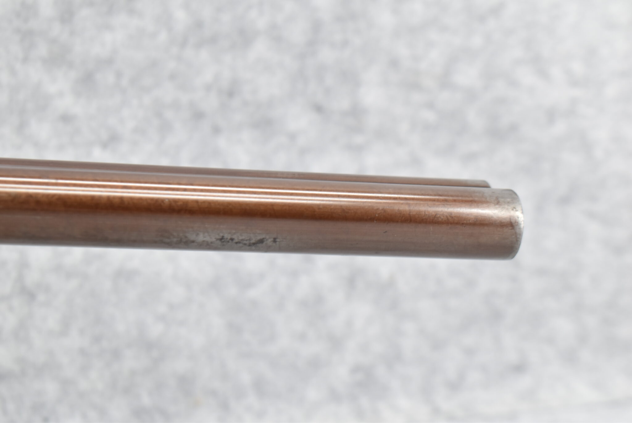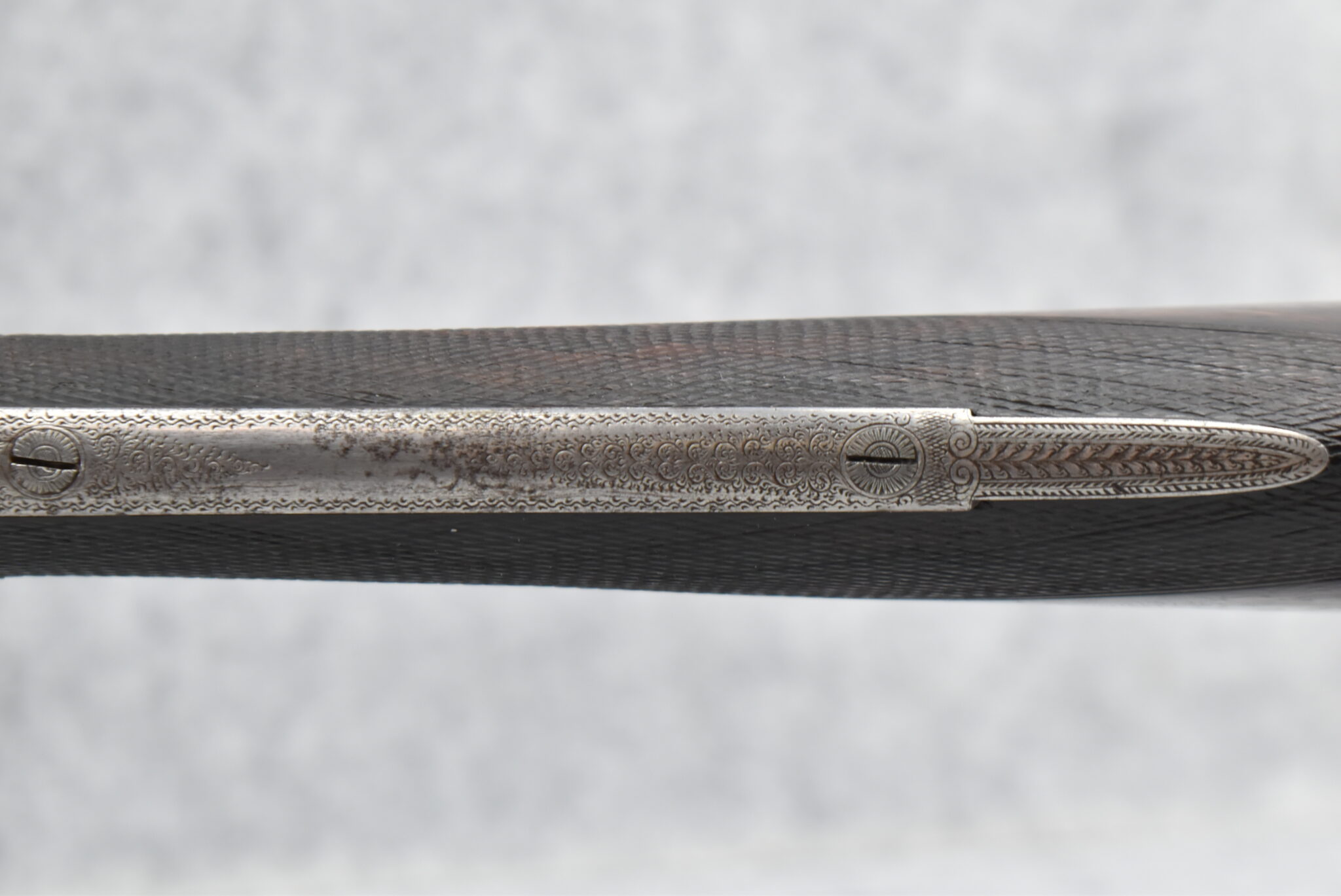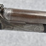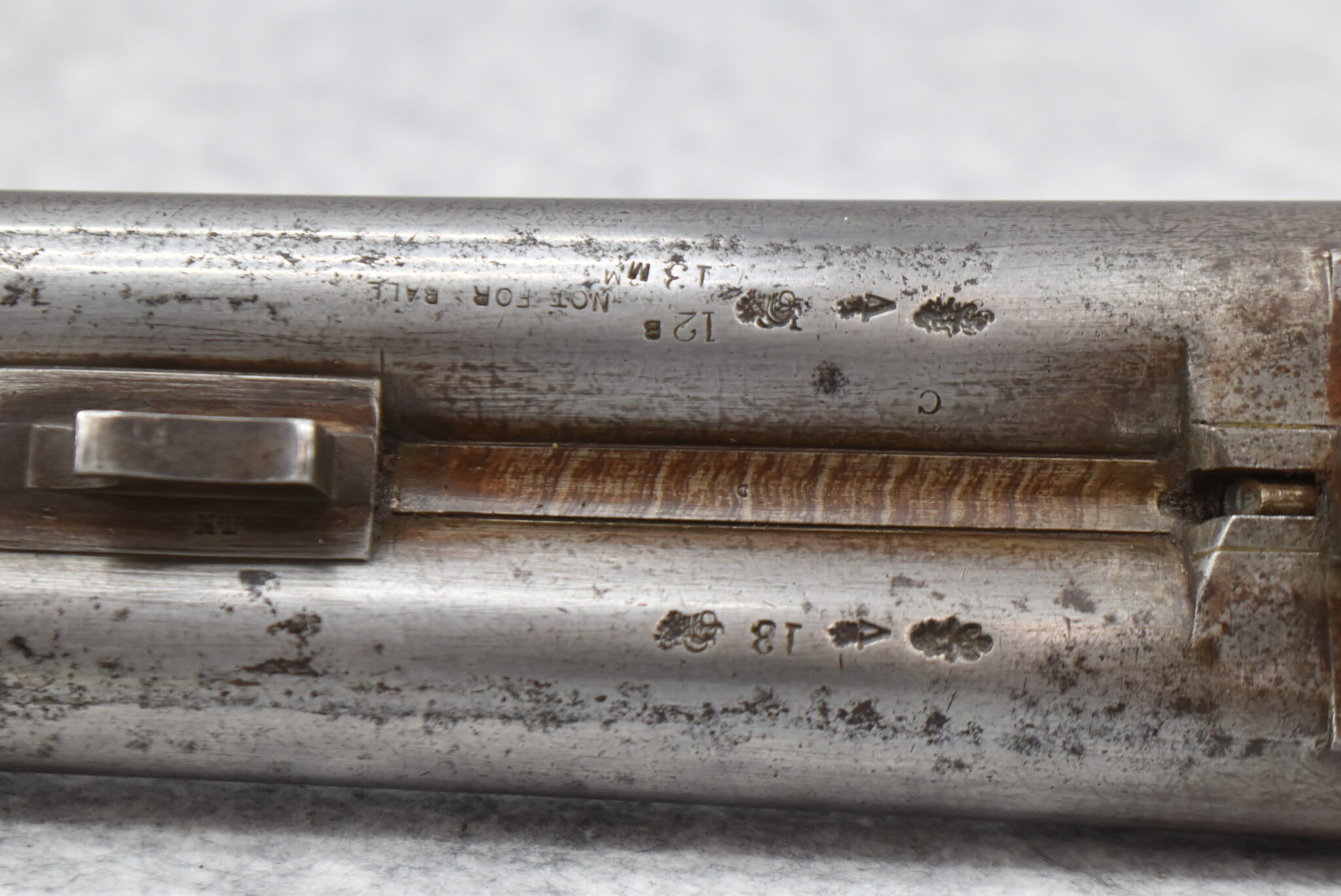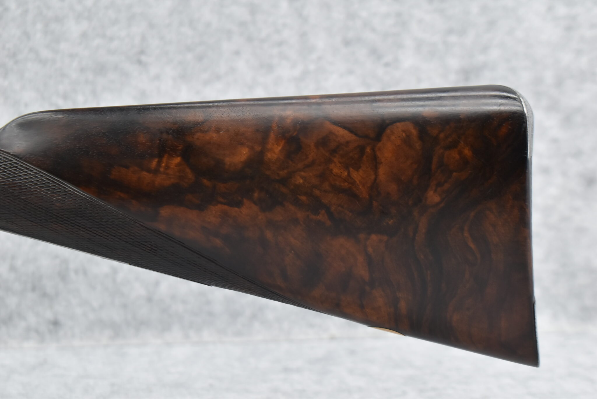 40. Barnett, London – 12ga. Hammered Double Barrel Shotgun – w/29” Browned Damascus Barrels w/Solid Rib & Front Bead Sight – w/Scroll Engraved Receiver w/Trigger Guard & Tangs – w/Highly Figured Checkered Straight Grip Wood Butt Stock w/Skeleton Style Butt Plate & Matching Wood Forearm – w/Double Triggers & Hammers – LOP 14” – Gun Weighs 6lbs. 14oz.