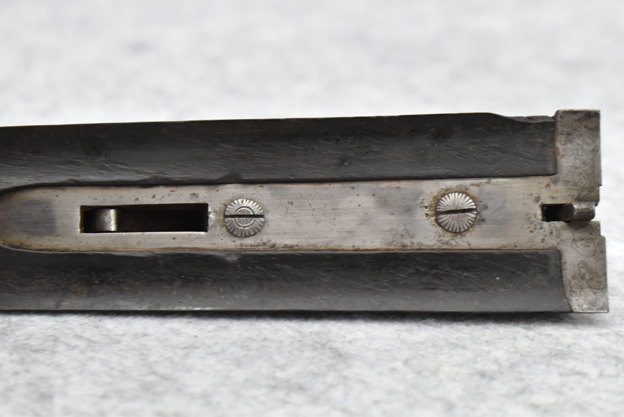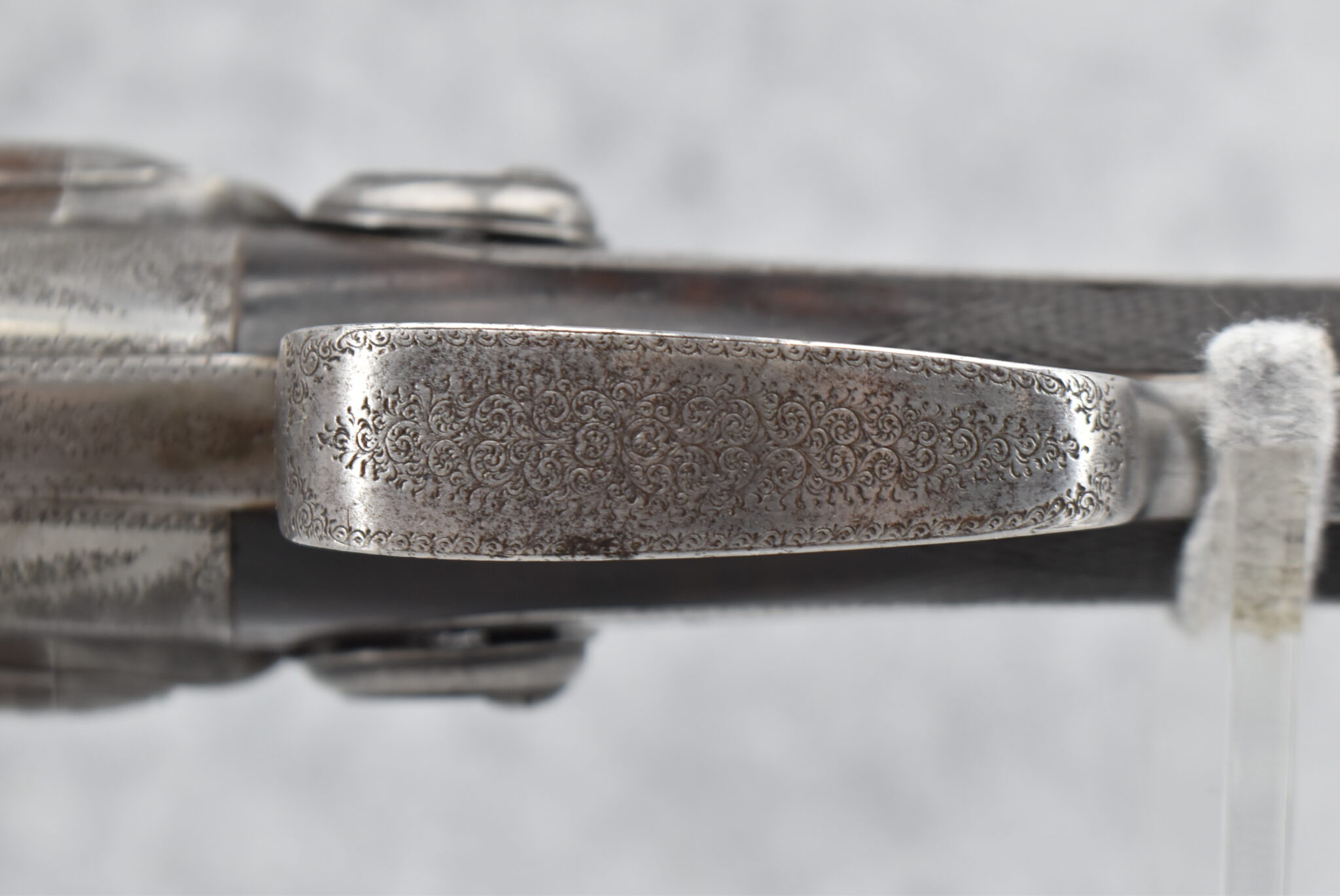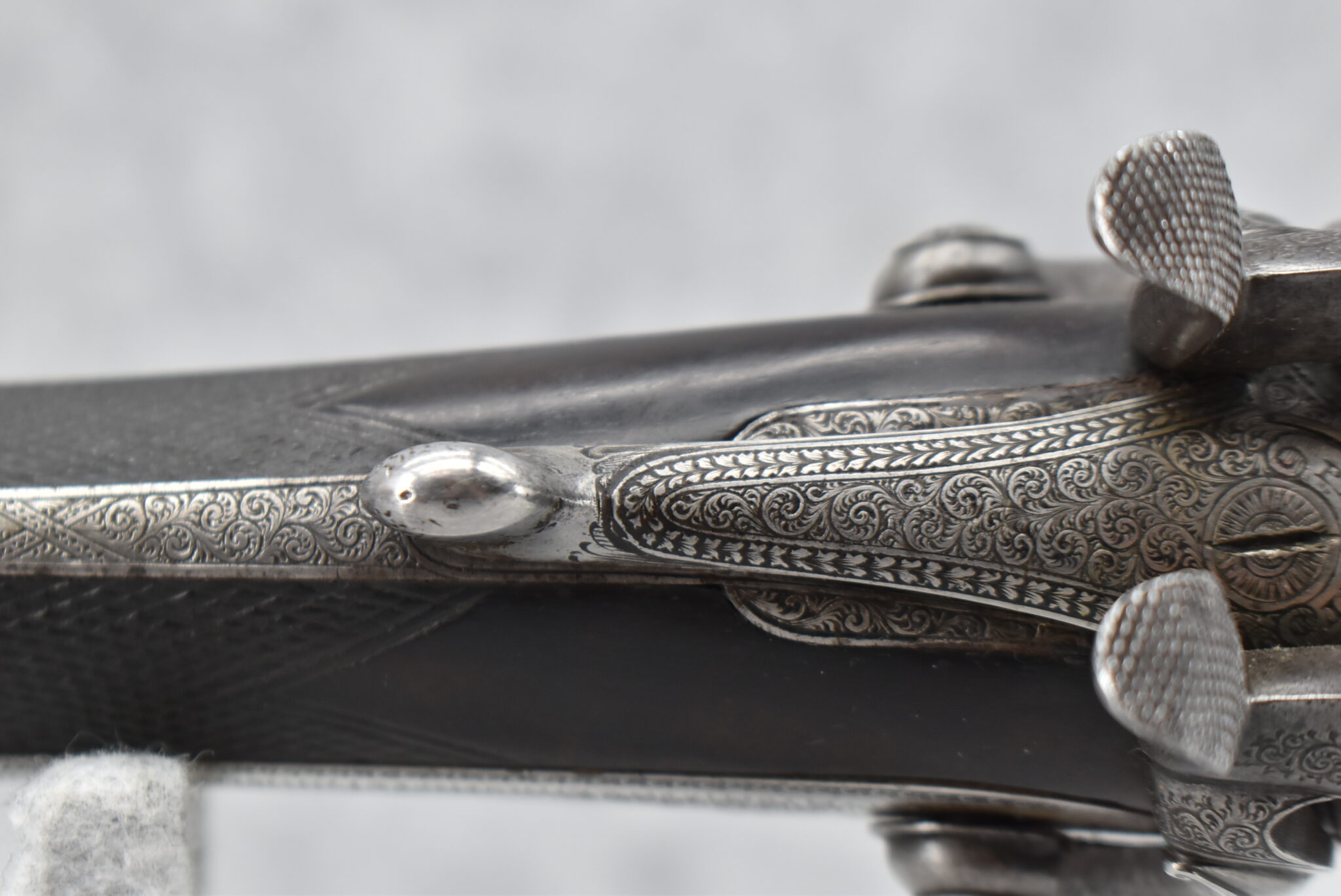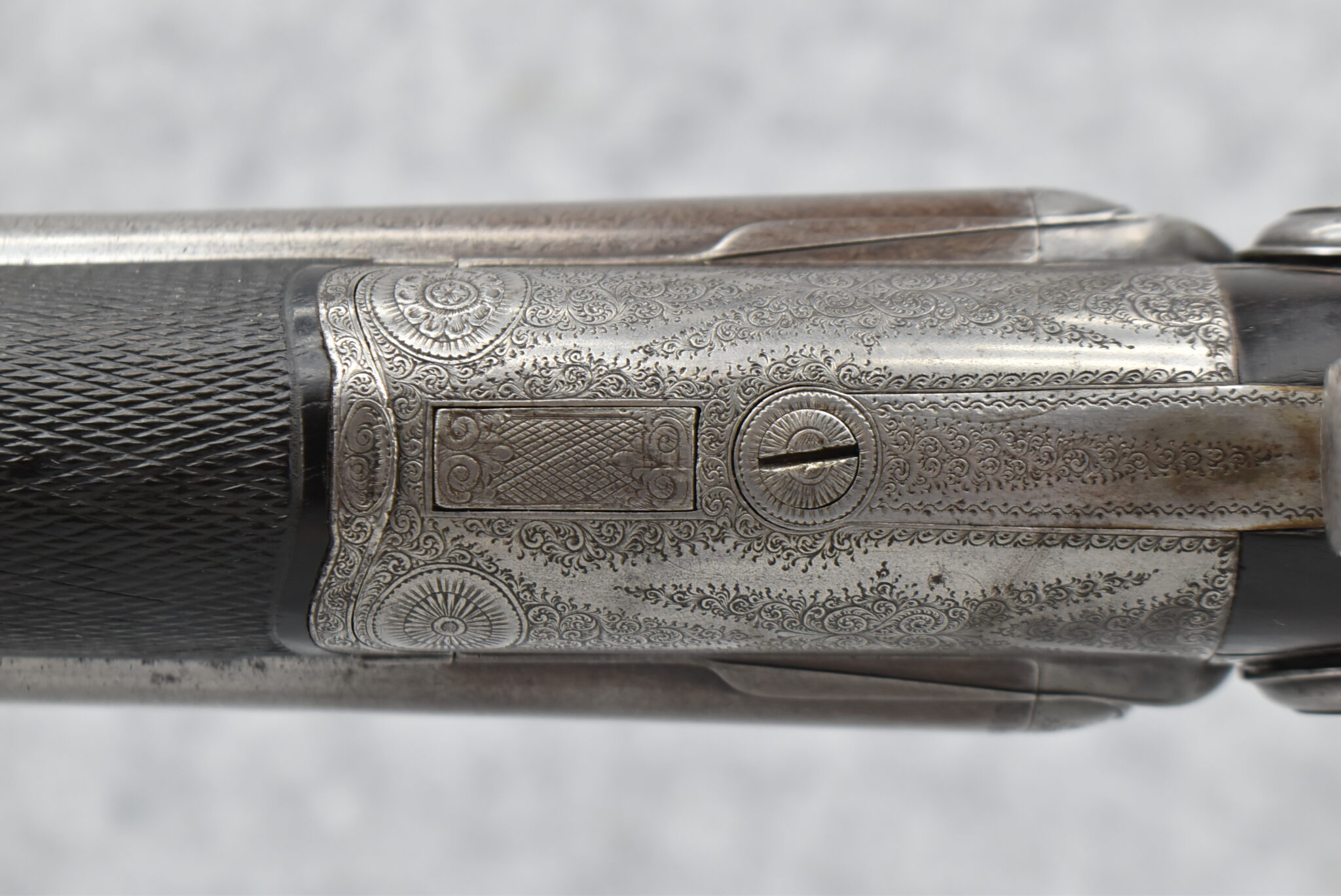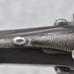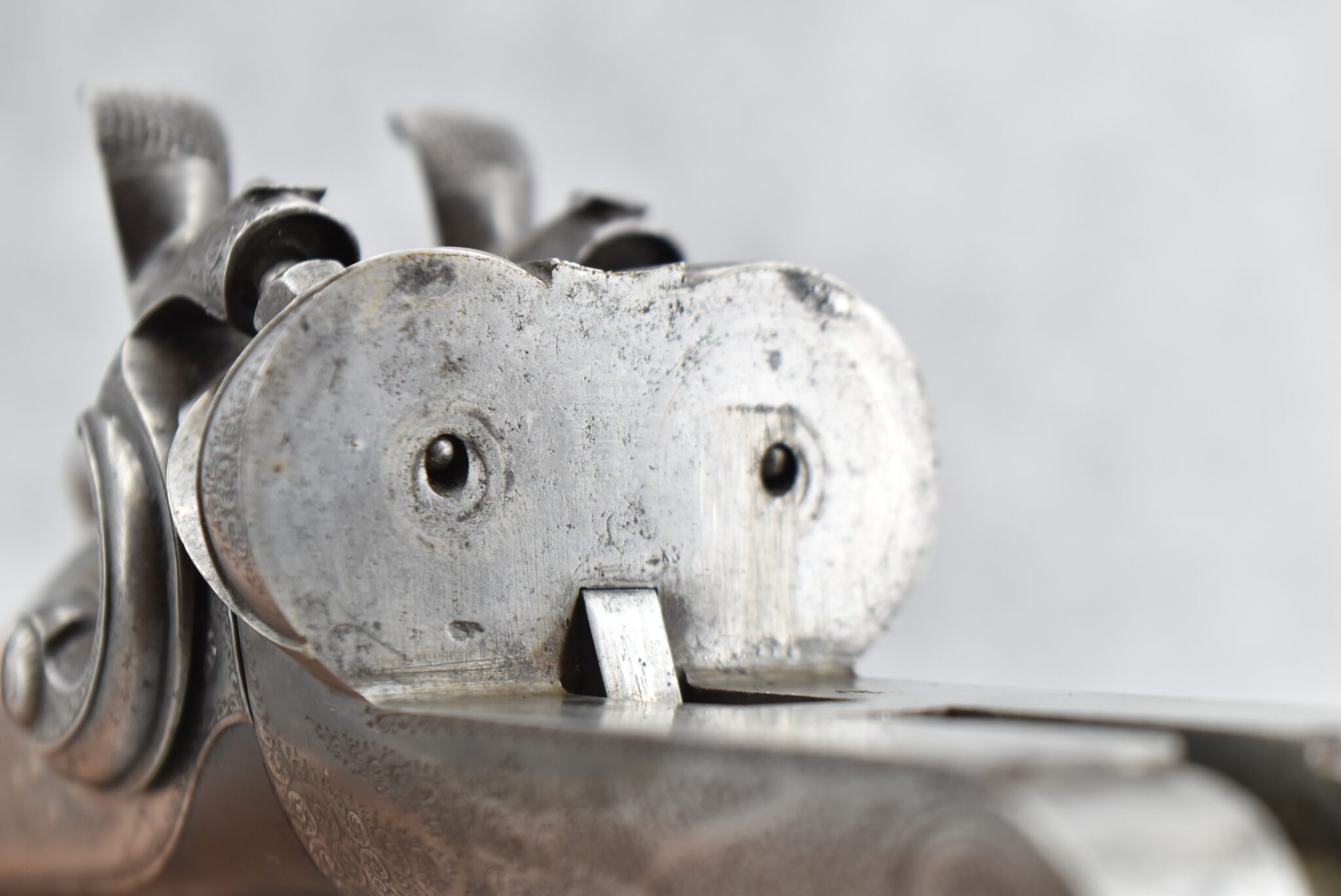 40. Barnett, London – 12ga. Hammered Double Barrel Shotgun – w/29” Browned Damascus Barrels w/Solid Rib & Front Bead Sight – w/Scroll Engraved Receiver w/Trigger Guard & Tangs – w/Highly Figured Checkered Straight Grip Wood Butt Stock w/Skeleton Style Butt Plate & Matching Wood Forearm – w/Double Triggers & Hammers – LOP 14” – Gun Weighs 6lbs. 14oz.