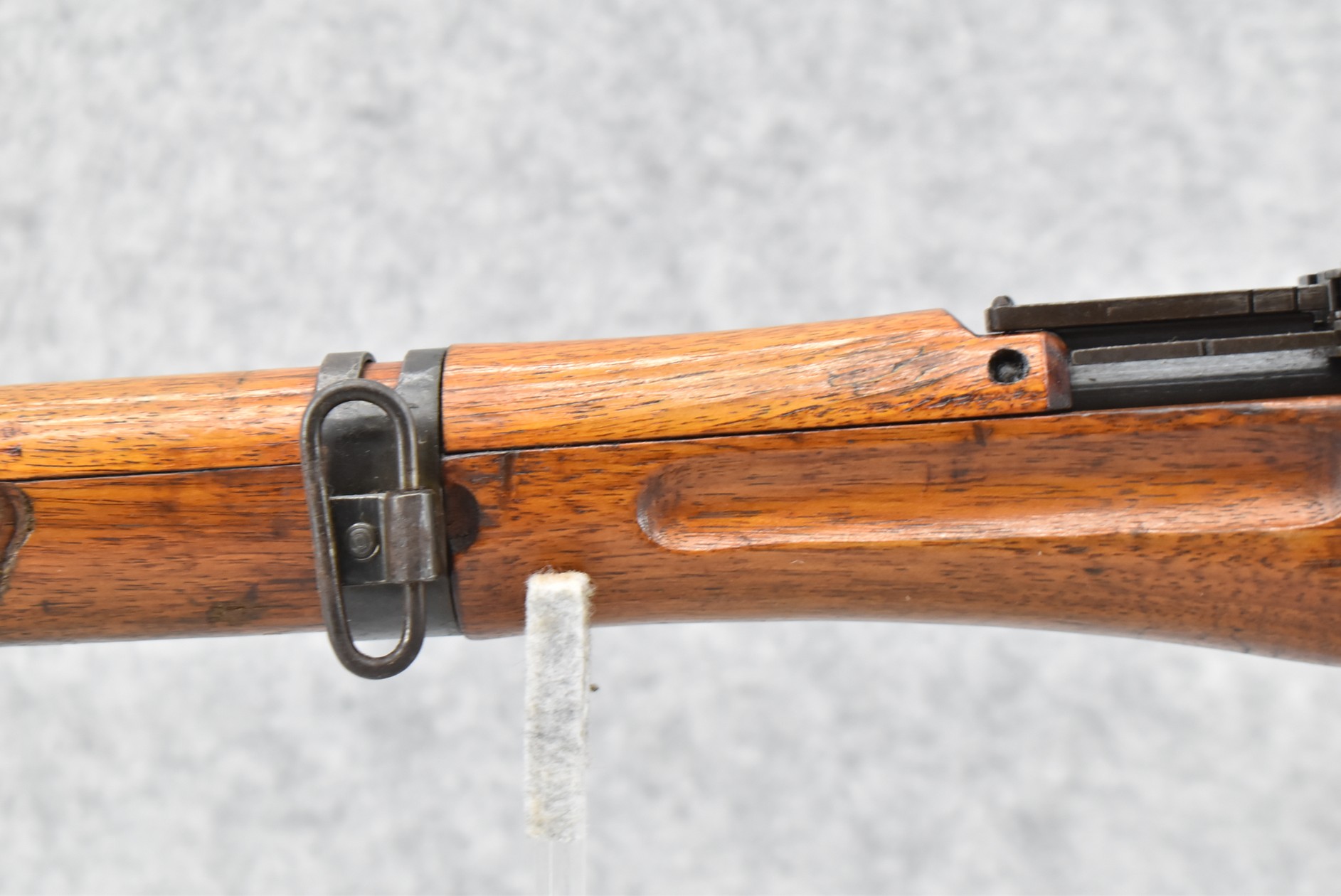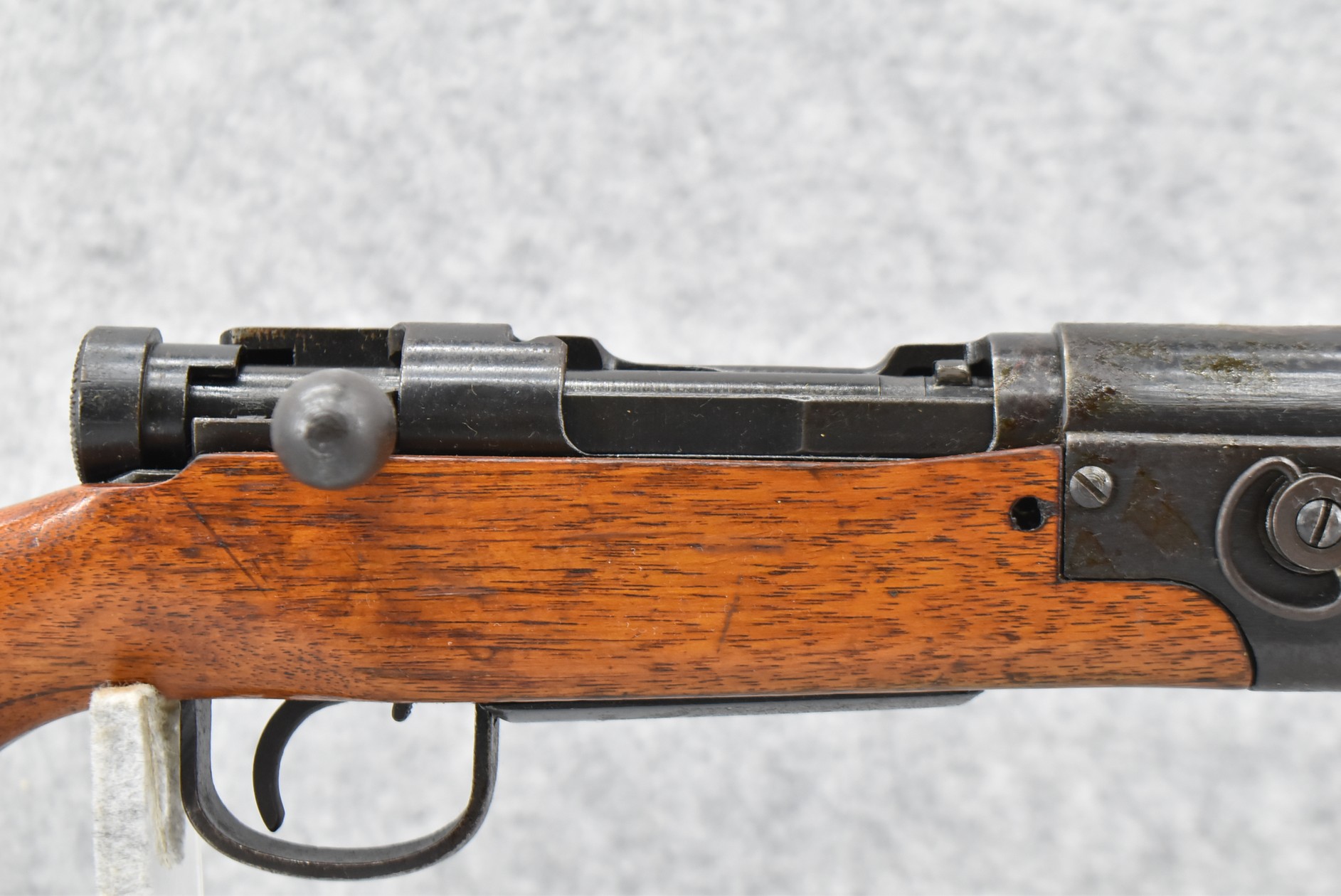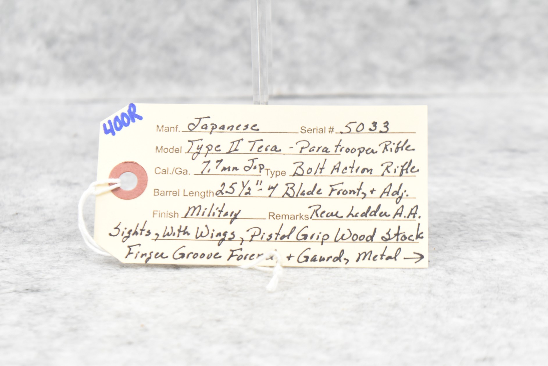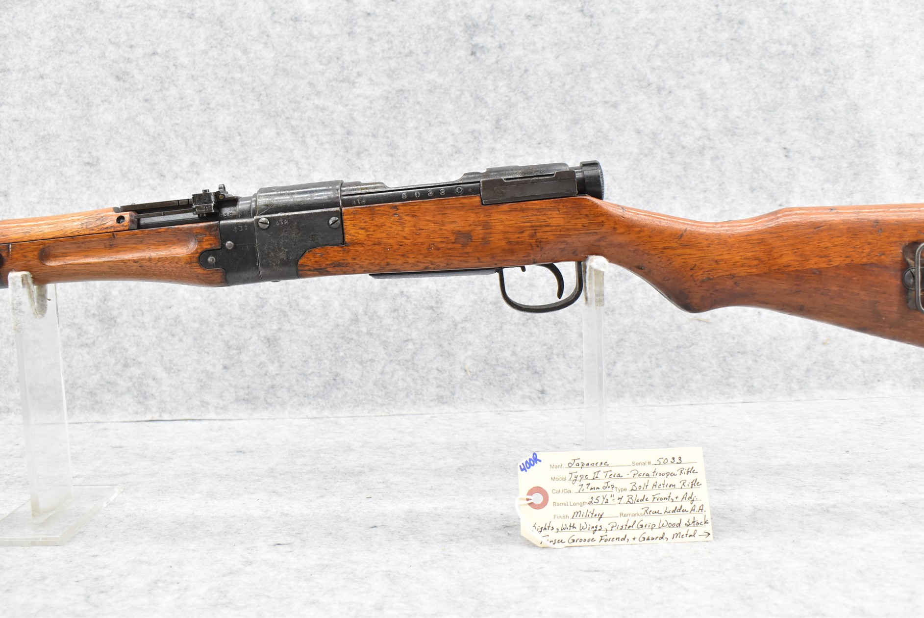 400R. Japanese – Type II Tera-Paratrooper Rifle – 7.7mm Jap Cal. Bolt Action Rifle – w/25 ½” Barrel w/Blade Front & Adj. Rear Ladder Anti-Aircraft Sights w/Wings – Military Finish – w/Pistol Grip Wood Stock w/Metal Butt Plate w/Finger Groove Forend & Guard – w/Sling Loops – Ground Mum