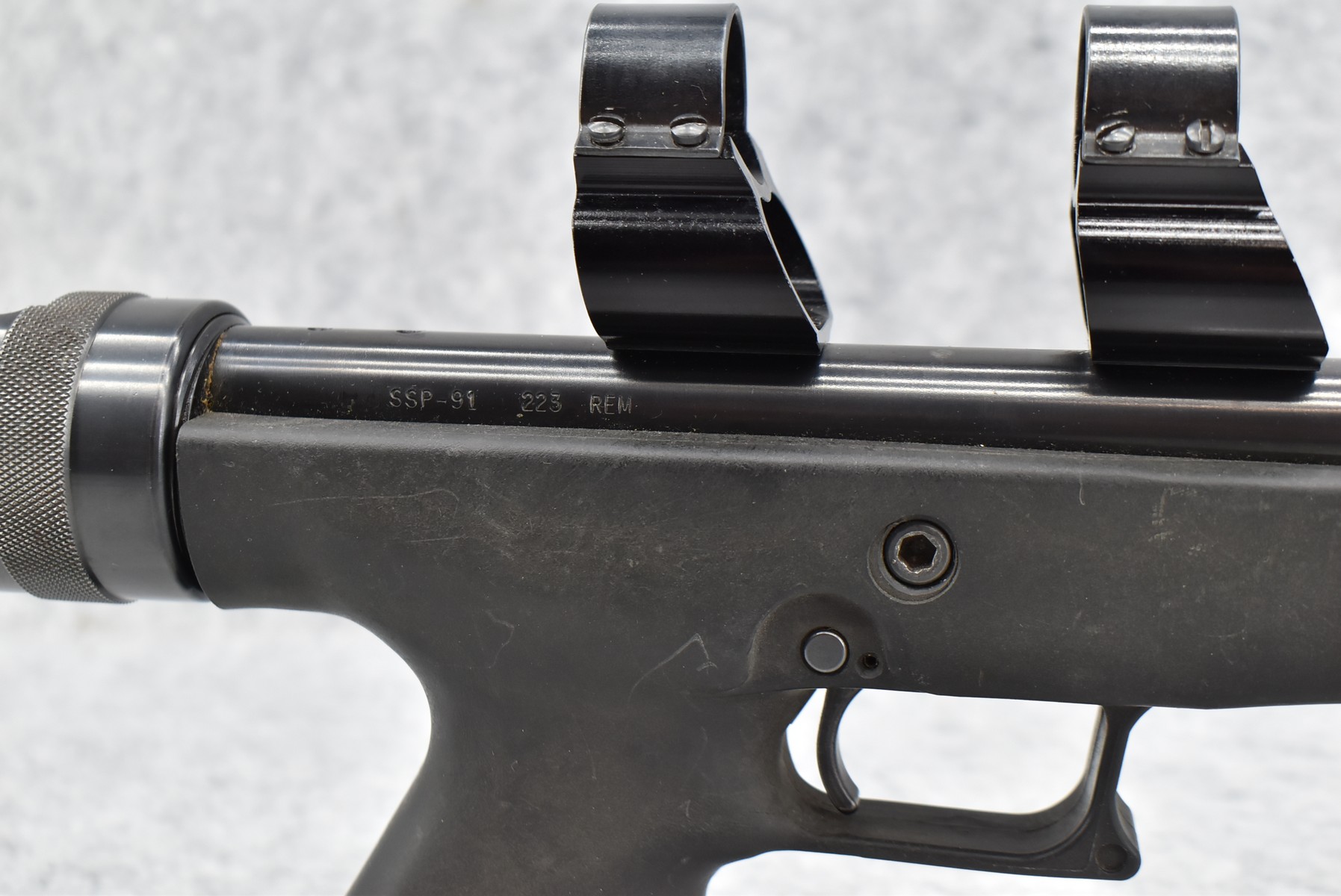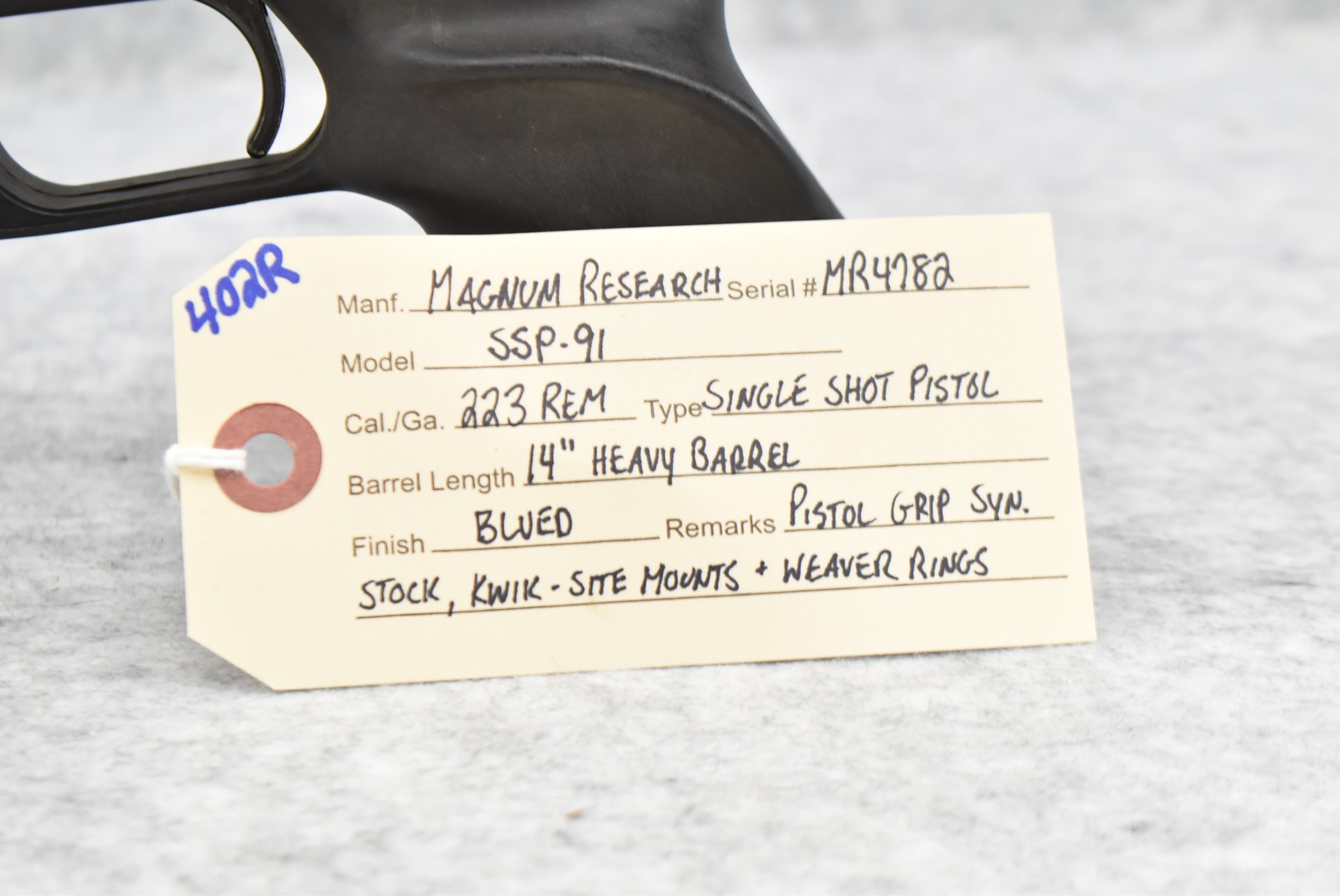 402R. Magnum Research – Mod. SSP-91 – 223 Rem. Cal. Single Shot Pistol – w/14” Heavy Barrel – Blued Finish – w/Pistol Grip Synthetic Stock – w/Kwik-Site Mounts & Weaver Rings