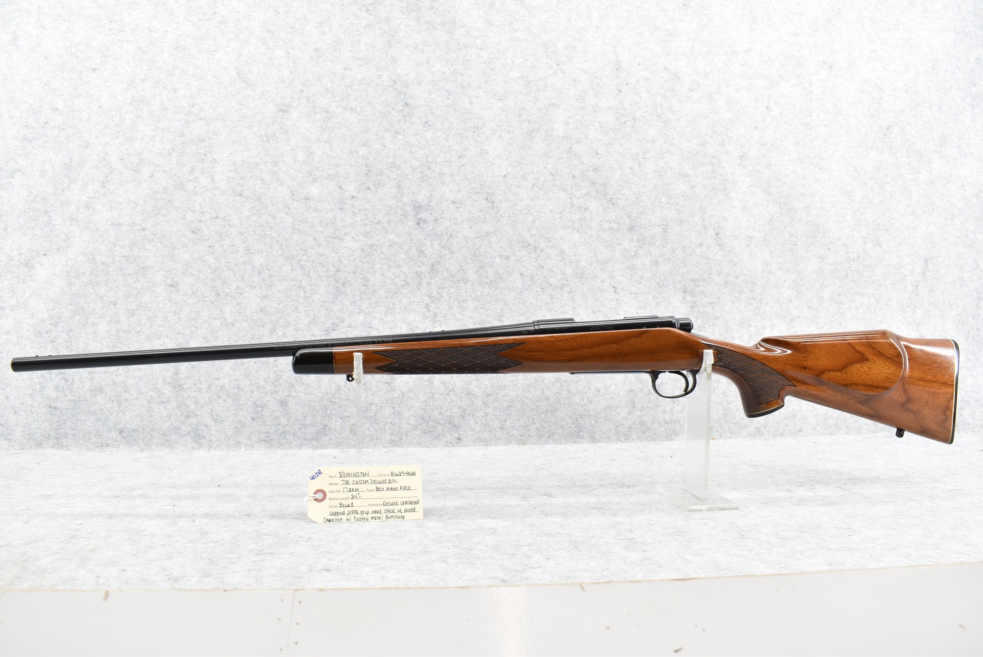 403R. Remington – Mod. 700 BDL Custom Deluxe – 17 Rem. Cal. Bolt Action Rifle – w/24” Barrel – Blued Finish – w/Deluxe Checkered Capped Pistol Grip Wood Stock w/Raised Cheek Piece w/Factory Metal Butt Plate