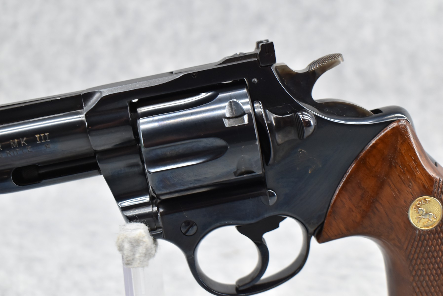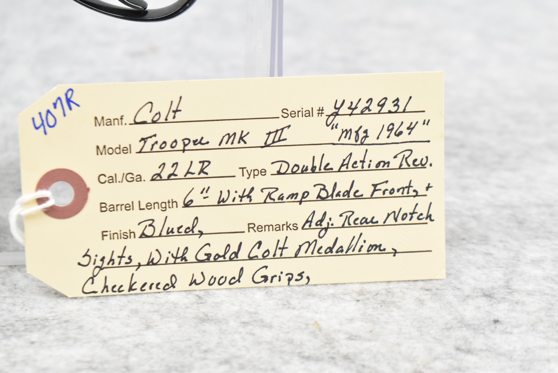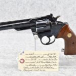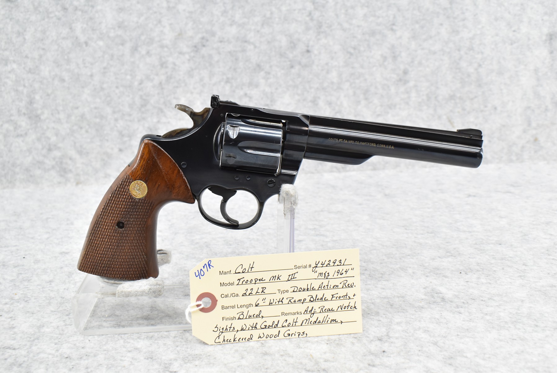 407R.     Colt – Mod. Trooper MK III 22LR Cal. Double Action Revolver – w/6” Barrel w/Ramp Blade Front & Adj. Rear Notch Sights – Blued Finish – w/Gold Colt Medallion Checkered Wood Grips – Mfg. 1964