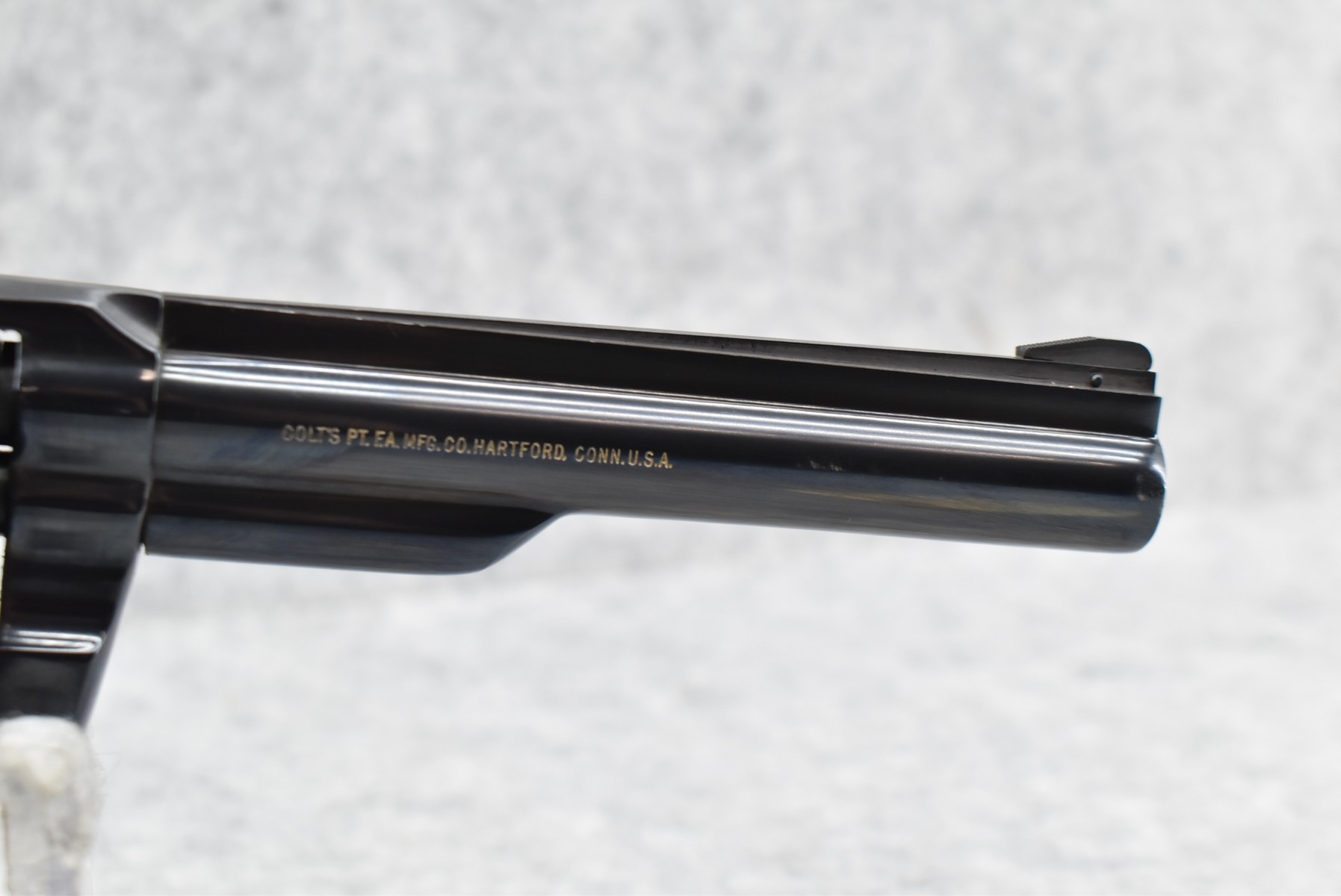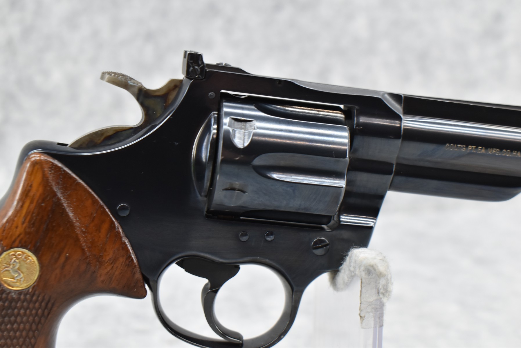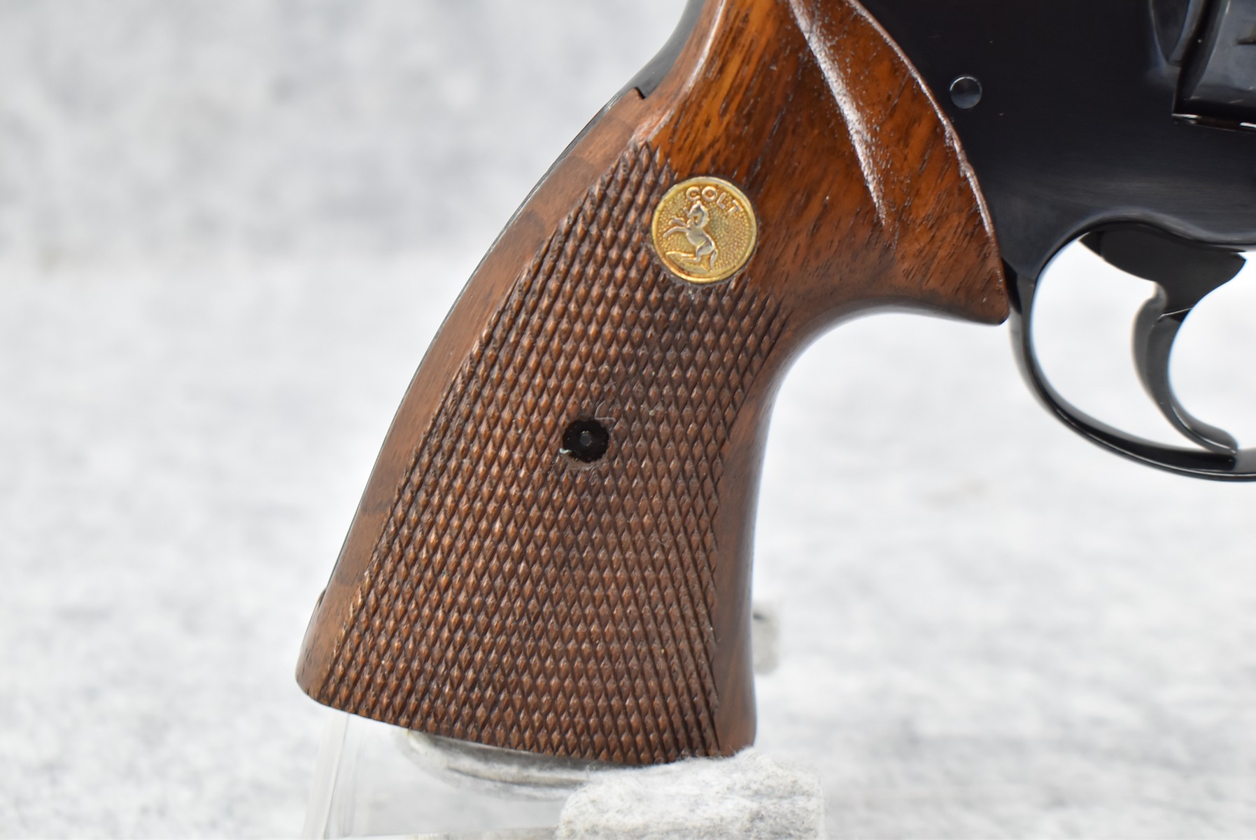 407R.     Colt – Mod. Trooper MK III 22LR Cal. Double Action Revolver – w/6” Barrel w/Ramp Blade Front & Adj. Rear Notch Sights – Blued Finish – w/Gold Colt Medallion Checkered Wood Grips – Mfg. 1964