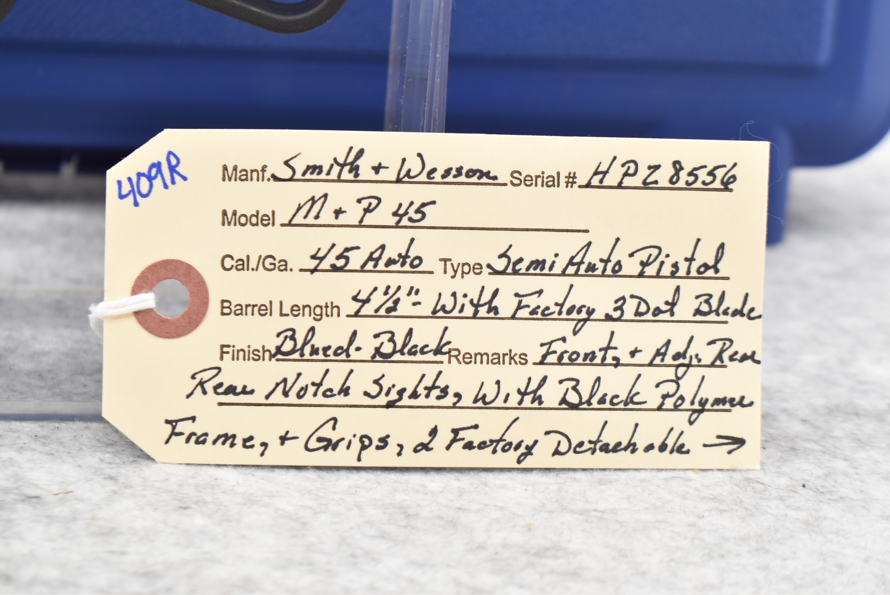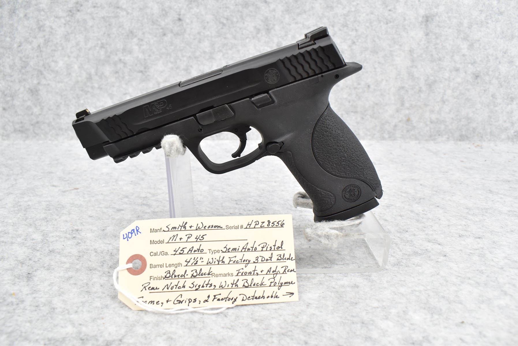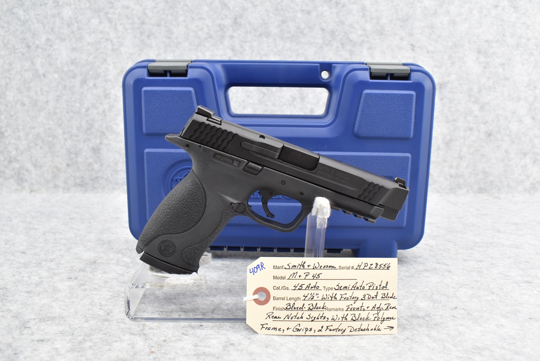 409R. Smith & Wesson – Mod. M&P 45 – 45 Auto Cal. Semi-Auto Pistol – w/4 ½” Barrel w/Factory 3-Dot Blade Front & Adj. Rear Notch Sights – Blued Finish – w/Black Polymer Frame & Grips – w/2 Factory Detachable Magazines – w/Grips Inserts – w/Hard Case & Accessories