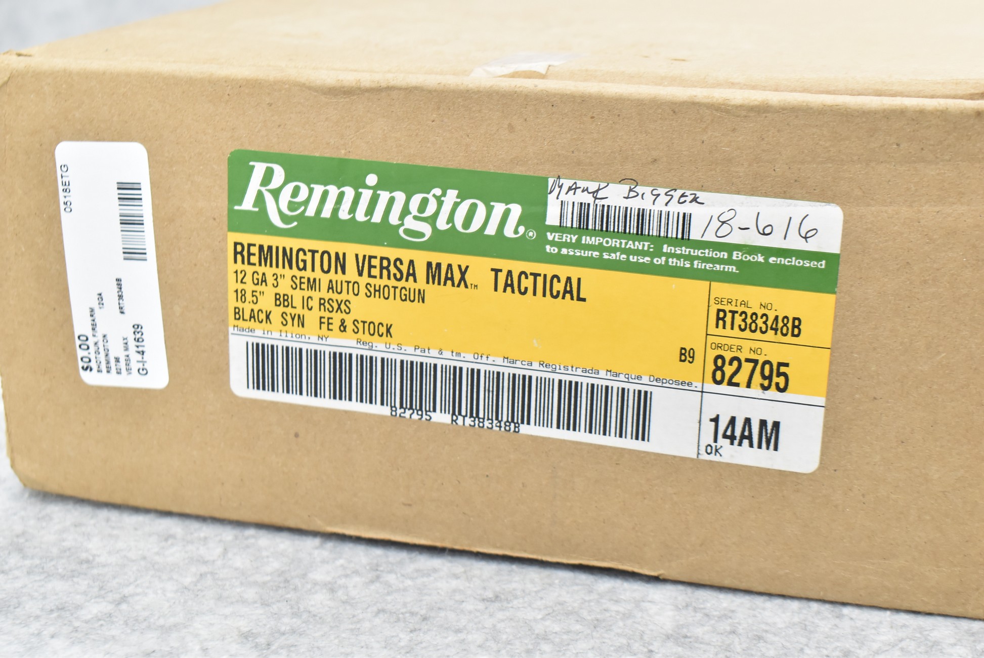 40R. Remington – Mod. Versa Max Tactical – 12ga. 3” Semi-Auto Shotgun – w/18½” Imp. Cyl. Choked Barrel w/Rifle Sights – Matte Blued Finish – w/Textured Black Synthetic Stock and Forearm w/Factory Black Rubber Butt Pad – w/Full Length Tubular Magazine – New in Factory Box w/Manual and Accessories
