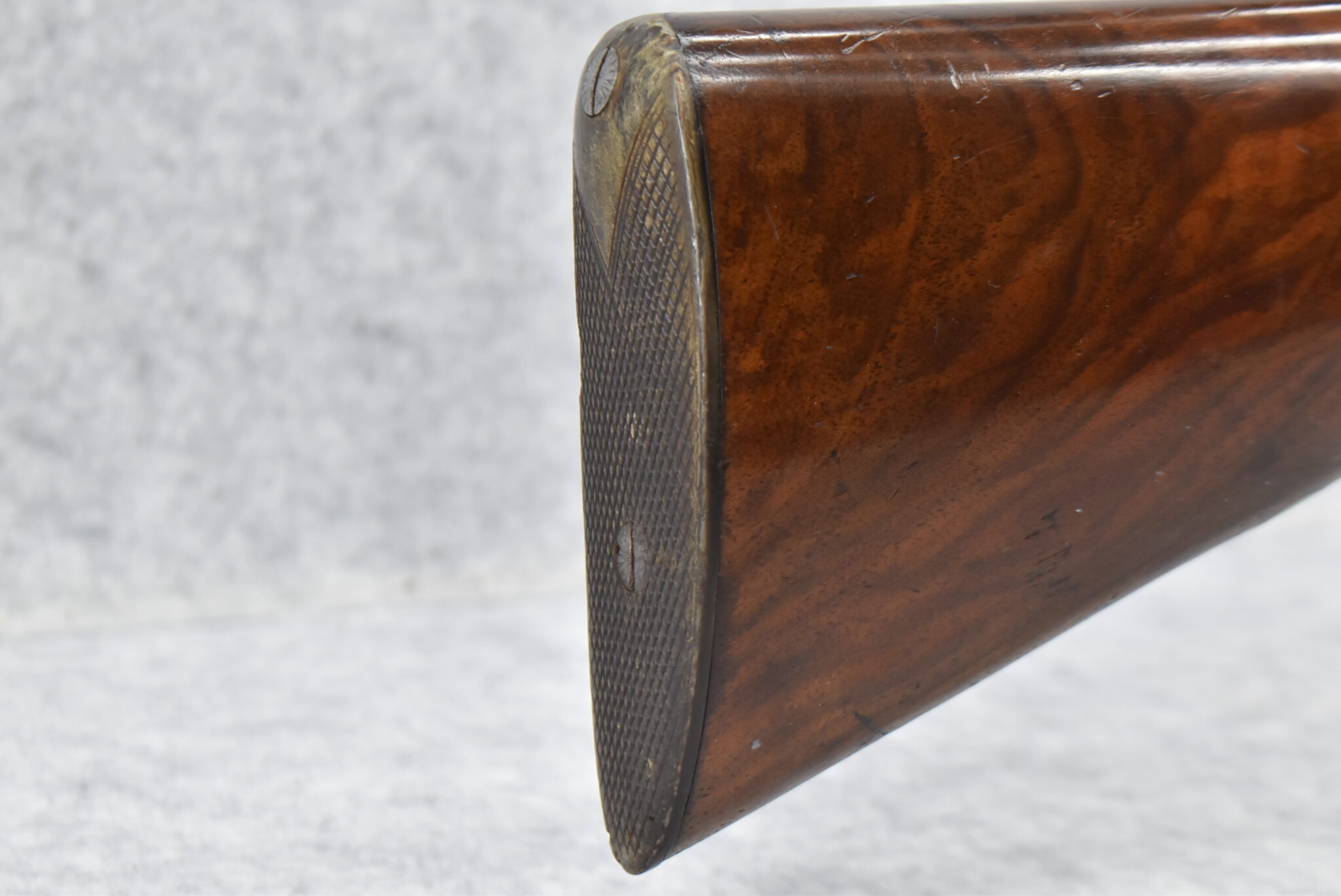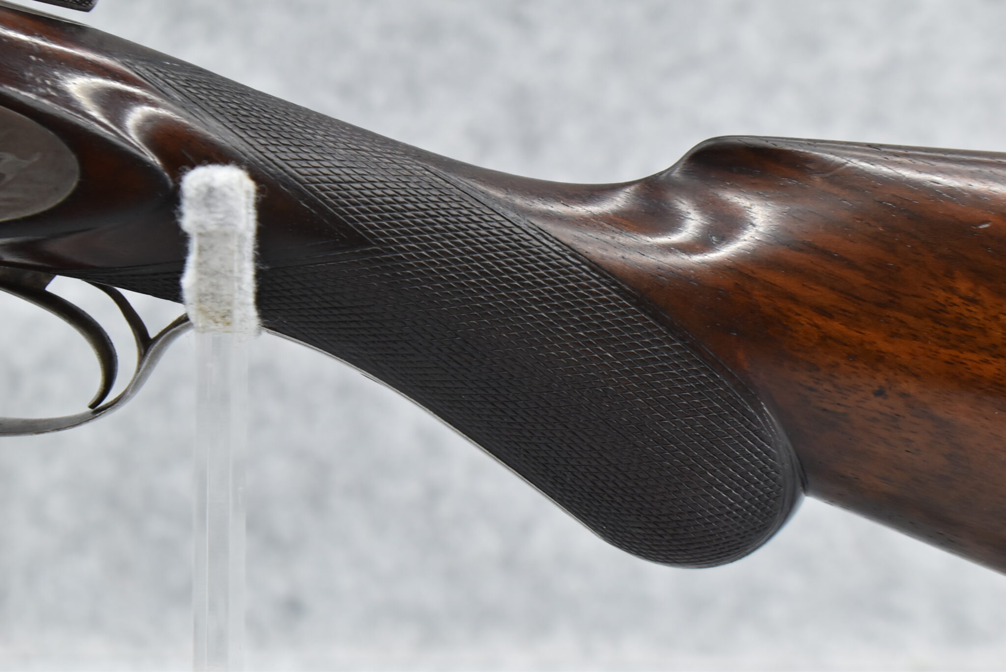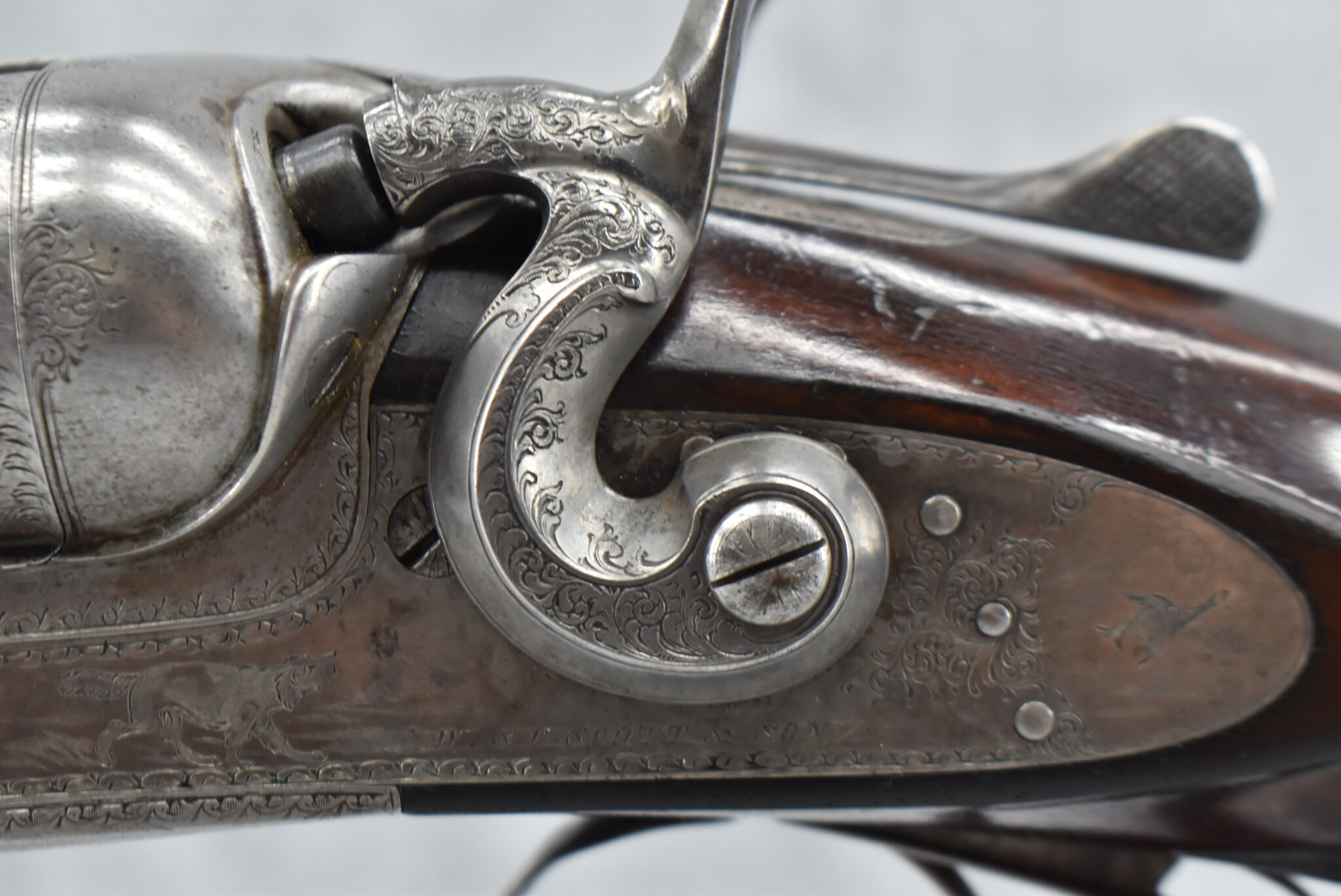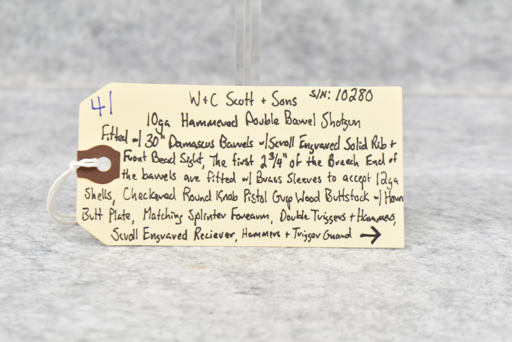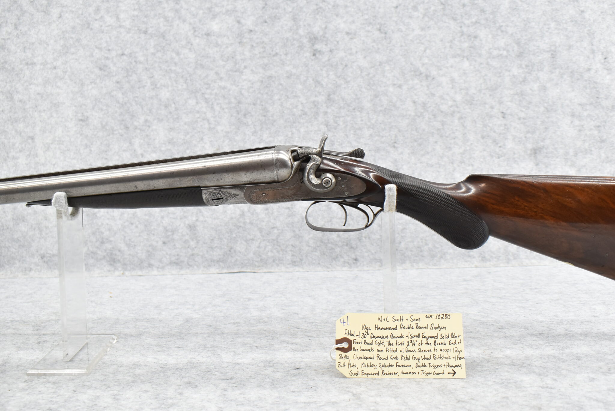 41. W&C Scott & Sons – 10ga. Hammered Double Barrel Shotgun – Fitted w/30” Damascus Barrels w/Scroll Engraved Solid Rib & Front Bead Sight – The First 2 ¾” of the Breech End of the Barrels Are Fitted w/Brass Sleeves to Accept 12ga. Shells – w/Scroll Engraved Receiver, Hammers & Trigger Guard – w/Checkered Round Knob Pistol Grip Wood Butt Stock w/Horn Butt Plate & Matching Splinter Forearm – w/Double Triggers & Hammers – LOP 14” – Gun Weighs 8lbs. 14oz.