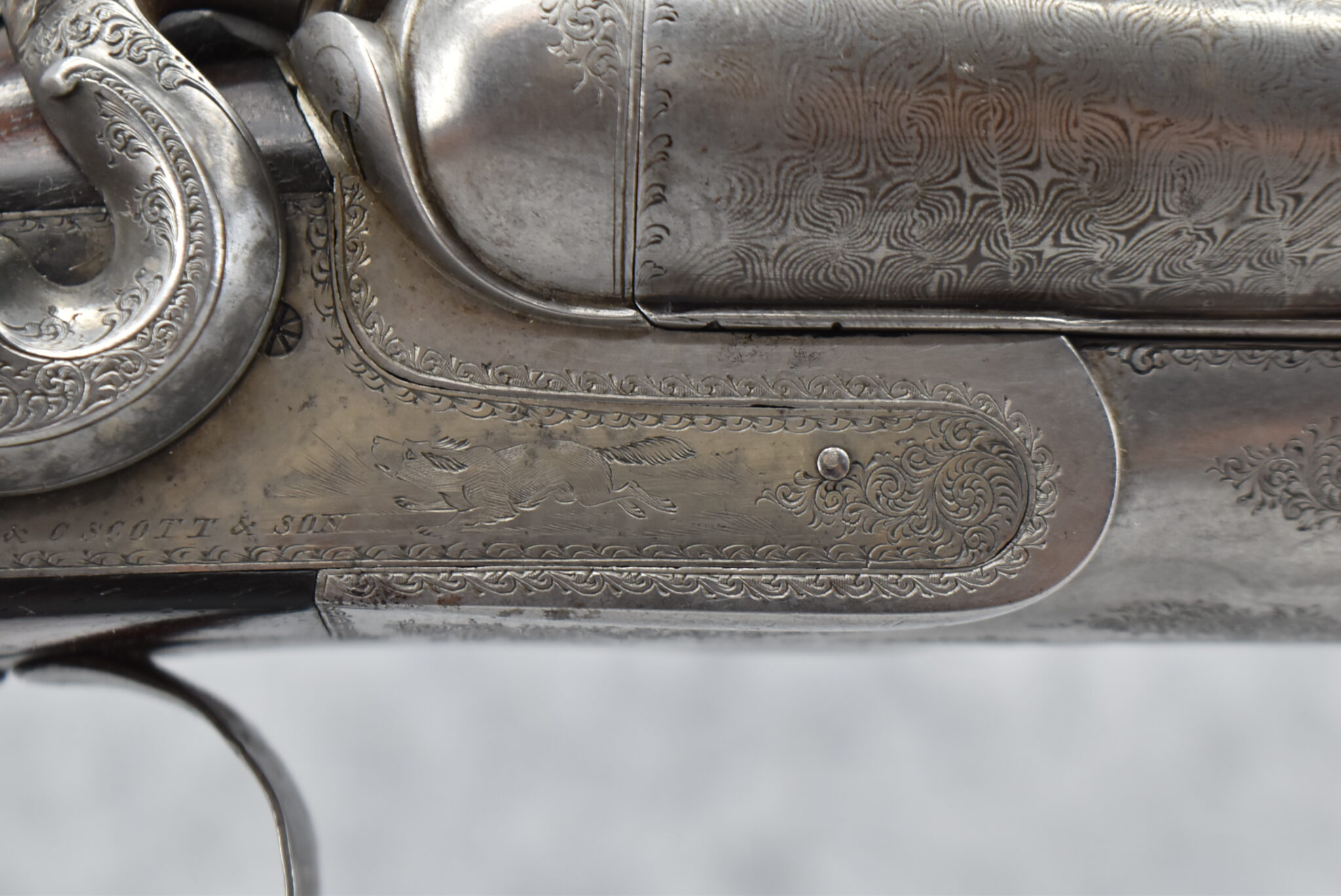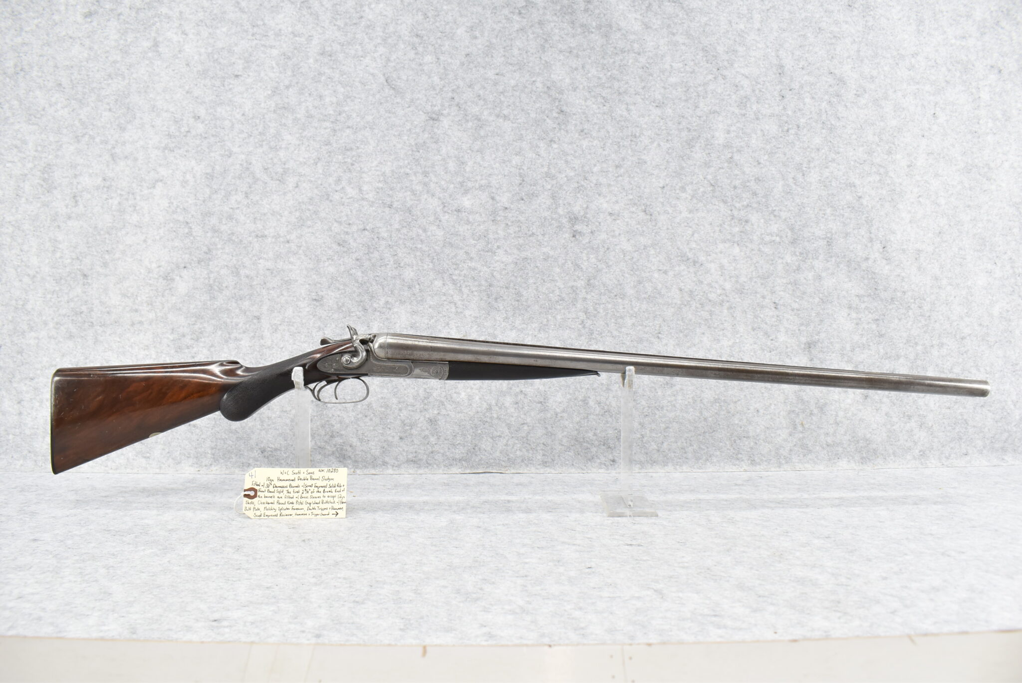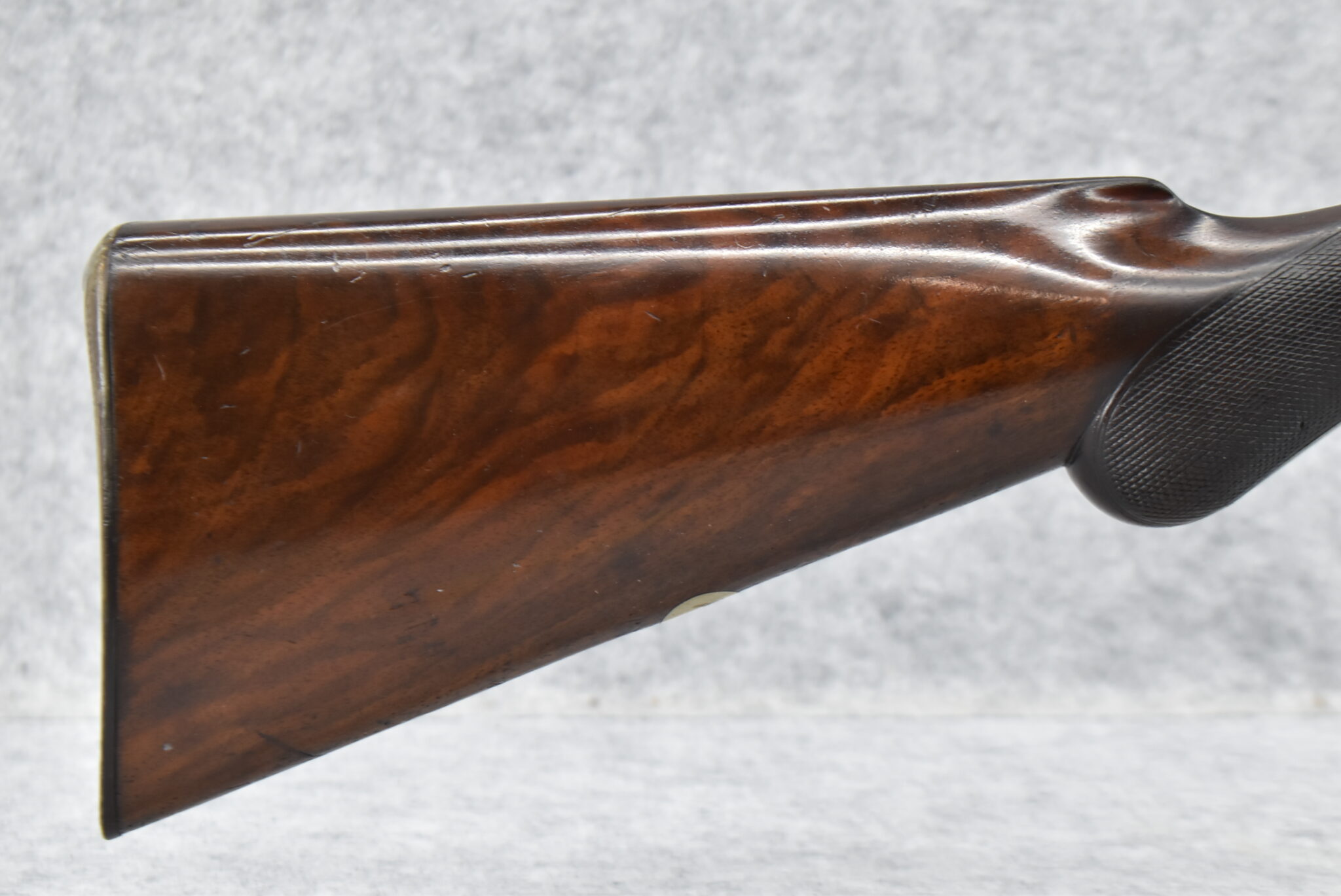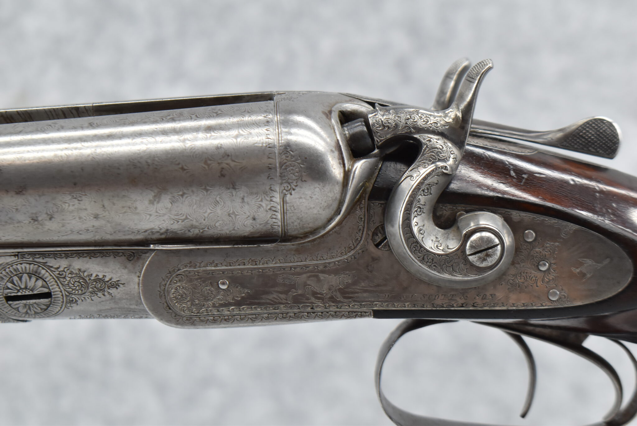 41. W&C Scott & Sons – 10ga. Hammered Double Barrel Shotgun – Fitted w/30” Damascus Barrels w/Scroll Engraved Solid Rib & Front Bead Sight – The First 2 ¾” of the Breech End of the Barrels Are Fitted w/Brass Sleeves to Accept 12ga. Shells – w/Scroll Engraved Receiver, Hammers & Trigger Guard – w/Checkered Round Knob Pistol Grip Wood Butt Stock w/Horn Butt Plate & Matching Splinter Forearm – w/Double Triggers & Hammers – LOP 14” – Gun Weighs 8lbs. 14oz.