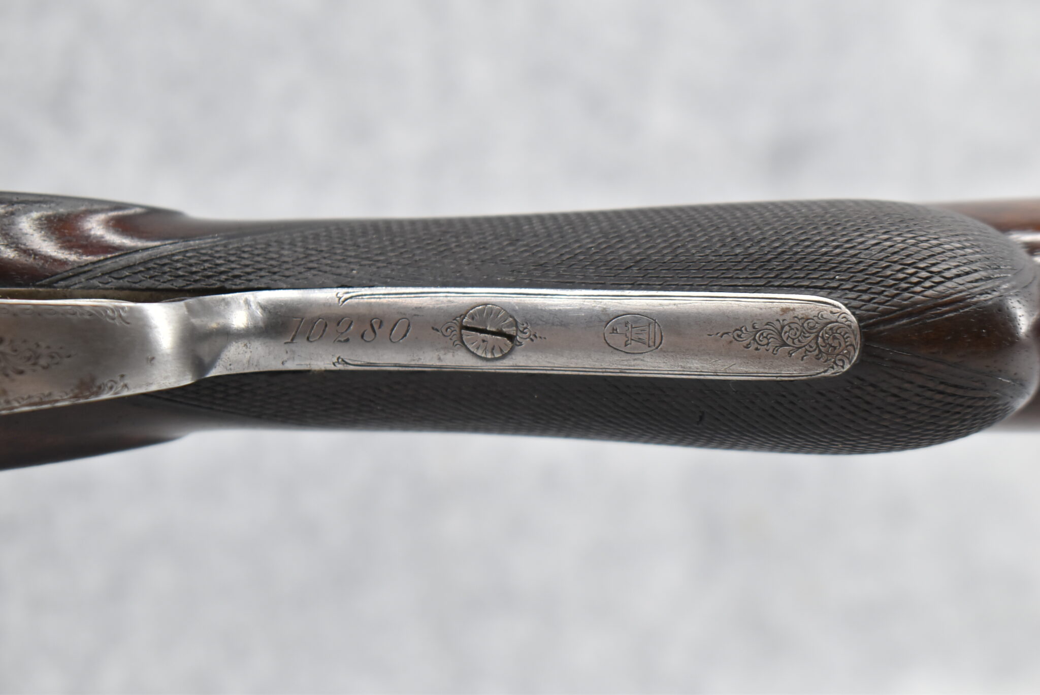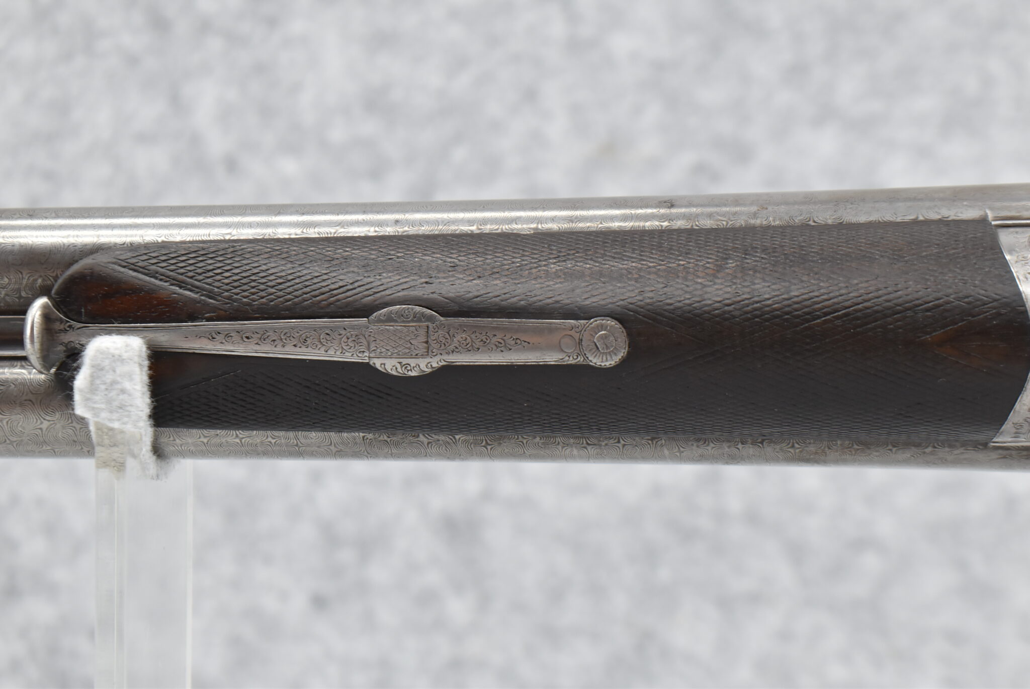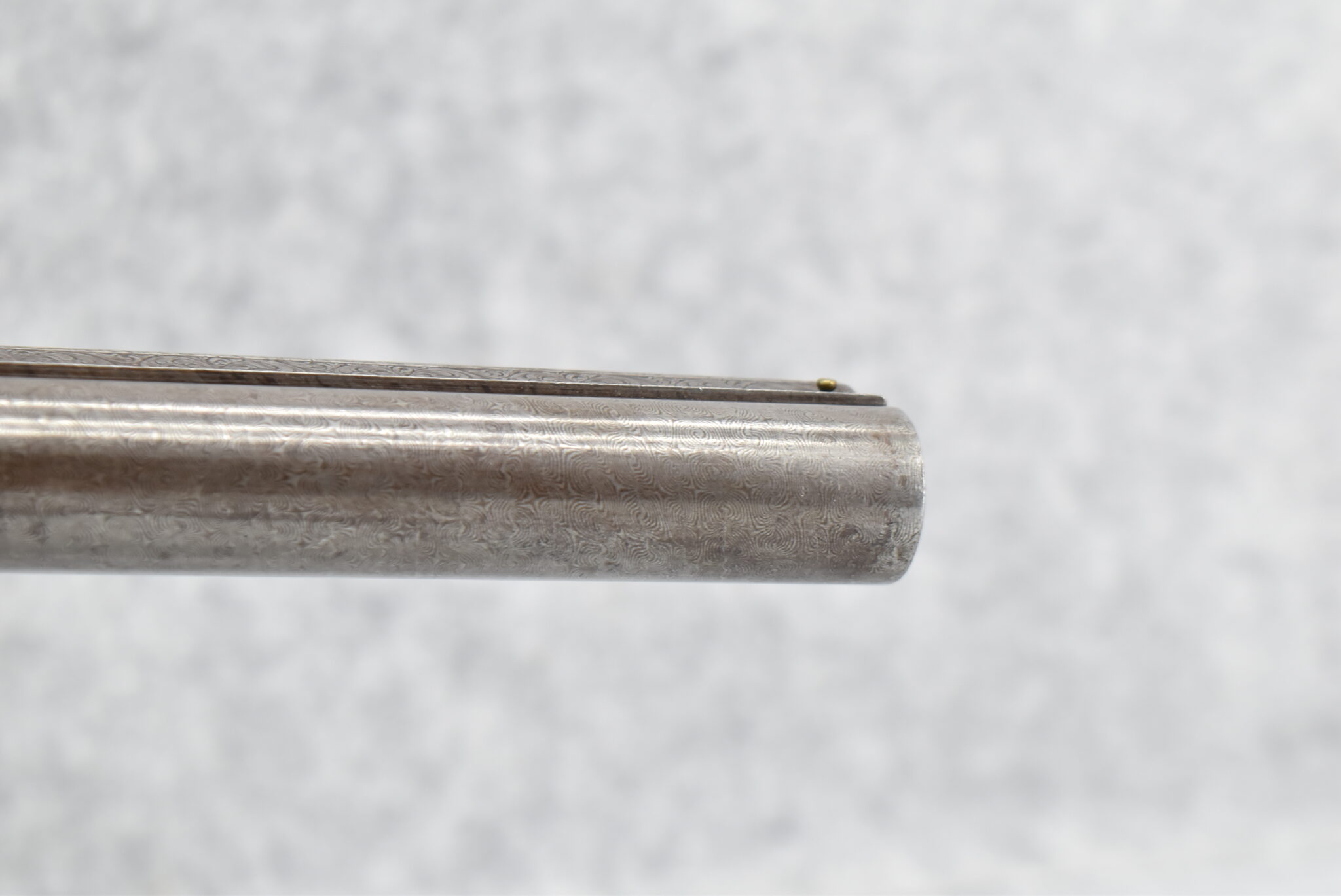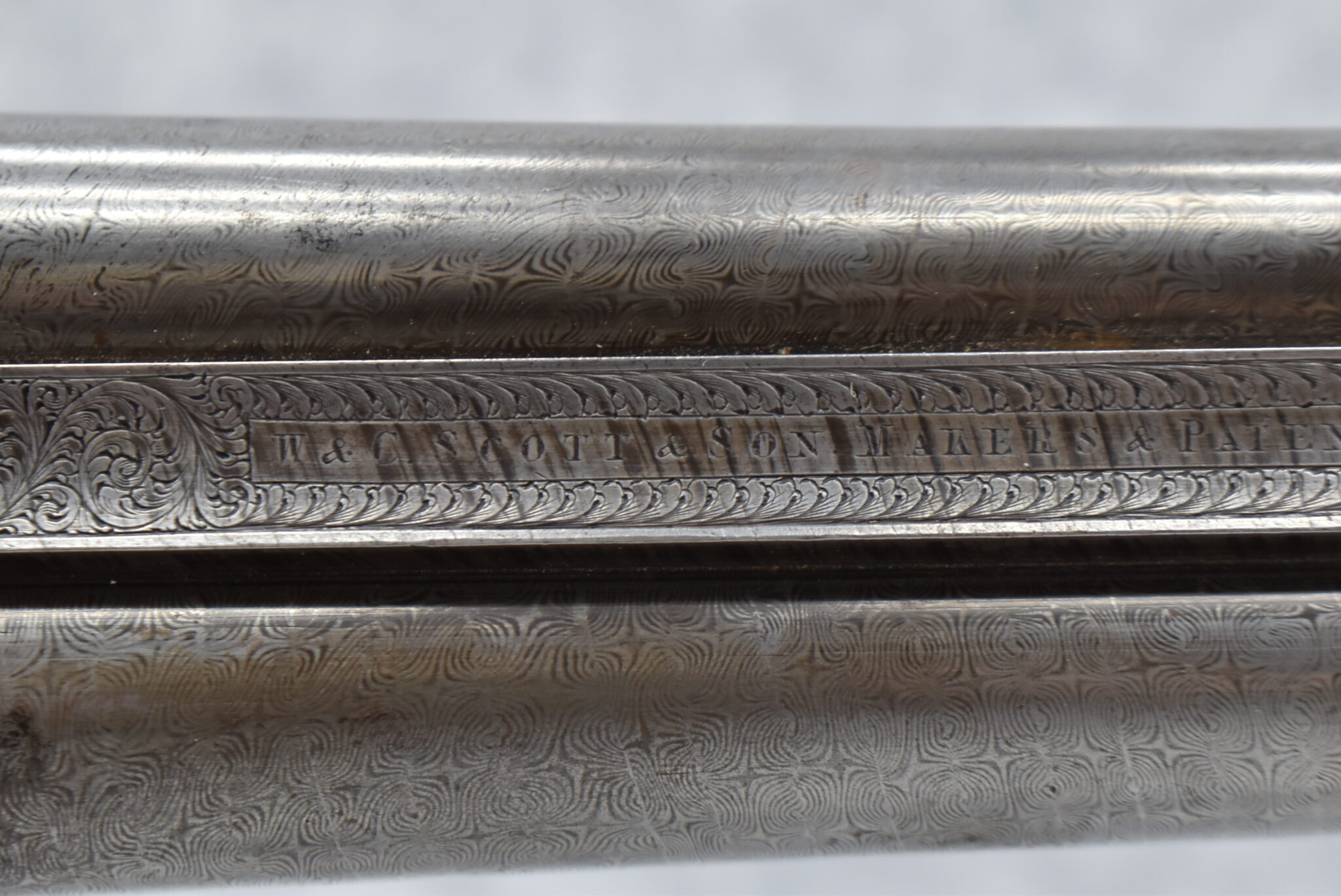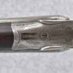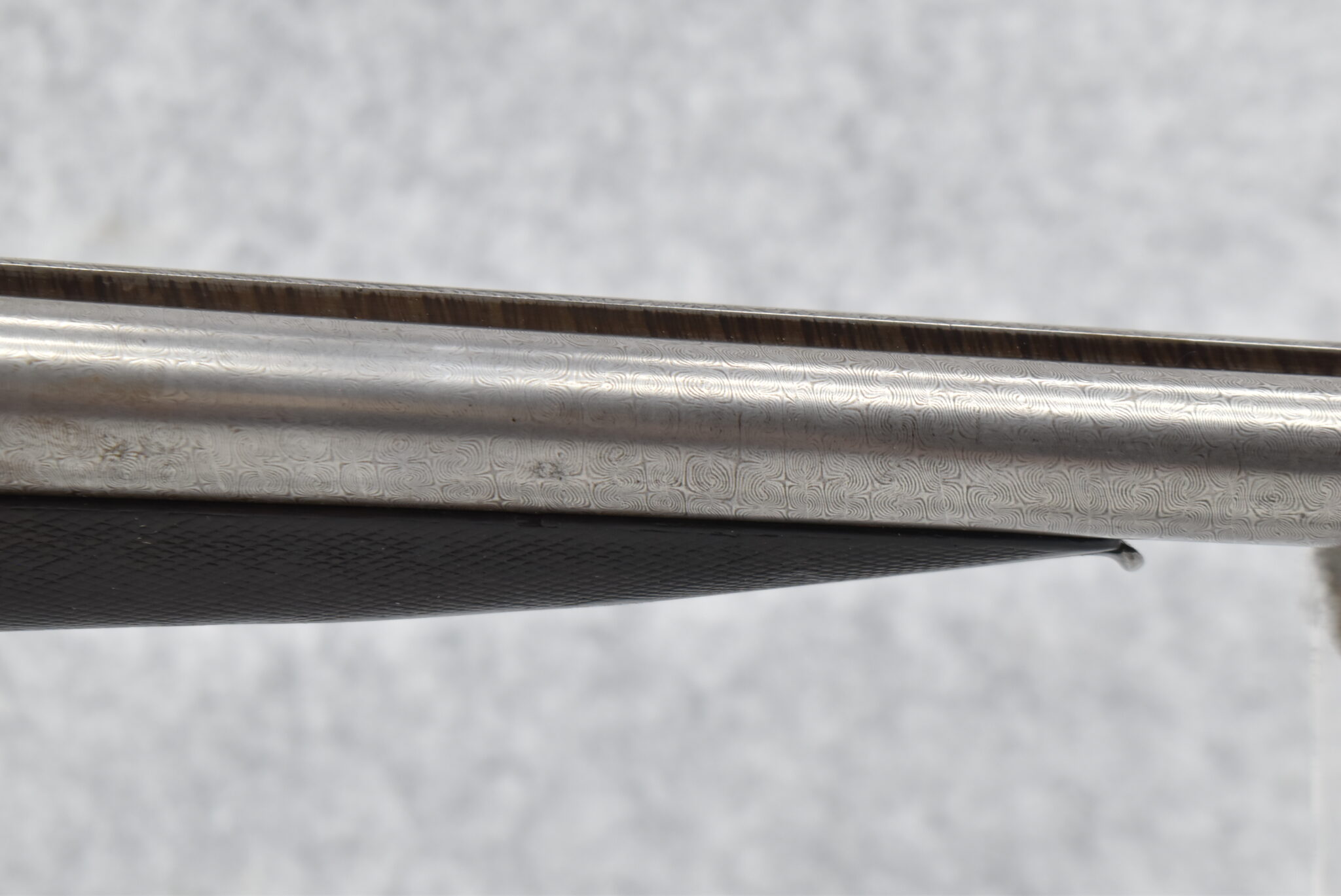 41. W&C Scott & Sons – 10ga. Hammered Double Barrel Shotgun – Fitted w/30” Damascus Barrels w/Scroll Engraved Solid Rib & Front Bead Sight – The First 2 ¾” of the Breech End of the Barrels Are Fitted w/Brass Sleeves to Accept 12ga. Shells – w/Scroll Engraved Receiver, Hammers & Trigger Guard – w/Checkered Round Knob Pistol Grip Wood Butt Stock w/Horn Butt Plate & Matching Splinter Forearm – w/Double Triggers & Hammers – LOP 14” – Gun Weighs 8lbs. 14oz.