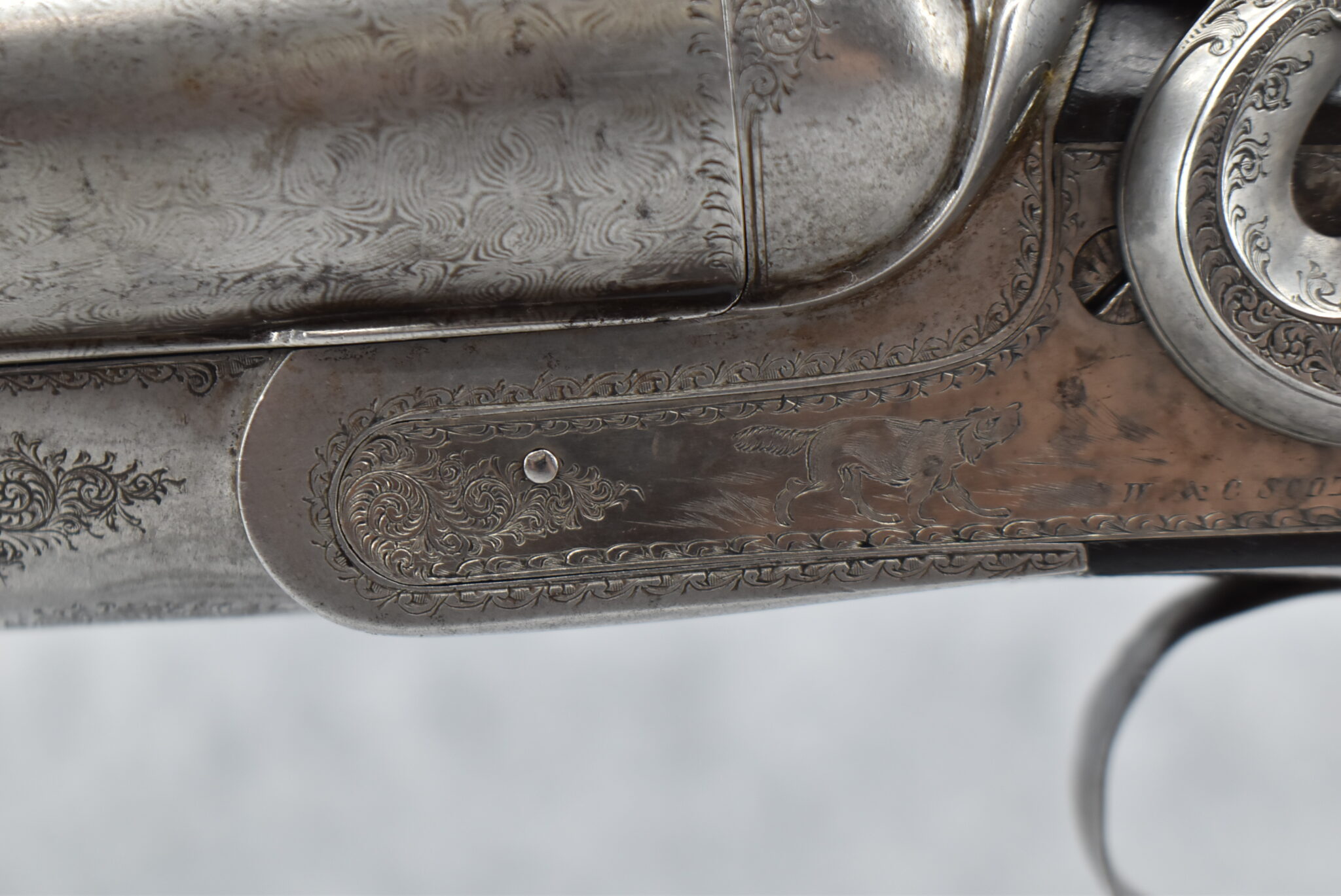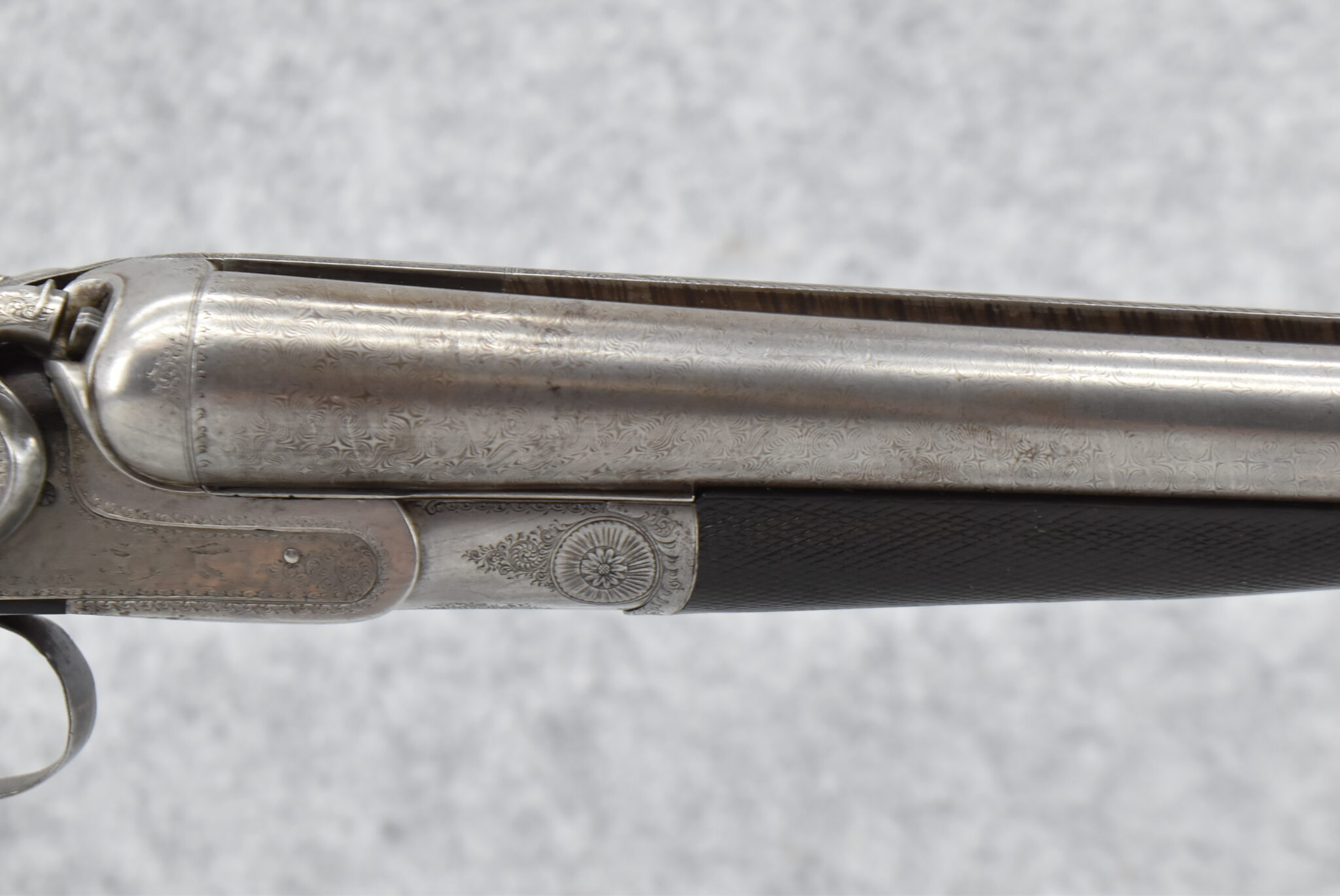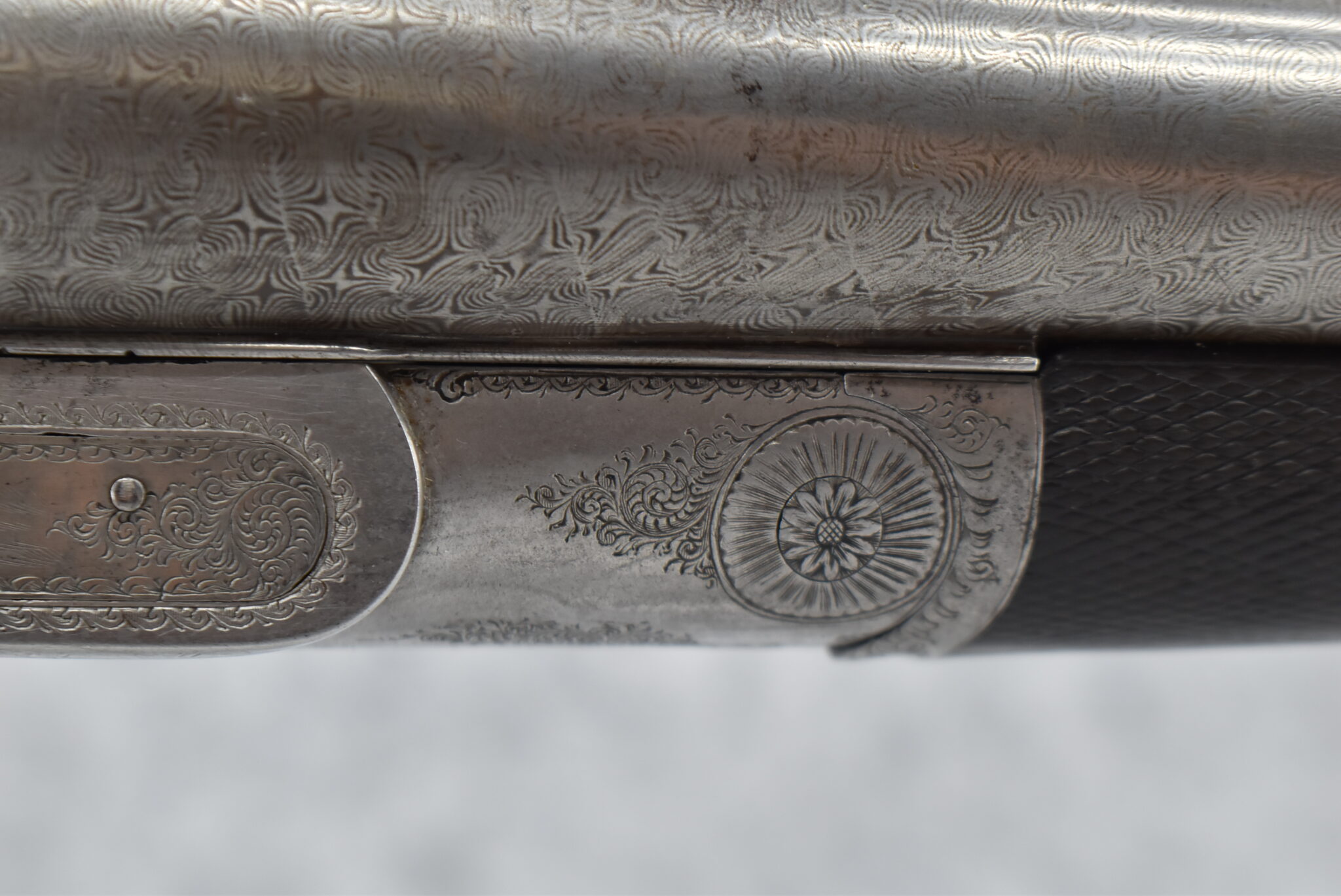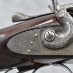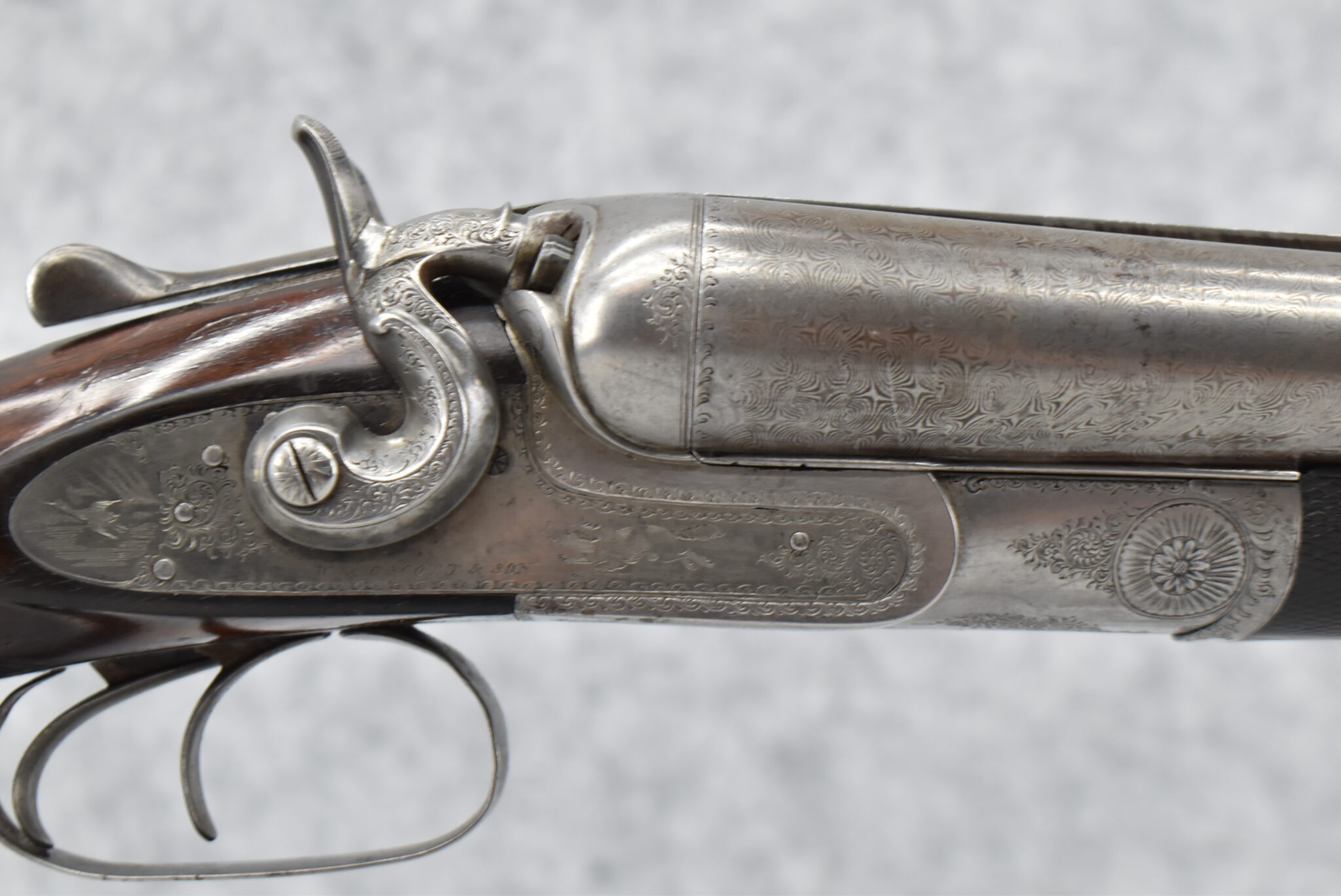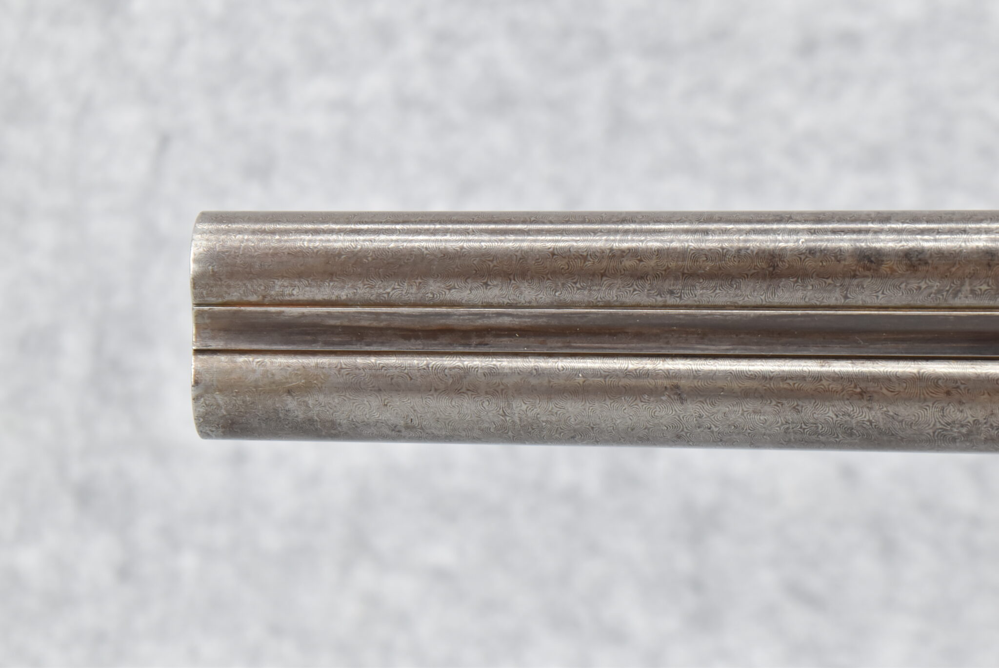 41. W&C Scott & Sons – 10ga. Hammered Double Barrel Shotgun – Fitted w/30” Damascus Barrels w/Scroll Engraved Solid Rib & Front Bead Sight – The First 2 ¾” of the Breech End of the Barrels Are Fitted w/Brass Sleeves to Accept 12ga. Shells – w/Scroll Engraved Receiver, Hammers & Trigger Guard – w/Checkered Round Knob Pistol Grip Wood Butt Stock w/Horn Butt Plate & Matching Splinter Forearm – w/Double Triggers & Hammers – LOP 14” – Gun Weighs 8lbs. 14oz.