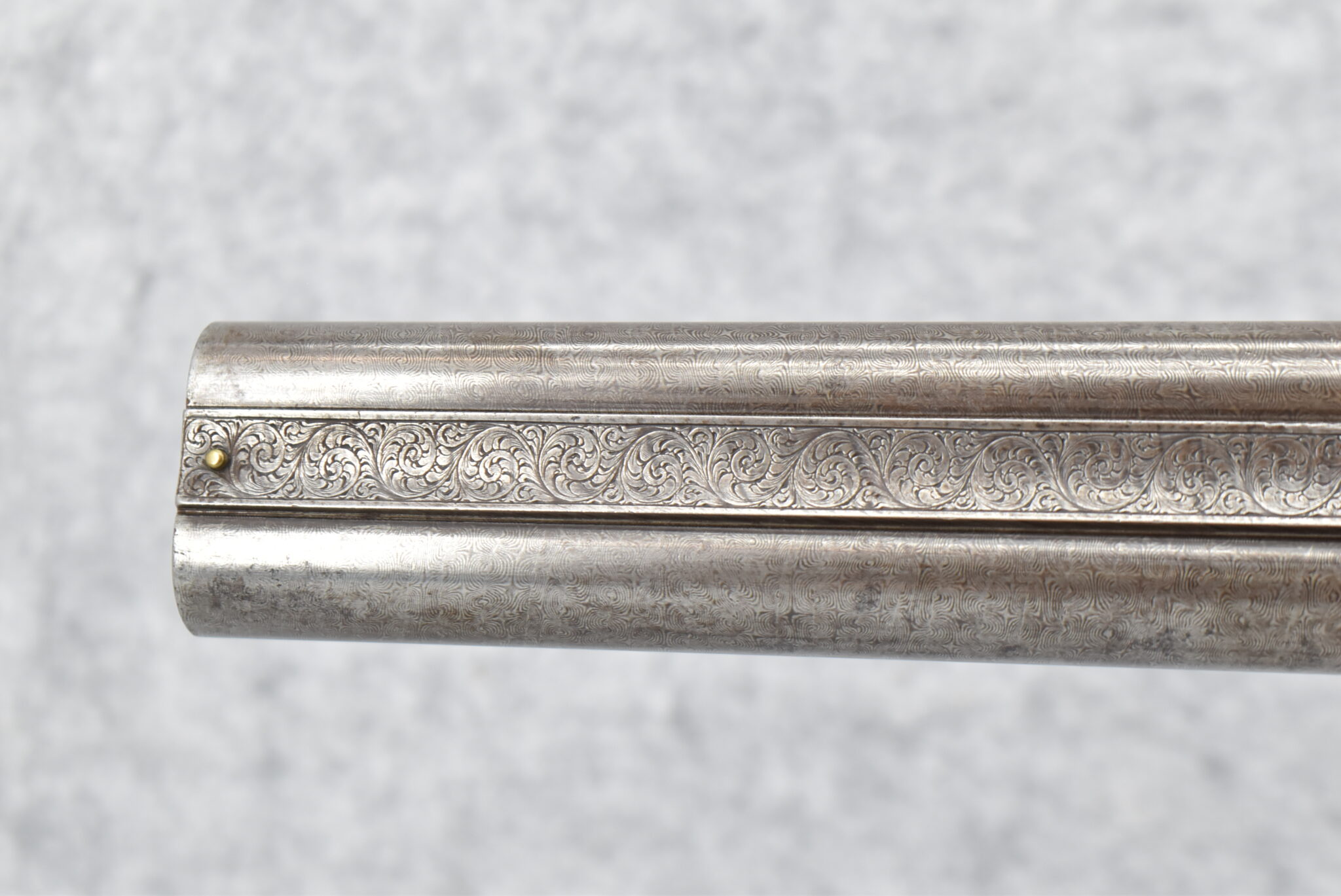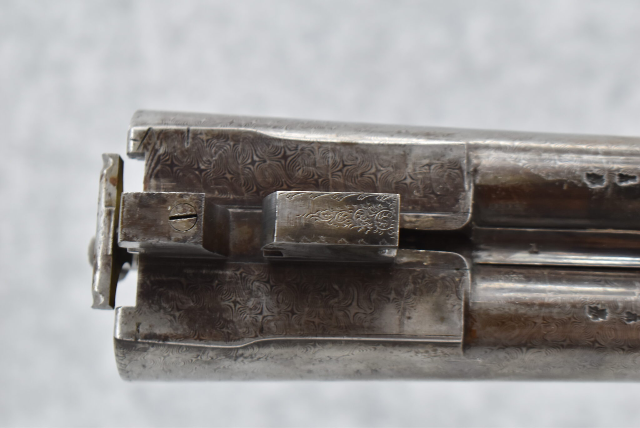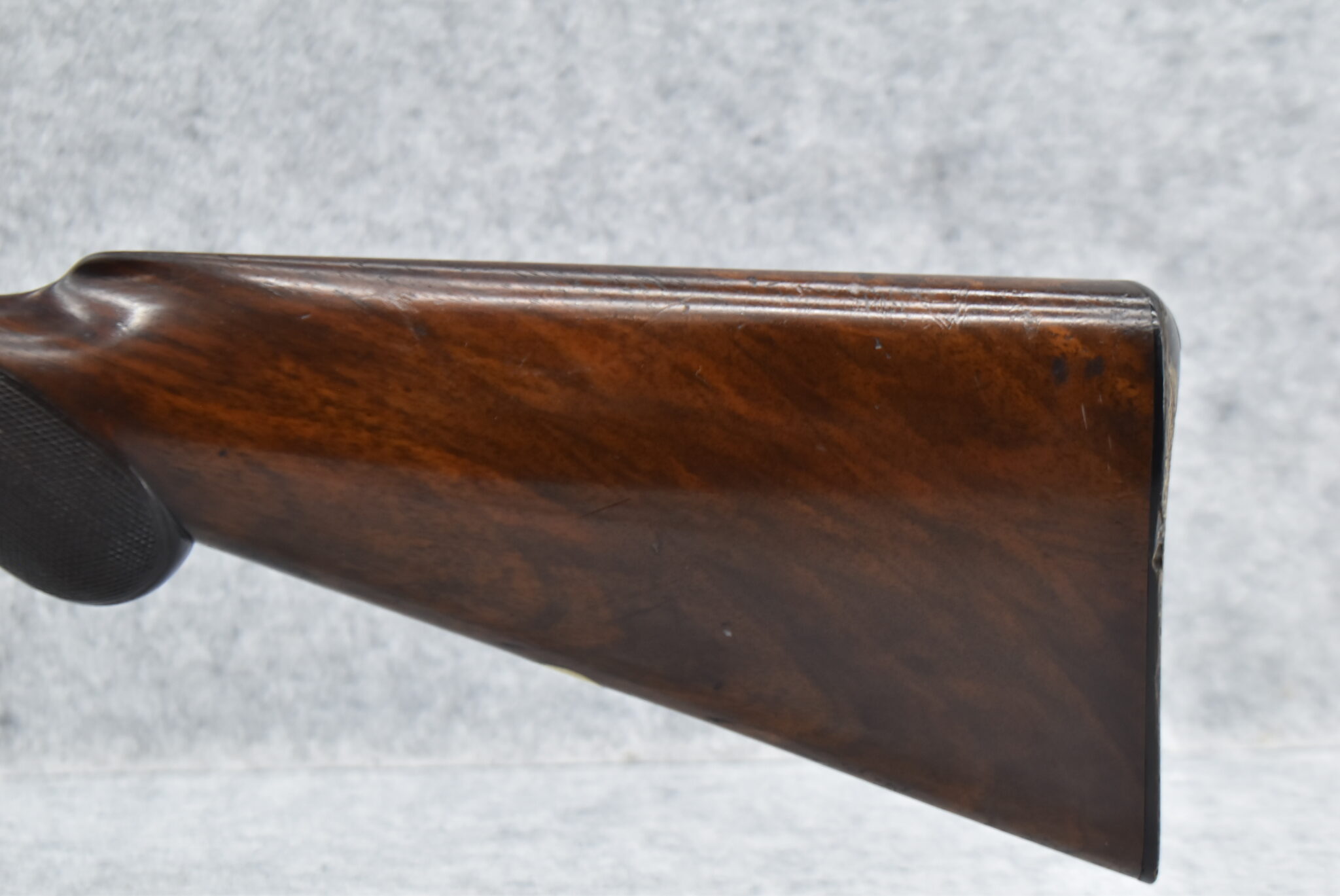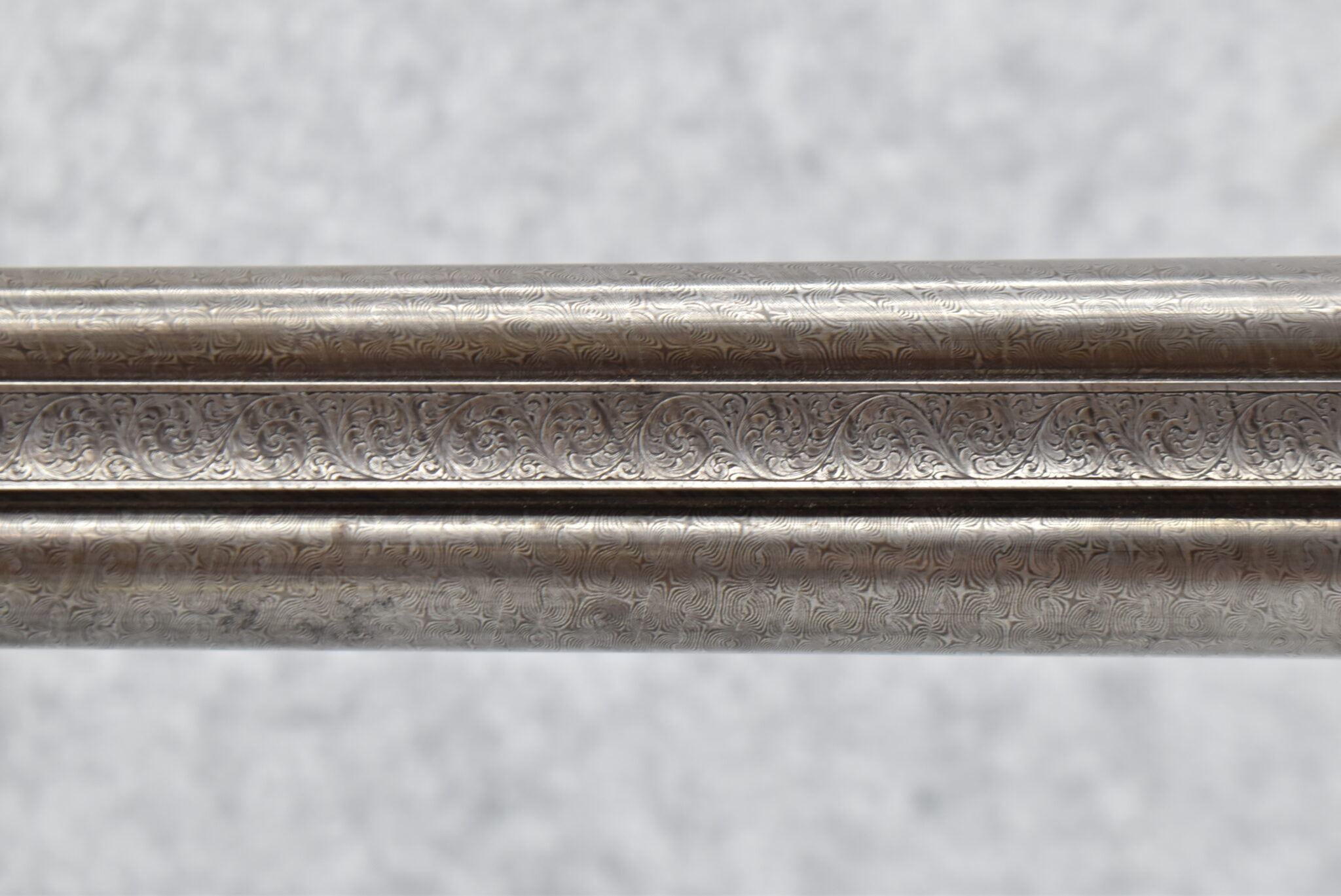 41. W&C Scott & Sons – 10ga. Hammered Double Barrel Shotgun – Fitted w/30” Damascus Barrels w/Scroll Engraved Solid Rib & Front Bead Sight – The First 2 ¾” of the Breech End of the Barrels Are Fitted w/Brass Sleeves to Accept 12ga. Shells – w/Scroll Engraved Receiver, Hammers & Trigger Guard – w/Checkered Round Knob Pistol Grip Wood Butt Stock w/Horn Butt Plate & Matching Splinter Forearm – w/Double Triggers & Hammers – LOP 14” – Gun Weighs 8lbs. 14oz.