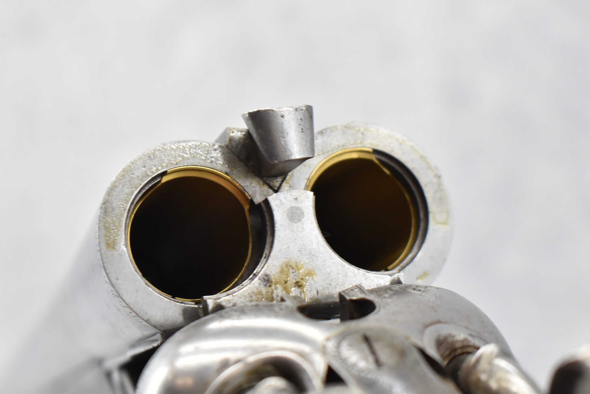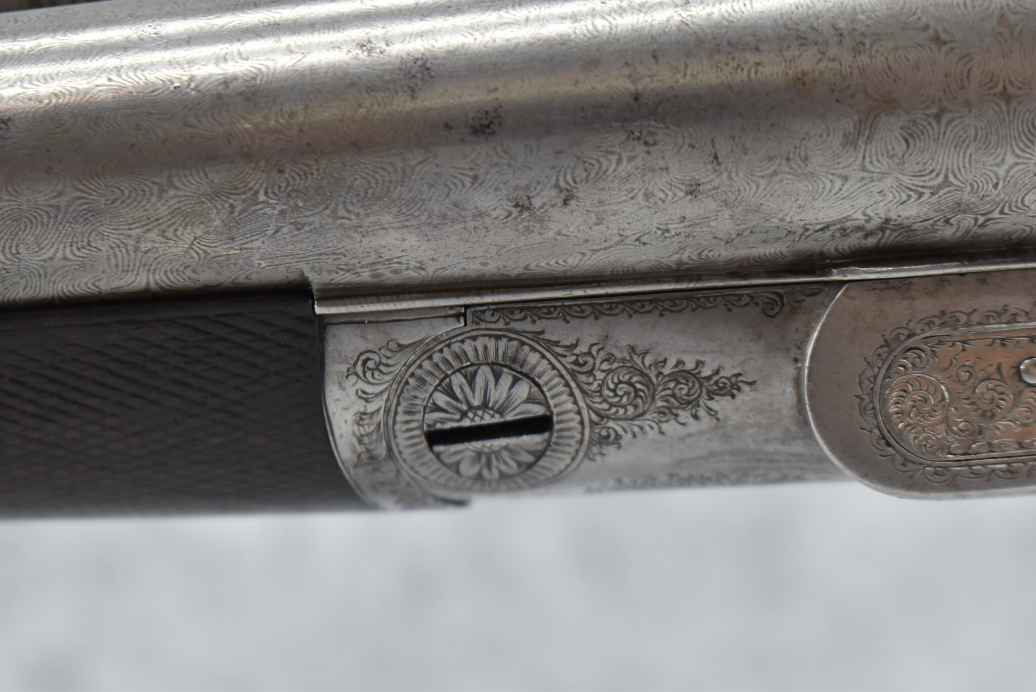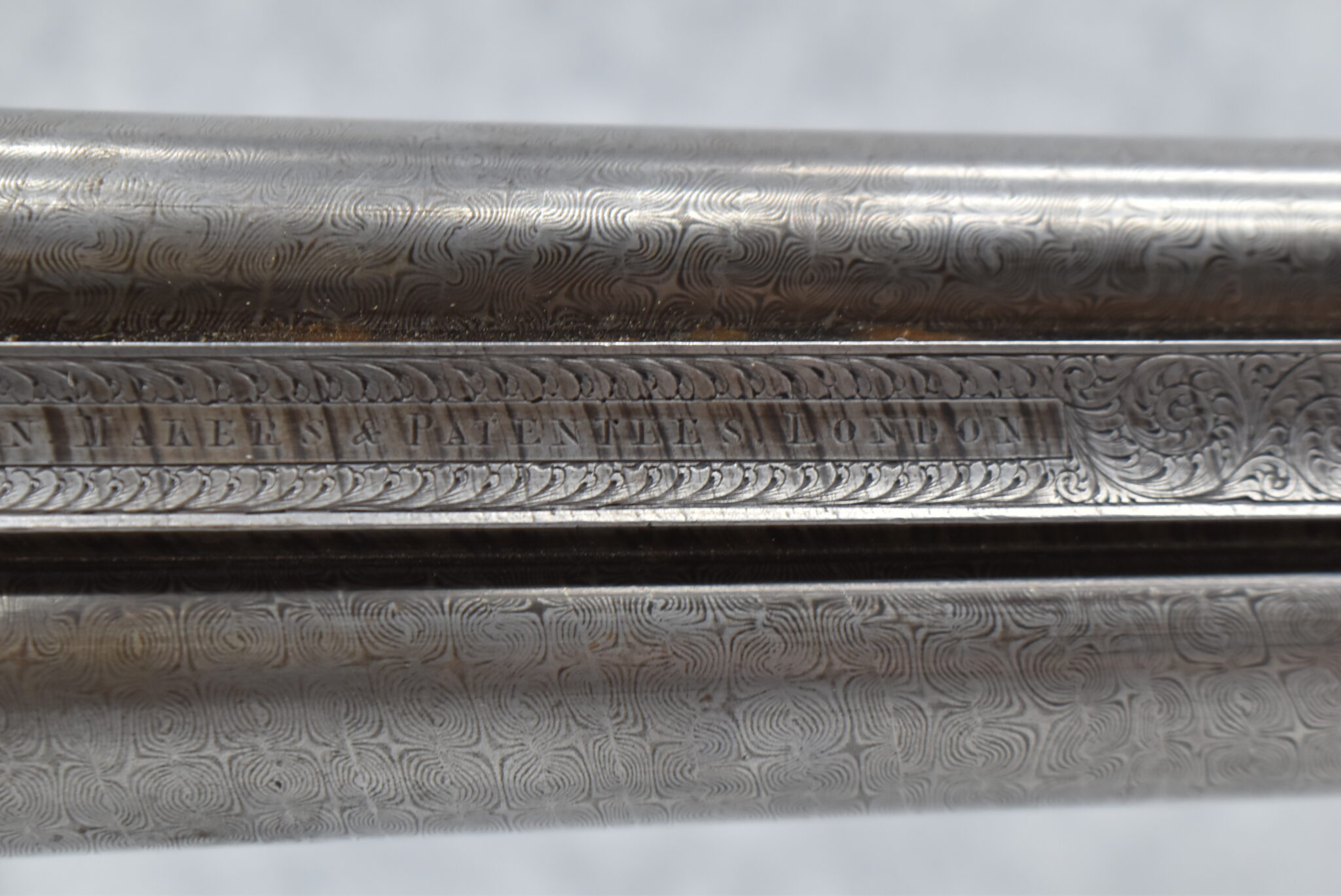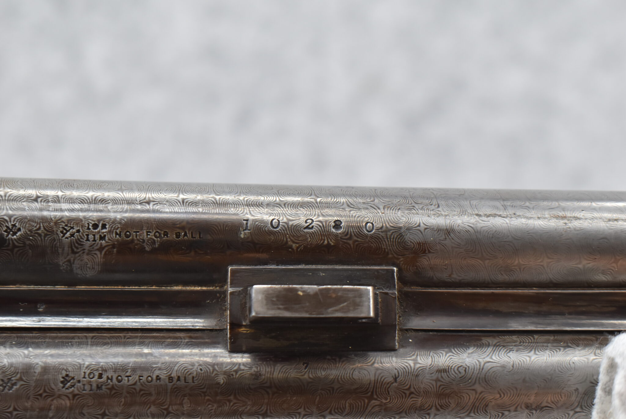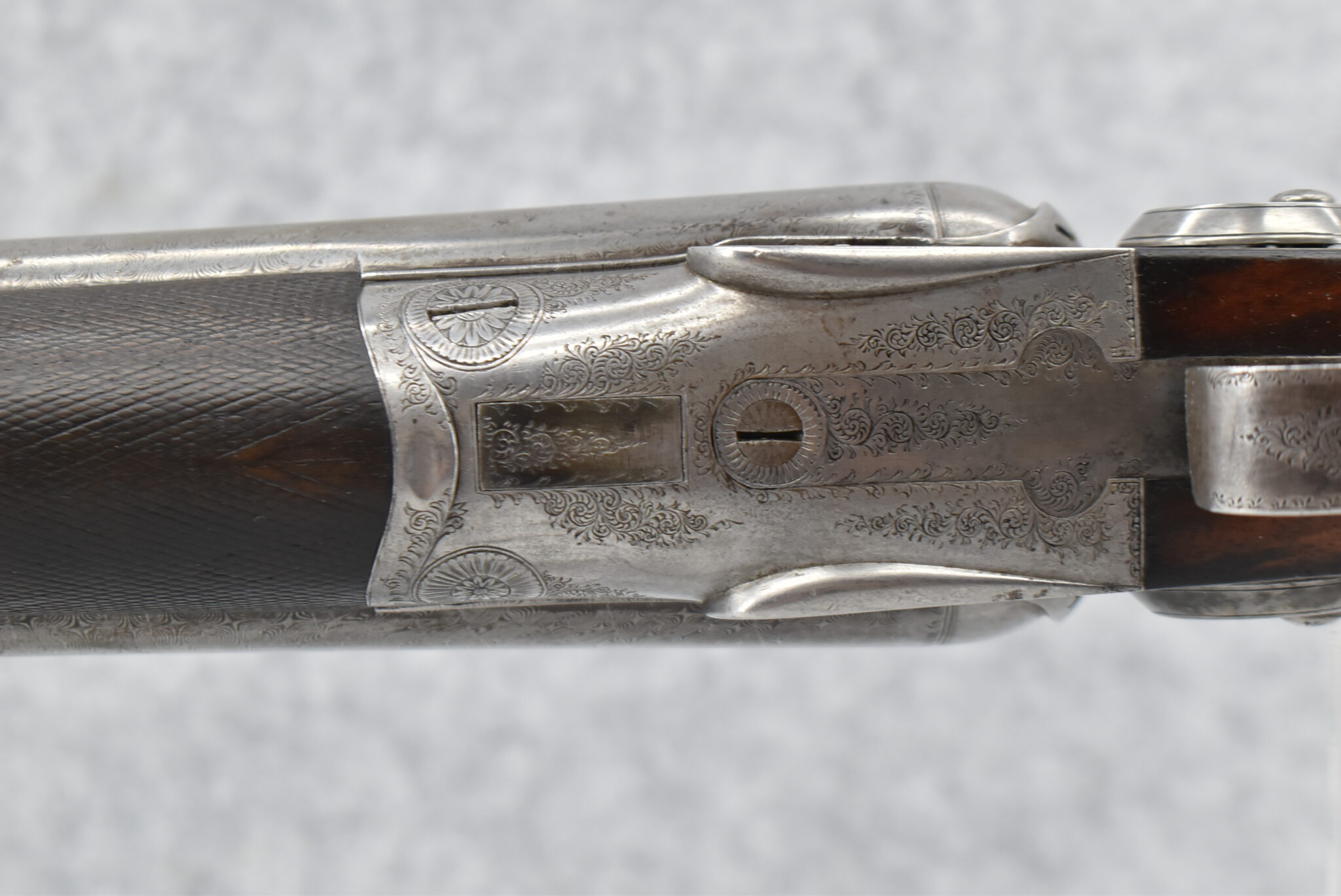41. W&C Scott & Sons – 10ga. Hammered Double Barrel Shotgun – Fitted w/30” Damascus Barrels w/Scroll Engraved Solid Rib & Front Bead Sight – The First 2 ¾” of the Breech End of the Barrels Are Fitted w/Brass Sleeves to Accept 12ga. Shells – w/Scroll Engraved Receiver, Hammers & Trigger Guard – w/Checkered Round Knob Pistol Grip Wood Butt Stock w/Horn Butt Plate & Matching Splinter Forearm – w/Double Triggers & Hammers – LOP 14” – Gun Weighs 8lbs. 14oz.