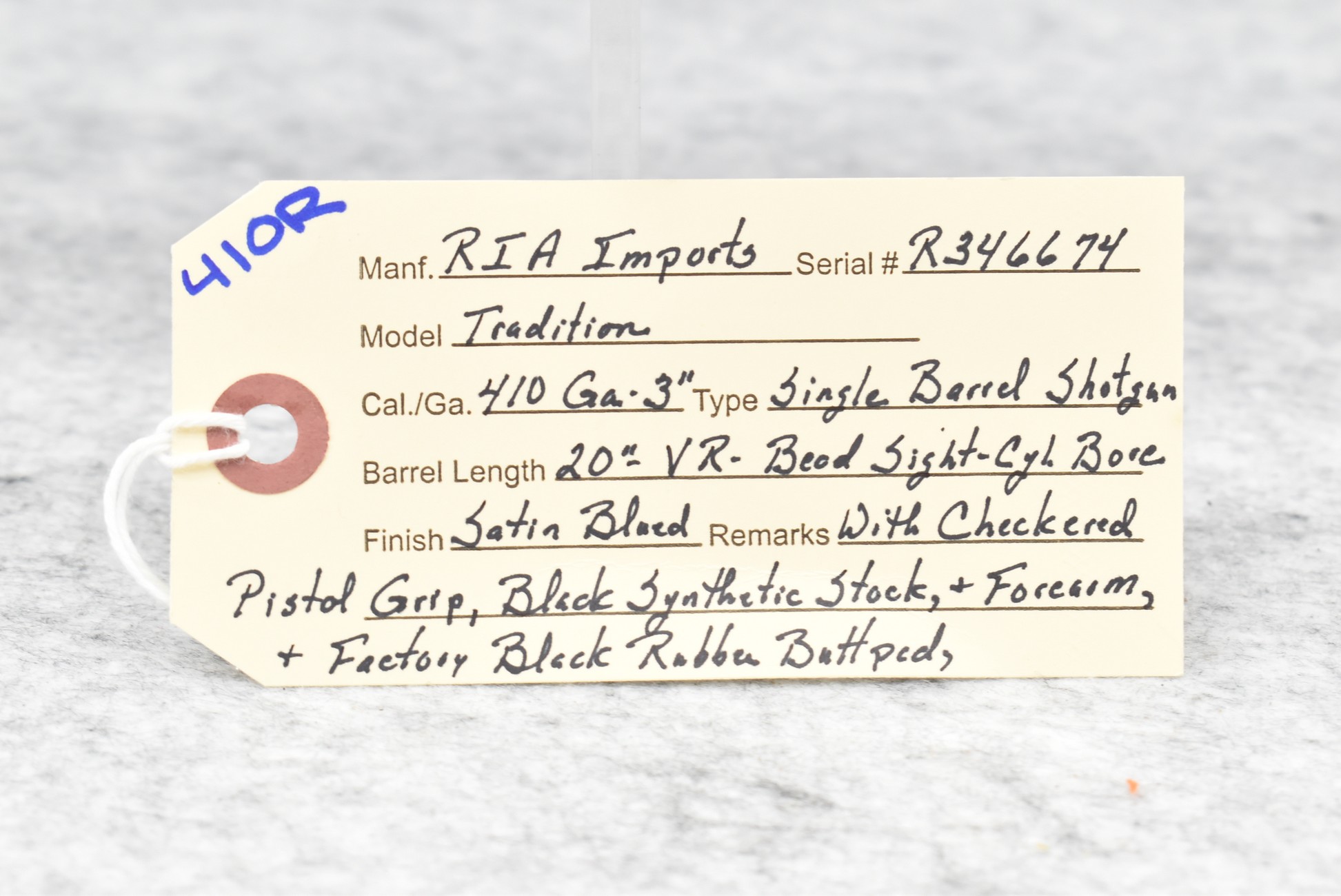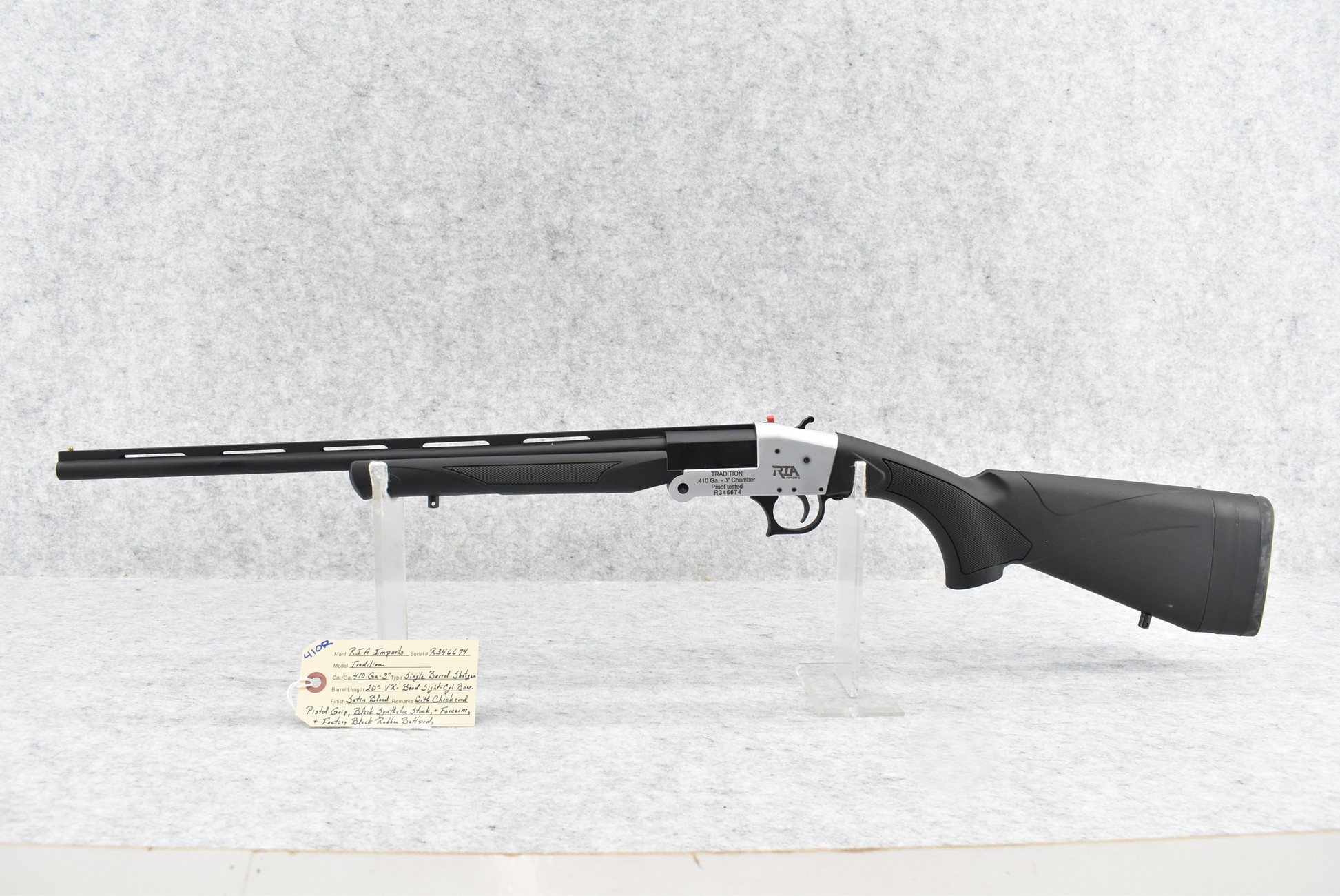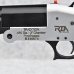 410R. RIA Imports – Mod. Tradition – 410ga. 3” Single Barrel Shotgun – w/20” Cyl. Choked, Vent-Rib Barrel w/Bead Sight – Satin Blued Finish – w/Checkered Pistol Grip Black Synthetic Stocks w/Factory Butt Pad