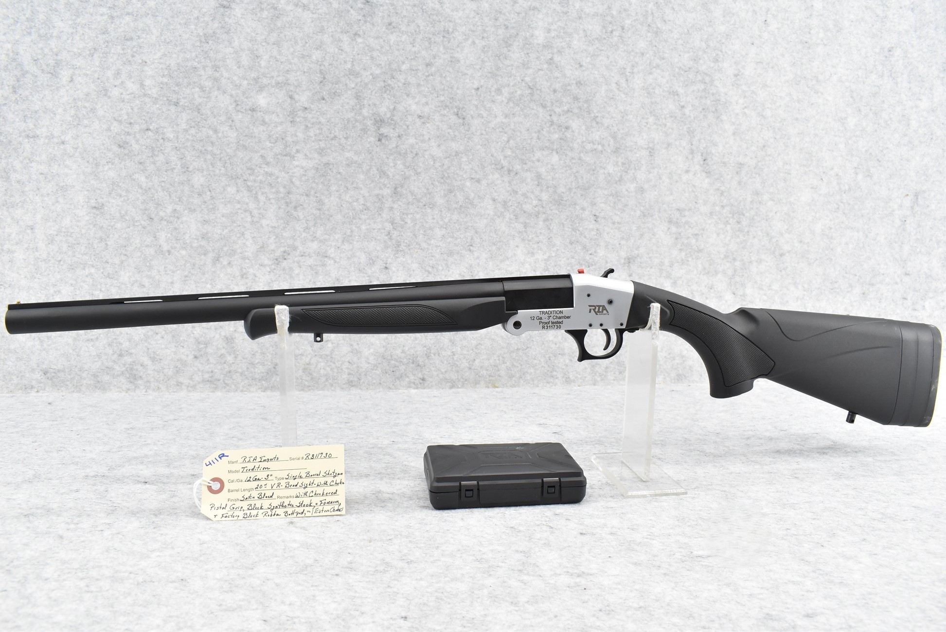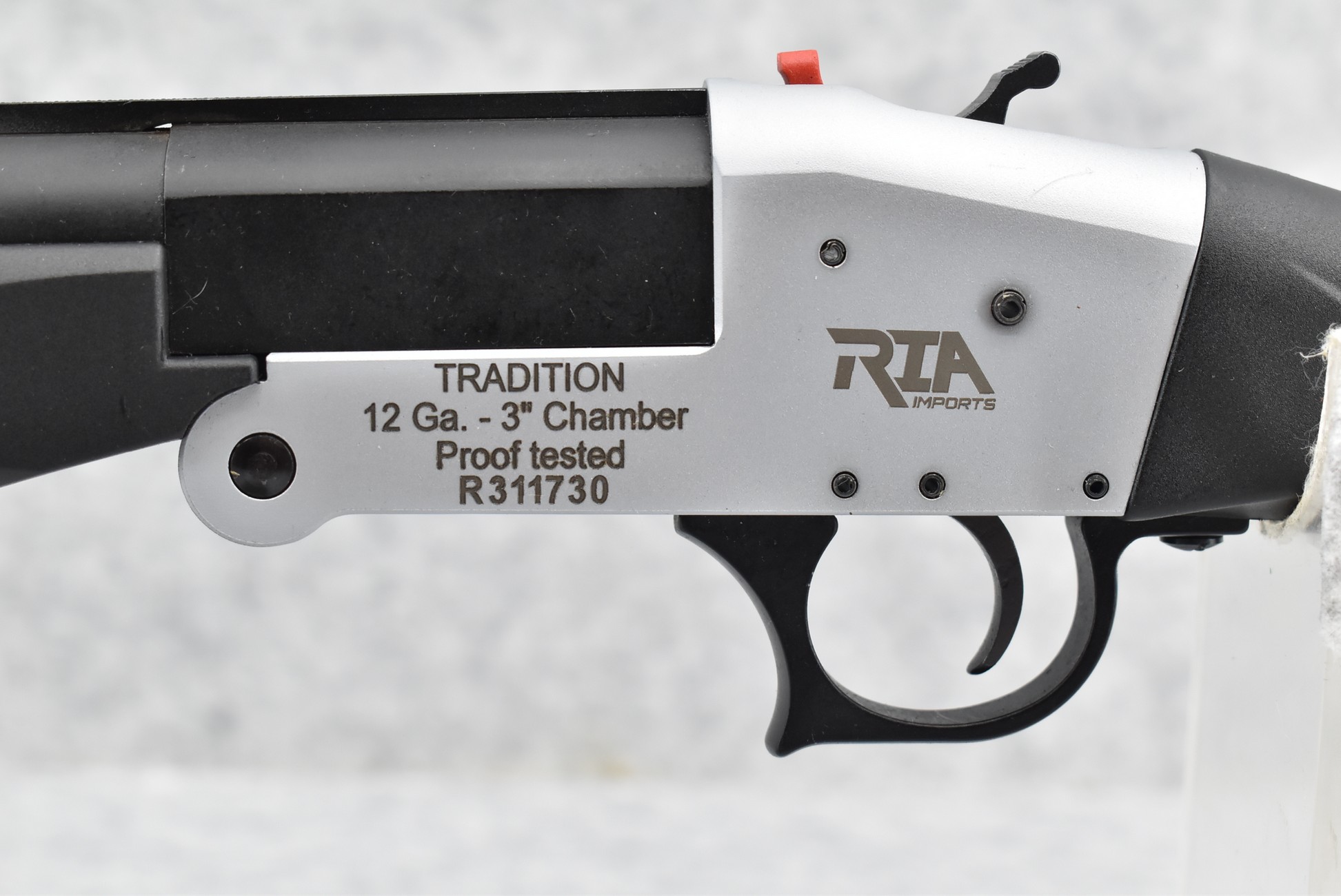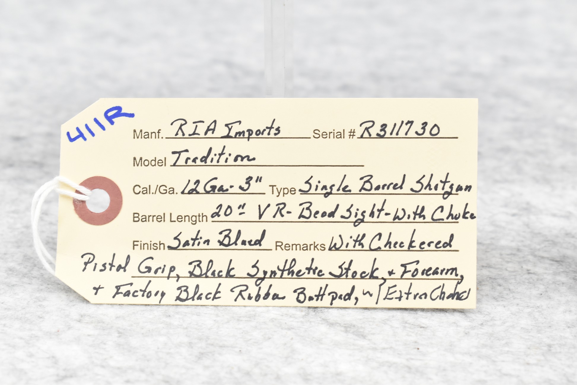 411R. RIA Imports – Mod. Tradition – 12ga. 3” Single Barrel Shotgun – w/20” Choked, Vent-Rib Barrel w/Bead Sight – Satin Blued Finish – w/Checkered Pistol Grip Black Synthetic Stocks w/Factory Butt Pad – w/Extra Chokes