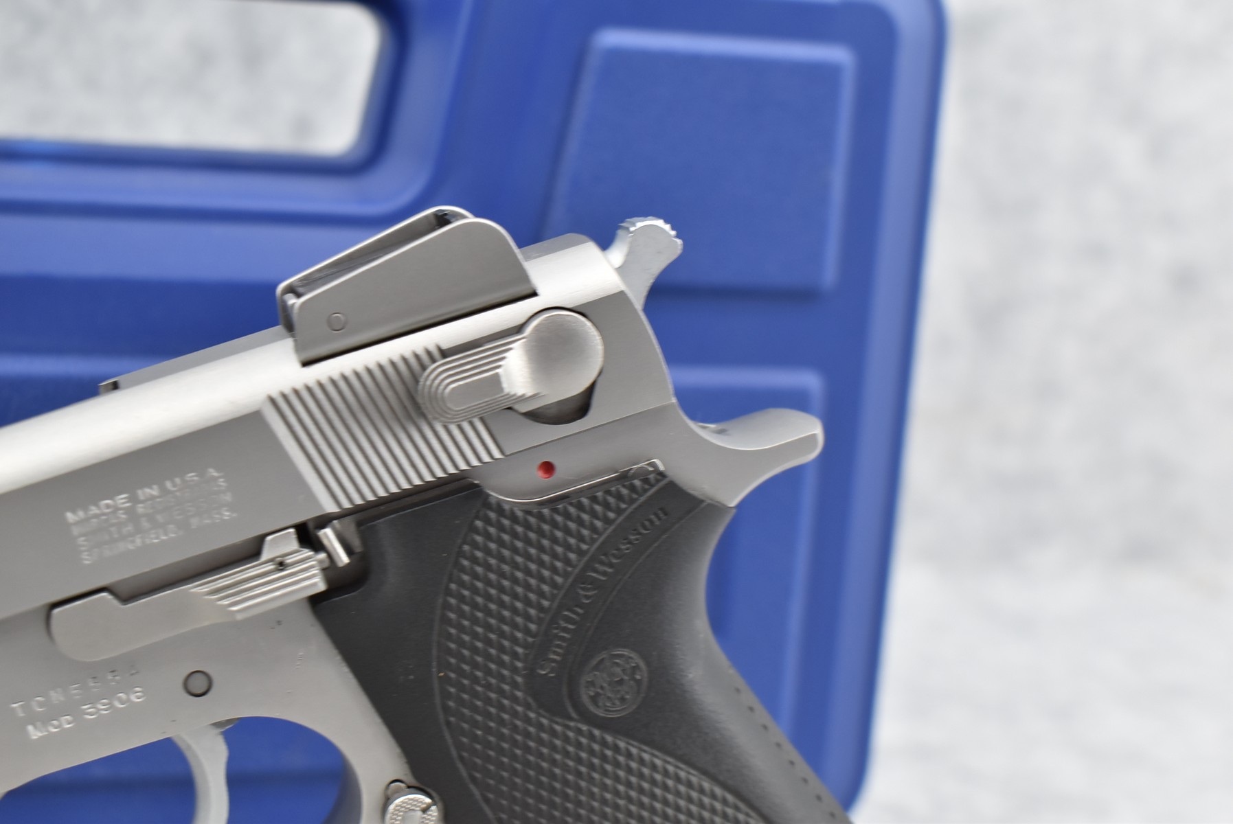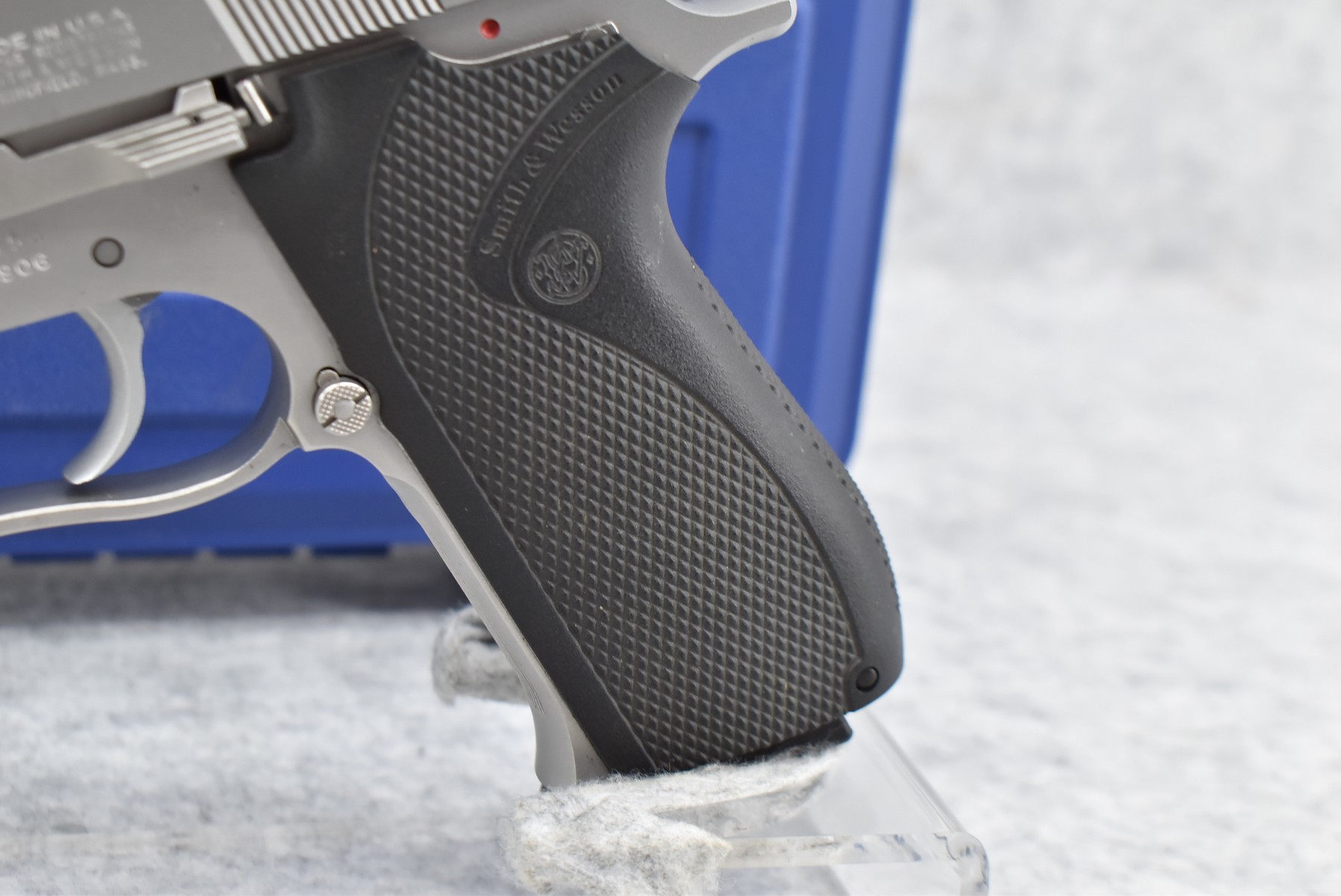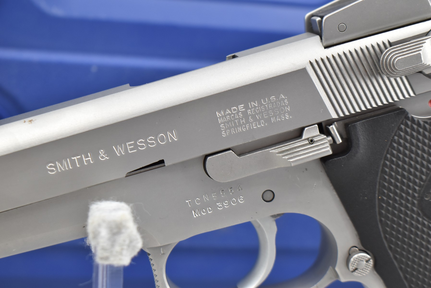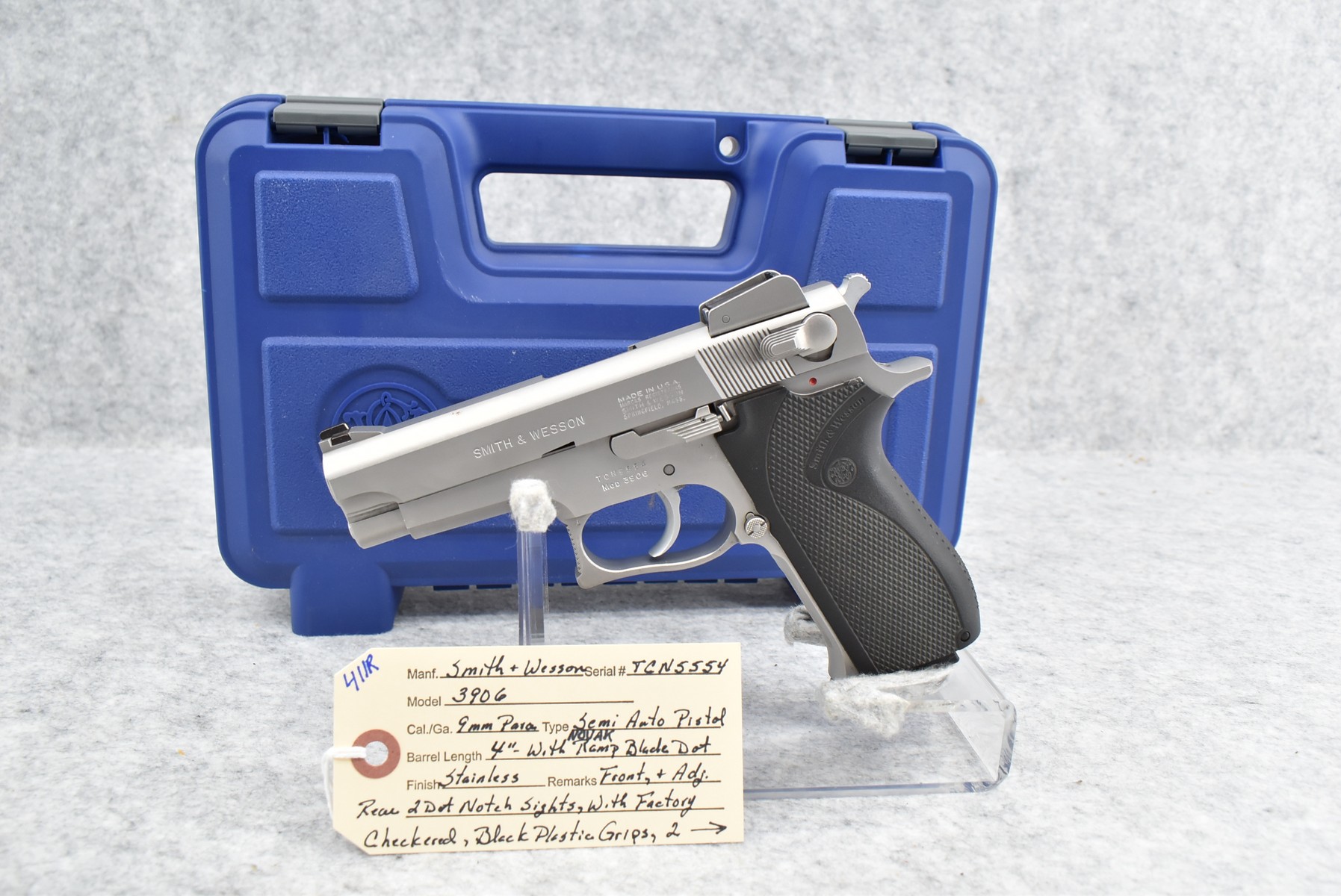 411R. Smith & Wesson – Mod. 3906 – 9mm Para Cal. Semi-Auto Pistol – w/4” Barrel w/NOVAK Ramp Blade Dot Front & Adj. Rear 2-Dot Notch Sights – Stainless Finish – w/Factory Checkered Black Plastic Grips – w/2 Factory Detachable Magazine – w/Hard Case – Mfg. Between 1988-1990, Two Years Only