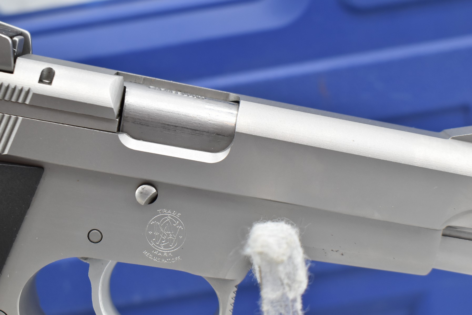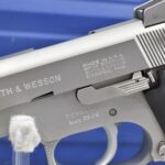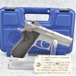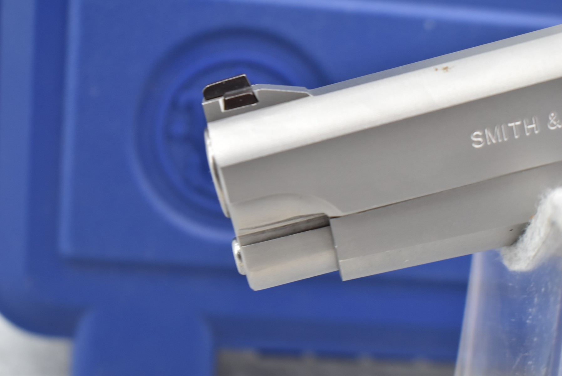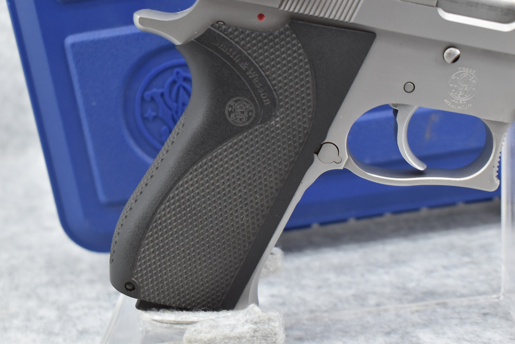 411R. Smith & Wesson – Mod. 3906 – 9mm Para Cal. Semi-Auto Pistol – w/4” Barrel w/NOVAK Ramp Blade Dot Front & Adj. Rear 2-Dot Notch Sights – Stainless Finish – w/Factory Checkered Black Plastic Grips – w/2 Factory Detachable Magazine – w/Hard Case – Mfg. Between 1988-1990, Two Years Only
