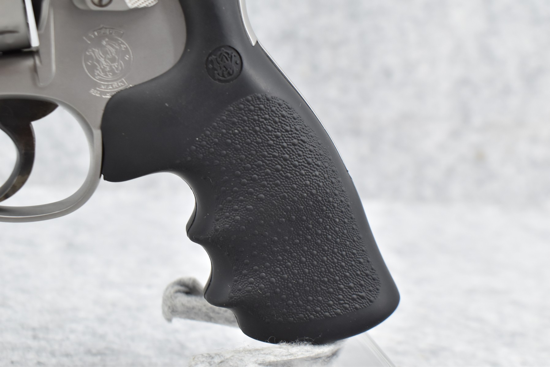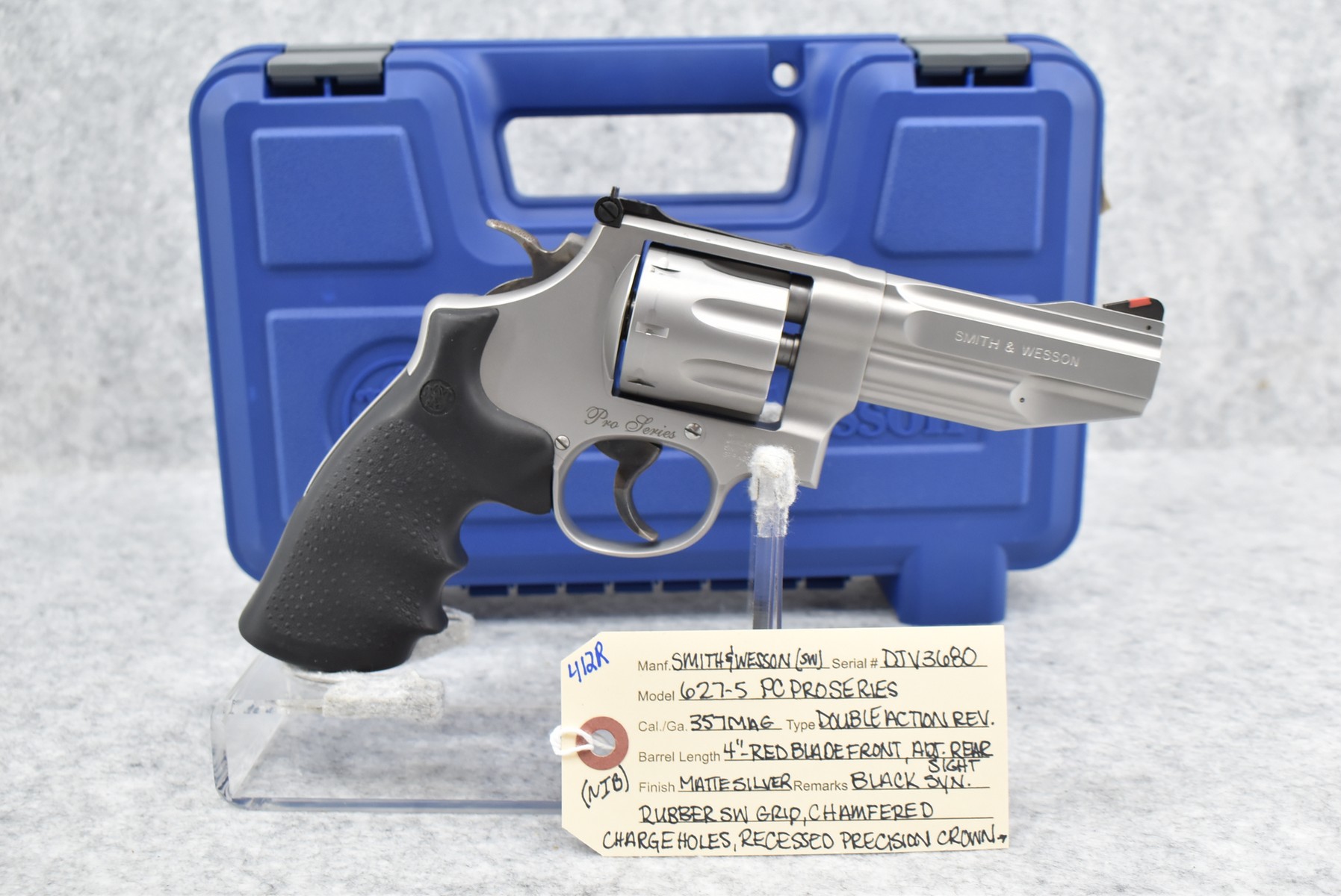 412R. Smith & Wesson – Mod. 627-5 PC ProSeries – 357 Mag. Cal. 8-Shot Double Action Revolver – w/4” Barrel w/Red Blade Front & Adj. Rear Sights – Matte Silver Finish – w/Black Synthetic Rubber S&W Grips – w/Chamfered Charge Holes – w/Recessed Precision Crown – w/Steel Frame – New w/Factory Box, Manual & Moon Clips